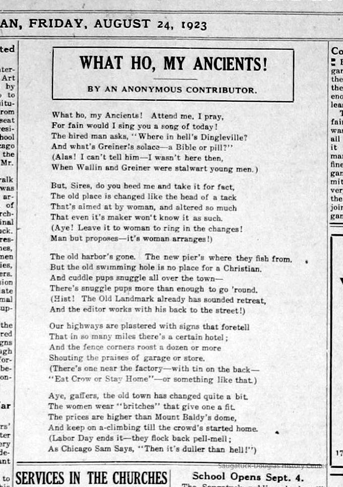 In the summer of 1923 F. W. Greiner and Van A. Wallin both sent poetic reminiscences to the Commercial Record newspaper extolling the virtues of the "good ole days." In the above poem published in the August 24 issue, an anonymous contributor, possibly the editor himself, addresses the other poets, calling them "My Ancients" and describes how the place has changed since the one they pictured. Dingleville is the community near the Wallin tannery, on the edge of present-day Clearbrook County Club. The Old Landmark was the Goshorn general store in the building now occupied by Kilwin's. Edson and Dale Crow were Saugatuck restaurant owners.