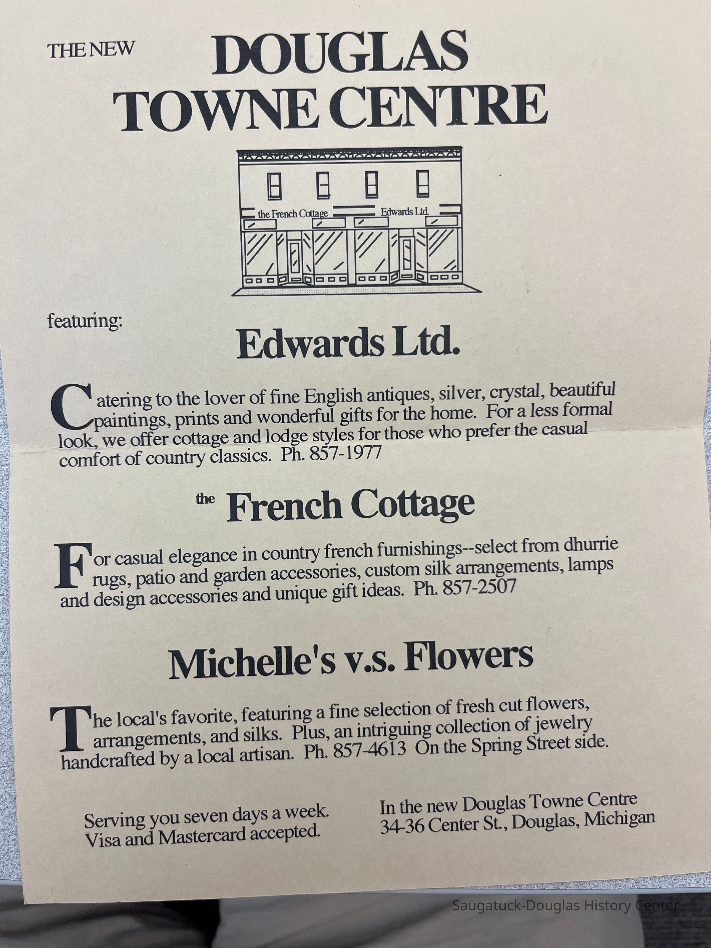Flyer advertising businesses at the Douglas Towne Centre 34-36 Center Street, Douglas MI
