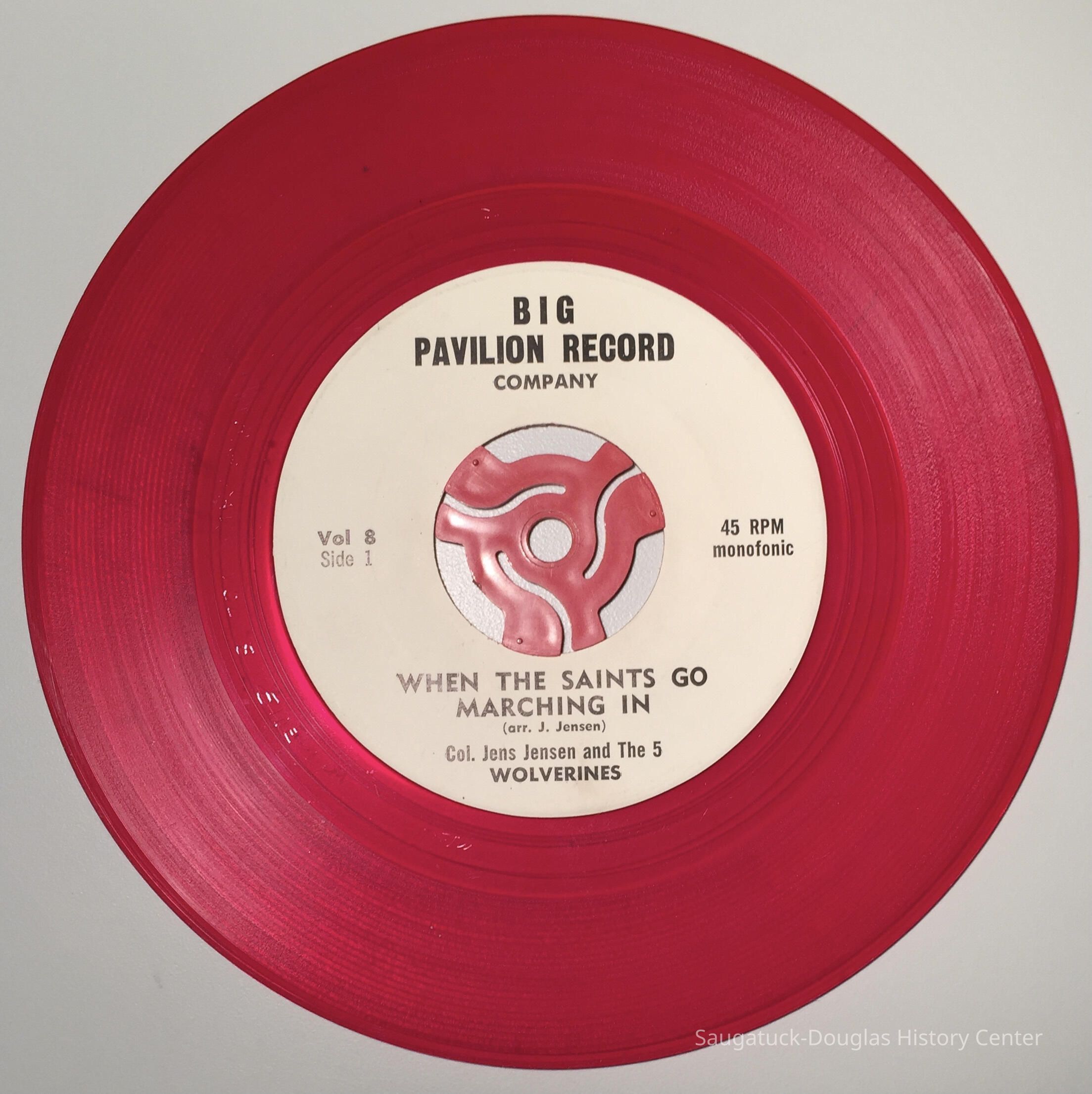 Red 45 rp record of music by Jens Jensen recorded in the Big Pavilion. One side is titled: "When the Saints Go Marching In"Collection