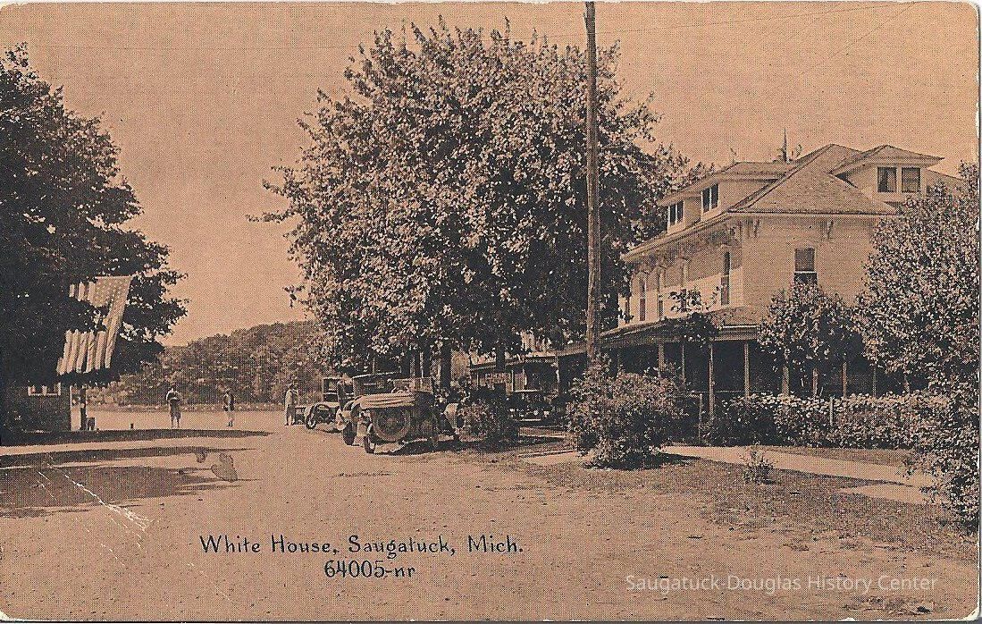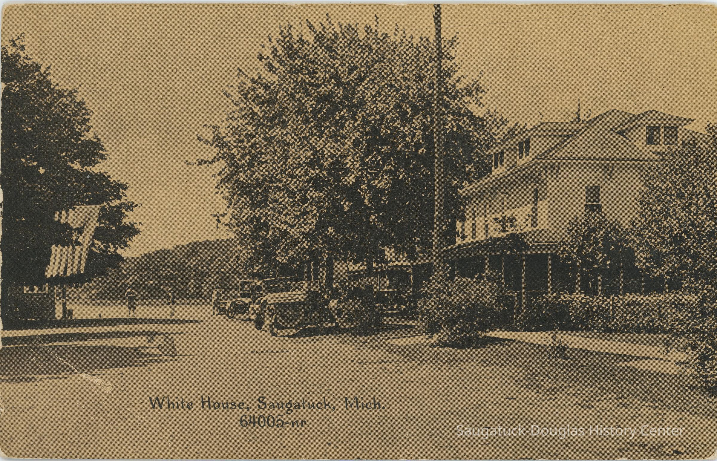 Black and white postcard showing the white house from the road. On the left is the street with cars parked in front of the building. On the right is the three story White House with a wrap around porch and three visible gabled windows. Three people can be seen on the street.Subject