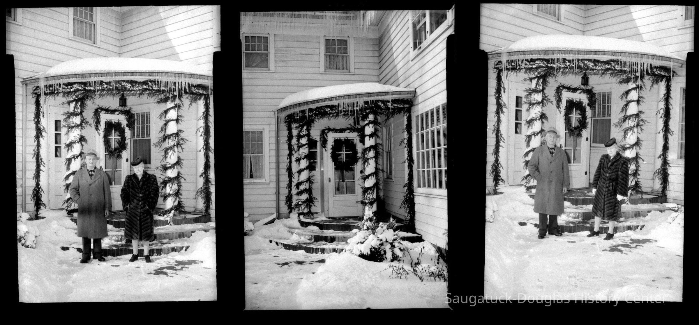 Frank and Carrie Wicks standing in the snow in front of the Wickwood wreath-bedecked front door and evergreen roping wound around the pillars.