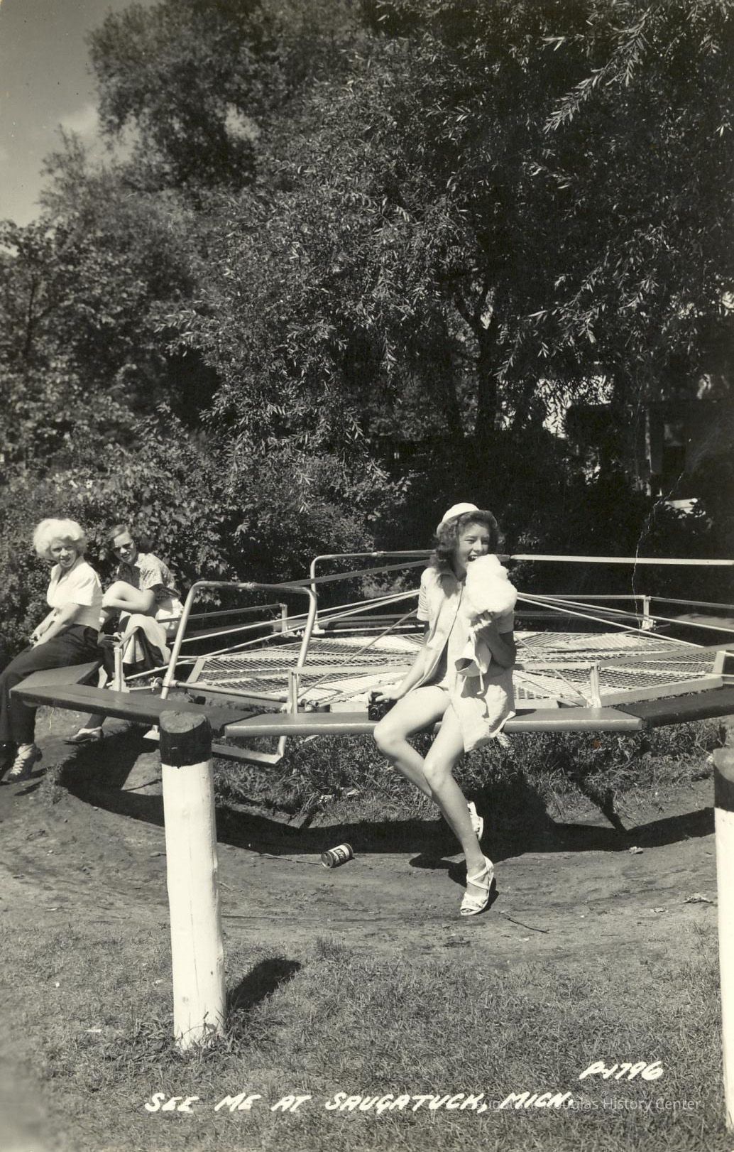 A girl and two women seated on a metal playground carousel. The girl is biting into a cloud of cotton candy. She had a camera in her free hand. A beer can lays near her sandal-clad feet. Her legs are bare. A creepy caption reads "See me at Saugatuck, Mich. P-1796"