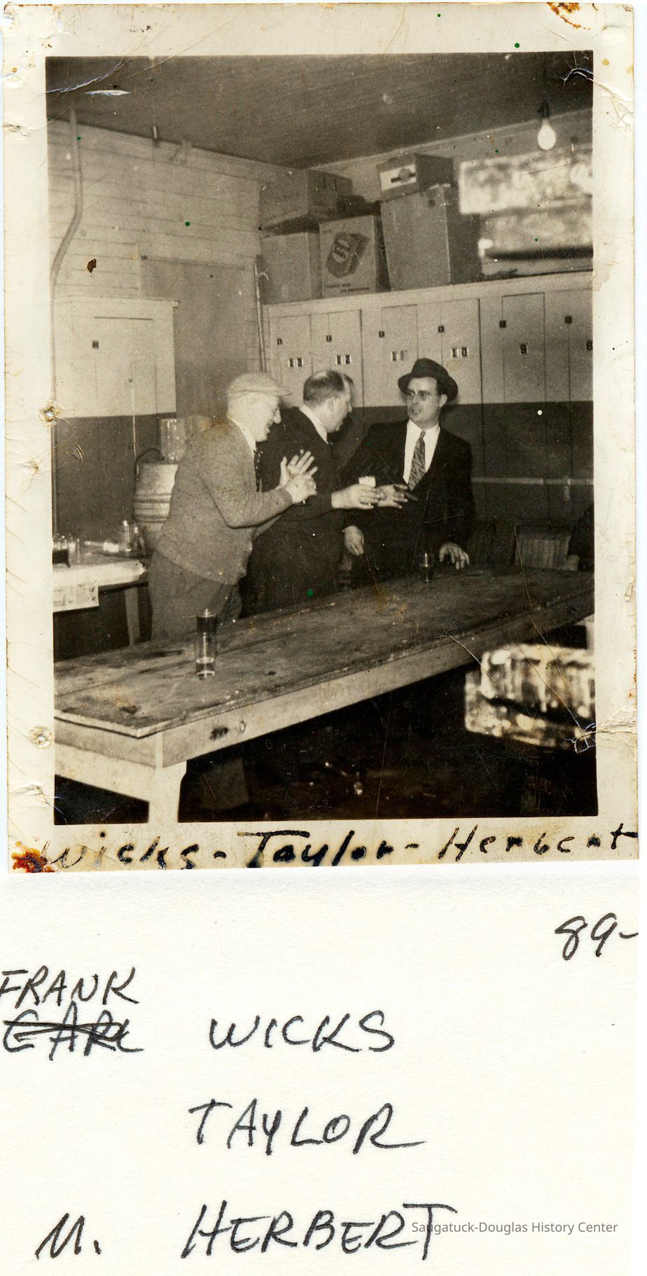 Three man conversing in a back room. Frank Wicks, ? Taylor and M. Herbert. There may be beer involved.Photograph Details