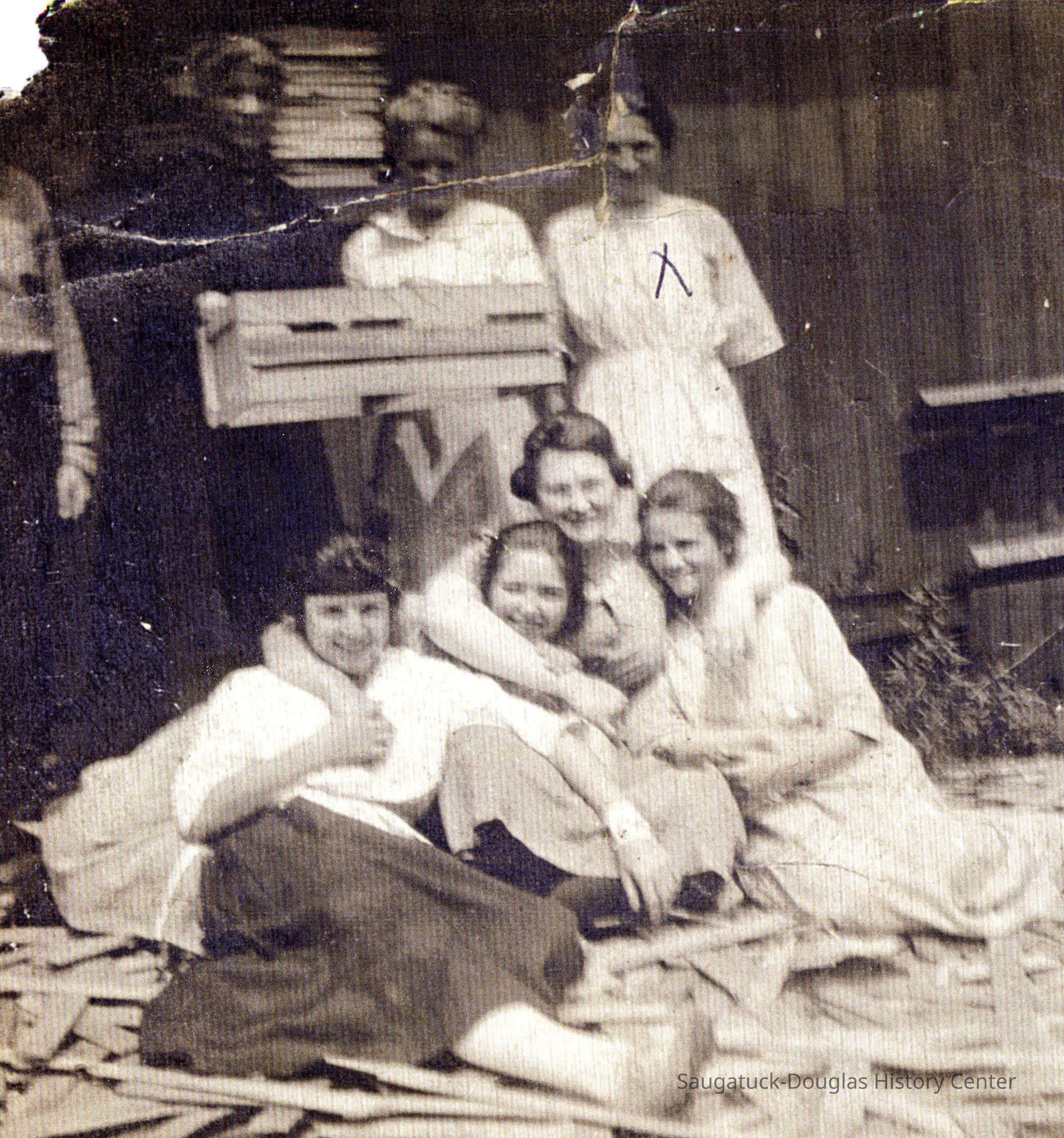 Four women lie arm in arm on the ground among wooden strips used to make baskets. Three woman stand behind, one is holding a crate.Photograph Details