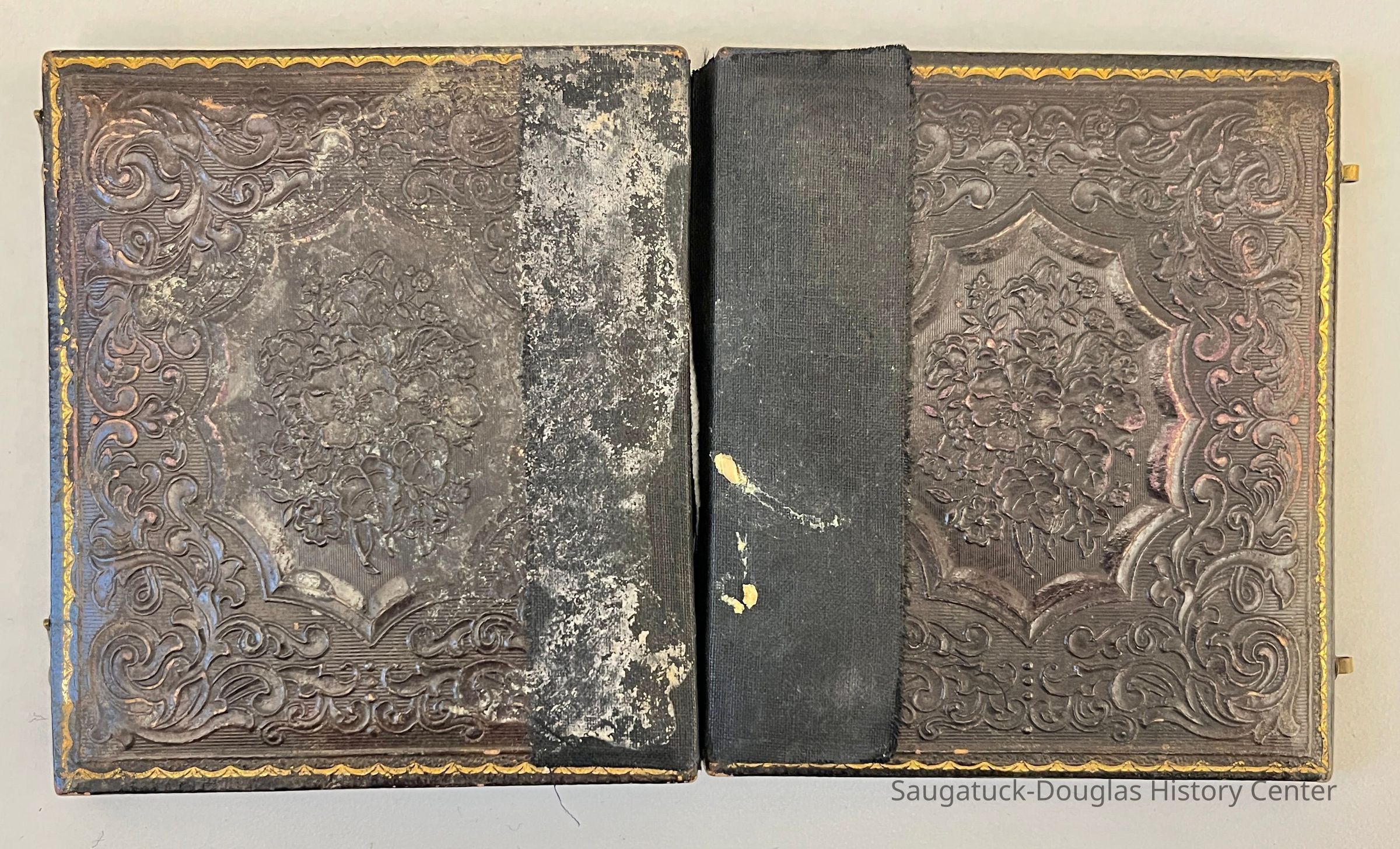 Image of William G Butler in a small single hinged photo album, felt lined with a leather cover. Included is (a) a Butler family genealogy from early Hartford, Connecticut, (b) a transcription of a letter presumed to be sent by Butler to his father sometime between 1830-1833 and (c) census data compiled for 1840-1910.