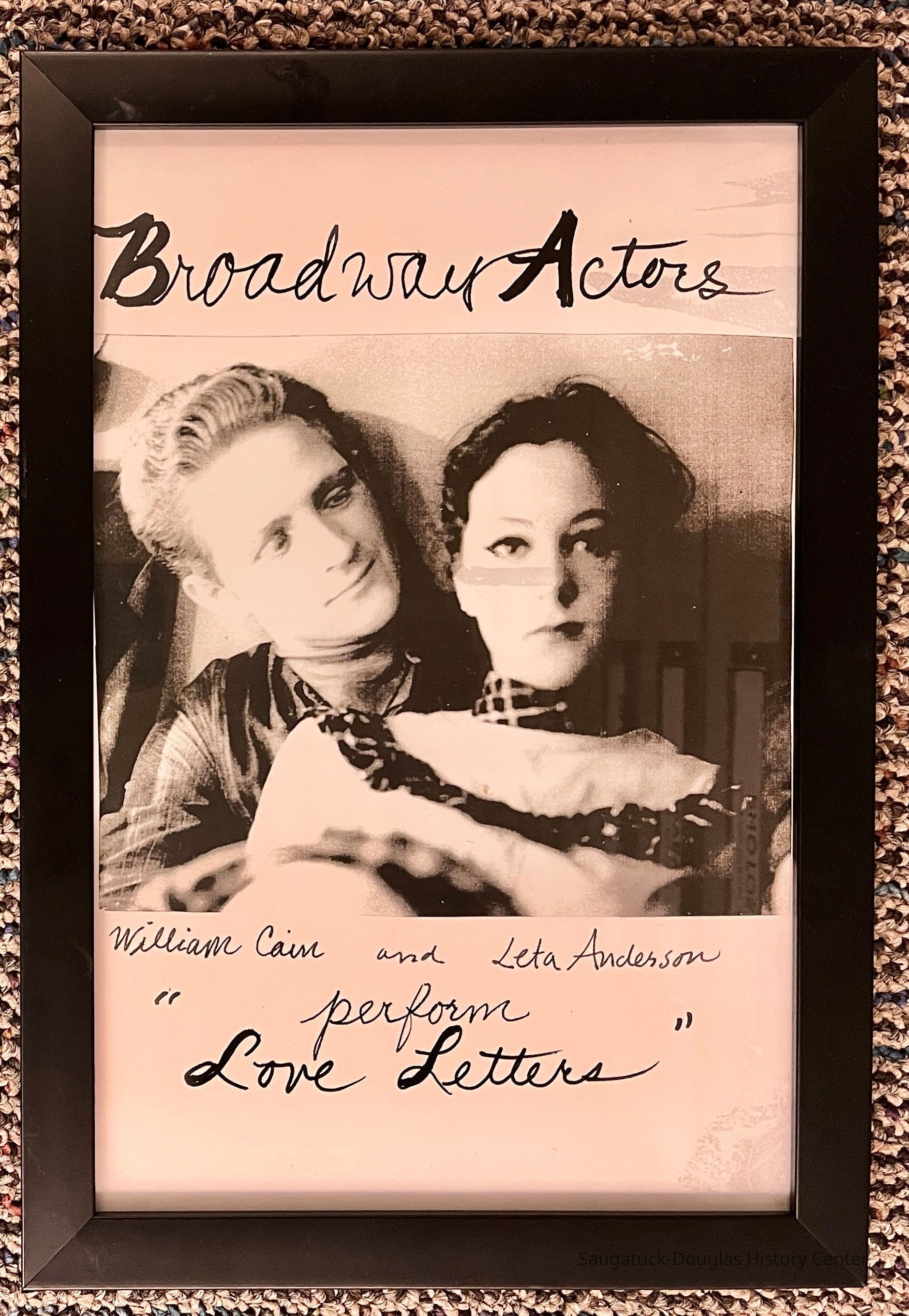 Framed picture of Broadway actors William Cain and Leta Anderson from the Red Barn Theatre performance of "Love Letters" in the 1960s. The image is behind glass with a .75-inch black frame.Context