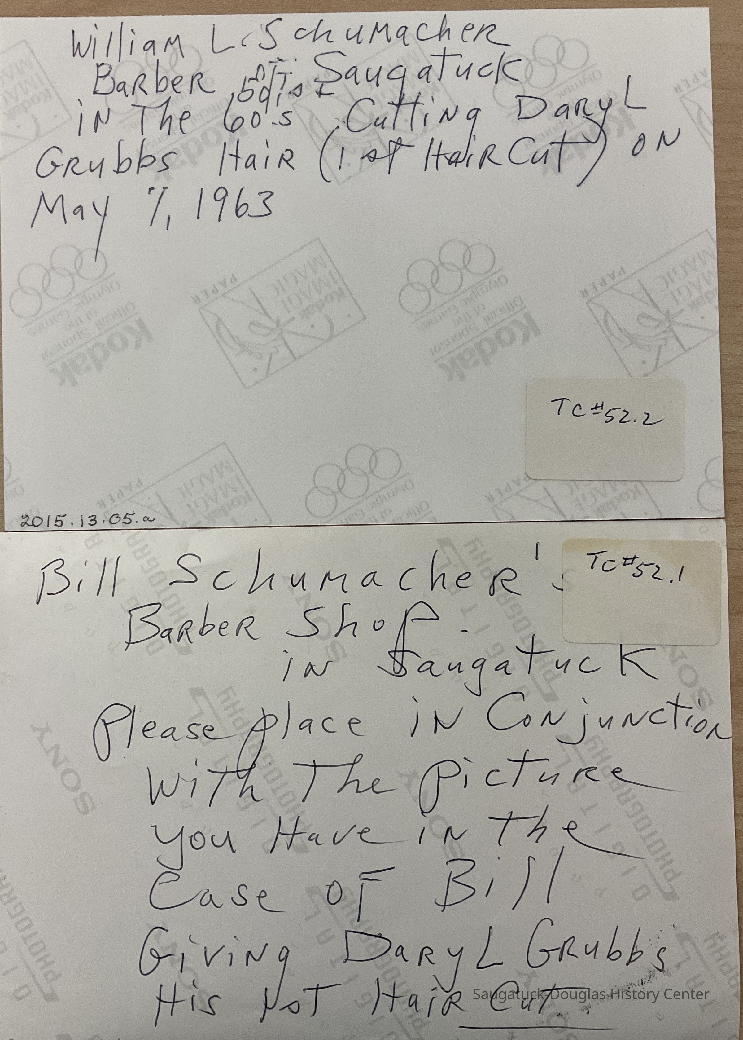 A photograph of William (Bill) L. Schumacher barber in Saugatuck in the 1960s he is cutting the hair of Daryl Grubbs (first haircut) May 7, 1963