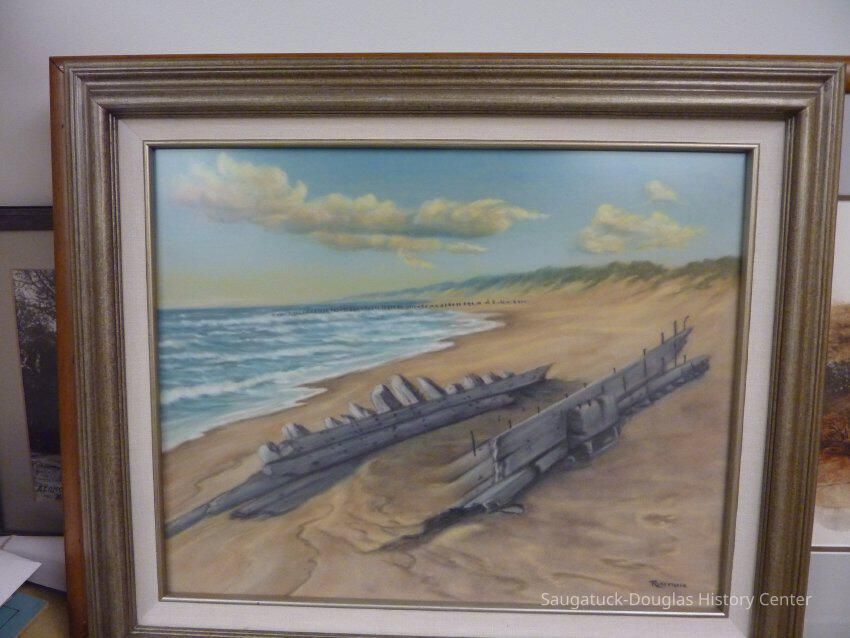 Newspaper article about the uncovered ship parts is attached to the back of the painting