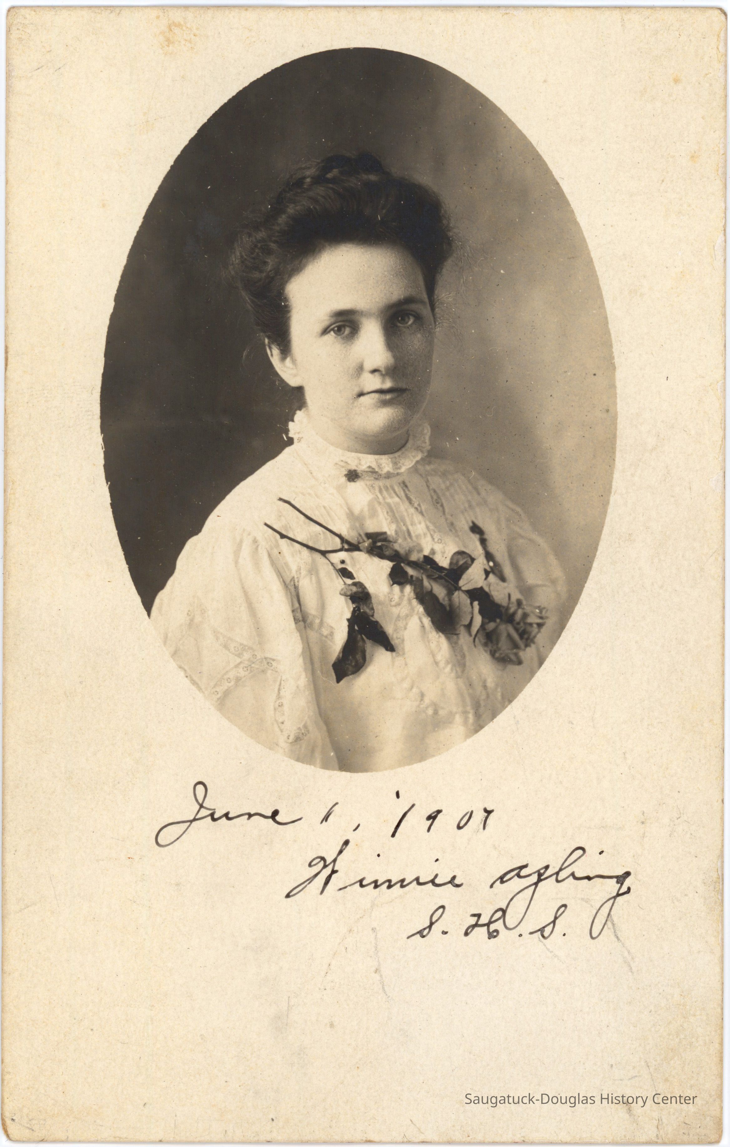 Saugatuck High School graduation portrait of Winnie Azling dated June 1, 1907. The photo shows a young woman with her dark hair gathered into a braided crown on the top of her head. She is wearing a white shirt adorned with dainty lace insets and ruffles, two rose stems and a medal. Winnie gazes directly into the camera from the oval frame of the photographic print.Photograph Details