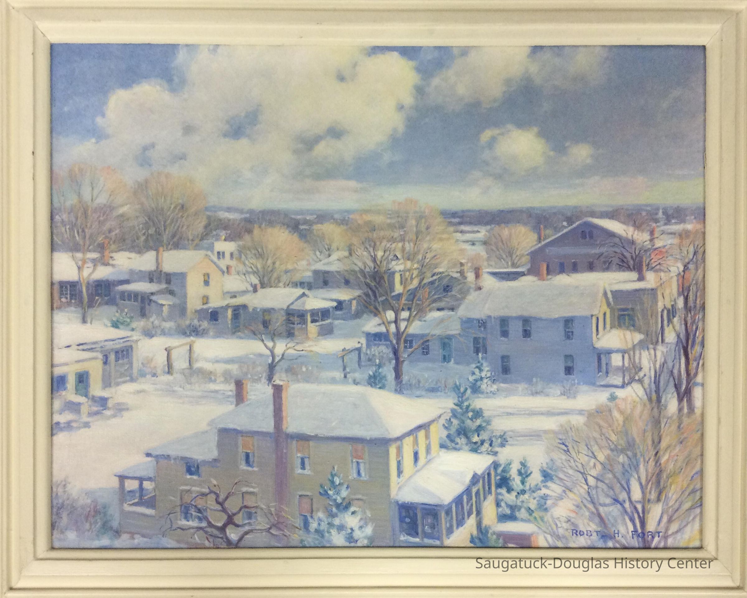 Oil painting by Robert "Harry" Fort depicting a scene of Saugatuck in the snow as seen from above the roof tops. Titled "Winter Afternoon". The painting is framed in a white painted 2.5" frame.