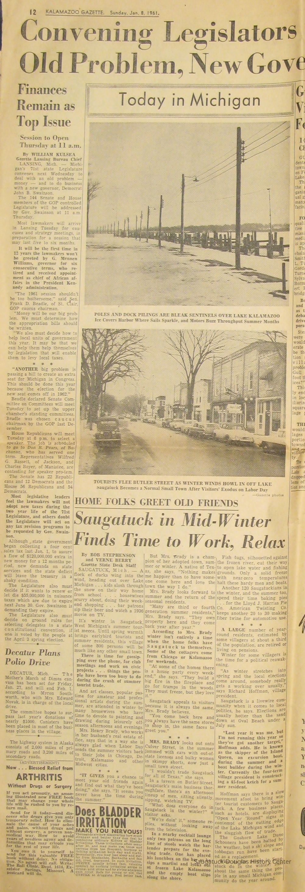 Digital scan of newspaper article "Saugatuck in Mid-Winter Finds Time to Work, Relax" by Bob Stephenson and Verne Berry, Kalamazoo Gazette January 8, 1961Context