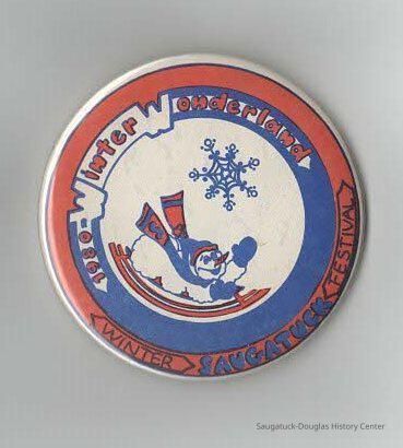 3" diameter pin in orange and blue with the words: 1980 Winter Wonderland Winter Saugatuck Festival. around the edge. In the center there is an illustration of a snow man on a sled below a large snow flake.Context