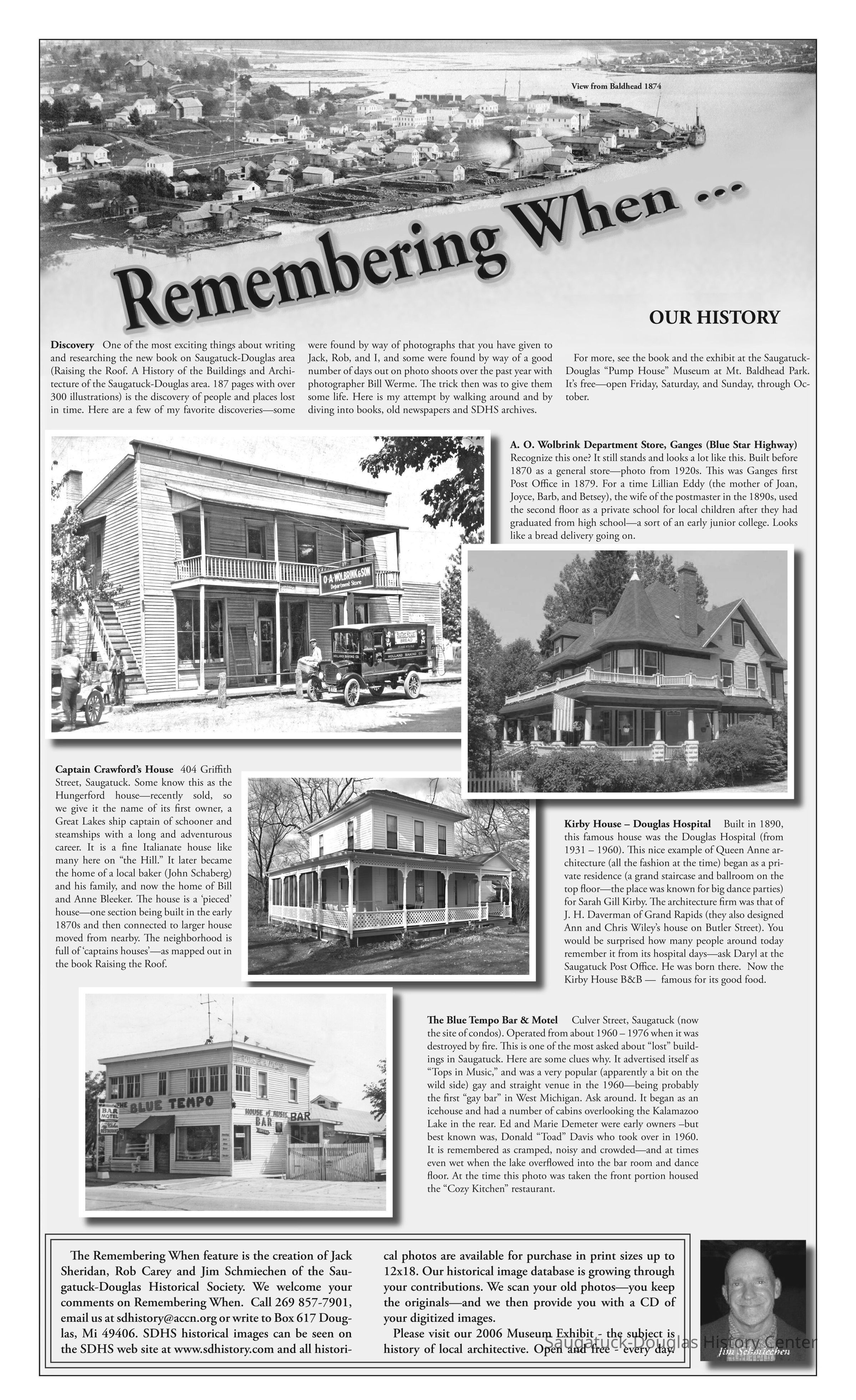 Discovery One of the most exciting things about writing and researching the new book on Saugatuck-Douglas area (Raising the Roof. A History of the Buildings and Architecture of the Saugatuck-Douglas area. 187 pages with over 300 illustrations) is the discovery of people and places lost in time. Here are a few of my favorite discoveries—some were found by way of photographs that you have given to Jack, Rob, and I, and some were found by way of a good number of days out on photo shoots over the past year with photographer Bill Werme. The trick then was to give them some life. Here is my attempt by walking around and by diving into books, old newspapers and SDHS archives.
