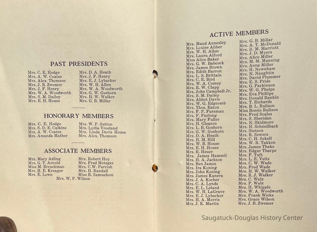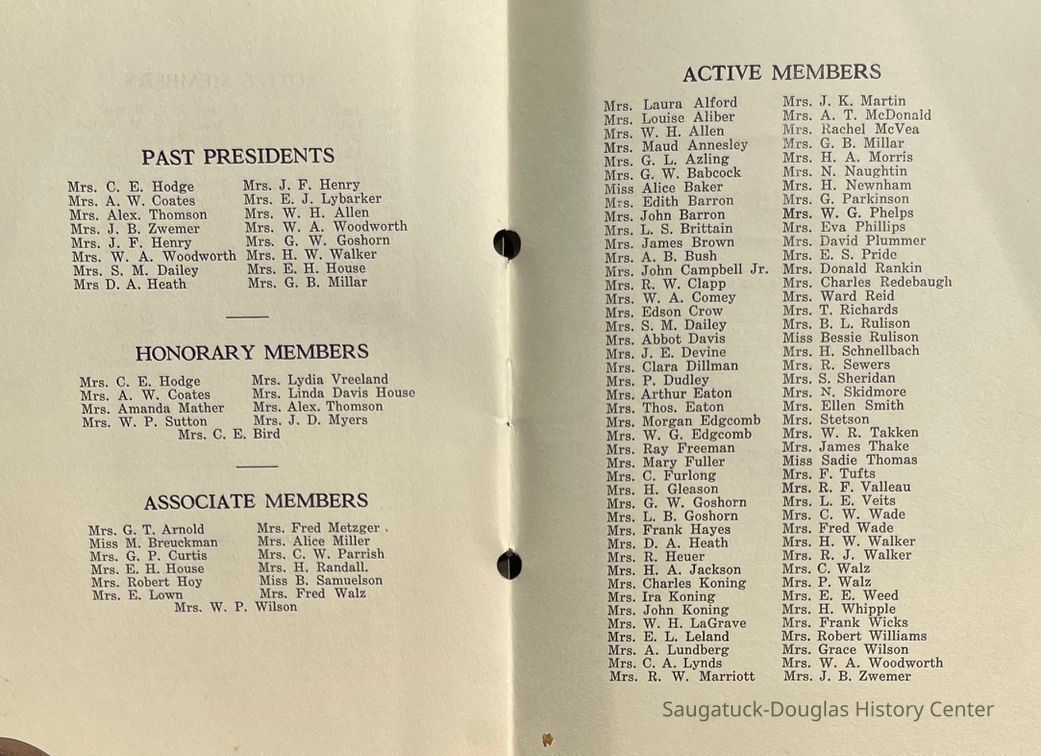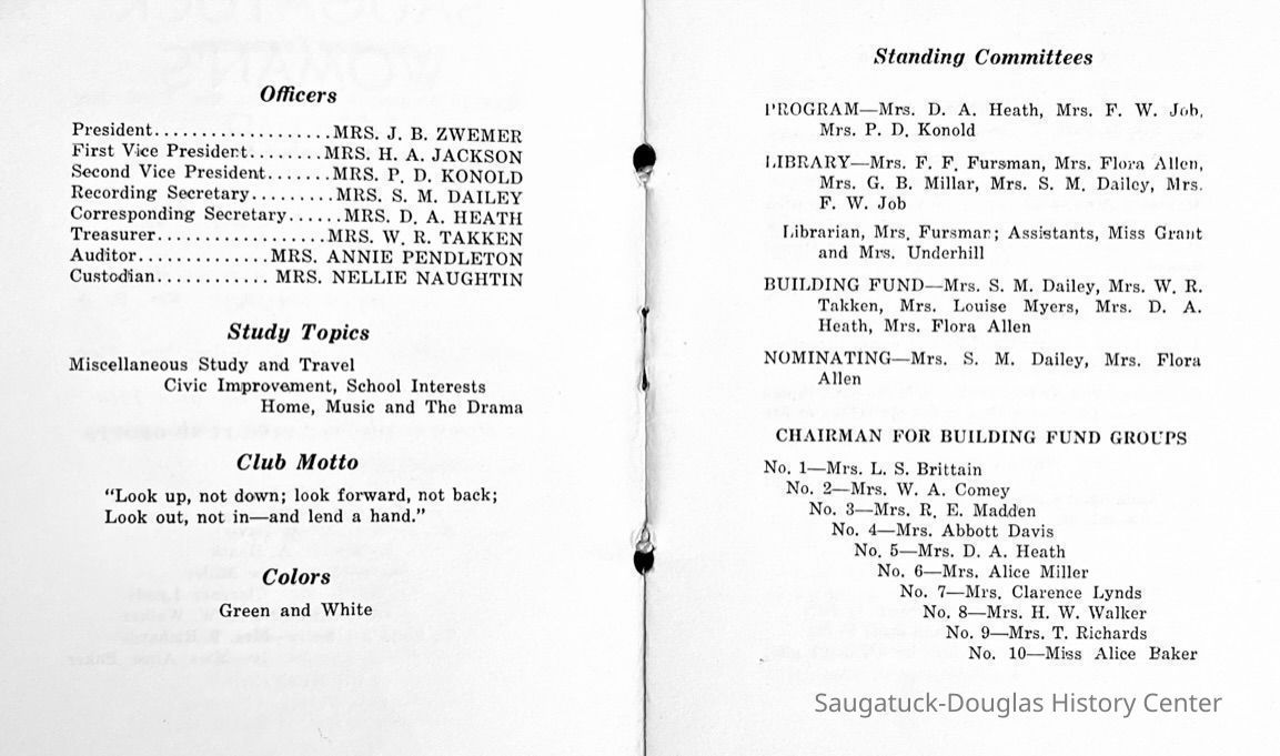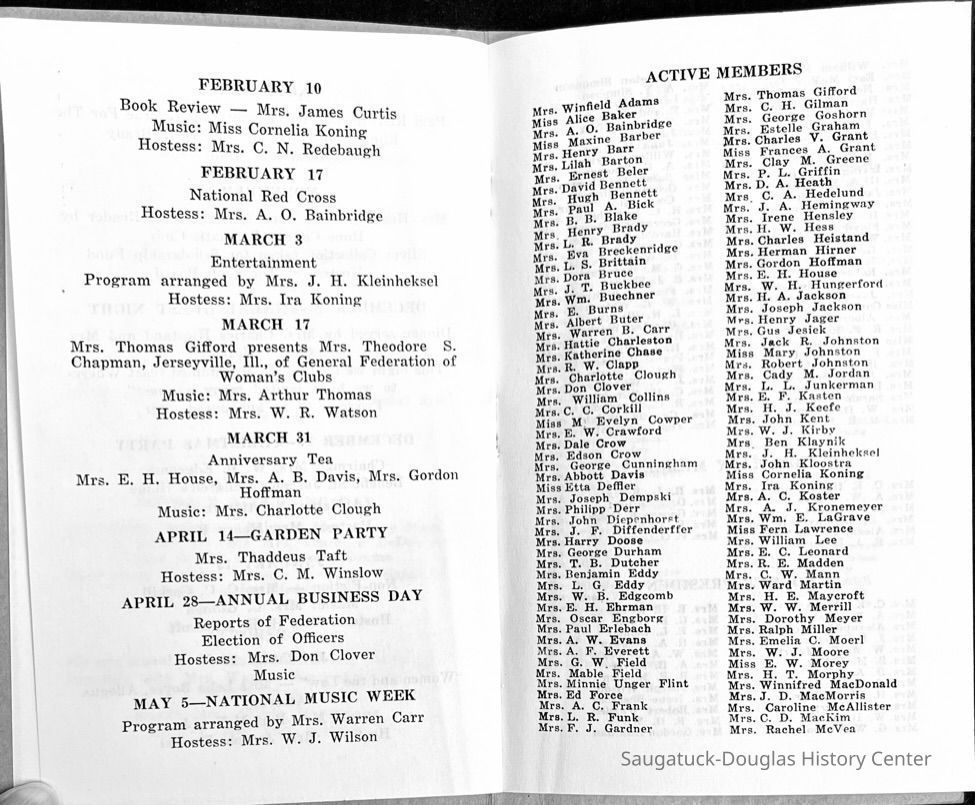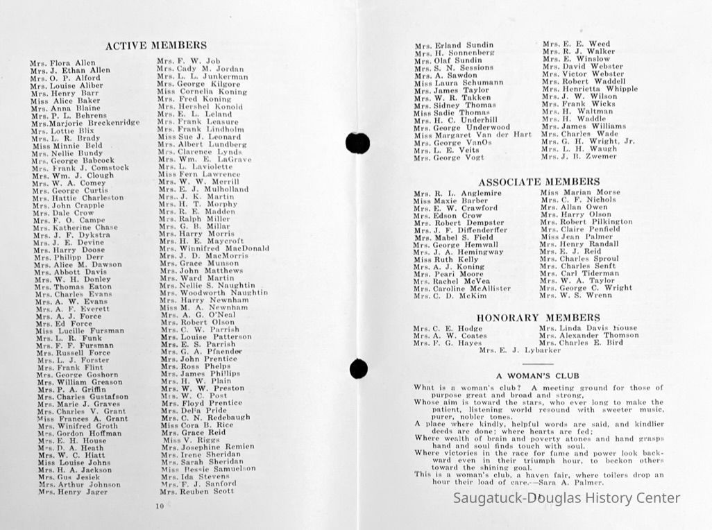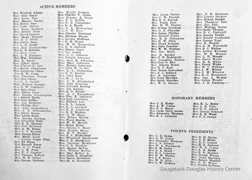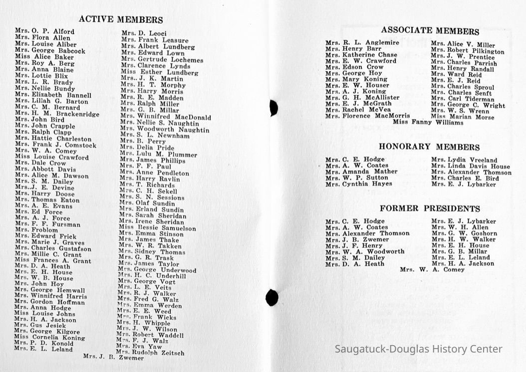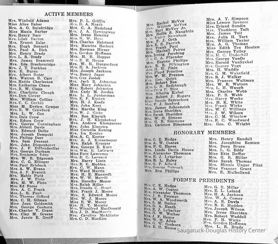 Saugatuck Woman's Club 1904-present, Saugatuck Woman's Club auditorium 1935-present, Heath, May (Francis) 1873-1961, Bird, Harriet “Hattie” Louise (Moffat) (Wright) 1855-1944, Breuckman, Minnie 1869-1934, Coates, Adella "Della" (Holmes) 1864-1950, Thomson, Jeanette Elvira (Harris) 1862-1956, Fox, Johnson 1918-2009, Hodge, Emma Ursula (Gunzenhauser) 1864-1950, Dailey, Margaret, E. (Calkins) 1866-1940, Zwemer, Saburna G. (Woodworth) 1875-1949, Henry, Isabel (Shore) 1856-1936, Woodworth, Alice C. (Redway) Mather 1848-1930, 439 Butler/Butler Pantry/Wilkins/Koning/Nies Hardware, Allen, Flora Elizabeth (Sprang) 1863-1943, Walker, Adelaide Elizabeth (Wade) 1885-1932, Goshorn, Hattie Louise (DePuy) 1874-1953, House, Celia Martin (Gamble) (1890-1976), Millar, Nellie Grant (Raymond) 1861-1956, Jackson, Rhea Bernice (Allen) 1892-1979, Leland, Ruth F. (Baker) 1878-1949, Comey, Alice Maude (Grant) 1870-1944, Davis, Edna Mae (Gaylord) 1896-1980, Wilson, Grace (Cobb) 1897-1992, Sheridan, Irene (Weible) 1883-1967, Waddell, Sadie R. 1882-1947, Wicks, Caroline Jane "Carrie" (Millar) Stillson 1884-1983, Hoffman, Elizabeth S. "Betty" (Gregory) 1894-1960, Brady, Winifred E. (Randall) 1893-1961, Peirce, Roberta "Bobbie" Margaret (Fredrickson) 1914-2004, Carr, Elsie Virginia (Kaufman) 1906-1997, Bieler or Beler, Mrs. Ernest 1904-1954?, Bainbridge, Marguerite (Holladay) 1888-1974, Edgcomb, Ruth M. (Severance) 1915-1997, Taylor, Mrs. Harold