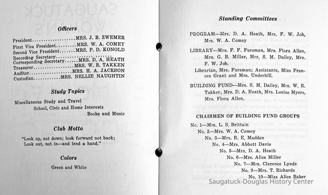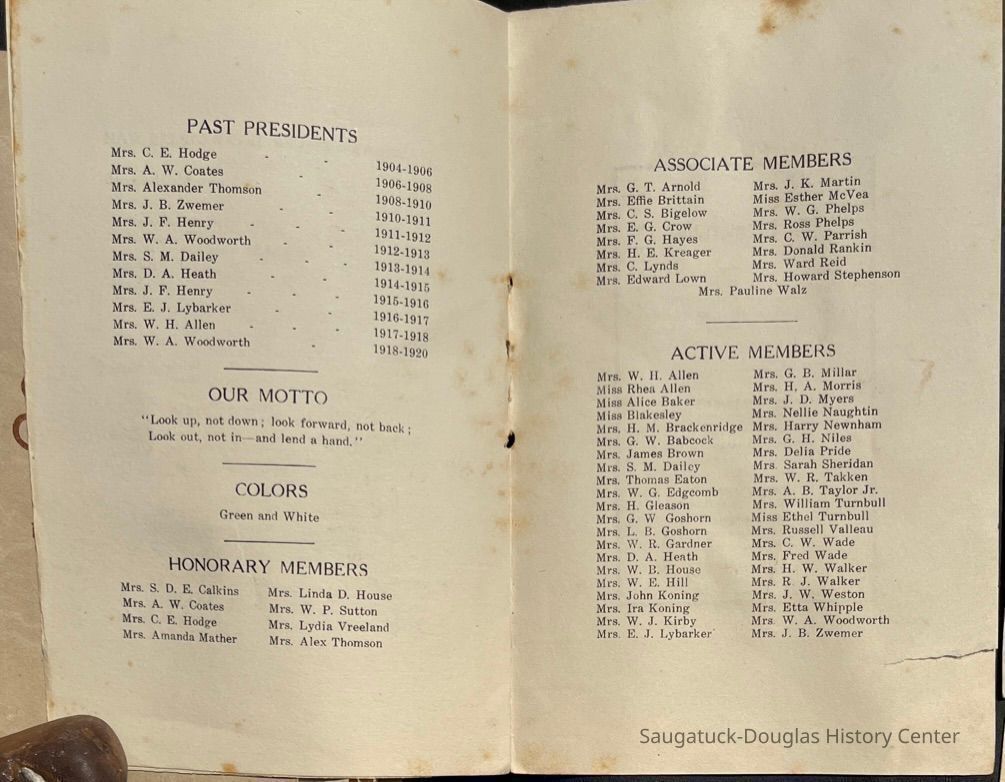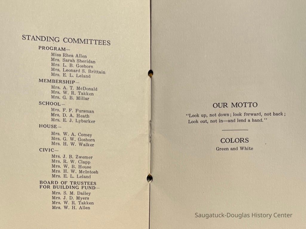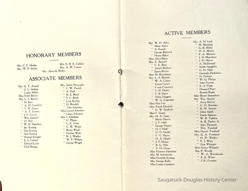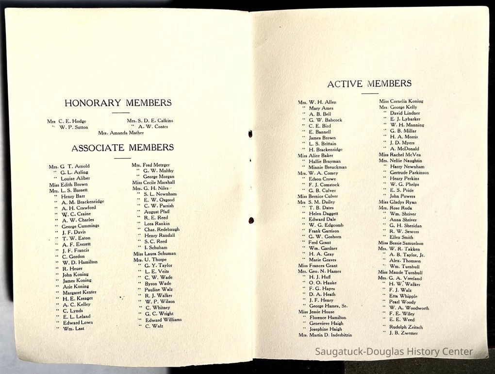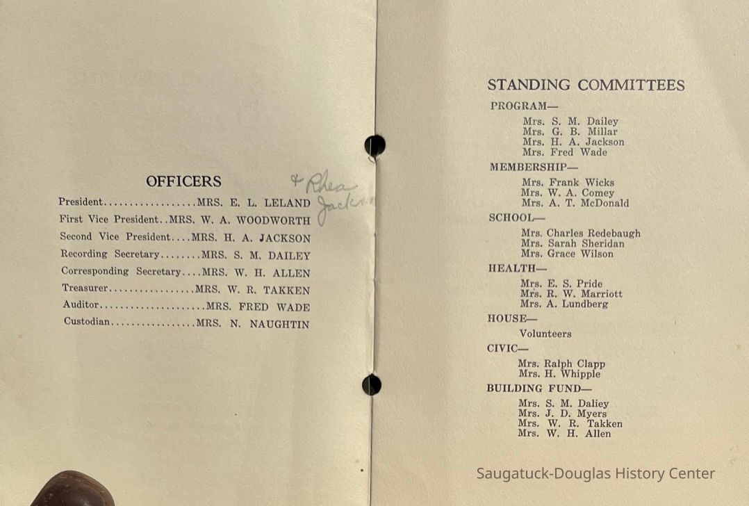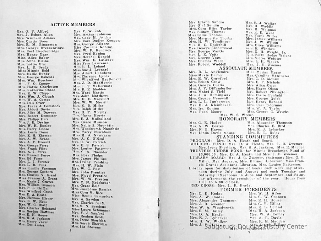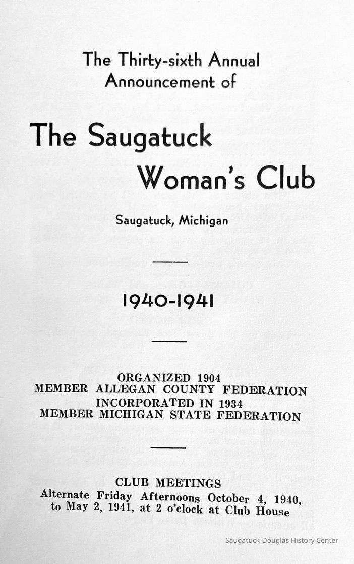 Saugatuck Woman's Club 1904-present, Saugatuck Woman's Club auditorium 1935-present, Heath, May (Francis) 1873-1961, Bird, Harriet “Hattie” Louise (Moffat) (Wright) 1855-1944, Breuckman, Minnie 1869-1934, Coates, Adella "Della" (Holmes) 1864-1950, Thomson, Jeanette Elvira (Harris) 1862-1956, Fox, Johnson 1918-2009, Hodge, Emma Ursula (Gunzenhauser) 1864-1950, Dailey, Margaret, E. (Calkins) 1866-1940, Zwemer, Saburna G. (Woodworth) 1875-1949, Henry, Isabel (Shore) 1856-1936, Woodworth, Alice C. (Redway) Mather 1848-1930, 439 Butler/Butler Pantry/Wilkins/Koning/Nies Hardware, Allen, Flora Elizabeth (Sprang) 1863-1943, Walker, Adelaide Elizabeth (Wade) 1885-1932, Goshorn, Hattie Louise (DePuy) 1874-1953, House, Celia Martin (Gamble) (1890-1976), Millar, Nellie Grant (Raymond) 1861-1956, Jackson, Rhea Bernice (Allen) 1892-1979, Leland, Ruth F. (Baker) 1878-1949, Comey, Alice Maude (Grant) 1870-1944, Davis, Edna Mae (Gaylord) 1896-1980, Wilson, Grace (Cobb) 1897-1992, Sheridan, Irene (Weible) 1883-1967, Waddell, Sadie R. 1882-1947, Wicks, Caroline Jane "Carrie" (Millar) Stillson 1884-1983, Hoffman, Elizabeth S. "Betty" (Gregory) 1894-1960, Brady, Winifred E. (Randall) 1893-1961, Peirce, Roberta "Bobbie" Margaret (Fredrickson) 1914-2004, Carr, Elsie Virginia (Kaufman) 1906-1997, Bieler or Beler, Mrs. Ernest 1904-1954?, Bainbridge, Marguerite (Holladay) 1888-1974, Edgcomb, Ruth M. (Severance) 1915-1997, Taylor, Mrs. Harold