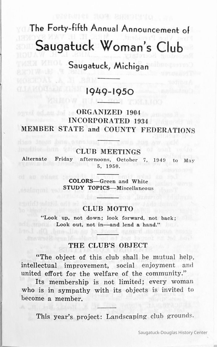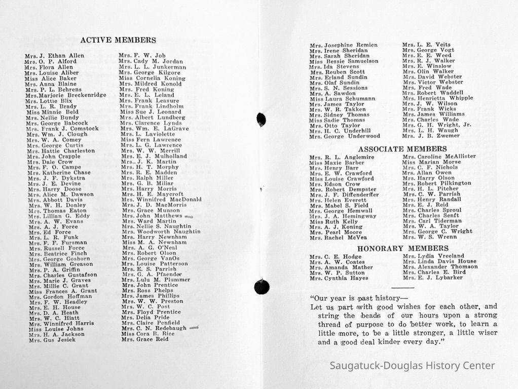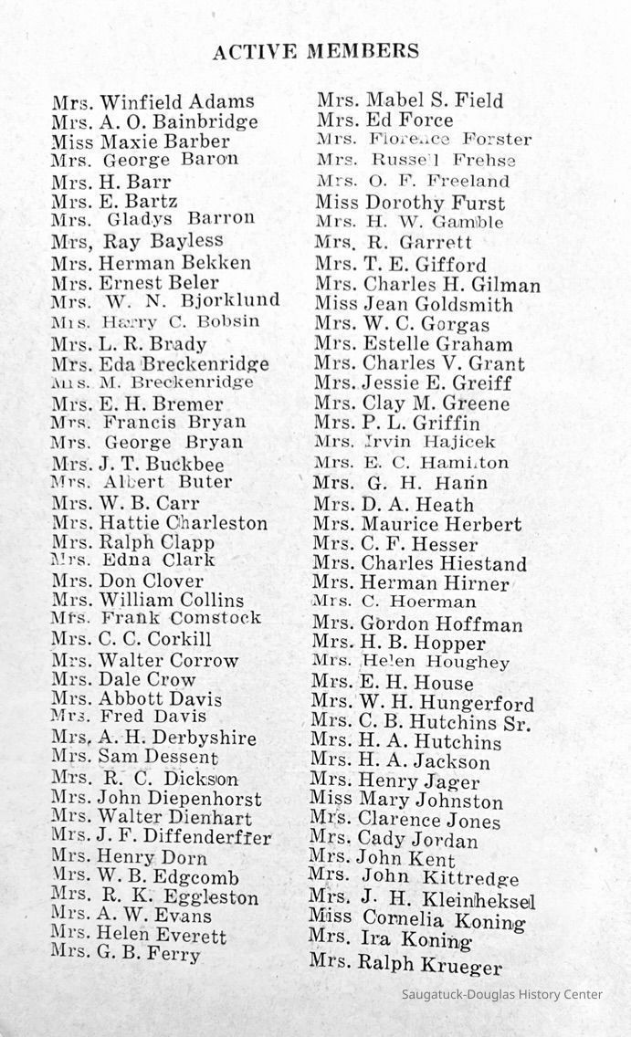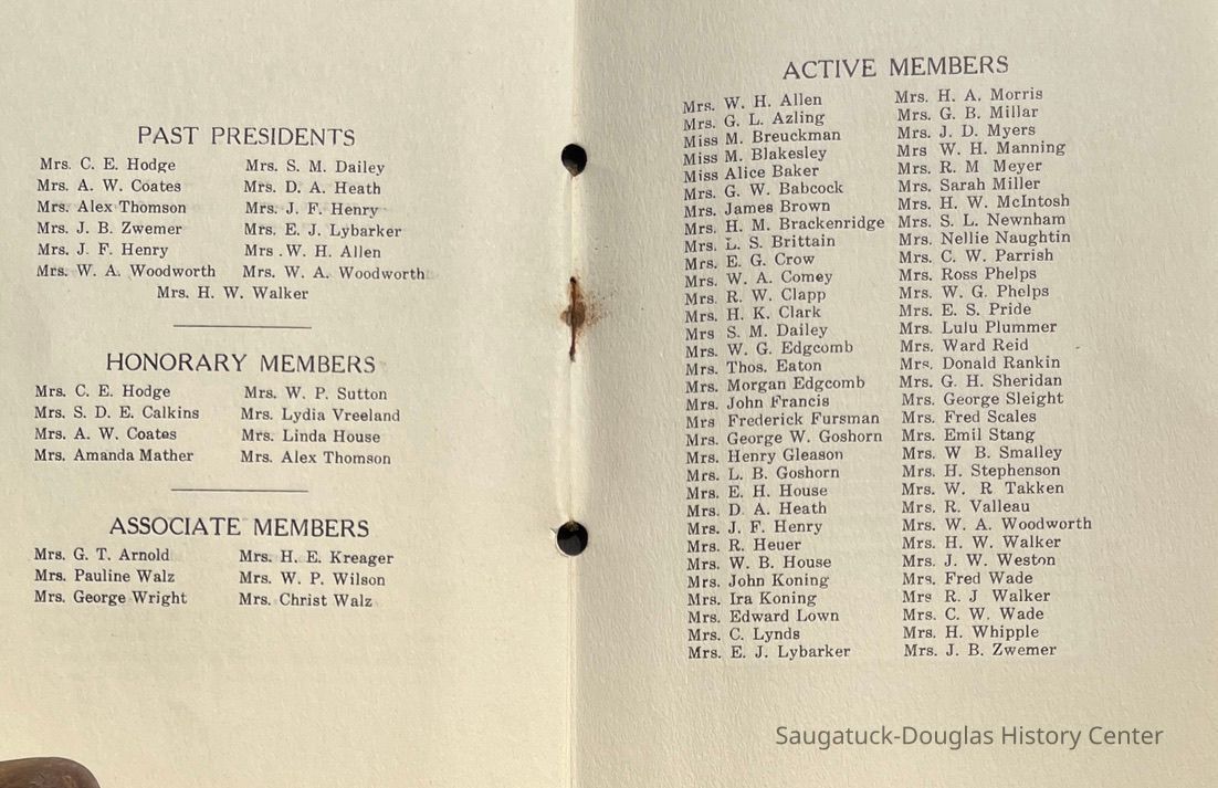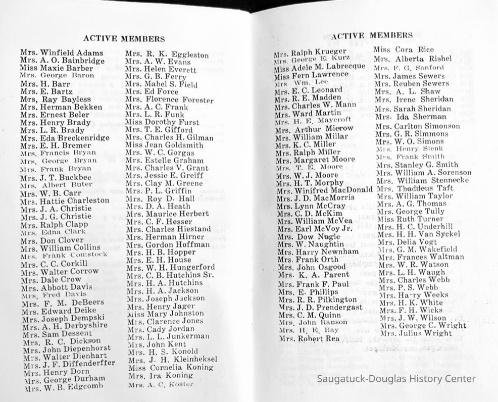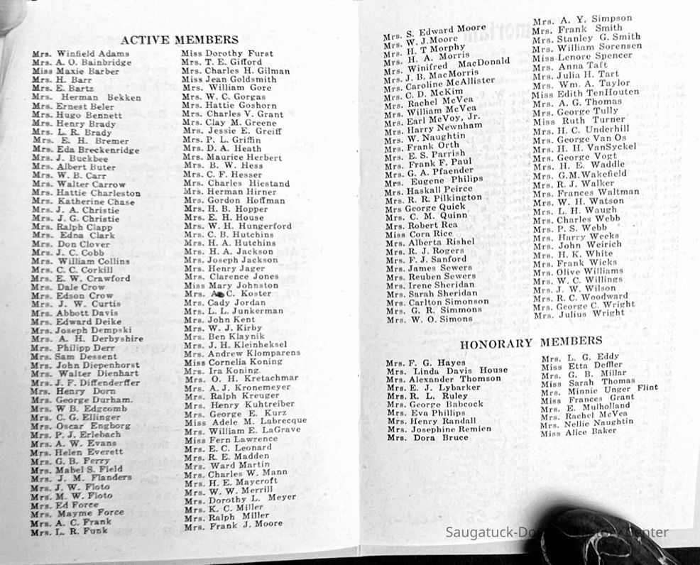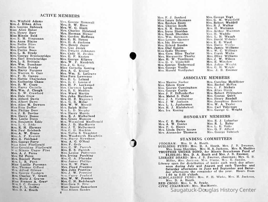Saugatuck Woman's Club 1904-present, Saugatuck Woman's Club auditorium 1935-present, Heath, May (Francis) 1873-1961, Bird, Harriet “Hattie” Louise (Moffat) (Wright) 1855-1944, Breuckman, Minnie 1869-1934, Coates, Adella "Della" (Holmes) 1864-1950, Thomson, Jeanette Elvira (Harris) 1862-1956, Fox, Johnson 1918-2009, Hodge, Emma Ursula (Gunzenhauser) 1864-1950, Dailey, Margaret, E. (Calkins) 1866-1940, Zwemer, Saburna G. (Woodworth) 1875-1949, Henry, Isabel (Shore) 1856-1936, Woodworth, Alice C. (Redway) Mather 1848-1930, 439 Butler/Butler Pantry/Wilkins/Koning/Nies Hardware, Allen, Flora Elizabeth (Sprang) 1863-1943, Walker, Adelaide Elizabeth (Wade) 1885-1932, Goshorn, Hattie Louise (DePuy) 1874-1953, House, Celia Martin (Gamble) (1890-1976), Millar, Nellie Grant (Raymond) 1861-1956, Jackson, Rhea Bernice (Allen) 1892-1979, Leland, Ruth F. (Baker) 1878-1949, Comey, Alice Maude (Grant) 1870-1944, Davis, Edna Mae (Gaylord) 1896-1980, Wilson, Grace (Cobb) 1897-1992, Sheridan, Irene (Weible) 1883-1967, Waddell, Sadie R. 1882-1947, Wicks, Caroline Jane "Carrie" (Millar) Stillson 1884-1983, Hoffman, Elizabeth S. "Betty" (Gregory) 1894-1960, Brady, Winifred E. (Randall) 1893-1961, Peirce, Roberta "Bobbie" Margaret (Fredrickson) 1914-2004, Carr, Elsie Virginia (Kaufman) 1906-1997, Bieler or Beler, Mrs. Ernest 1904-1954?, Bainbridge, Marguerite (Holladay) 1888-1974, Edgcomb, Ruth M. (Severance) 1915-1997, Taylor, Mrs. Harold