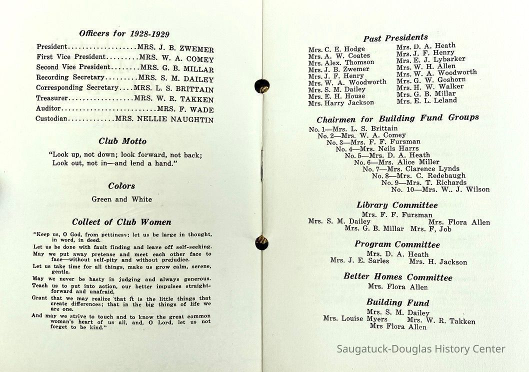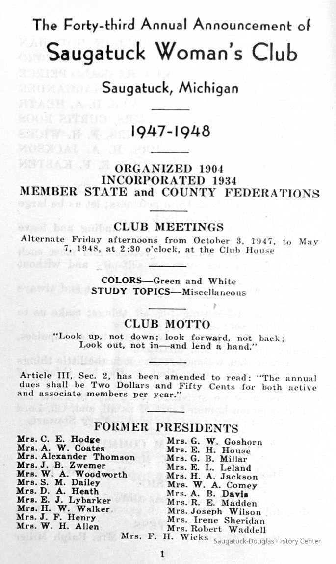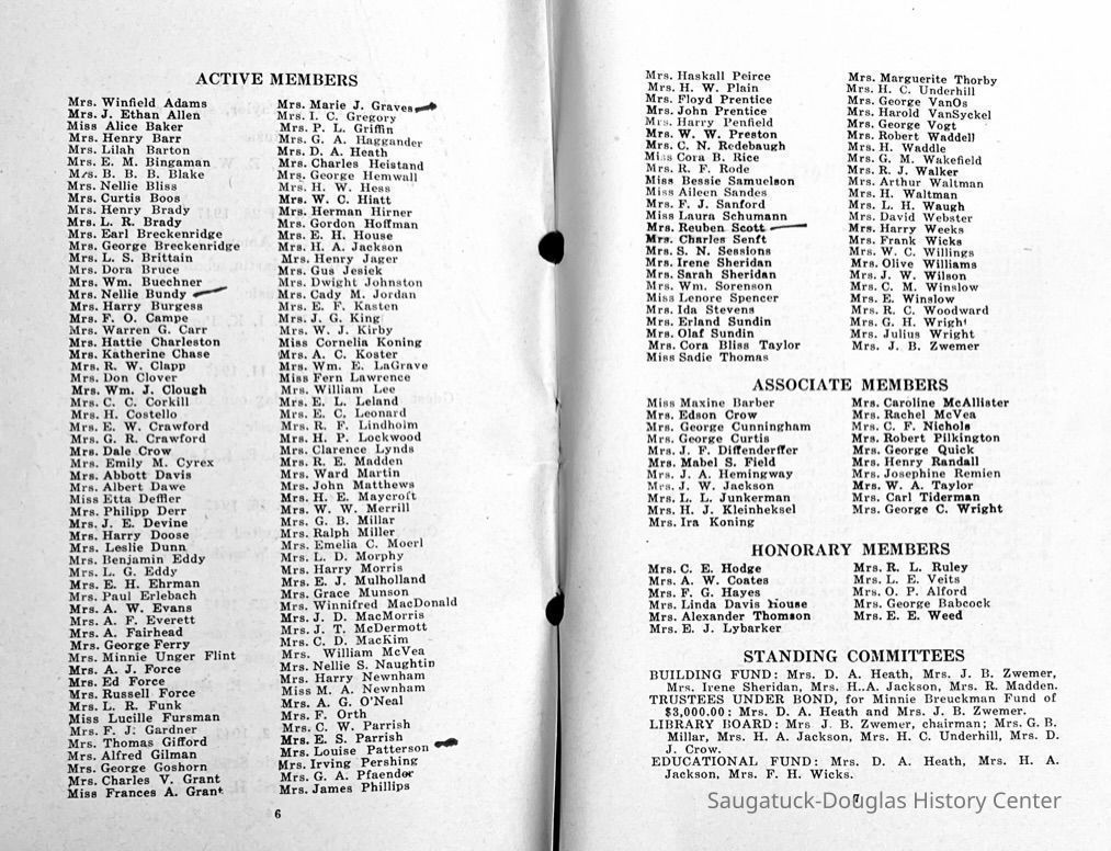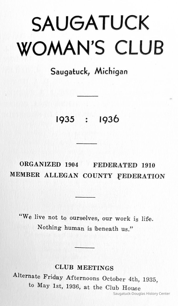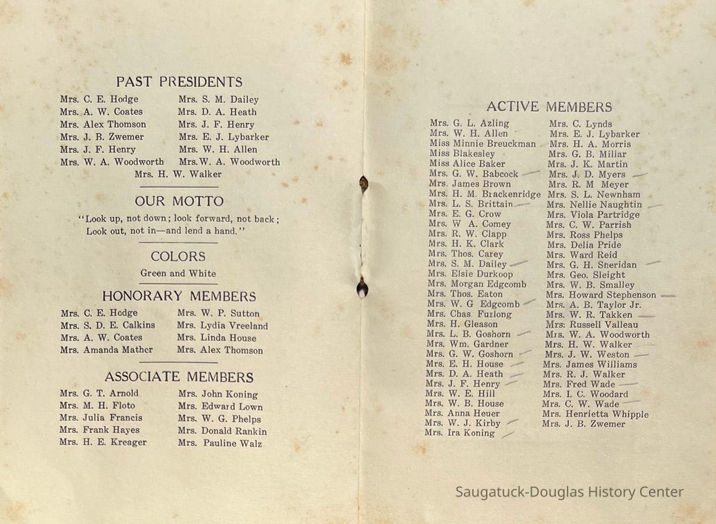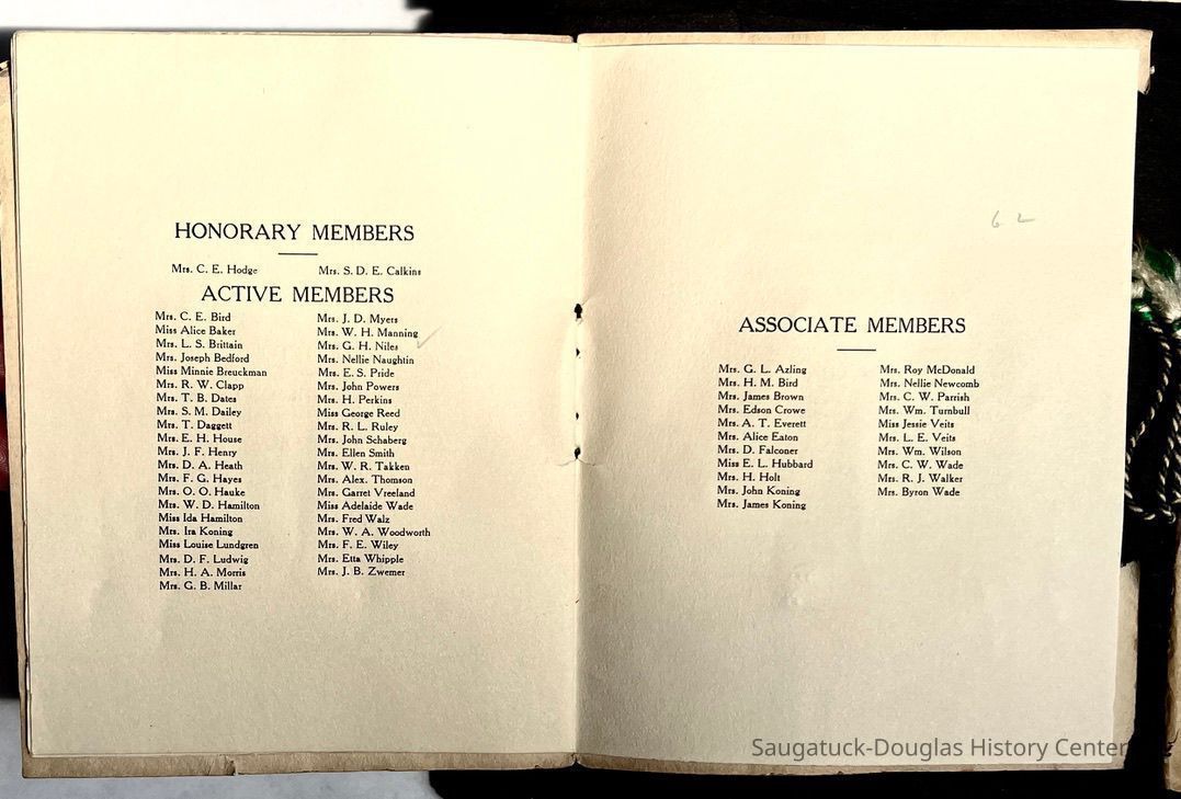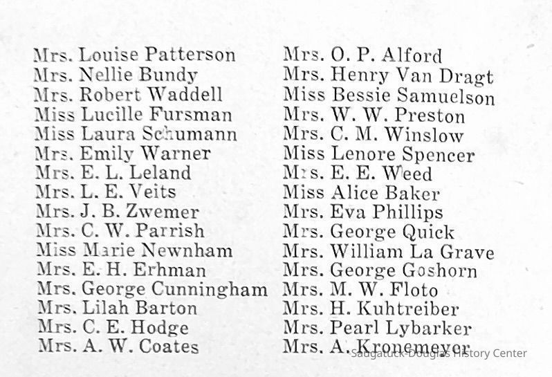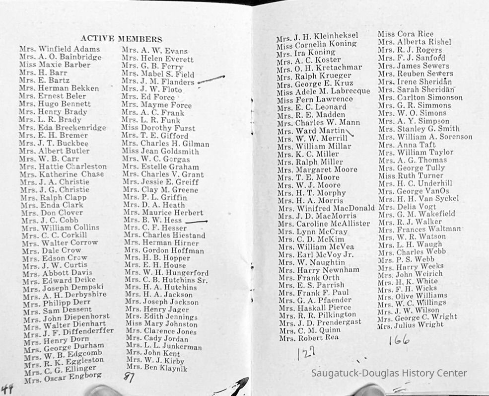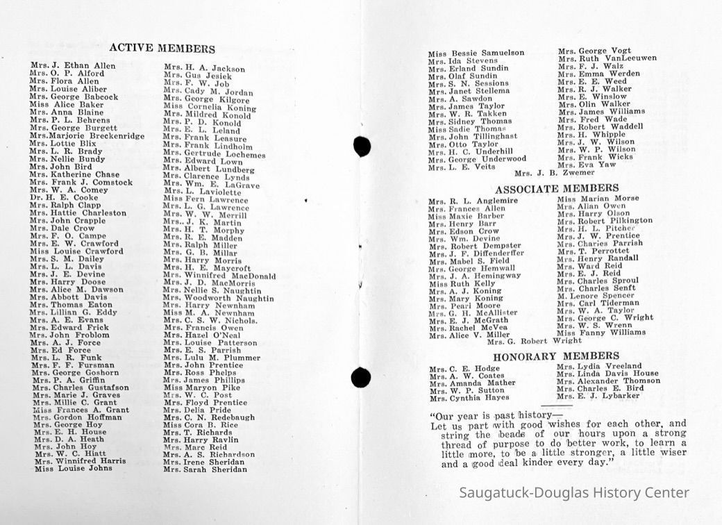 Saugatuck Woman's Club 1904-present, Saugatuck Woman's Club auditorium 1935-present, Heath, May (Francis) 1873-1961, Bird, Harriet “Hattie” Louise (Moffat) (Wright) 1855-1944, Breuckman, Minnie 1869-1934, Coates, Adella "Della" (Holmes) 1864-1950, Thomson, Jeanette Elvira (Harris) 1862-1956, Fox, Johnson 1918-2009, Hodge, Emma Ursula (Gunzenhauser) 1864-1950, Dailey, Margaret, E. (Calkins) 1866-1940, Zwemer, Saburna G. (Woodworth) 1875-1949, Henry, Isabel (Shore) 1856-1936, Woodworth, Alice C. (Redway) Mather 1848-1930, 439 Butler/Butler Pantry/Wilkins/Koning/Nies Hardware, Allen, Flora Elizabeth (Sprang) 1863-1943, Walker, Adelaide Elizabeth (Wade) 1885-1932, Goshorn, Hattie Louise (DePuy) 1874-1953, House, Celia Martin (Gamble) (1890-1976), Millar, Nellie Grant (Raymond) 1861-1956, Jackson, Rhea Bernice (Allen) 1892-1979, Leland, Ruth F. (Baker) 1878-1949, Comey, Alice Maude (Grant) 1870-1944, Davis, Edna Mae (Gaylord) 1896-1980, Wilson, Grace (Cobb) 1897-1992, Sheridan, Irene (Weible) 1883-1967, Waddell, Sadie R. 1882-1947, Wicks, Caroline Jane "Carrie" (Millar) Stillson 1884-1983, Hoffman, Elizabeth S. "Betty" (Gregory) 1894-1960, Brady, Winifred E. (Randall) 1893-1961, Peirce, Roberta "Bobbie" Margaret (Fredrickson) 1914-2004, Carr, Elsie Virginia (Kaufman) 1906-1997, Bieler or Beler, Mrs. Ernest 1904-1954?, Bainbridge, Marguerite (Holladay) 1888-1974, Edgcomb, Ruth M. (Severance) 1915-1997, Taylor, Mrs. Harold