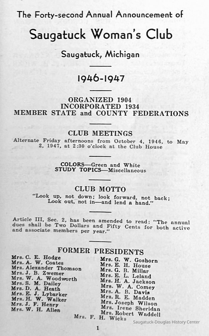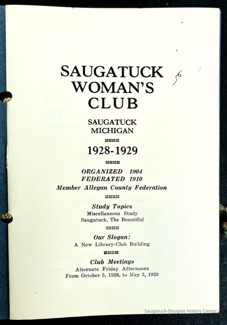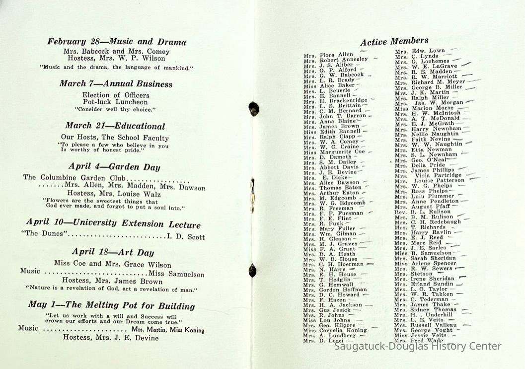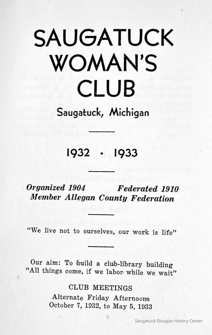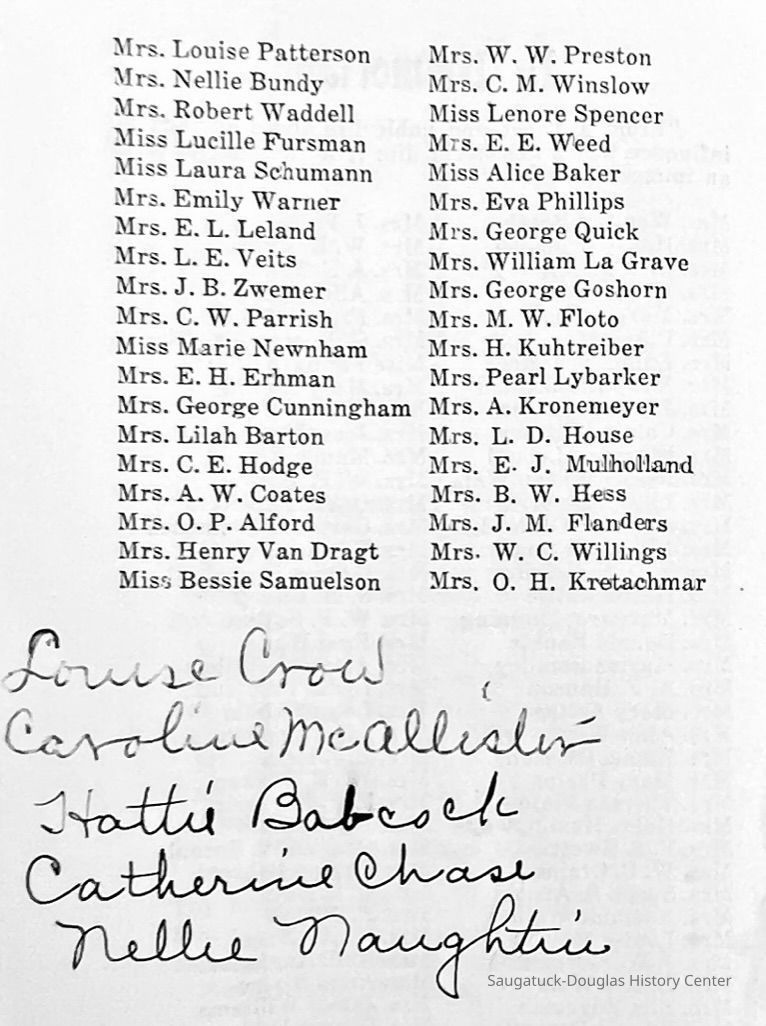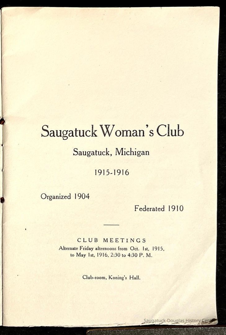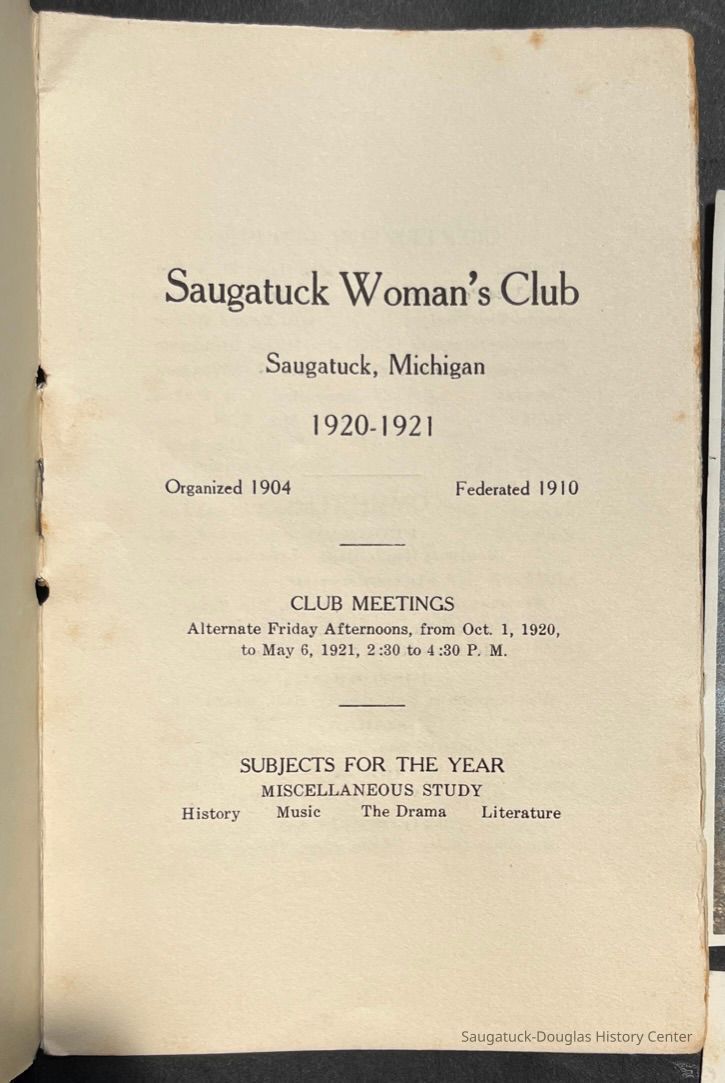 Saugatuck Woman's Club 1904-present, Saugatuck Woman's Club auditorium 1935-present, Heath, May (Francis) 1873-1961, Bird, Harriet “Hattie” Louise (Moffat) (Wright) 1855-1944, Breuckman, Minnie 1869-1934, Coates, Adella "Della" (Holmes) 1864-1950, Thomson, Jeanette Elvira (Harris) 1862-1956, Fox, Johnson 1918-2009, Hodge, Emma Ursula (Gunzenhauser) 1864-1950, Dailey, Margaret, E. (Calkins) 1866-1940, Zwemer, Saburna G. (Woodworth) 1875-1949, Henry, Isabel (Shore) 1856-1936, Woodworth, Alice C. (Redway) Mather 1848-1930, 439 Butler/Butler Pantry/Wilkins/Koning/Nies Hardware, Allen, Flora Elizabeth (Sprang) 1863-1943, Walker, Adelaide Elizabeth (Wade) 1885-1932, Goshorn, Hattie Louise (DePuy) 1874-1953, House, Celia Martin (Gamble) (1890-1976), Millar, Nellie Grant (Raymond) 1861-1956, Jackson, Rhea Bernice (Allen) 1892-1979, Leland, Ruth F. (Baker) 1878-1949, Comey, Alice Maude (Grant) 1870-1944, Davis, Edna Mae (Gaylord) 1896-1980, Wilson, Grace (Cobb) 1897-1992, Sheridan, Irene (Weible) 1883-1967, Waddell, Sadie R. 1882-1947, Wicks, Caroline Jane "Carrie" (Millar) Stillson 1884-1983, Hoffman, Elizabeth S. "Betty" (Gregory) 1894-1960, Brady, Winifred E. (Randall) 1893-1961, Peirce, Roberta "Bobbie" Margaret (Fredrickson) 1914-2004, Carr, Elsie Virginia (Kaufman) 1906-1997, Bieler or Beler, Mrs. Ernest 1904-1954?, Bainbridge, Marguerite (Holladay) 1888-1974, Edgcomb, Ruth M. (Severance) 1915-1997, Taylor, Mrs. Harold