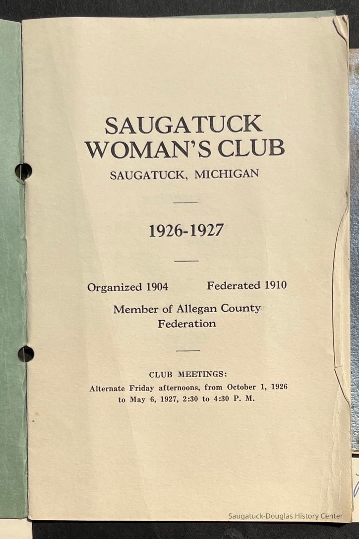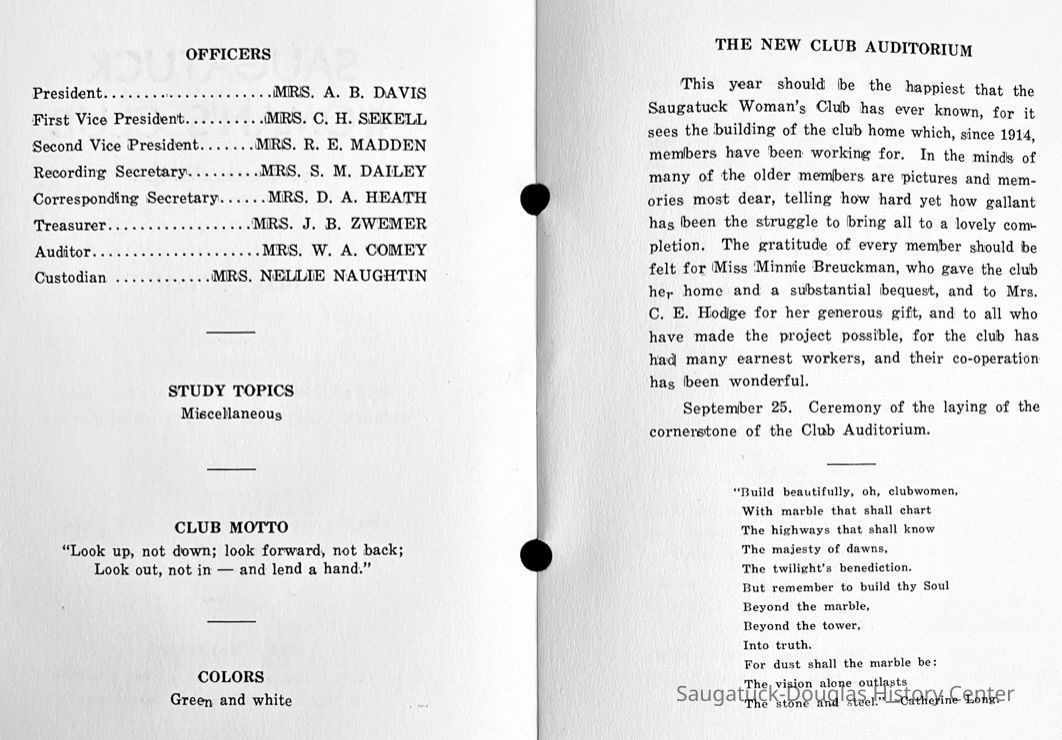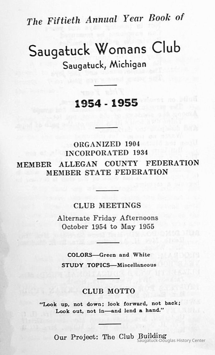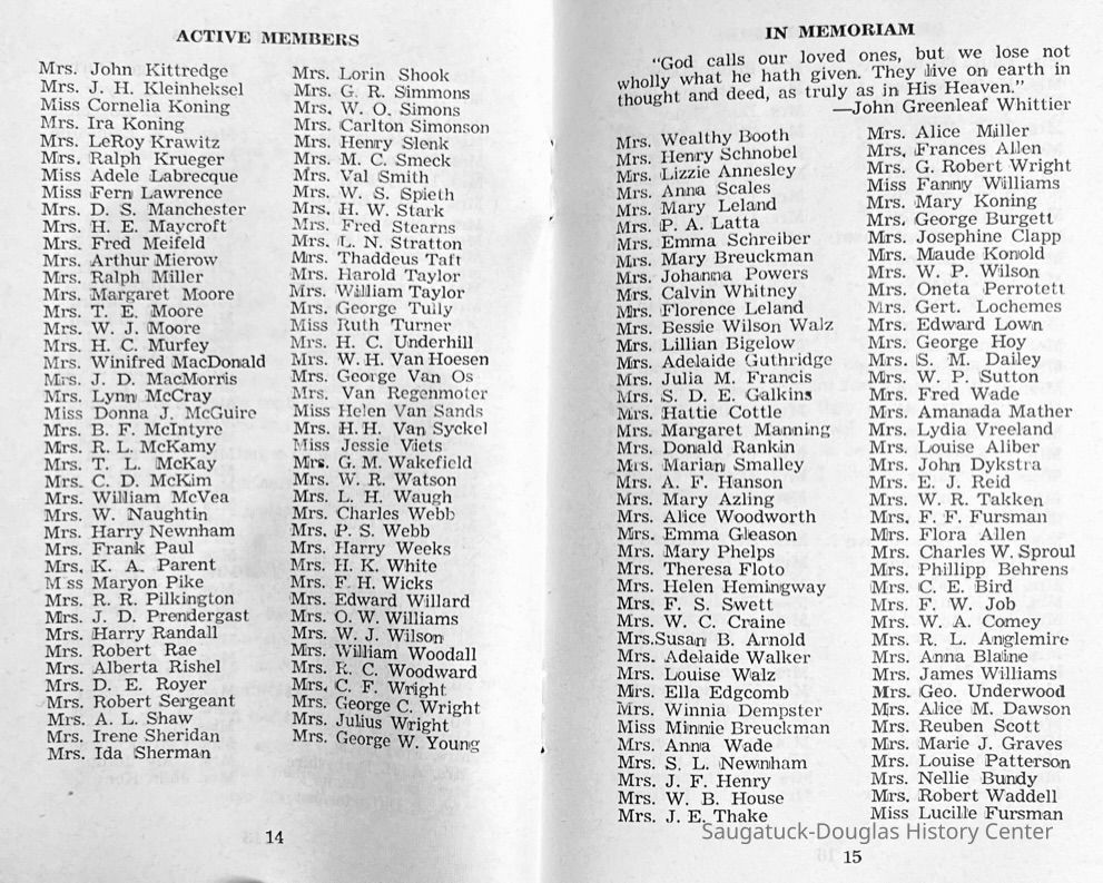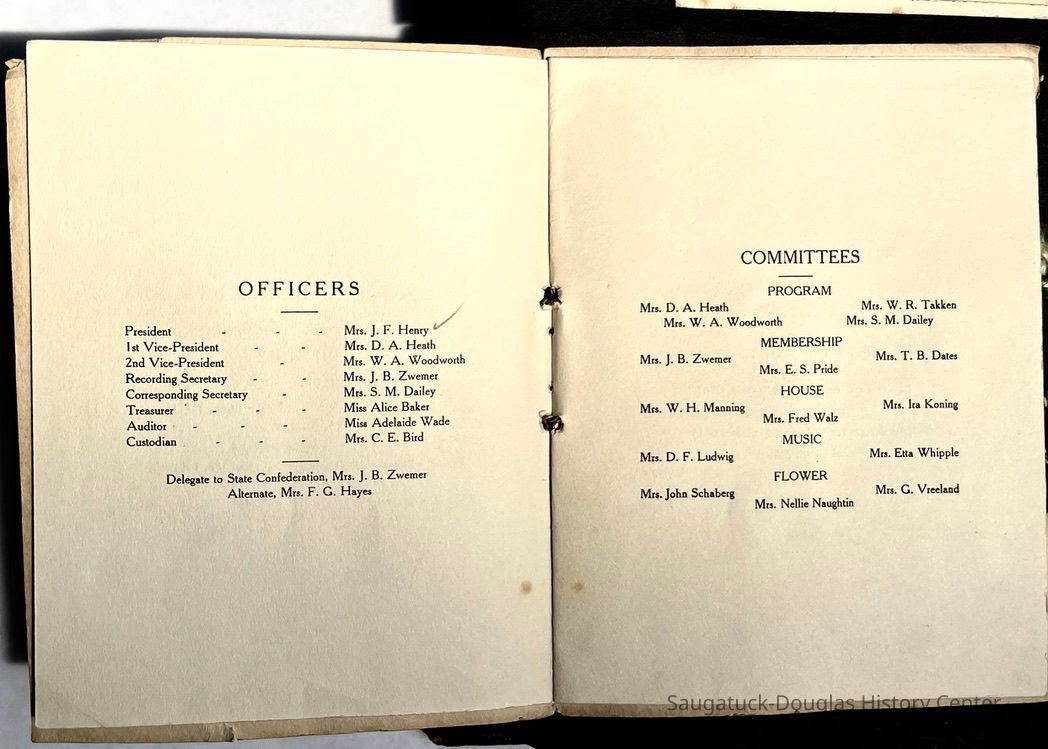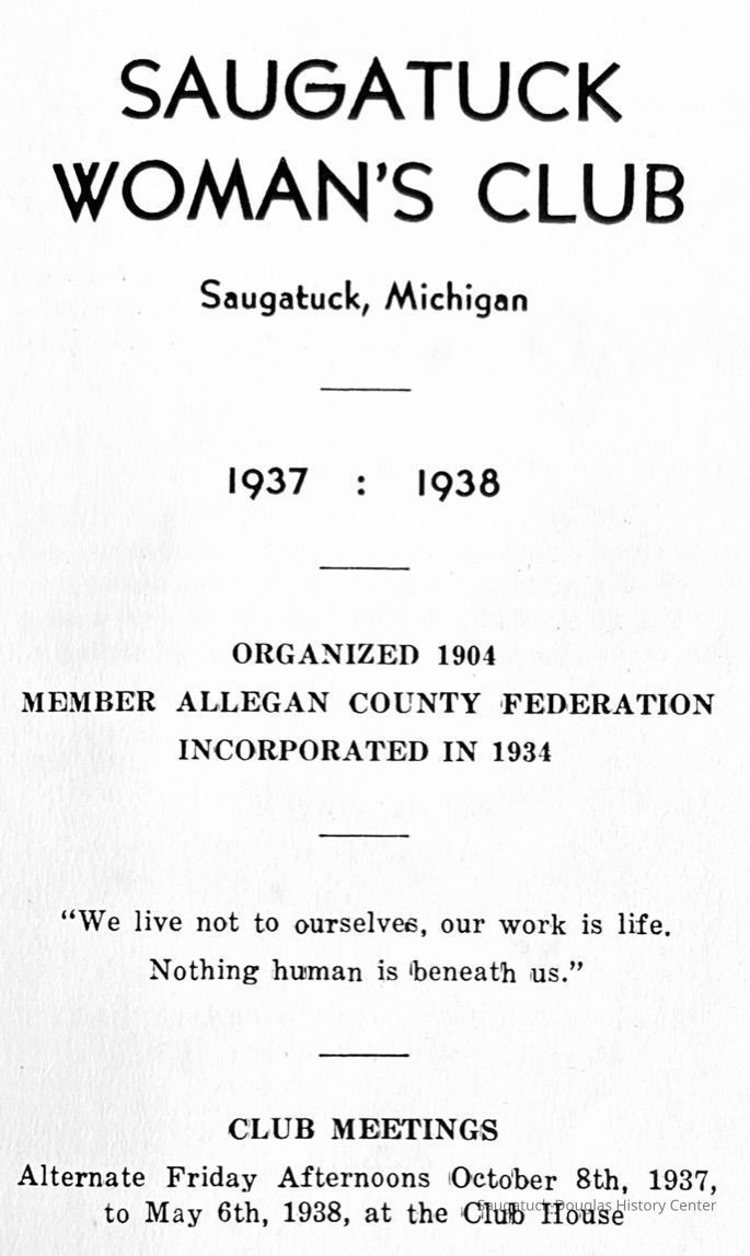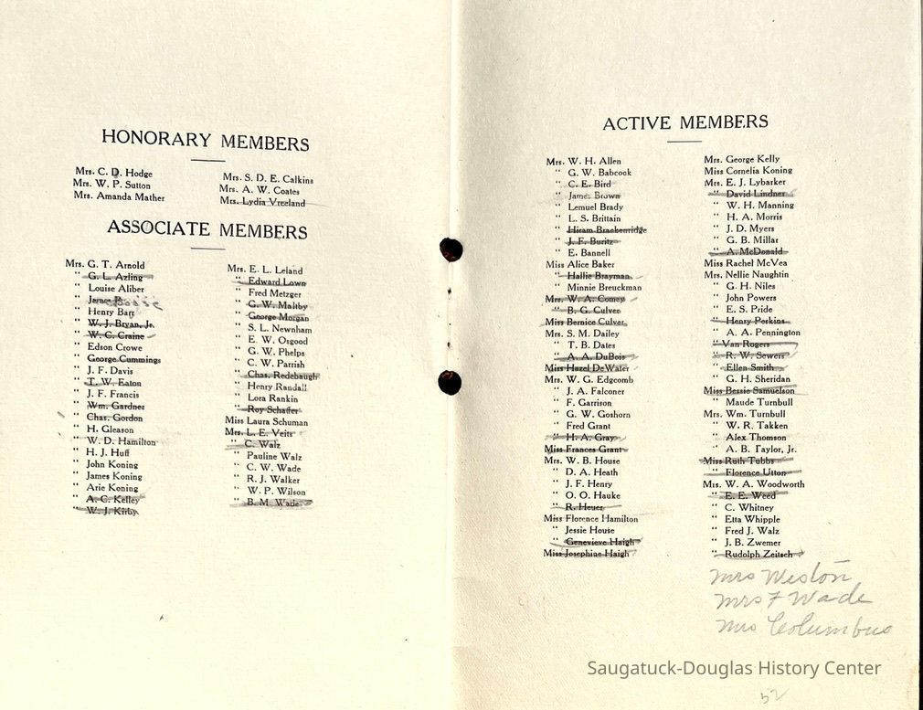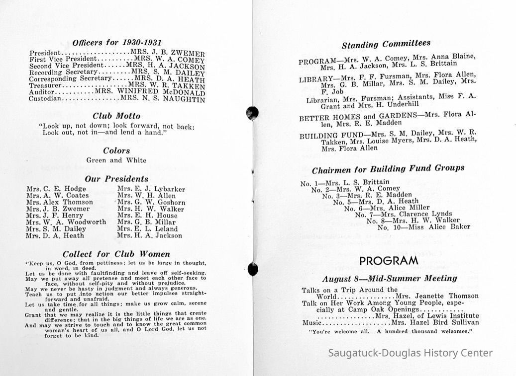 Saugatuck Woman's Club 1904-present, Saugatuck Woman's Club auditorium 1935-present, Heath, May (Francis) 1873-1961, Bird, Harriet “Hattie” Louise (Moffat) (Wright) 1855-1944, Breuckman, Minnie 1869-1934, Coates, Adella "Della" (Holmes) 1864-1950, Thomson, Jeanette Elvira (Harris) 1862-1956, Fox, Johnson 1918-2009, Hodge, Emma Ursula (Gunzenhauser) 1864-1950, Dailey, Margaret, E. (Calkins) 1866-1940, Zwemer, Saburna G. (Woodworth) 1875-1949, Henry, Isabel (Shore) 1856-1936, Woodworth, Alice C. (Redway) Mather 1848-1930, 439 Butler/Butler Pantry/Wilkins/Koning/Nies Hardware, Allen, Flora Elizabeth (Sprang) 1863-1943, Walker, Adelaide Elizabeth (Wade) 1885-1932, Goshorn, Hattie Louise (DePuy) 1874-1953, House, Celia Martin (Gamble) (1890-1976), Millar, Nellie Grant (Raymond) 1861-1956, Jackson, Rhea Bernice (Allen) 1892-1979, Leland, Ruth F. (Baker) 1878-1949, Comey, Alice Maude (Grant) 1870-1944, Davis, Edna Mae (Gaylord) 1896-1980, Wilson, Grace (Cobb) 1897-1992, Sheridan, Irene (Weible) 1883-1967, Waddell, Sadie R. 1882-1947, Wicks, Caroline Jane "Carrie" (Millar) Stillson 1884-1983, Hoffman, Elizabeth S. "Betty" (Gregory) 1894-1960, Brady, Winifred E. (Randall) 1893-1961, Peirce, Roberta "Bobbie" Margaret (Fredrickson) 1914-2004, Carr, Elsie Virginia (Kaufman) 1906-1997, Bieler or Beler, Mrs. Ernest 1904-1954?, Bainbridge, Marguerite (Holladay) 1888-1974, Edgcomb, Ruth M. (Severance) 1915-1997, Taylor, Mrs. Harold