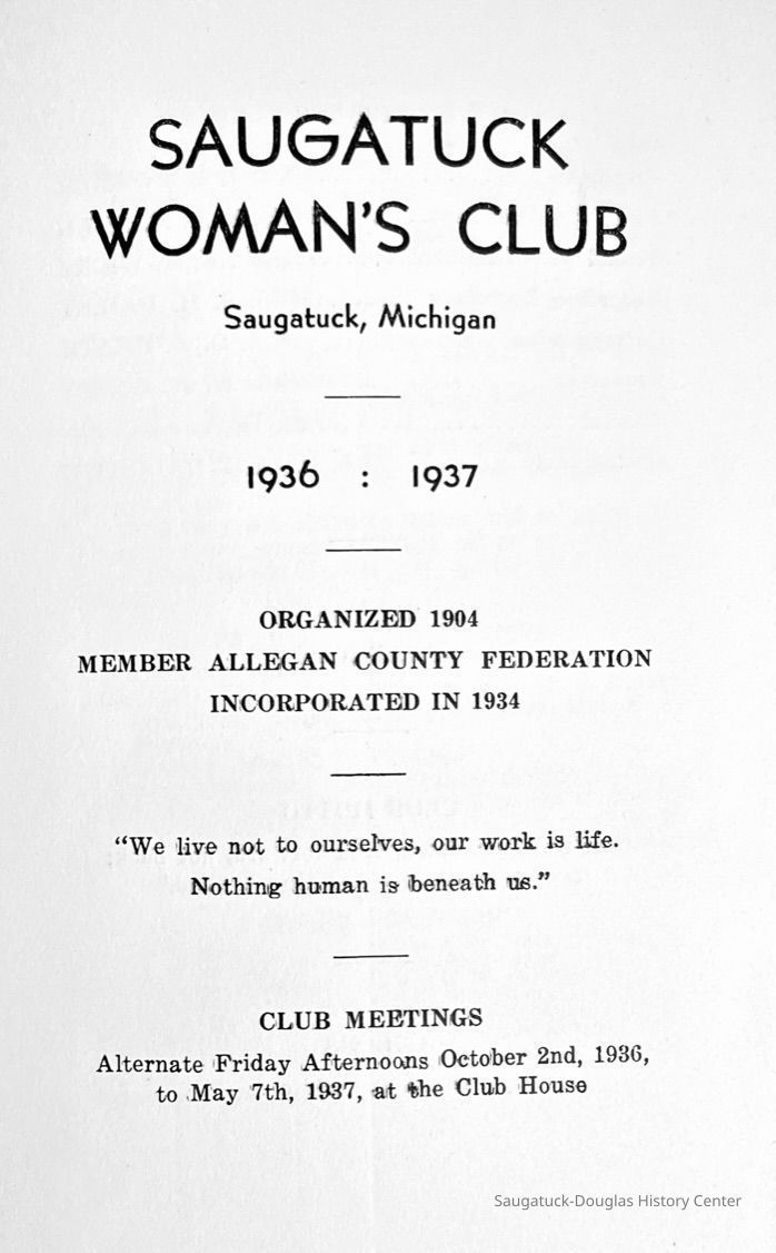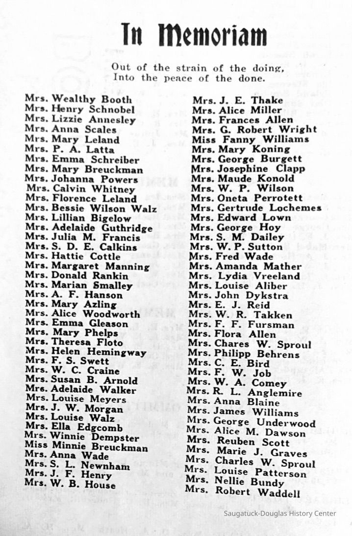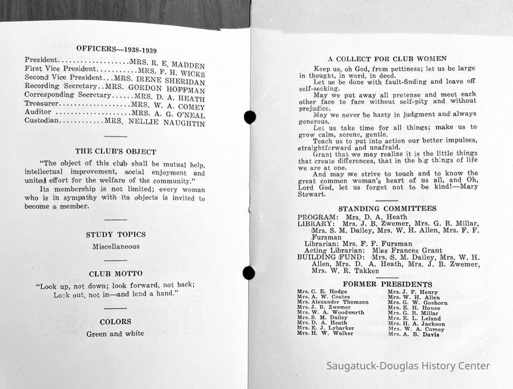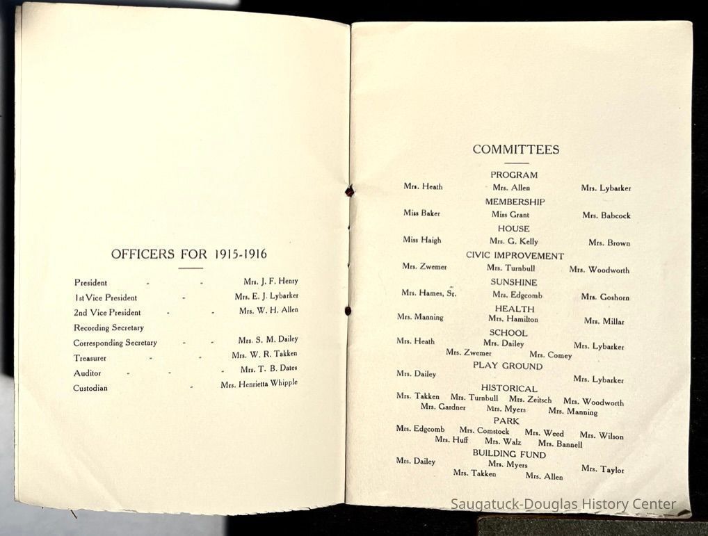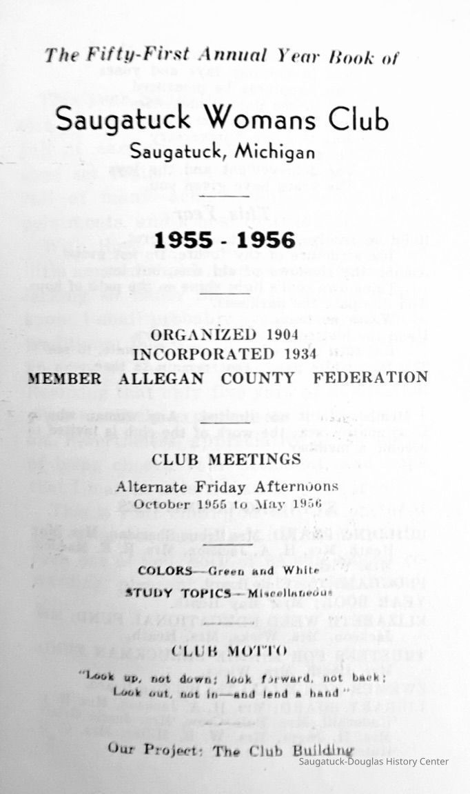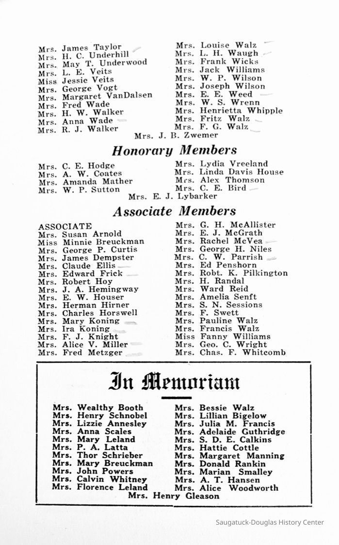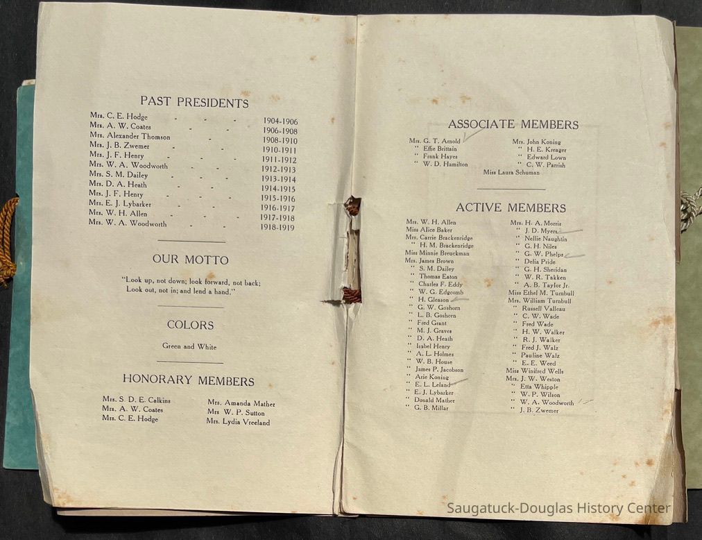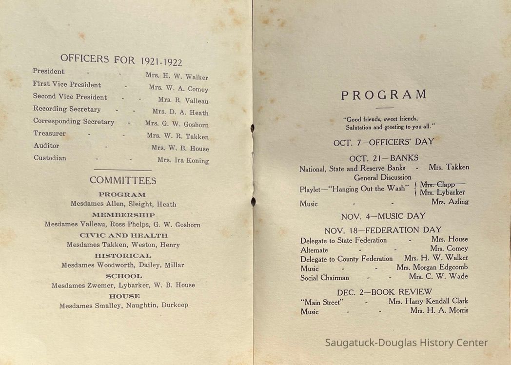 Saugatuck Woman's Club 1904-present, Saugatuck Woman's Club auditorium 1935-present, Heath, May (Francis) 1873-1961, Bird, Harriet “Hattie” Louise (Moffat) (Wright) 1855-1944, Breuckman, Minnie 1869-1934, Coates, Adella "Della" (Holmes) 1864-1950, Thomson, Jeanette Elvira (Harris) 1862-1956, Fox, Johnson 1918-2009, Hodge, Emma Ursula (Gunzenhauser) 1864-1950, Dailey, Margaret, E. (Calkins) 1866-1940, Zwemer, Saburna G. (Woodworth) 1875-1949, Henry, Isabel (Shore) 1856-1936, Woodworth, Alice C. (Redway) Mather 1848-1930, 439 Butler/Butler Pantry/Wilkins/Koning/Nies Hardware, Allen, Flora Elizabeth (Sprang) 1863-1943, Walker, Adelaide Elizabeth (Wade) 1885-1932, Goshorn, Hattie Louise (DePuy) 1874-1953, House, Celia Martin (Gamble) (1890-1976), Millar, Nellie Grant (Raymond) 1861-1956, Jackson, Rhea Bernice (Allen) 1892-1979, Leland, Ruth F. (Baker) 1878-1949, Comey, Alice Maude (Grant) 1870-1944, Davis, Edna Mae (Gaylord) 1896-1980, Wilson, Grace (Cobb) 1897-1992, Sheridan, Irene (Weible) 1883-1967, Waddell, Sadie R. 1882-1947, Wicks, Caroline Jane "Carrie" (Millar) Stillson 1884-1983, Hoffman, Elizabeth S. "Betty" (Gregory) 1894-1960, Brady, Winifred E. (Randall) 1893-1961, Peirce, Roberta "Bobbie" Margaret (Fredrickson) 1914-2004, Carr, Elsie Virginia (Kaufman) 1906-1997, Bieler or Beler, Mrs. Ernest 1904-1954?, Bainbridge, Marguerite (Holladay) 1888-1974, Edgcomb, Ruth M. (Severance) 1915-1997, Taylor, Mrs. Harold