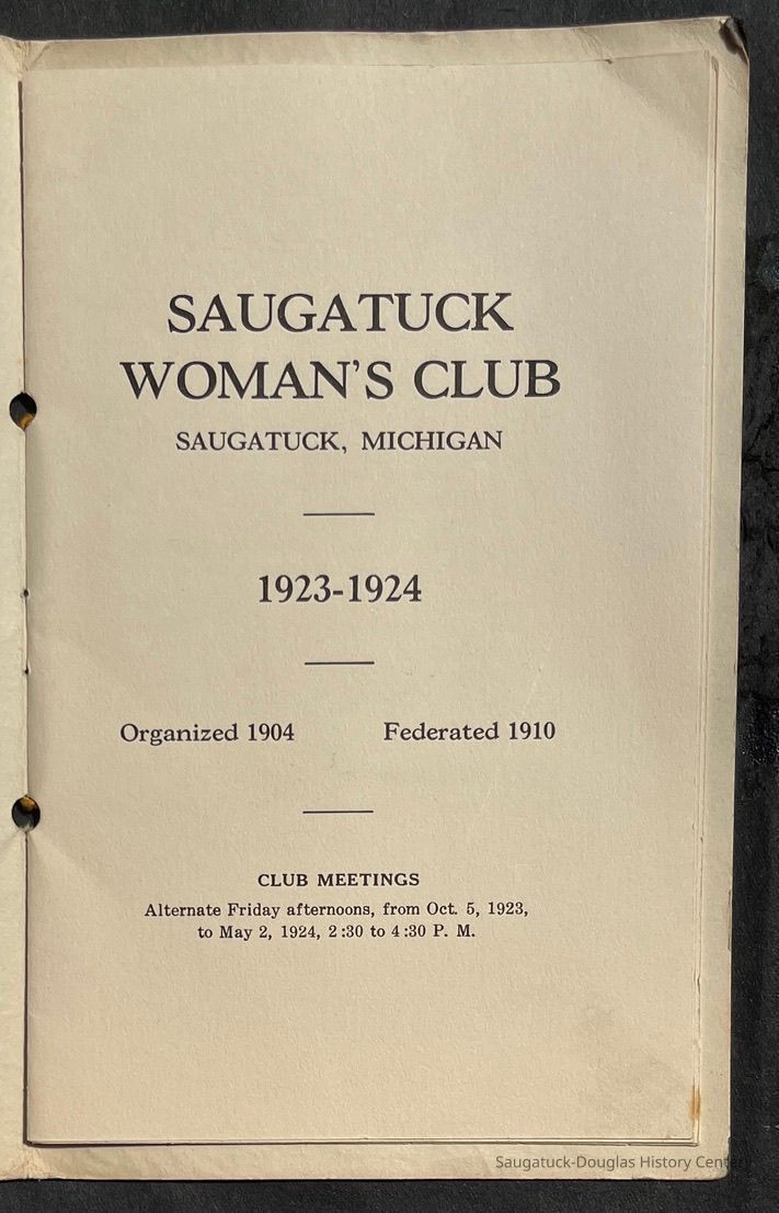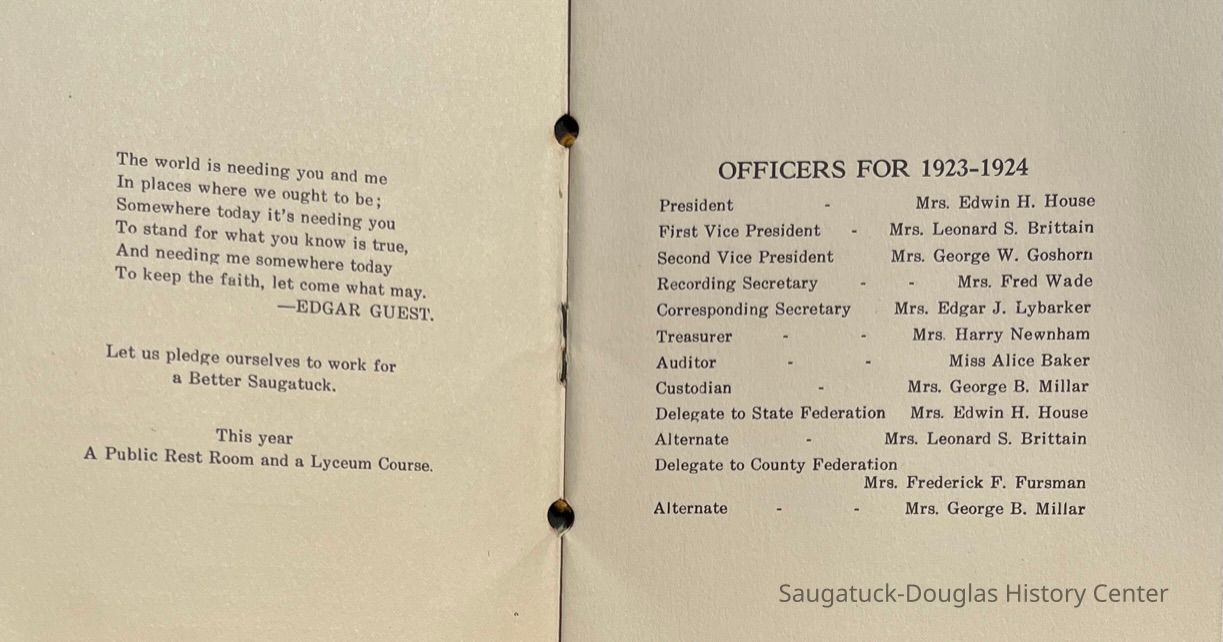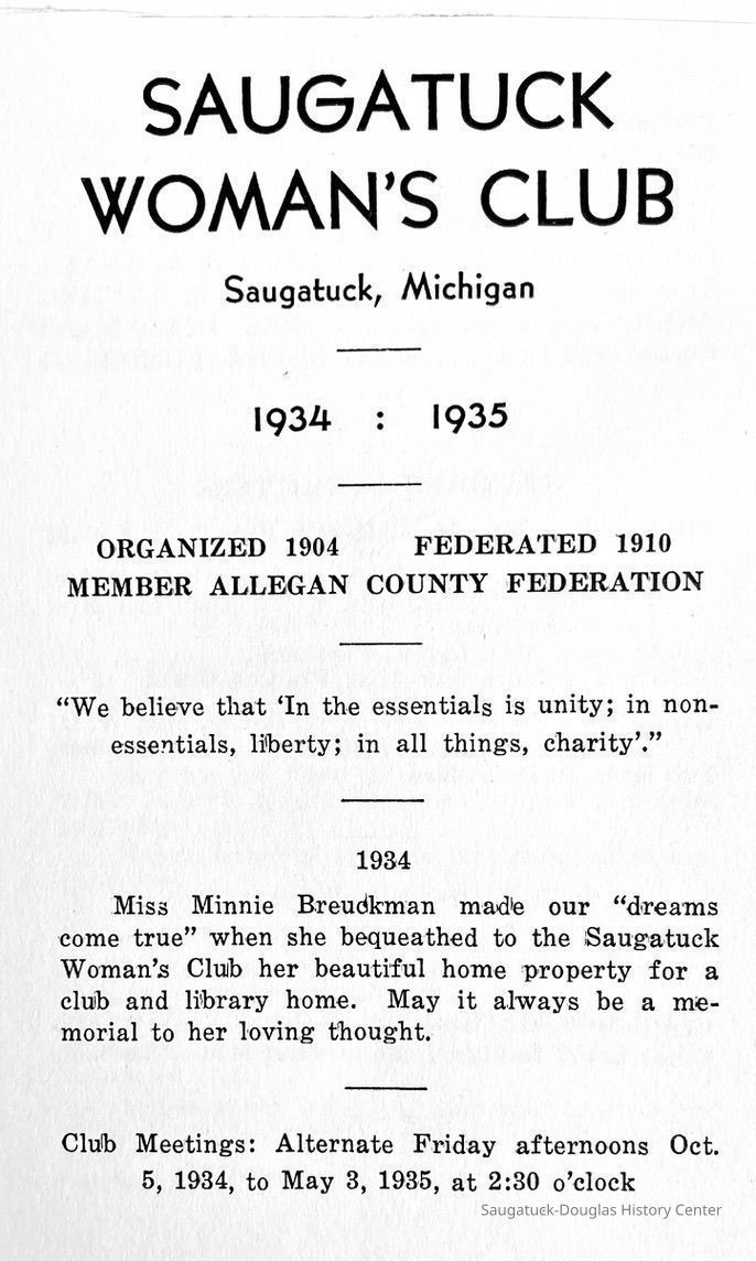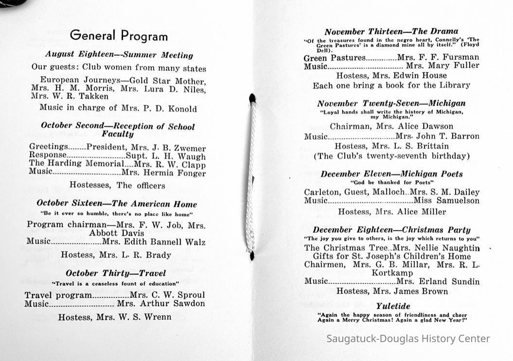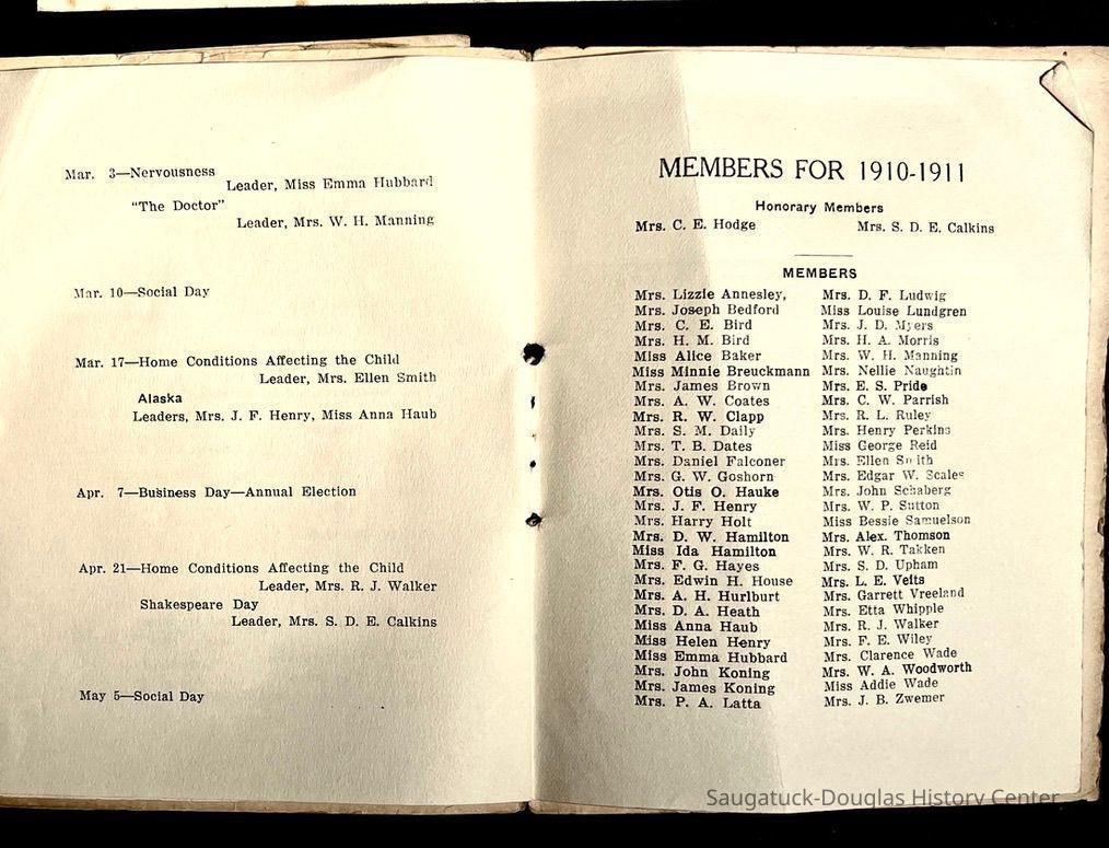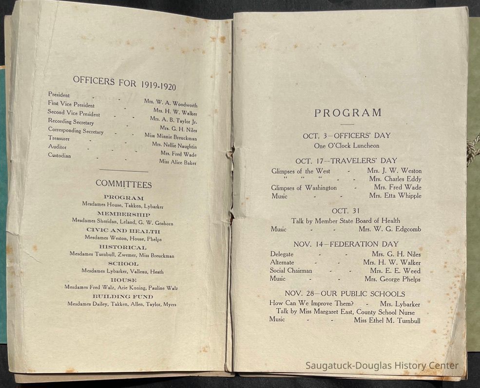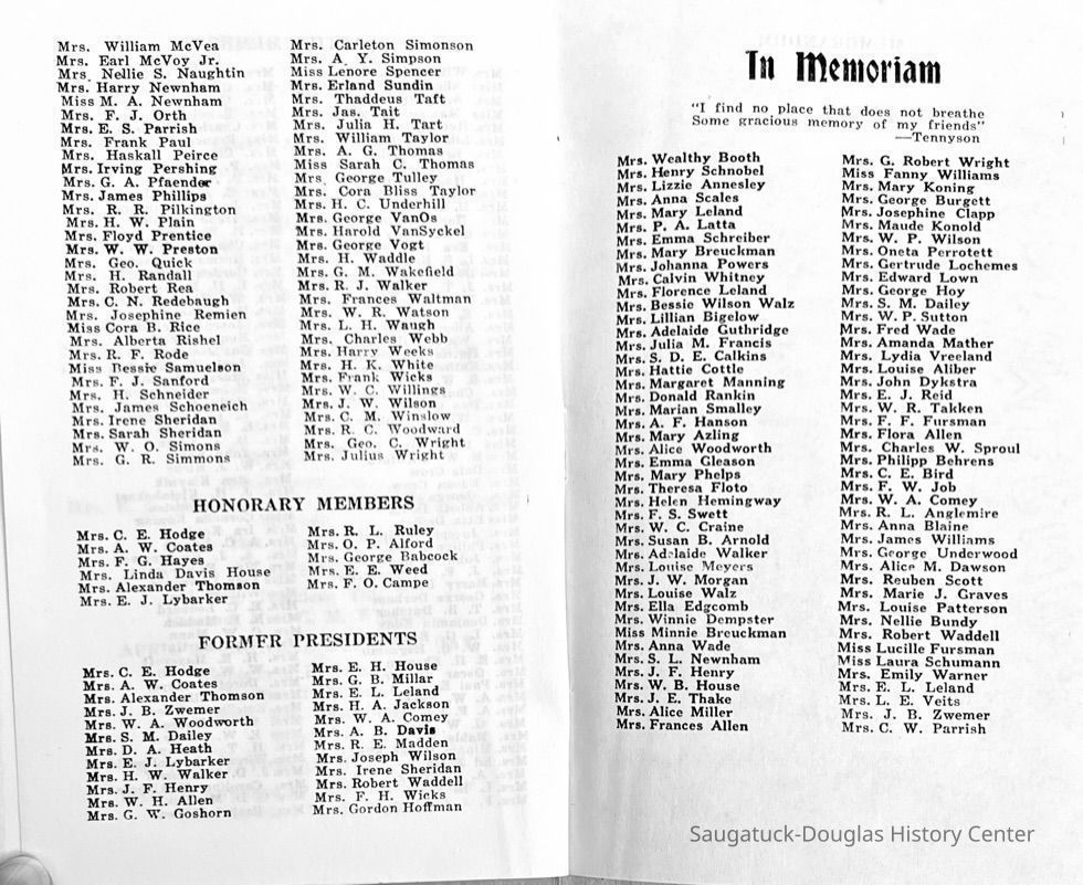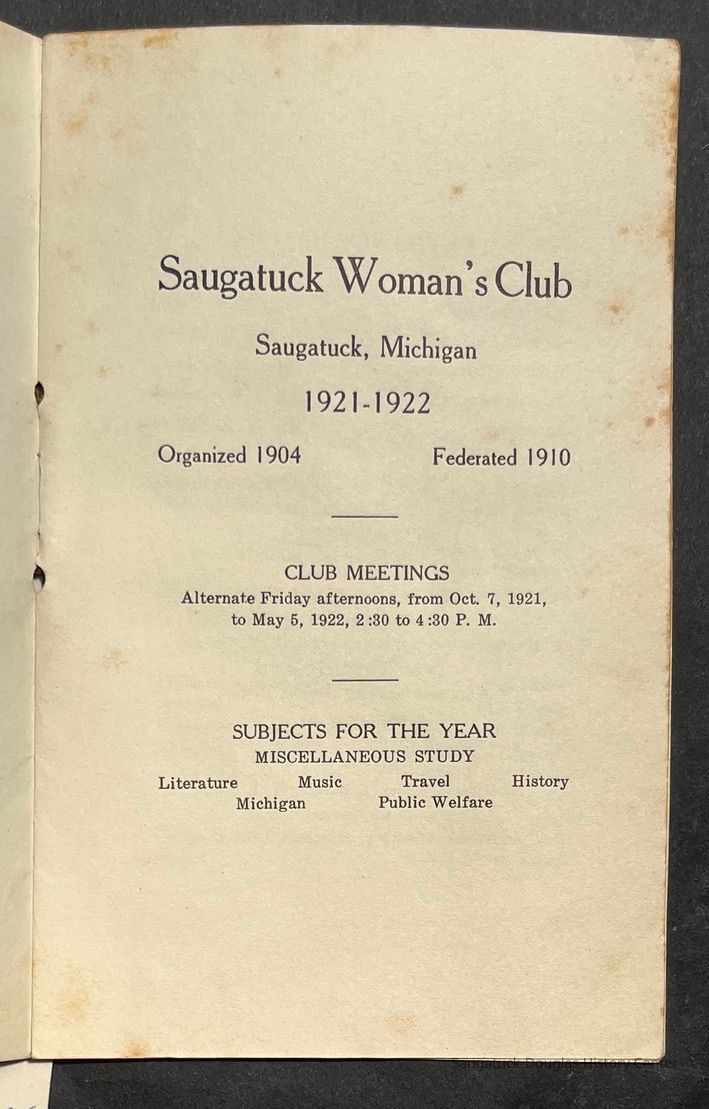 Saugatuck Woman's Club 1904-present, Saugatuck Woman's Club auditorium 1935-present, Heath, May (Francis) 1873-1961, Bird, Harriet “Hattie” Louise (Moffat) (Wright) 1855-1944, Breuckman, Minnie 1869-1934, Coates, Adella "Della" (Holmes) 1864-1950, Thomson, Jeanette Elvira (Harris) 1862-1956, Fox, Johnson 1918-2009, Hodge, Emma Ursula (Gunzenhauser) 1864-1950, Dailey, Margaret, E. (Calkins) 1866-1940, Zwemer, Saburna G. (Woodworth) 1875-1949, Henry, Isabel (Shore) 1856-1936, Woodworth, Alice C. (Redway) Mather 1848-1930, 439 Butler/Butler Pantry/Wilkins/Koning/Nies Hardware, Allen, Flora Elizabeth (Sprang) 1863-1943, Walker, Adelaide Elizabeth (Wade) 1885-1932, Goshorn, Hattie Louise (DePuy) 1874-1953, House, Celia Martin (Gamble) (1890-1976), Millar, Nellie Grant (Raymond) 1861-1956, Jackson, Rhea Bernice (Allen) 1892-1979, Leland, Ruth F. (Baker) 1878-1949, Comey, Alice Maude (Grant) 1870-1944, Davis, Edna Mae (Gaylord) 1896-1980, Wilson, Grace (Cobb) 1897-1992, Sheridan, Irene (Weible) 1883-1967, Waddell, Sadie R. 1882-1947, Wicks, Caroline Jane "Carrie" (Millar) Stillson 1884-1983, Hoffman, Elizabeth S. "Betty" (Gregory) 1894-1960, Brady, Winifred E. (Randall) 1893-1961, Peirce, Roberta "Bobbie" Margaret (Fredrickson) 1914-2004, Carr, Elsie Virginia (Kaufman) 1906-1997, Bieler or Beler, Mrs. Ernest 1904-1954?, Bainbridge, Marguerite (Holladay) 1888-1974, Edgcomb, Ruth M. (Severance) 1915-1997, Taylor, Mrs. Harold