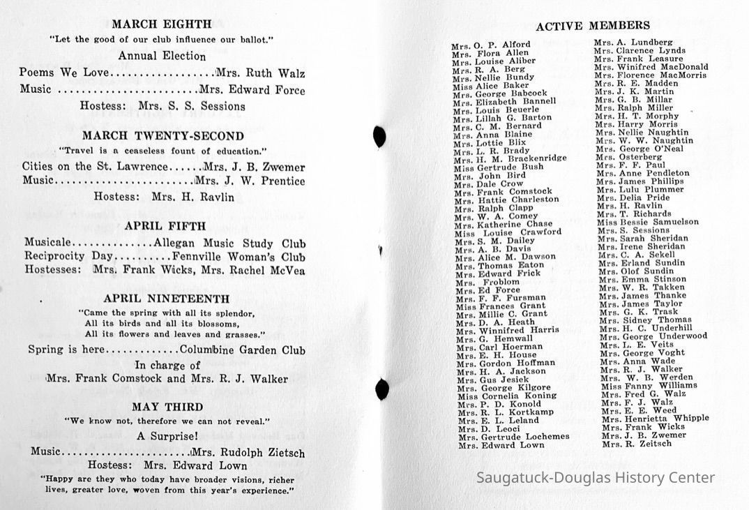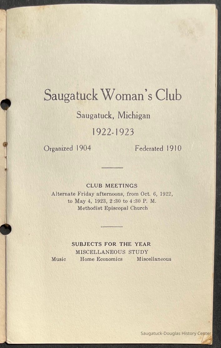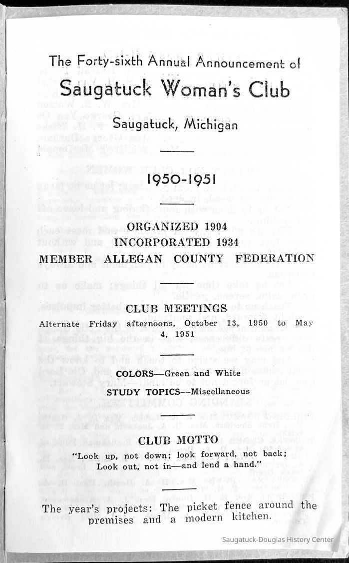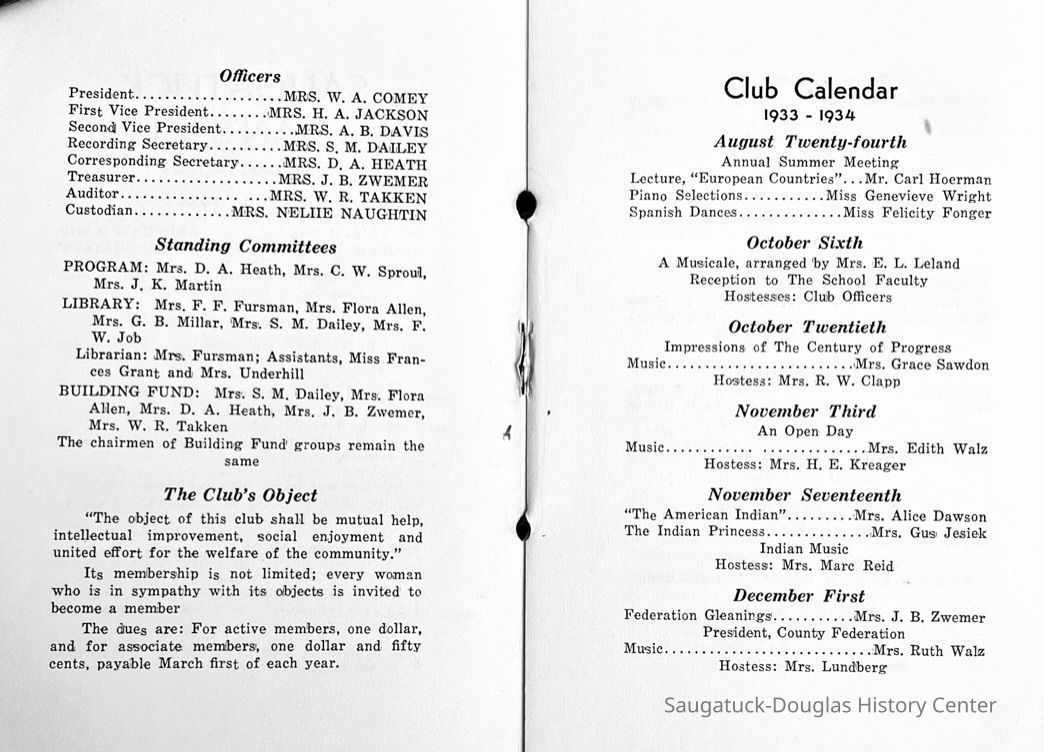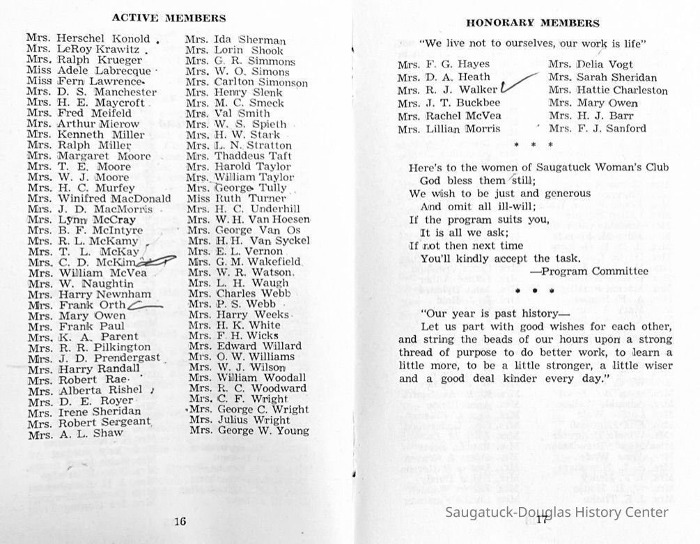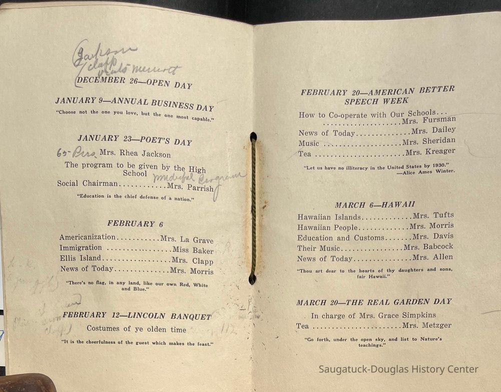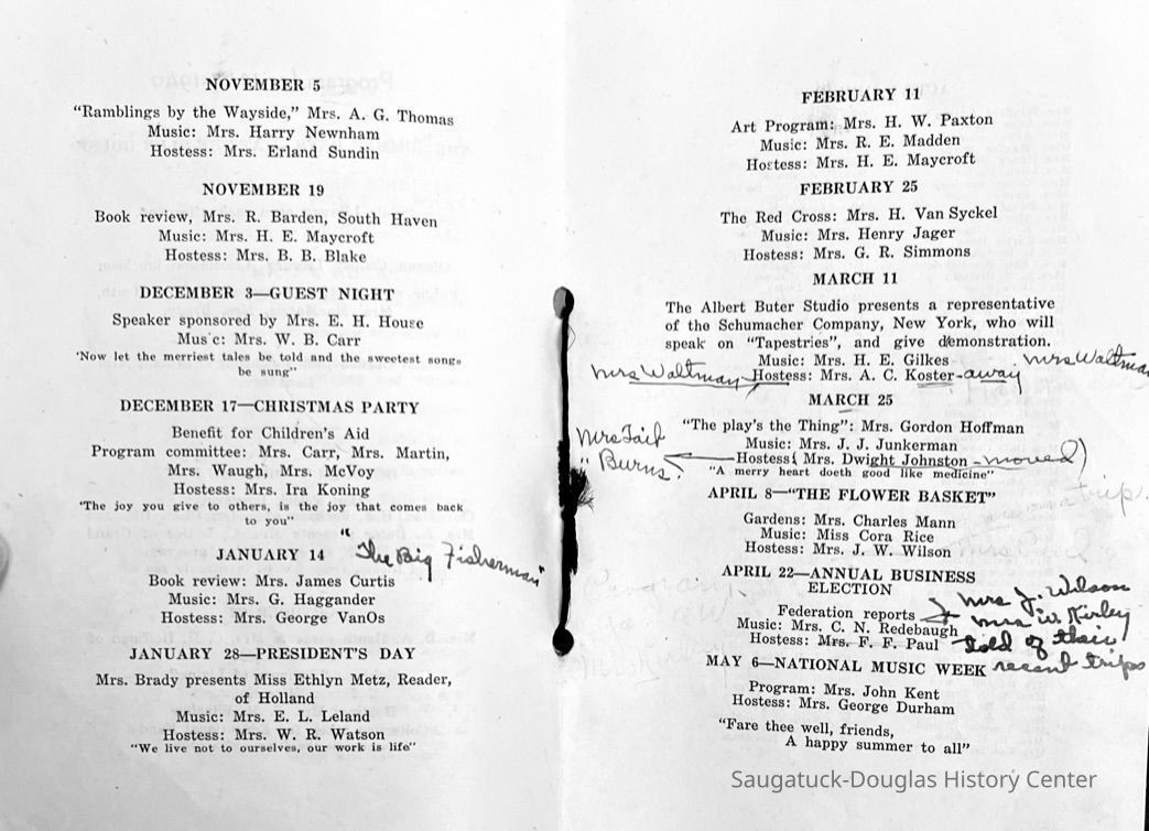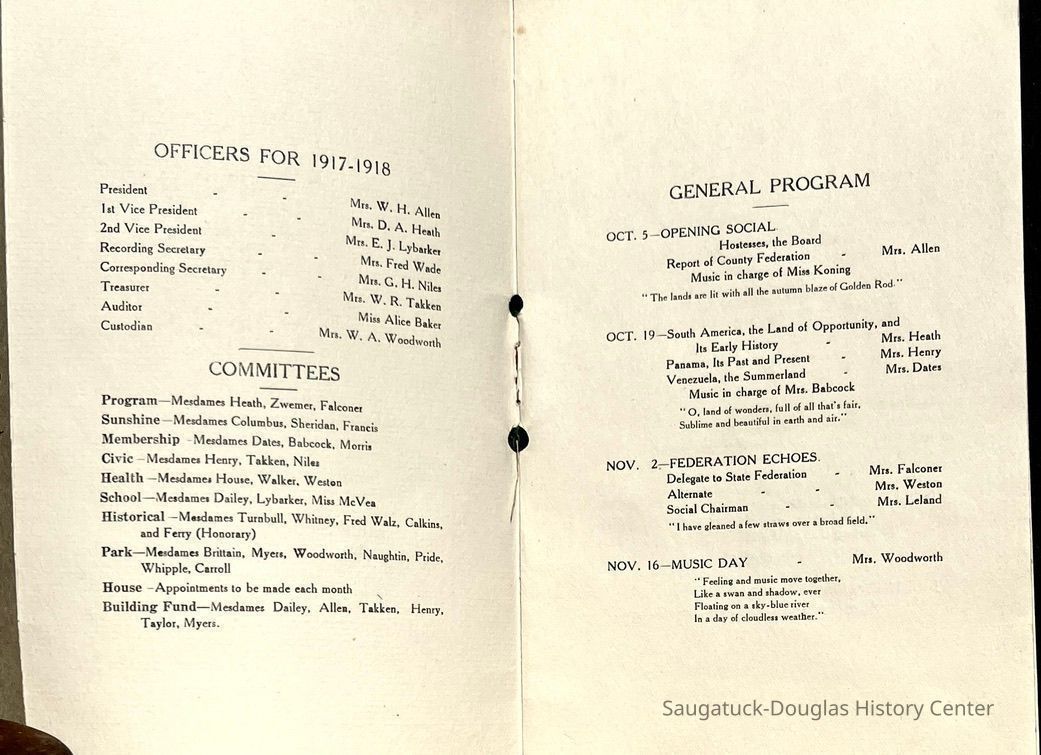 Saugatuck Woman's Club 1904-present, Saugatuck Woman's Club auditorium 1935-present, Heath, May (Francis) 1873-1961, Bird, Harriet “Hattie” Louise (Moffat) (Wright) 1855-1944, Breuckman, Minnie 1869-1934, Coates, Adella "Della" (Holmes) 1864-1950, Thomson, Jeanette Elvira (Harris) 1862-1956, Fox, Johnson 1918-2009, Hodge, Emma Ursula (Gunzenhauser) 1864-1950, Dailey, Margaret, E. (Calkins) 1866-1940, Zwemer, Saburna G. (Woodworth) 1875-1949, Henry, Isabel (Shore) 1856-1936, Woodworth, Alice C. (Redway) Mather 1848-1930, 439 Butler/Butler Pantry/Wilkins/Koning/Nies Hardware, Allen, Flora Elizabeth (Sprang) 1863-1943, Walker, Adelaide Elizabeth (Wade) 1885-1932, Goshorn, Hattie Louise (DePuy) 1874-1953, House, Celia Martin (Gamble) (1890-1976), Millar, Nellie Grant (Raymond) 1861-1956, Jackson, Rhea Bernice (Allen) 1892-1979, Leland, Ruth F. (Baker) 1878-1949, Comey, Alice Maude (Grant) 1870-1944, Davis, Edna Mae (Gaylord) 1896-1980, Wilson, Grace (Cobb) 1897-1992, Sheridan, Irene (Weible) 1883-1967, Waddell, Sadie R. 1882-1947, Wicks, Caroline Jane "Carrie" (Millar) Stillson 1884-1983, Hoffman, Elizabeth S. "Betty" (Gregory) 1894-1960, Brady, Winifred E. (Randall) 1893-1961, Peirce, Roberta "Bobbie" Margaret (Fredrickson) 1914-2004, Carr, Elsie Virginia (Kaufman) 1906-1997, Bieler or Beler, Mrs. Ernest 1904-1954?, Bainbridge, Marguerite (Holladay) 1888-1974, Edgcomb, Ruth M. (Severance) 1915-1997, Taylor, Mrs. Harold