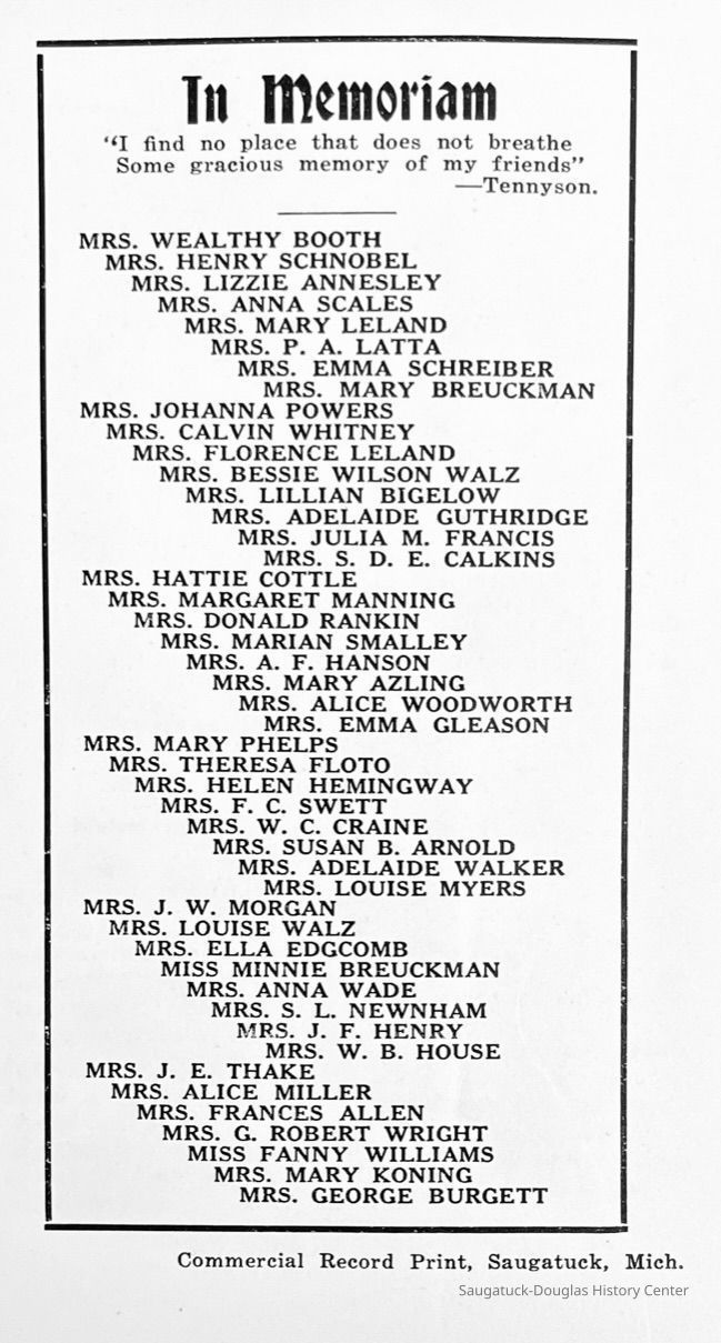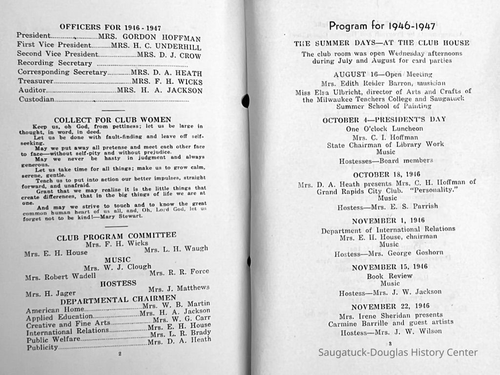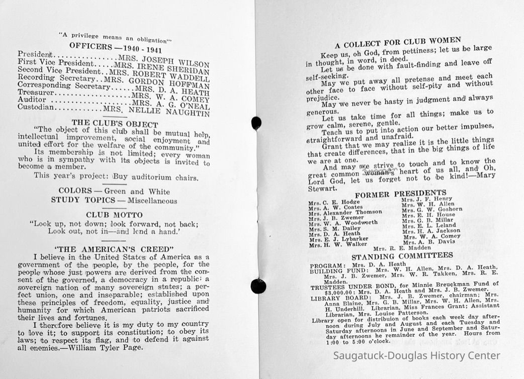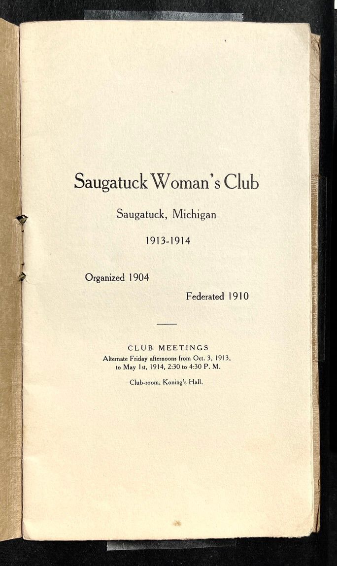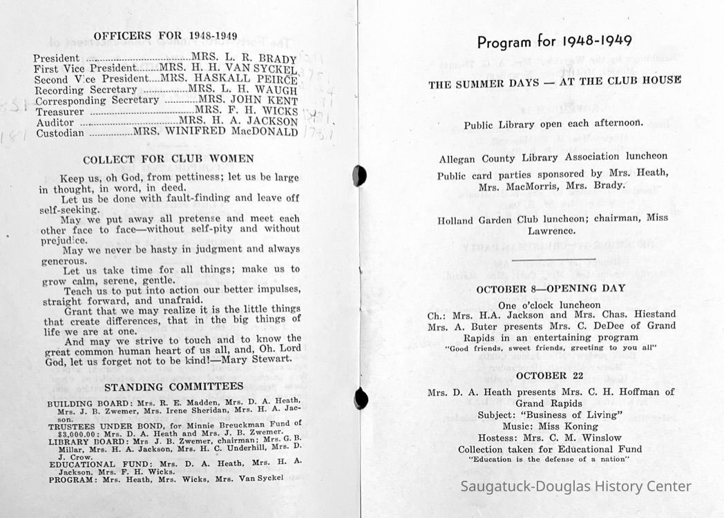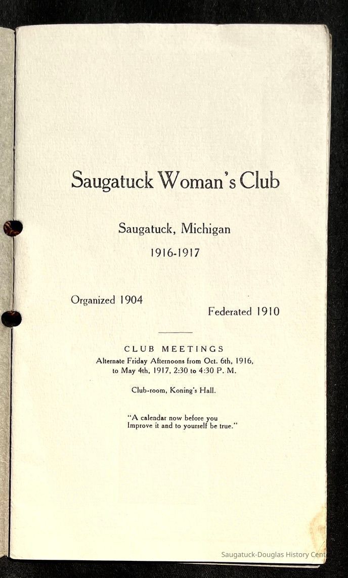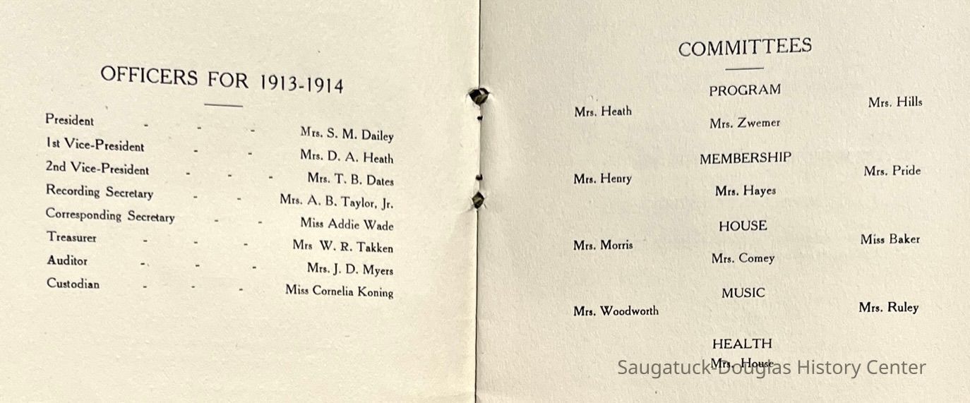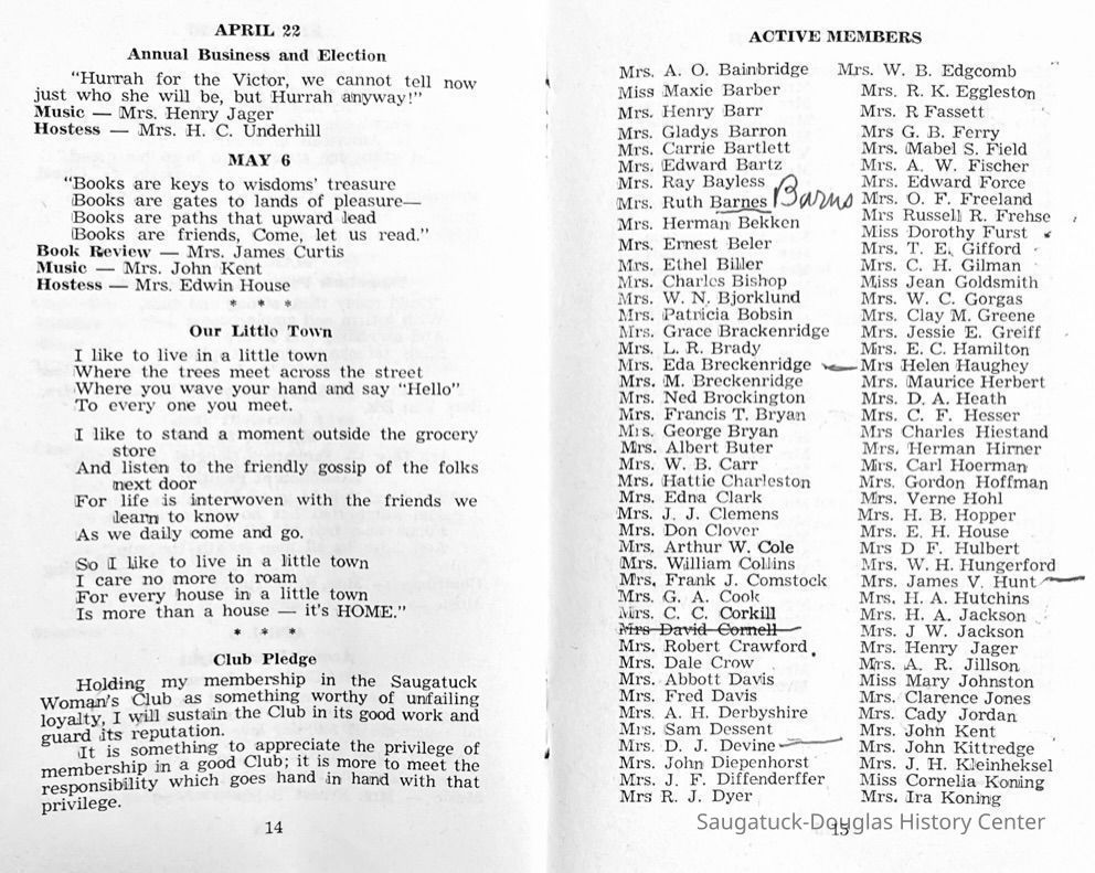 Saugatuck Woman's Club 1904-present, Saugatuck Woman's Club auditorium 1935-present, Heath, May (Francis) 1873-1961, Bird, Harriet “Hattie” Louise (Moffat) (Wright) 1855-1944, Breuckman, Minnie 1869-1934, Coates, Adella "Della" (Holmes) 1864-1950, Thomson, Jeanette Elvira (Harris) 1862-1956, Fox, Johnson 1918-2009, Hodge, Emma Ursula (Gunzenhauser) 1864-1950, Dailey, Margaret, E. (Calkins) 1866-1940, Zwemer, Saburna G. (Woodworth) 1875-1949, Henry, Isabel (Shore) 1856-1936, Woodworth, Alice C. (Redway) Mather 1848-1930, 439 Butler/Butler Pantry/Wilkins/Koning/Nies Hardware, Allen, Flora Elizabeth (Sprang) 1863-1943, Walker, Adelaide Elizabeth (Wade) 1885-1932, Goshorn, Hattie Louise (DePuy) 1874-1953, House, Celia Martin (Gamble) (1890-1976), Millar, Nellie Grant (Raymond) 1861-1956, Jackson, Rhea Bernice (Allen) 1892-1979, Leland, Ruth F. (Baker) 1878-1949, Comey, Alice Maude (Grant) 1870-1944, Davis, Edna Mae (Gaylord) 1896-1980, Wilson, Grace (Cobb) 1897-1992, Sheridan, Irene (Weible) 1883-1967, Waddell, Sadie R. 1882-1947, Wicks, Caroline Jane "Carrie" (Millar) Stillson 1884-1983, Hoffman, Elizabeth S. "Betty" (Gregory) 1894-1960, Brady, Winifred E. (Randall) 1893-1961, Peirce, Roberta "Bobbie" Margaret (Fredrickson) 1914-2004, Carr, Elsie Virginia (Kaufman) 1906-1997, Bieler or Beler, Mrs. Ernest 1904-1954?, Bainbridge, Marguerite (Holladay) 1888-1974, Edgcomb, Ruth M. (Severance) 1915-1997, Taylor, Mrs. Harold
