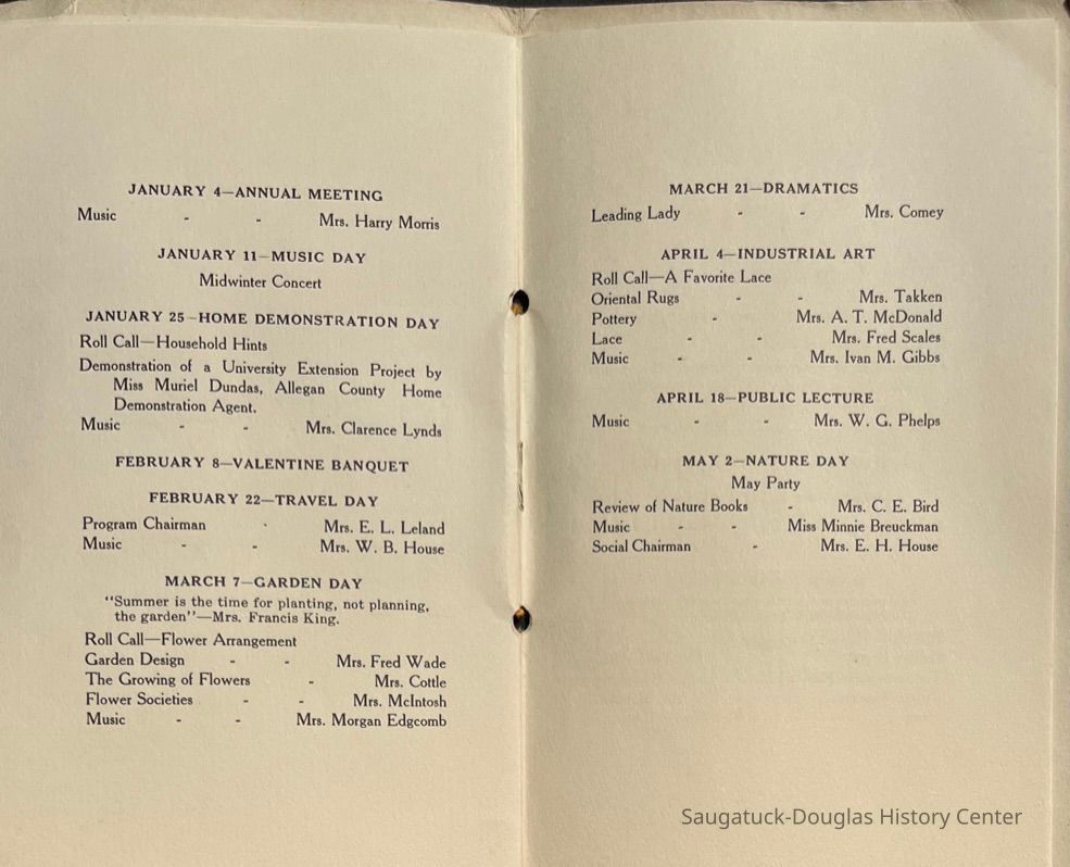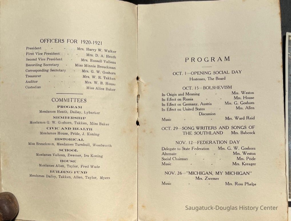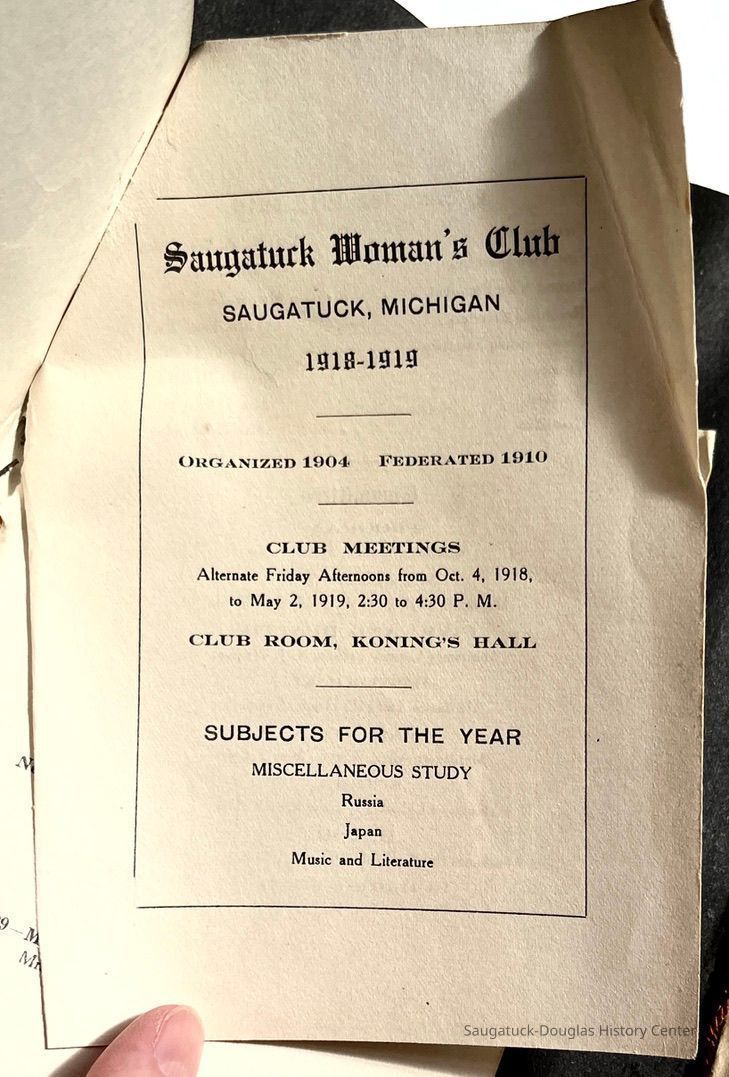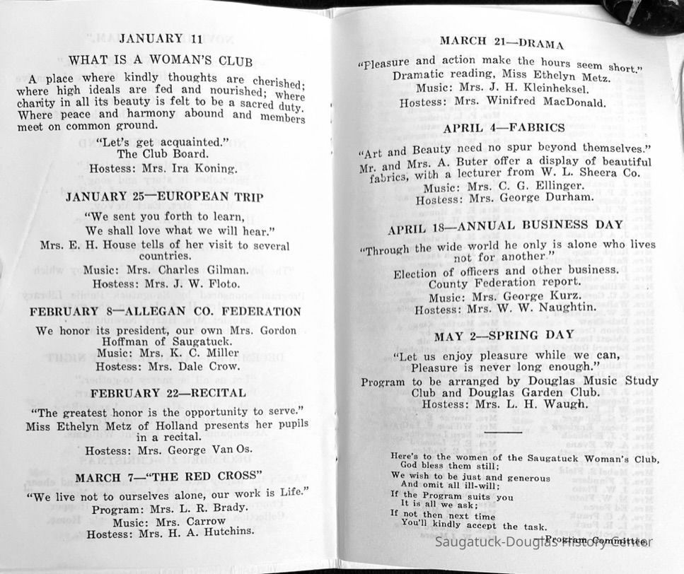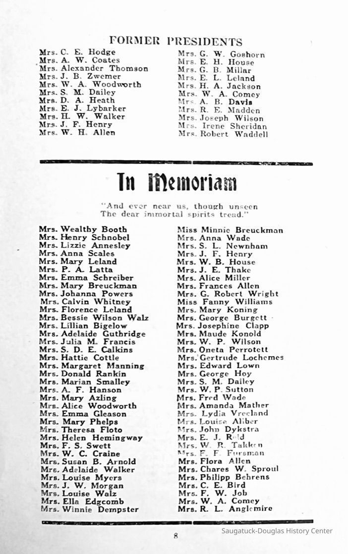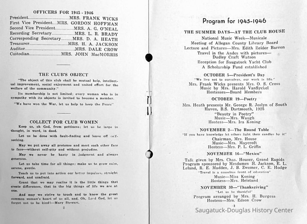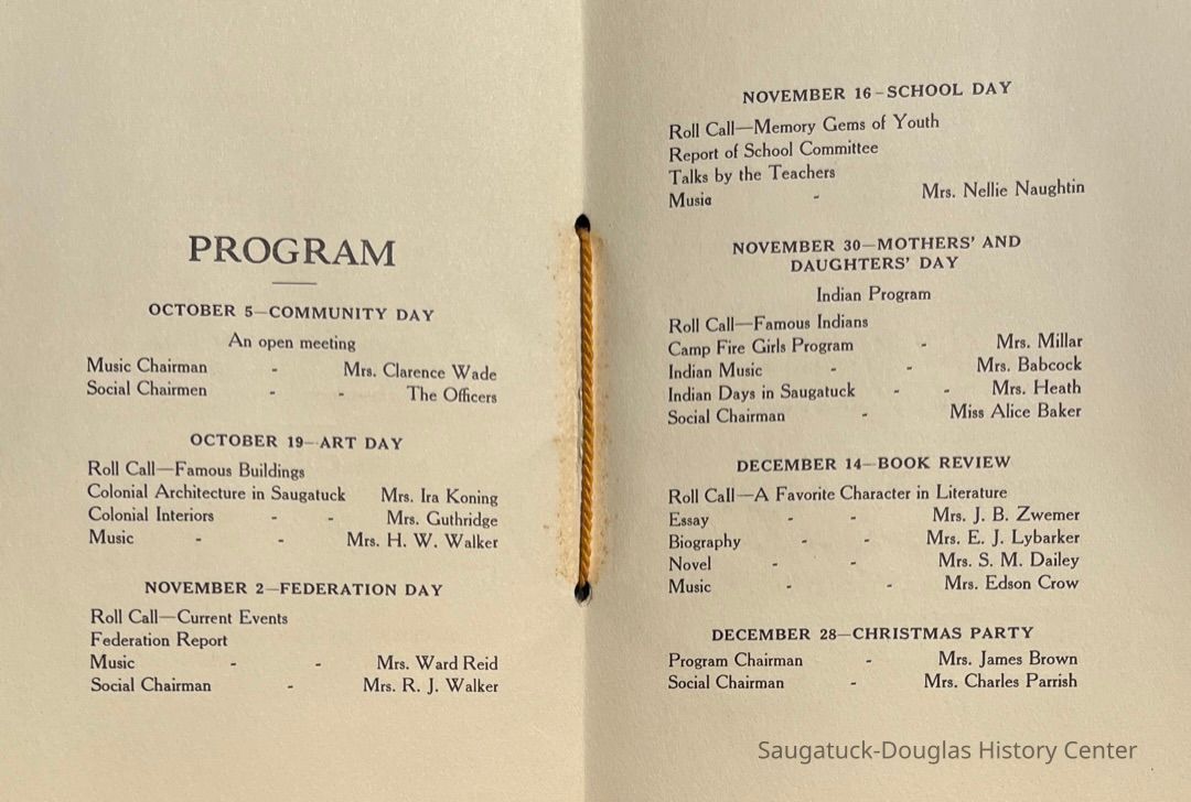 Saugatuck Woman's Club 1904-present, Saugatuck Woman's Club auditorium 1935-present, Heath, May (Francis) 1873-1961, Bird, Harriet “Hattie” Louise (Moffat) (Wright) 1855-1944, Breuckman, Minnie 1869-1934, Coates, Adella "Della" (Holmes) 1864-1950, Thomson, Jeanette Elvira (Harris) 1862-1956, Fox, Johnson 1918-2009, Hodge, Emma Ursula (Gunzenhauser) 1864-1950, Dailey, Margaret, E. (Calkins) 1866-1940, Zwemer, Saburna G. (Woodworth) 1875-1949, Henry, Isabel (Shore) 1856-1936, Woodworth, Alice C. (Redway) Mather 1848-1930, 439 Butler/Butler Pantry/Wilkins/Koning/Nies Hardware, Allen, Flora Elizabeth (Sprang) 1863-1943, Walker, Adelaide Elizabeth (Wade) 1885-1932, Goshorn, Hattie Louise (DePuy) 1874-1953, House, Celia Martin (Gamble) (1890-1976), Millar, Nellie Grant (Raymond) 1861-1956, Jackson, Rhea Bernice (Allen) 1892-1979, Leland, Ruth F. (Baker) 1878-1949, Comey, Alice Maude (Grant) 1870-1944, Davis, Edna Mae (Gaylord) 1896-1980, Wilson, Grace (Cobb) 1897-1992, Sheridan, Irene (Weible) 1883-1967, Waddell, Sadie R. 1882-1947, Wicks, Caroline Jane "Carrie" (Millar) Stillson 1884-1983, Hoffman, Elizabeth S. "Betty" (Gregory) 1894-1960, Brady, Winifred E. (Randall) 1893-1961, Peirce, Roberta "Bobbie" Margaret (Fredrickson) 1914-2004, Carr, Elsie Virginia (Kaufman) 1906-1997, Bieler or Beler, Mrs. Ernest 1904-1954?, Bainbridge, Marguerite (Holladay) 1888-1974, Edgcomb, Ruth M. (Severance) 1915-1997, Taylor, Mrs. Harold