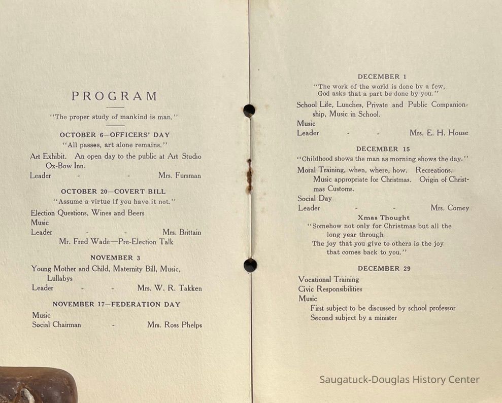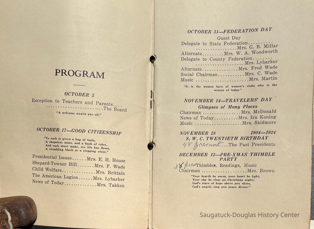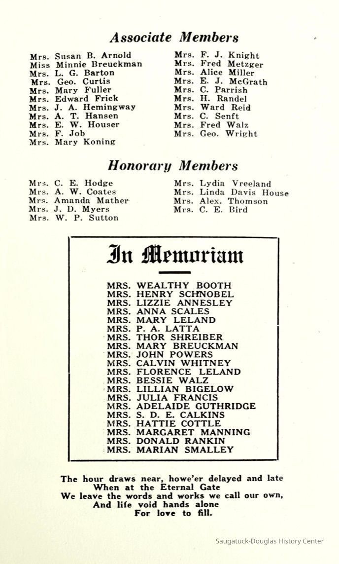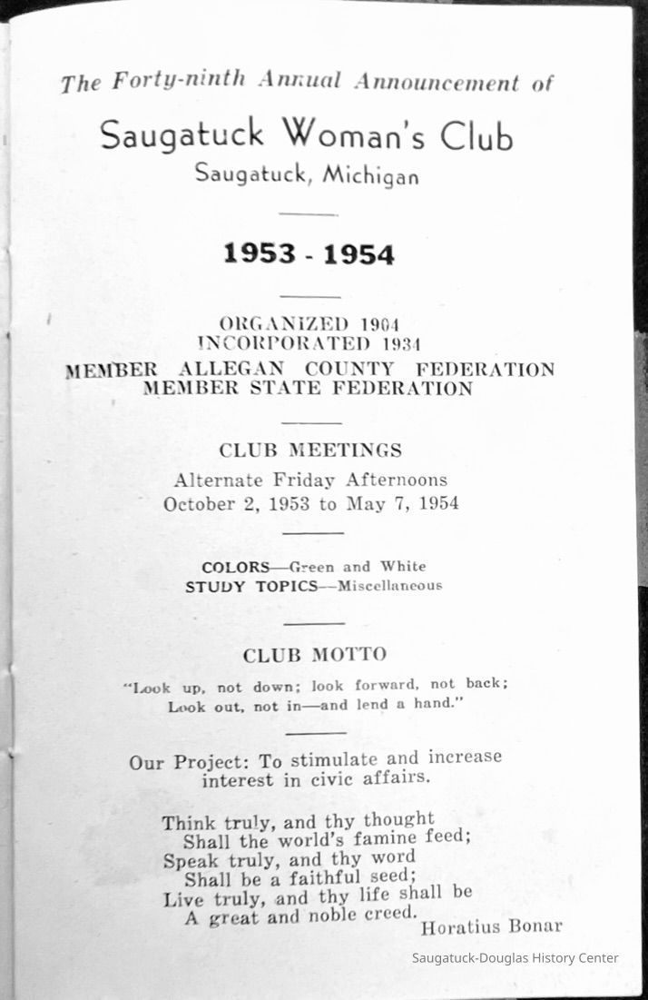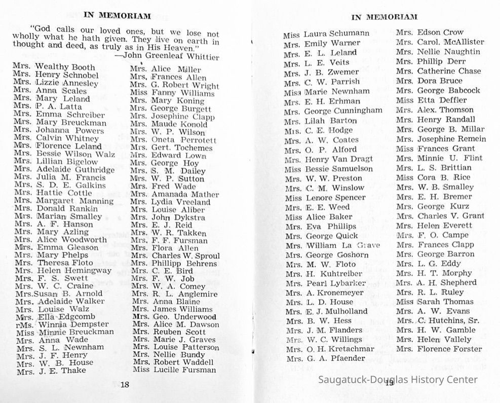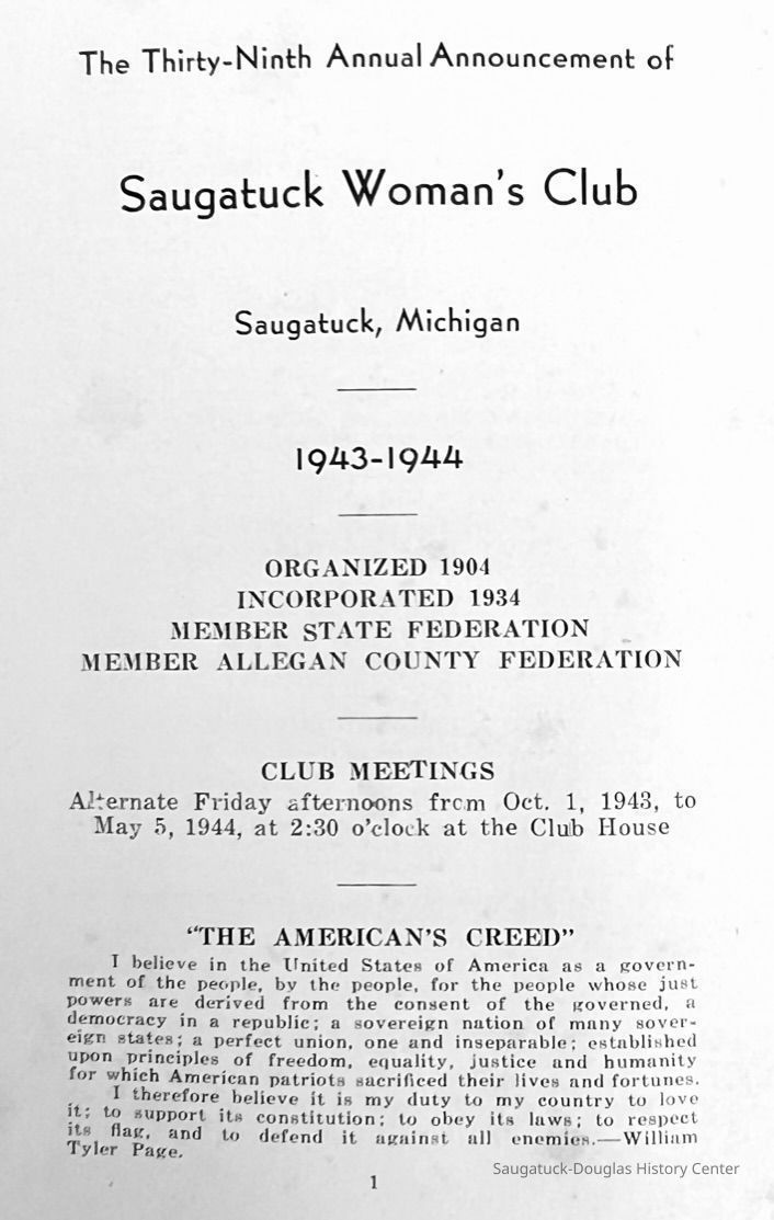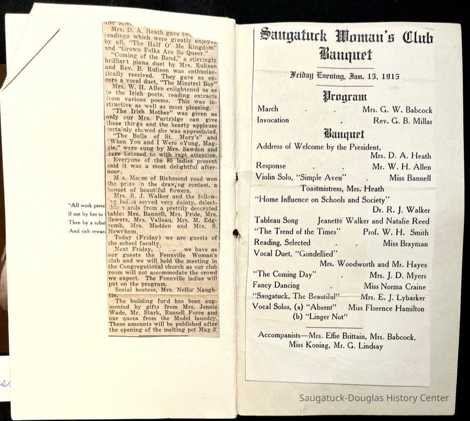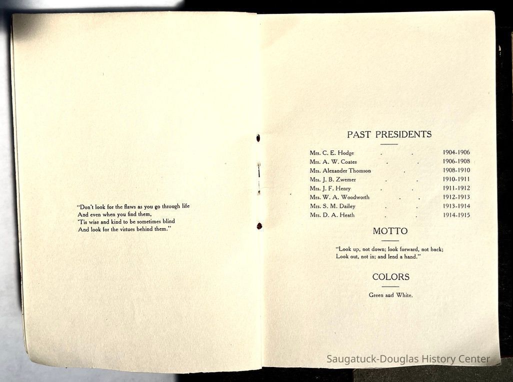 Saugatuck Woman's Club 1904-present, Saugatuck Woman's Club auditorium 1935-present, Heath, May (Francis) 1873-1961, Bird, Harriet “Hattie” Louise (Moffat) (Wright) 1855-1944, Breuckman, Minnie 1869-1934, Coates, Adella "Della" (Holmes) 1864-1950, Thomson, Jeanette Elvira (Harris) 1862-1956, Fox, Johnson 1918-2009, Hodge, Emma Ursula (Gunzenhauser) 1864-1950, Dailey, Margaret, E. (Calkins) 1866-1940, Zwemer, Saburna G. (Woodworth) 1875-1949, Henry, Isabel (Shore) 1856-1936, Woodworth, Alice C. (Redway) Mather 1848-1930, 439 Butler/Butler Pantry/Wilkins/Koning/Nies Hardware, Allen, Flora Elizabeth (Sprang) 1863-1943, Walker, Adelaide Elizabeth (Wade) 1885-1932, Goshorn, Hattie Louise (DePuy) 1874-1953, House, Celia Martin (Gamble) (1890-1976), Millar, Nellie Grant (Raymond) 1861-1956, Jackson, Rhea Bernice (Allen) 1892-1979, Leland, Ruth F. (Baker) 1878-1949, Comey, Alice Maude (Grant) 1870-1944, Davis, Edna Mae (Gaylord) 1896-1980, Wilson, Grace (Cobb) 1897-1992, Sheridan, Irene (Weible) 1883-1967, Waddell, Sadie R. 1882-1947, Wicks, Caroline Jane "Carrie" (Millar) Stillson 1884-1983, Hoffman, Elizabeth S. "Betty" (Gregory) 1894-1960, Brady, Winifred E. (Randall) 1893-1961, Peirce, Roberta "Bobbie" Margaret (Fredrickson) 1914-2004, Carr, Elsie Virginia (Kaufman) 1906-1997, Bieler or Beler, Mrs. Ernest 1904-1954?, Bainbridge, Marguerite (Holladay) 1888-1974, Edgcomb, Ruth M. (Severance) 1915-1997, Taylor, Mrs. Harold