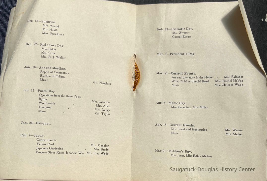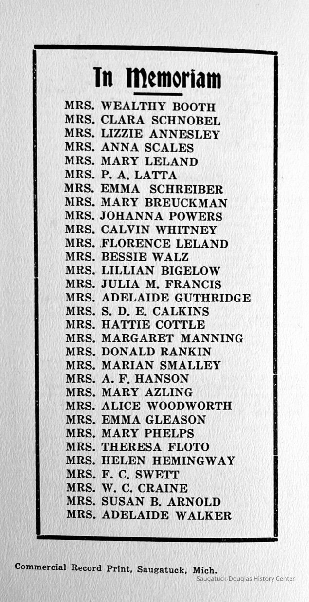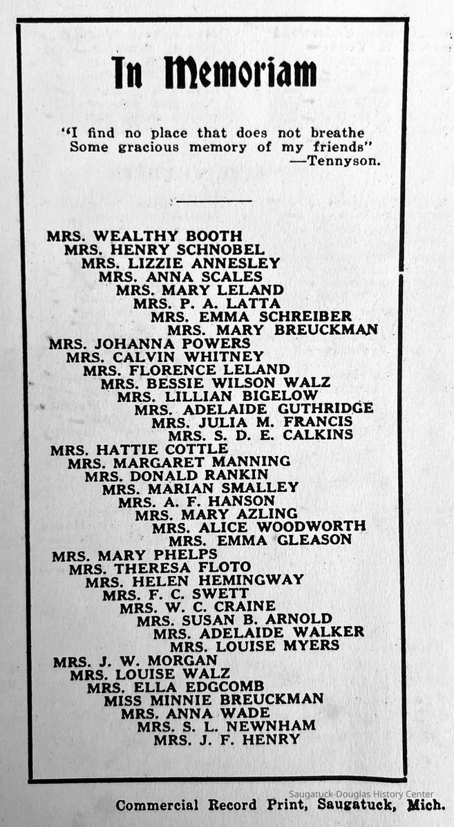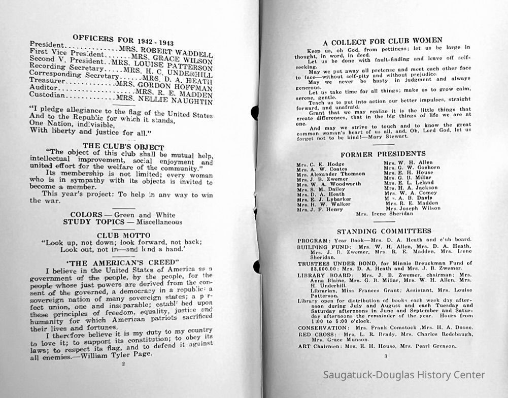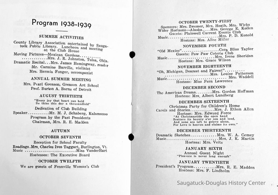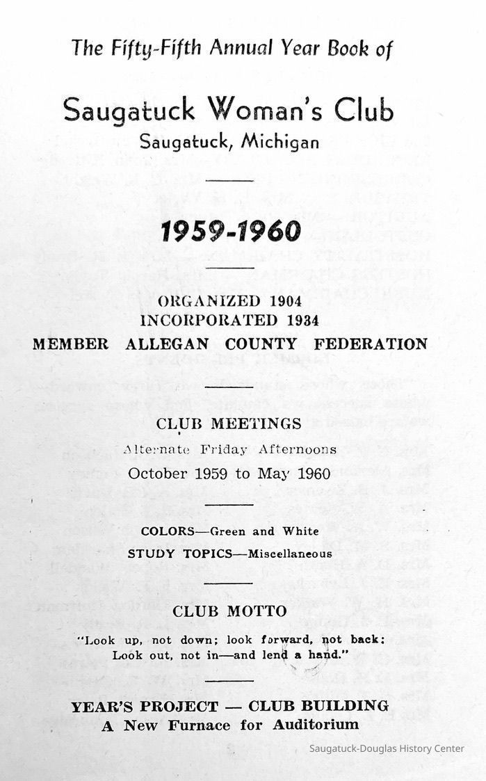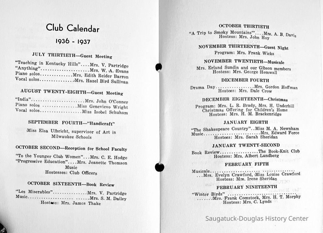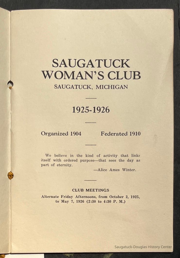 Saugatuck Woman's Club 1904-present, Saugatuck Woman's Club auditorium 1935-present, Heath, May (Francis) 1873-1961, Bird, Harriet “Hattie” Louise (Moffat) (Wright) 1855-1944, Breuckman, Minnie 1869-1934, Coates, Adella "Della" (Holmes) 1864-1950, Thomson, Jeanette Elvira (Harris) 1862-1956, Fox, Johnson 1918-2009, Hodge, Emma Ursula (Gunzenhauser) 1864-1950, Dailey, Margaret, E. (Calkins) 1866-1940, Zwemer, Saburna G. (Woodworth) 1875-1949, Henry, Isabel (Shore) 1856-1936, Woodworth, Alice C. (Redway) Mather 1848-1930, 439 Butler/Butler Pantry/Wilkins/Koning/Nies Hardware, Allen, Flora Elizabeth (Sprang) 1863-1943, Walker, Adelaide Elizabeth (Wade) 1885-1932, Goshorn, Hattie Louise (DePuy) 1874-1953, House, Celia Martin (Gamble) (1890-1976), Millar, Nellie Grant (Raymond) 1861-1956, Jackson, Rhea Bernice (Allen) 1892-1979, Leland, Ruth F. (Baker) 1878-1949, Comey, Alice Maude (Grant) 1870-1944, Davis, Edna Mae (Gaylord) 1896-1980, Wilson, Grace (Cobb) 1897-1992, Sheridan, Irene (Weible) 1883-1967, Waddell, Sadie R. 1882-1947, Wicks, Caroline Jane "Carrie" (Millar) Stillson 1884-1983, Hoffman, Elizabeth S. "Betty" (Gregory) 1894-1960, Brady, Winifred E. (Randall) 1893-1961, Peirce, Roberta "Bobbie" Margaret (Fredrickson) 1914-2004, Carr, Elsie Virginia (Kaufman) 1906-1997, Bieler or Beler, Mrs. Ernest 1904-1954?, Bainbridge, Marguerite (Holladay) 1888-1974, Edgcomb, Ruth M. (Severance) 1915-1997, Taylor, Mrs. Harold