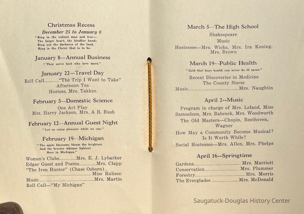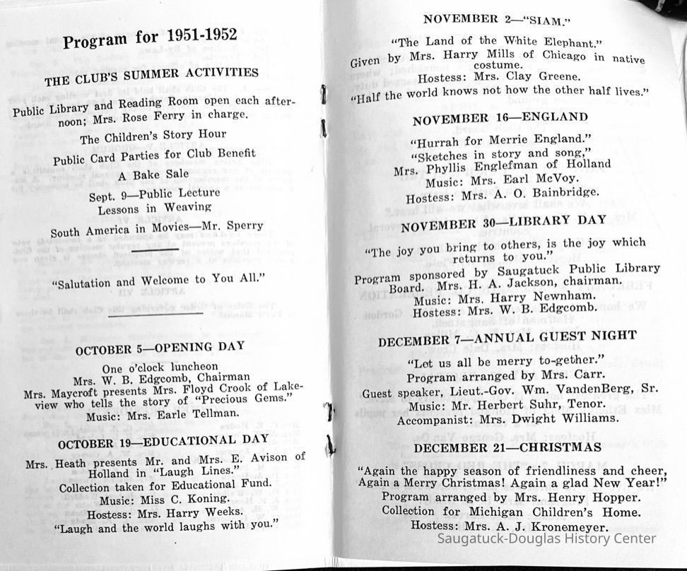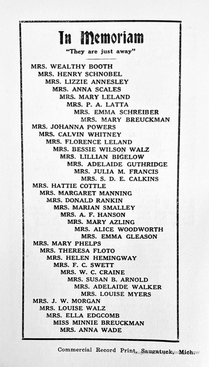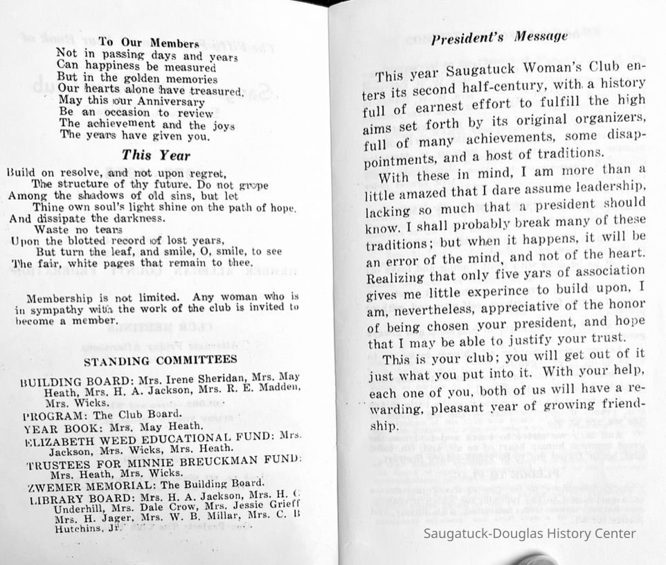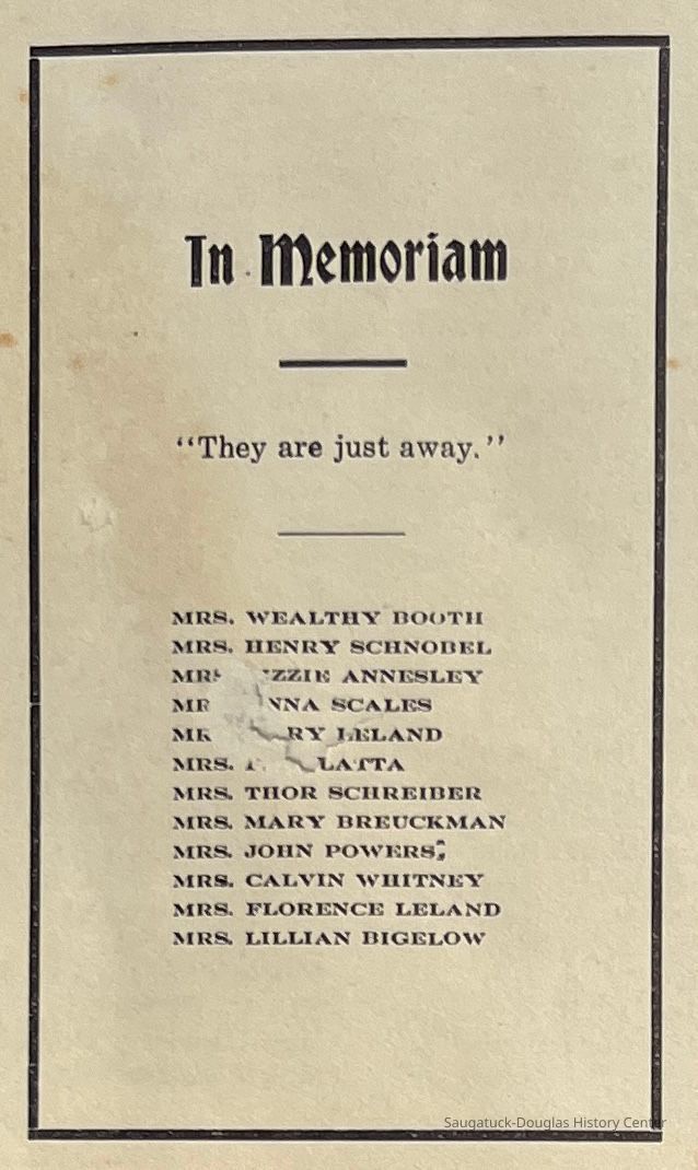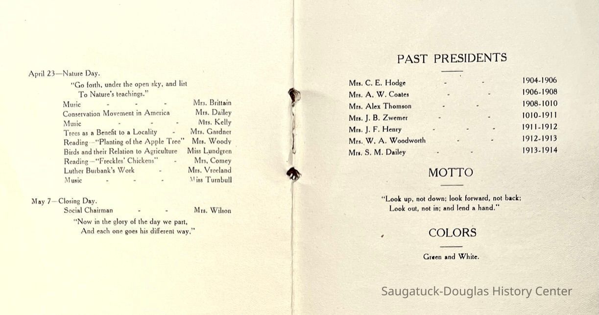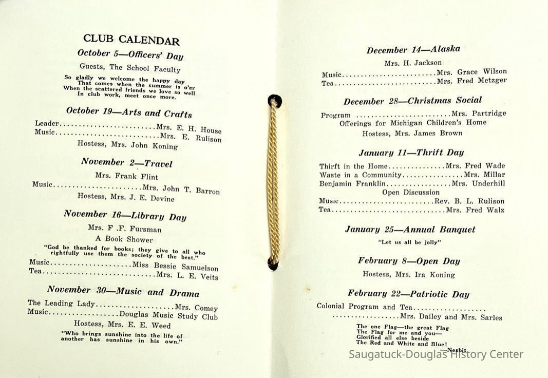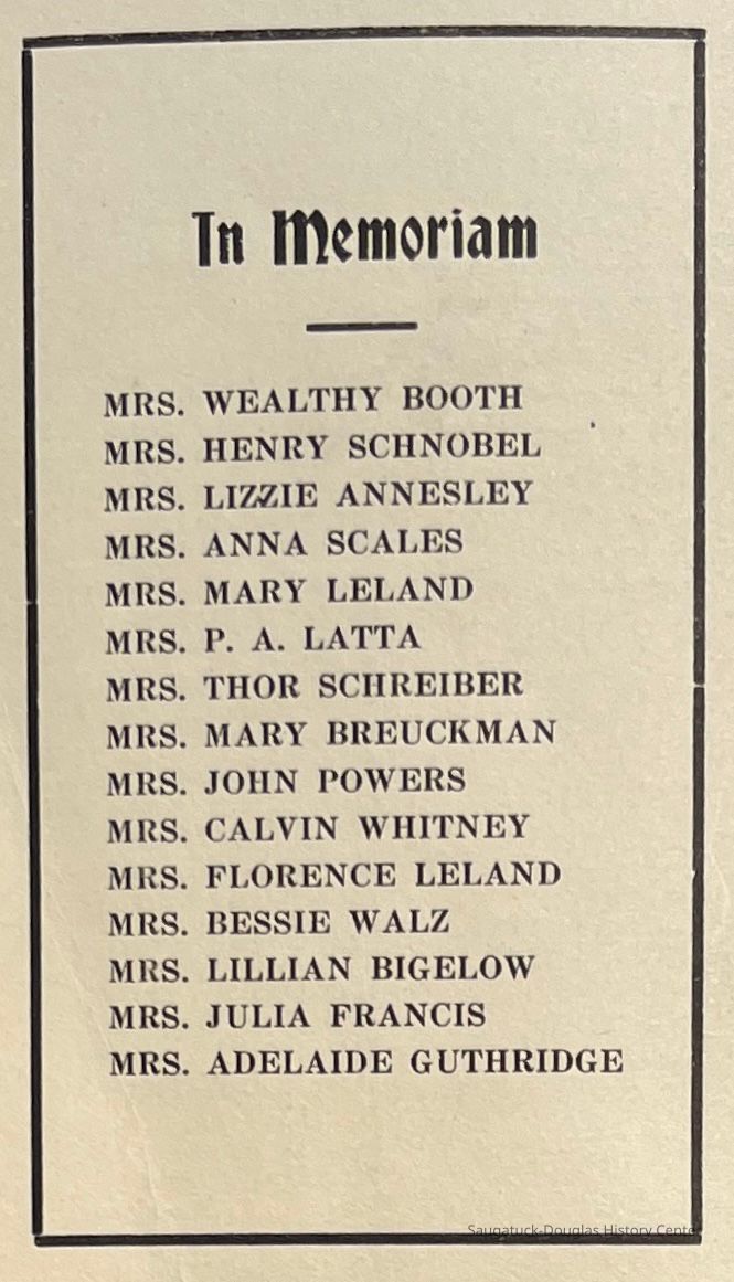 Saugatuck Woman's Club 1904-present, Saugatuck Woman's Club auditorium 1935-present, Heath, May (Francis) 1873-1961, Bird, Harriet “Hattie” Louise (Moffat) (Wright) 1855-1944, Breuckman, Minnie 1869-1934, Coates, Adella "Della" (Holmes) 1864-1950, Thomson, Jeanette Elvira (Harris) 1862-1956, Fox, Johnson 1918-2009, Hodge, Emma Ursula (Gunzenhauser) 1864-1950, Dailey, Margaret, E. (Calkins) 1866-1940, Zwemer, Saburna G. (Woodworth) 1875-1949, Henry, Isabel (Shore) 1856-1936, Woodworth, Alice C. (Redway) Mather 1848-1930, 439 Butler/Butler Pantry/Wilkins/Koning/Nies Hardware, Allen, Flora Elizabeth (Sprang) 1863-1943, Walker, Adelaide Elizabeth (Wade) 1885-1932, Goshorn, Hattie Louise (DePuy) 1874-1953, House, Celia Martin (Gamble) (1890-1976), Millar, Nellie Grant (Raymond) 1861-1956, Jackson, Rhea Bernice (Allen) 1892-1979, Leland, Ruth F. (Baker) 1878-1949, Comey, Alice Maude (Grant) 1870-1944, Davis, Edna Mae (Gaylord) 1896-1980, Wilson, Grace (Cobb) 1897-1992, Sheridan, Irene (Weible) 1883-1967, Waddell, Sadie R. 1882-1947, Wicks, Caroline Jane "Carrie" (Millar) Stillson 1884-1983, Hoffman, Elizabeth S. "Betty" (Gregory) 1894-1960, Brady, Winifred E. (Randall) 1893-1961, Peirce, Roberta "Bobbie" Margaret (Fredrickson) 1914-2004, Carr, Elsie Virginia (Kaufman) 1906-1997, Bieler or Beler, Mrs. Ernest 1904-1954?, Bainbridge, Marguerite (Holladay) 1888-1974, Edgcomb, Ruth M. (Severance) 1915-1997, Taylor, Mrs. Harold