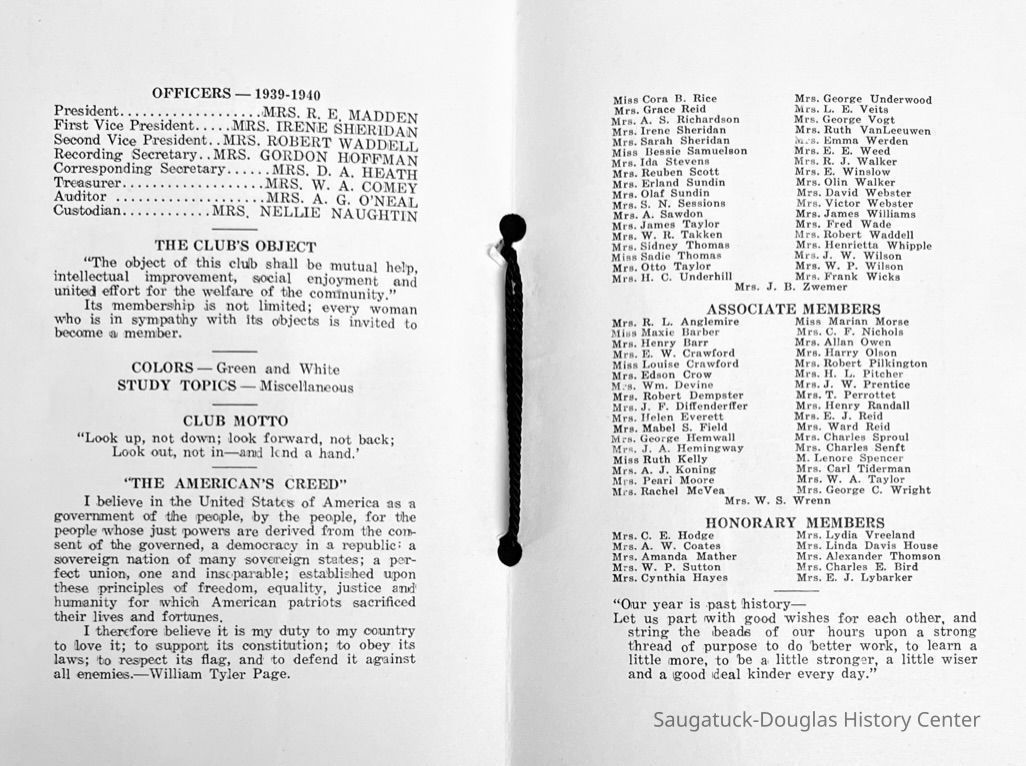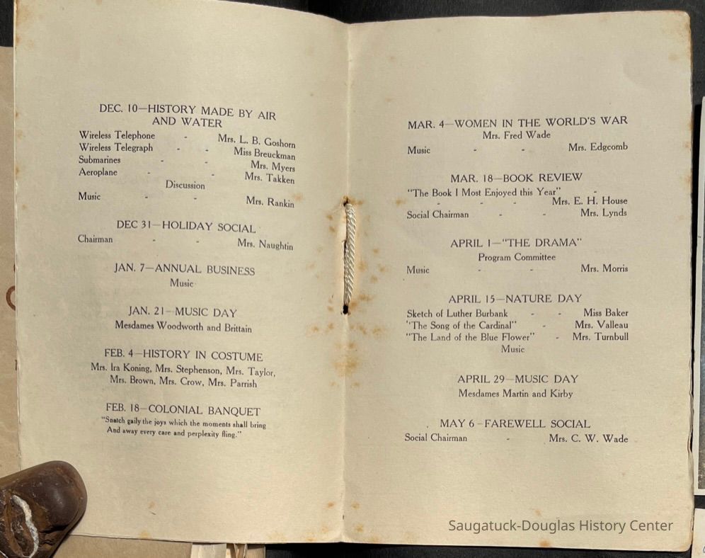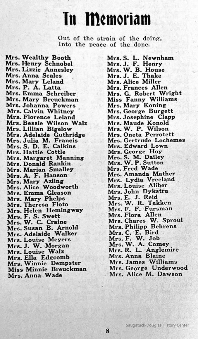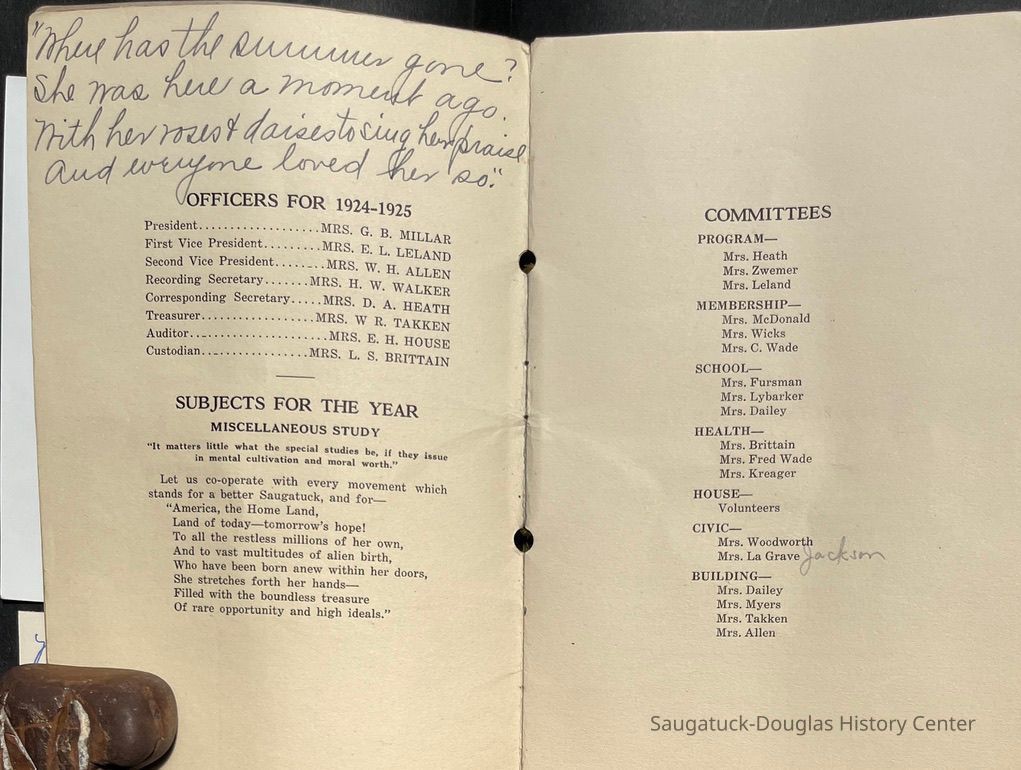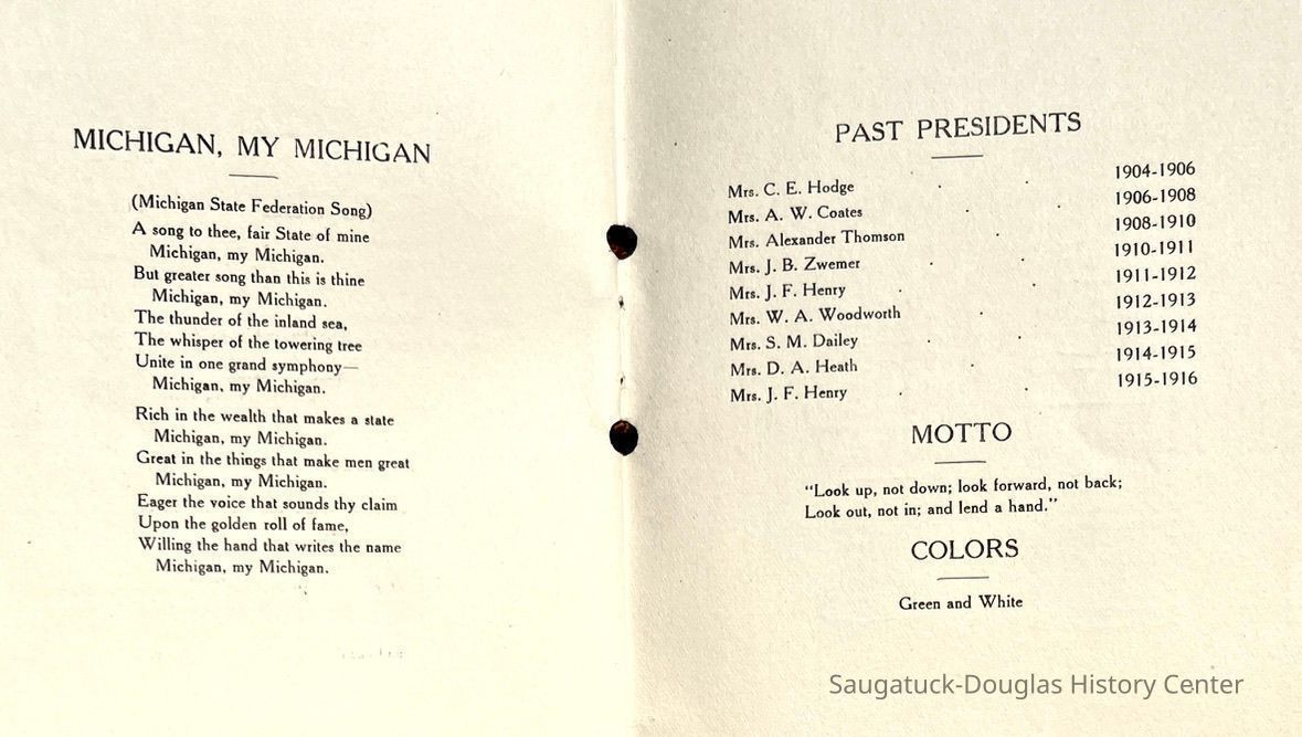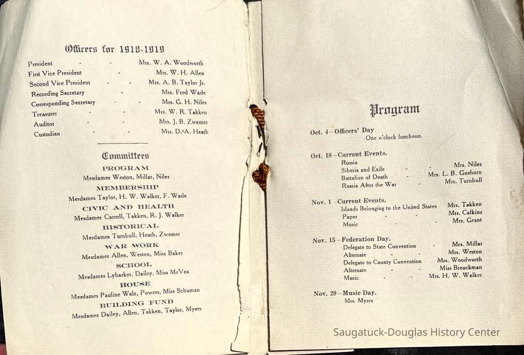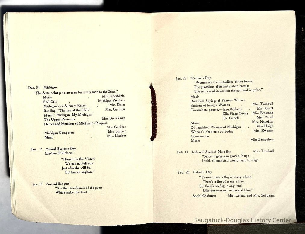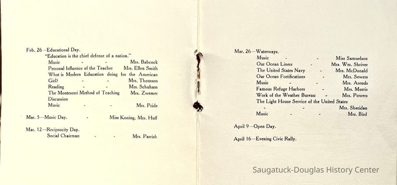 Saugatuck Woman's Club 1904-present, Saugatuck Woman's Club auditorium 1935-present, Heath, May (Francis) 1873-1961, Bird, Harriet “Hattie” Louise (Moffat) (Wright) 1855-1944, Breuckman, Minnie 1869-1934, Coates, Adella "Della" (Holmes) 1864-1950, Thomson, Jeanette Elvira (Harris) 1862-1956, Fox, Johnson 1918-2009, Hodge, Emma Ursula (Gunzenhauser) 1864-1950, Dailey, Margaret, E. (Calkins) 1866-1940, Zwemer, Saburna G. (Woodworth) 1875-1949, Henry, Isabel (Shore) 1856-1936, Woodworth, Alice C. (Redway) Mather 1848-1930, 439 Butler/Butler Pantry/Wilkins/Koning/Nies Hardware, Allen, Flora Elizabeth (Sprang) 1863-1943, Walker, Adelaide Elizabeth (Wade) 1885-1932, Goshorn, Hattie Louise (DePuy) 1874-1953, House, Celia Martin (Gamble) (1890-1976), Millar, Nellie Grant (Raymond) 1861-1956, Jackson, Rhea Bernice (Allen) 1892-1979, Leland, Ruth F. (Baker) 1878-1949, Comey, Alice Maude (Grant) 1870-1944, Davis, Edna Mae (Gaylord) 1896-1980, Wilson, Grace (Cobb) 1897-1992, Sheridan, Irene (Weible) 1883-1967, Waddell, Sadie R. 1882-1947, Wicks, Caroline Jane "Carrie" (Millar) Stillson 1884-1983, Hoffman, Elizabeth S. "Betty" (Gregory) 1894-1960, Brady, Winifred E. (Randall) 1893-1961, Peirce, Roberta "Bobbie" Margaret (Fredrickson) 1914-2004, Carr, Elsie Virginia (Kaufman) 1906-1997, Bieler or Beler, Mrs. Ernest 1904-1954?, Bainbridge, Marguerite (Holladay) 1888-1974, Edgcomb, Ruth M. (Severance) 1915-1997, Taylor, Mrs. Harold