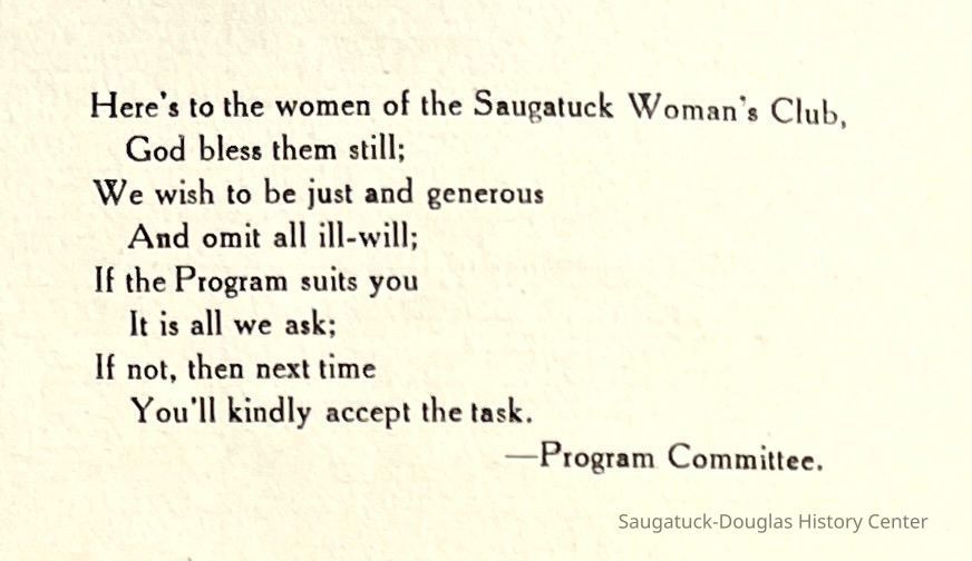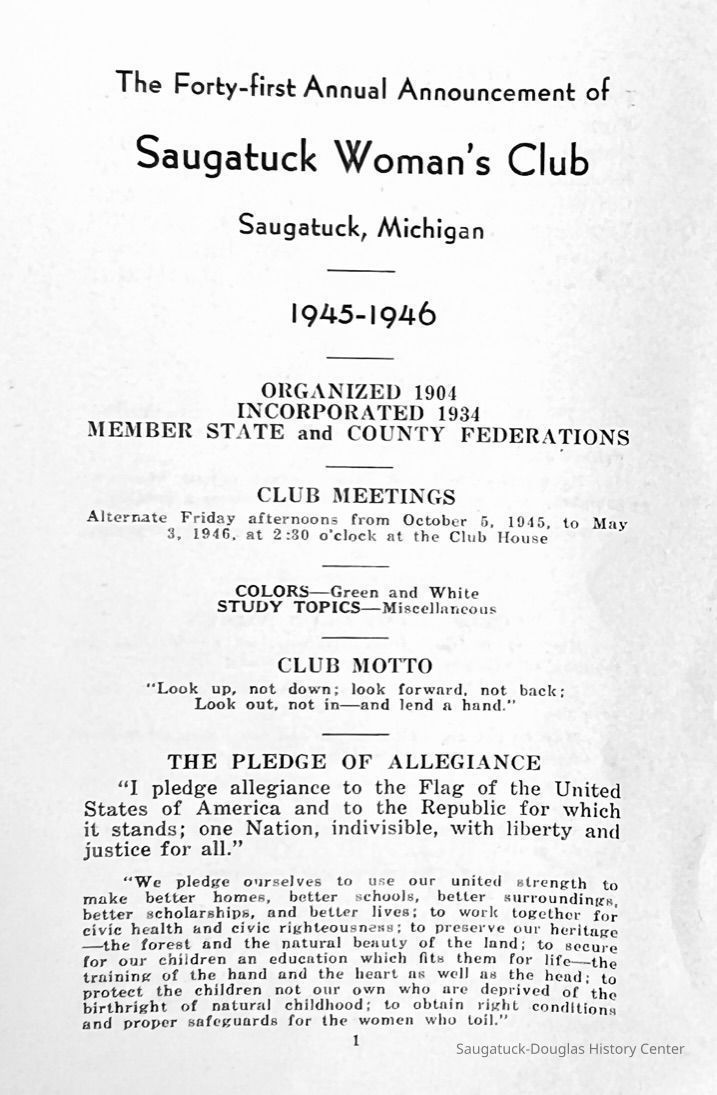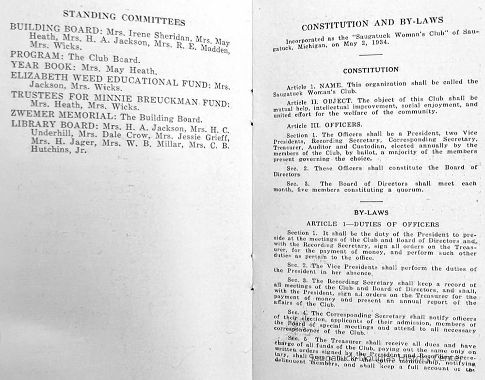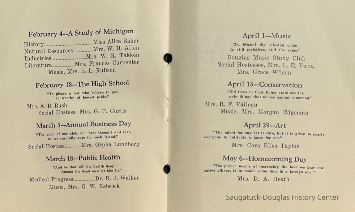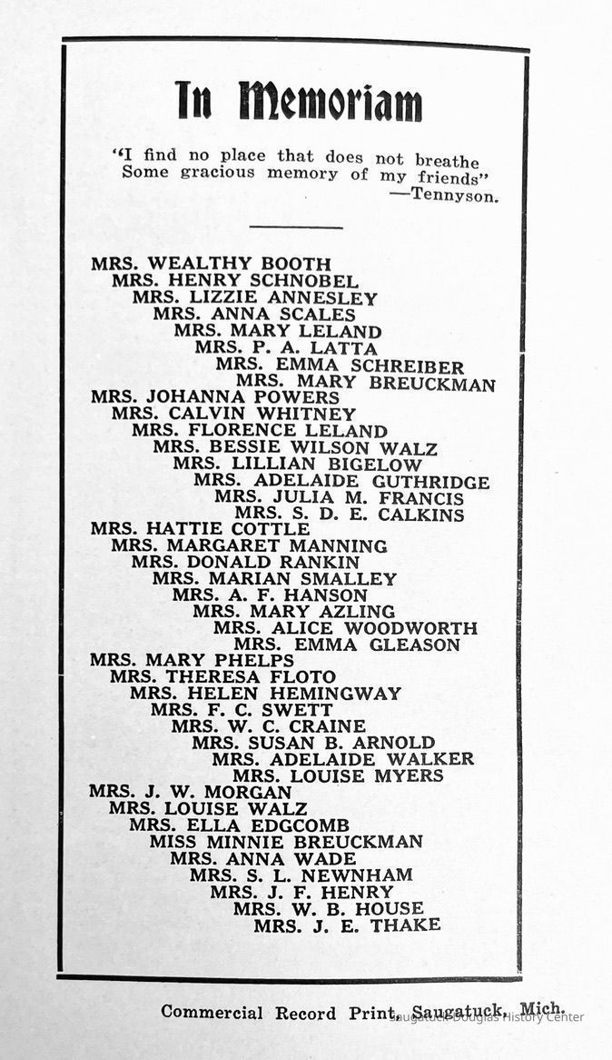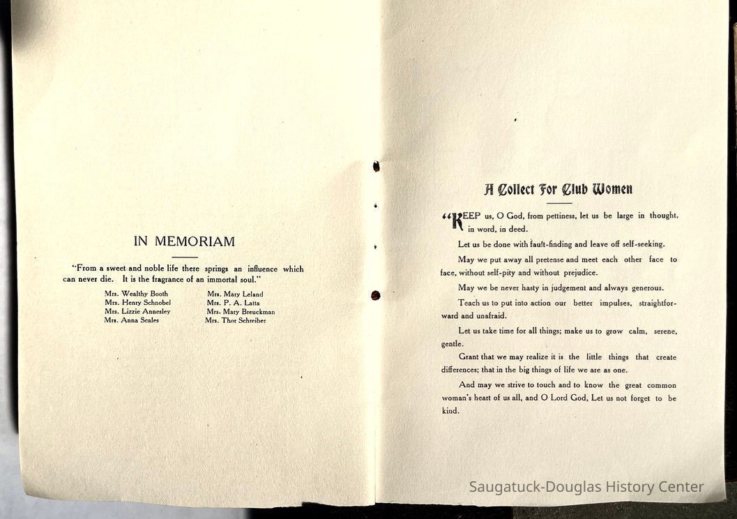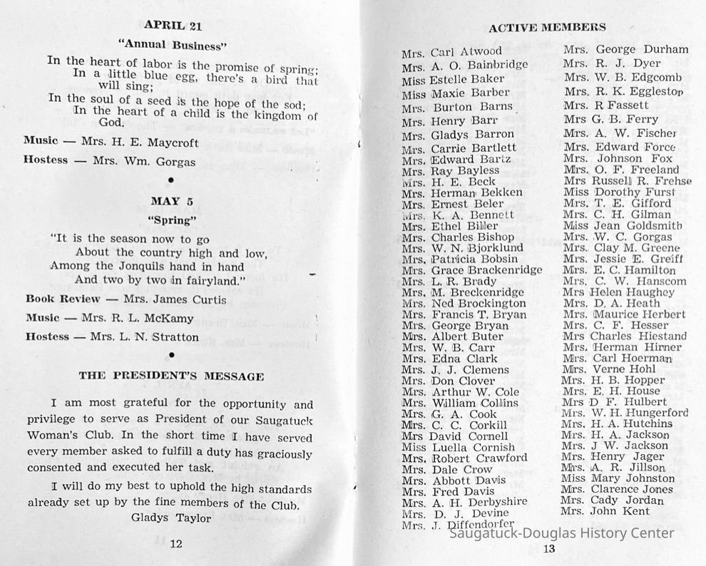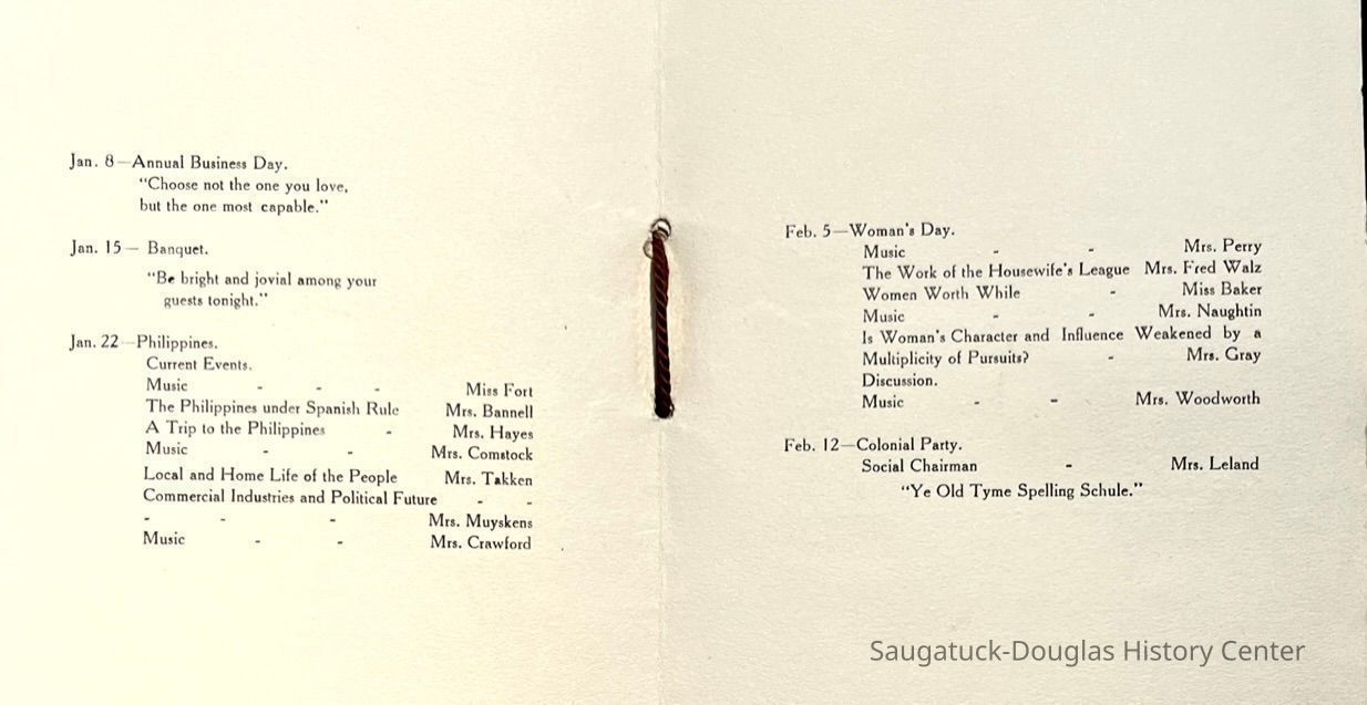 Saugatuck Woman's Club 1904-present, Saugatuck Woman's Club auditorium 1935-present, Heath, May (Francis) 1873-1961, Bird, Harriet “Hattie” Louise (Moffat) (Wright) 1855-1944, Breuckman, Minnie 1869-1934, Coates, Adella "Della" (Holmes) 1864-1950, Thomson, Jeanette Elvira (Harris) 1862-1956, Fox, Johnson 1918-2009, Hodge, Emma Ursula (Gunzenhauser) 1864-1950, Dailey, Margaret, E. (Calkins) 1866-1940, Zwemer, Saburna G. (Woodworth) 1875-1949, Henry, Isabel (Shore) 1856-1936, Woodworth, Alice C. (Redway) Mather 1848-1930, 439 Butler/Butler Pantry/Wilkins/Koning/Nies Hardware, Allen, Flora Elizabeth (Sprang) 1863-1943, Walker, Adelaide Elizabeth (Wade) 1885-1932, Goshorn, Hattie Louise (DePuy) 1874-1953, House, Celia Martin (Gamble) (1890-1976), Millar, Nellie Grant (Raymond) 1861-1956, Jackson, Rhea Bernice (Allen) 1892-1979, Leland, Ruth F. (Baker) 1878-1949, Comey, Alice Maude (Grant) 1870-1944, Davis, Edna Mae (Gaylord) 1896-1980, Wilson, Grace (Cobb) 1897-1992, Sheridan, Irene (Weible) 1883-1967, Waddell, Sadie R. 1882-1947, Wicks, Caroline Jane "Carrie" (Millar) Stillson 1884-1983, Hoffman, Elizabeth S. "Betty" (Gregory) 1894-1960, Brady, Winifred E. (Randall) 1893-1961, Peirce, Roberta "Bobbie" Margaret (Fredrickson) 1914-2004, Carr, Elsie Virginia (Kaufman) 1906-1997, Bieler or Beler, Mrs. Ernest 1904-1954?, Bainbridge, Marguerite (Holladay) 1888-1974, Edgcomb, Ruth M. (Severance) 1915-1997, Taylor, Mrs. Harold