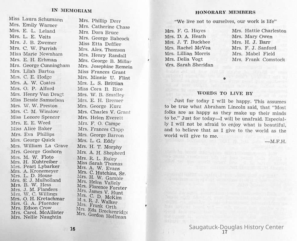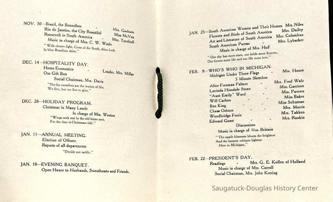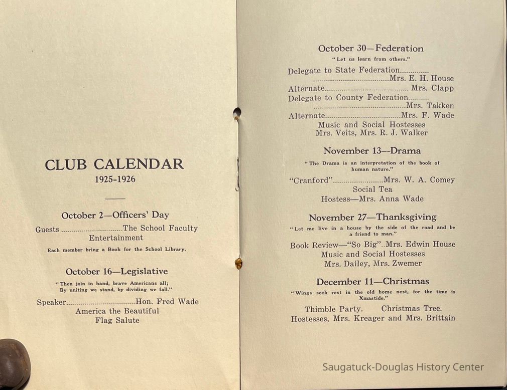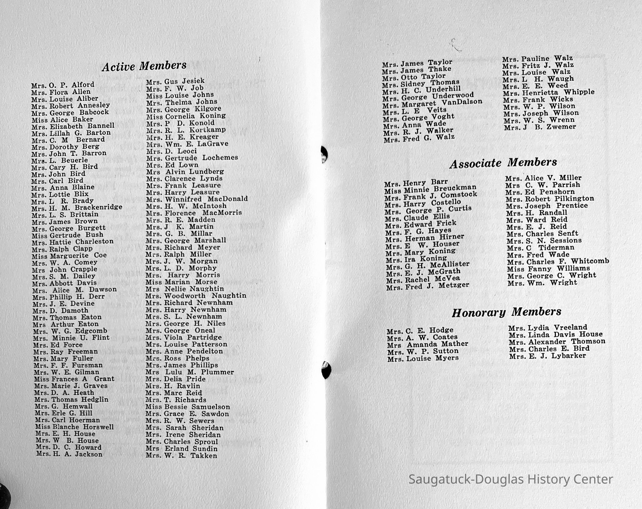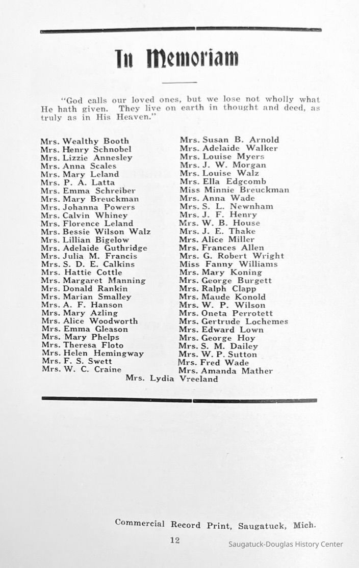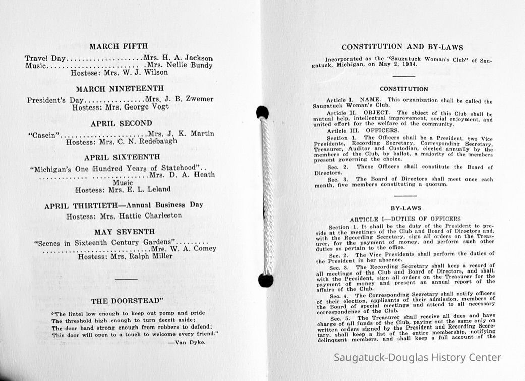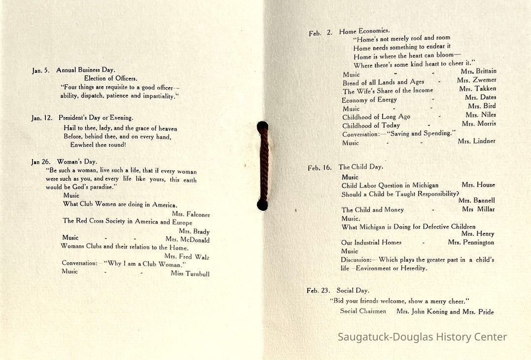 Saugatuck Woman's Club 1904-present, Saugatuck Woman's Club auditorium 1935-present, Heath, May (Francis) 1873-1961, Bird, Harriet “Hattie” Louise (Moffat) (Wright) 1855-1944, Breuckman, Minnie 1869-1934, Coates, Adella "Della" (Holmes) 1864-1950, Thomson, Jeanette Elvira (Harris) 1862-1956, Fox, Johnson 1918-2009, Hodge, Emma Ursula (Gunzenhauser) 1864-1950, Dailey, Margaret, E. (Calkins) 1866-1940, Zwemer, Saburna G. (Woodworth) 1875-1949, Henry, Isabel (Shore) 1856-1936, Woodworth, Alice C. (Redway) Mather 1848-1930, 439 Butler/Butler Pantry/Wilkins/Koning/Nies Hardware, Allen, Flora Elizabeth (Sprang) 1863-1943, Walker, Adelaide Elizabeth (Wade) 1885-1932, Goshorn, Hattie Louise (DePuy) 1874-1953, House, Celia Martin (Gamble) (1890-1976), Millar, Nellie Grant (Raymond) 1861-1956, Jackson, Rhea Bernice (Allen) 1892-1979, Leland, Ruth F. (Baker) 1878-1949, Comey, Alice Maude (Grant) 1870-1944, Davis, Edna Mae (Gaylord) 1896-1980, Wilson, Grace (Cobb) 1897-1992, Sheridan, Irene (Weible) 1883-1967, Waddell, Sadie R. 1882-1947, Wicks, Caroline Jane "Carrie" (Millar) Stillson 1884-1983, Hoffman, Elizabeth S. "Betty" (Gregory) 1894-1960, Brady, Winifred E. (Randall) 1893-1961, Peirce, Roberta "Bobbie" Margaret (Fredrickson) 1914-2004, Carr, Elsie Virginia (Kaufman) 1906-1997, Bieler or Beler, Mrs. Ernest 1904-1954?, Bainbridge, Marguerite (Holladay) 1888-1974, Edgcomb, Ruth M. (Severance) 1915-1997, Taylor, Mrs. Harold