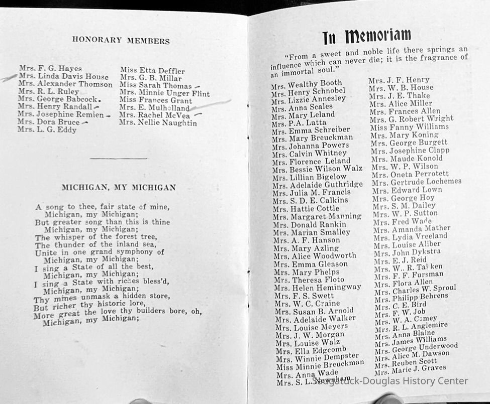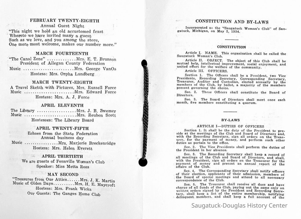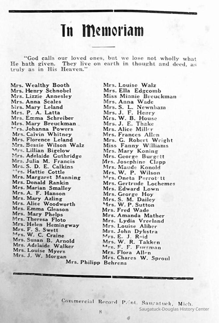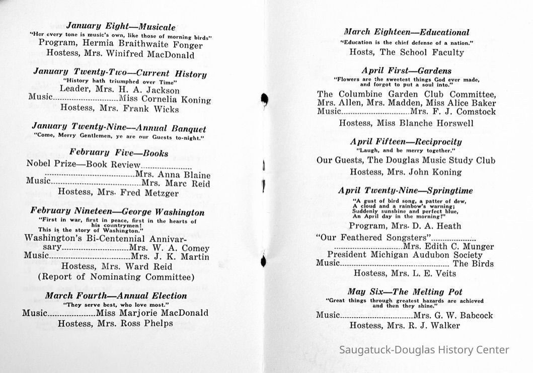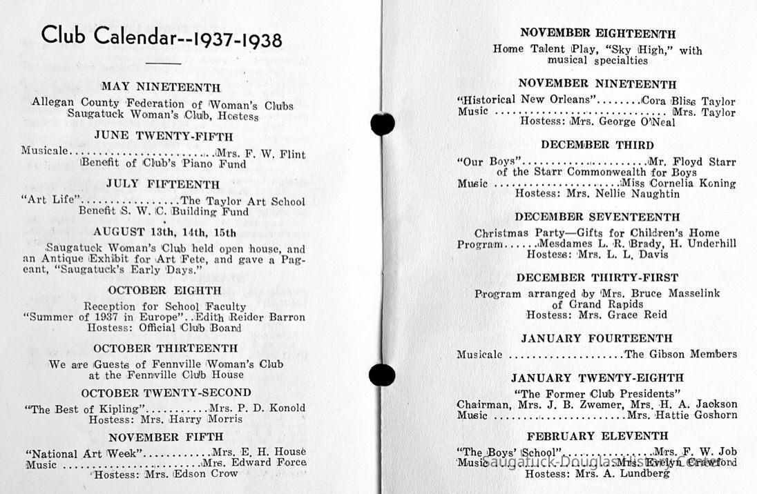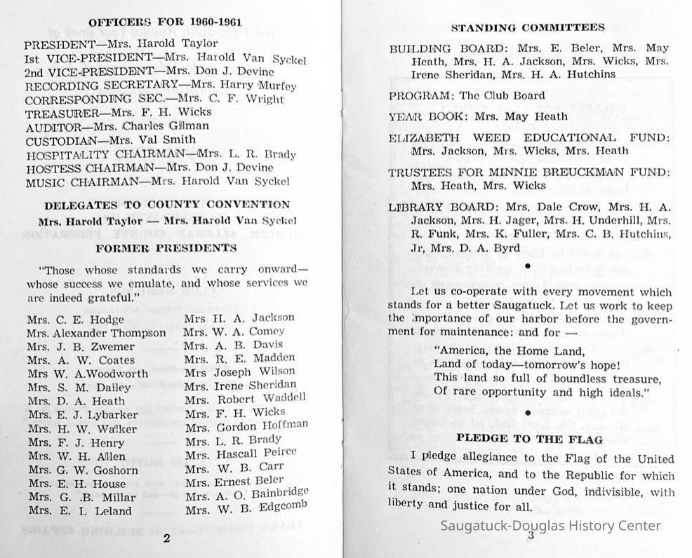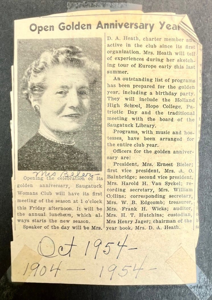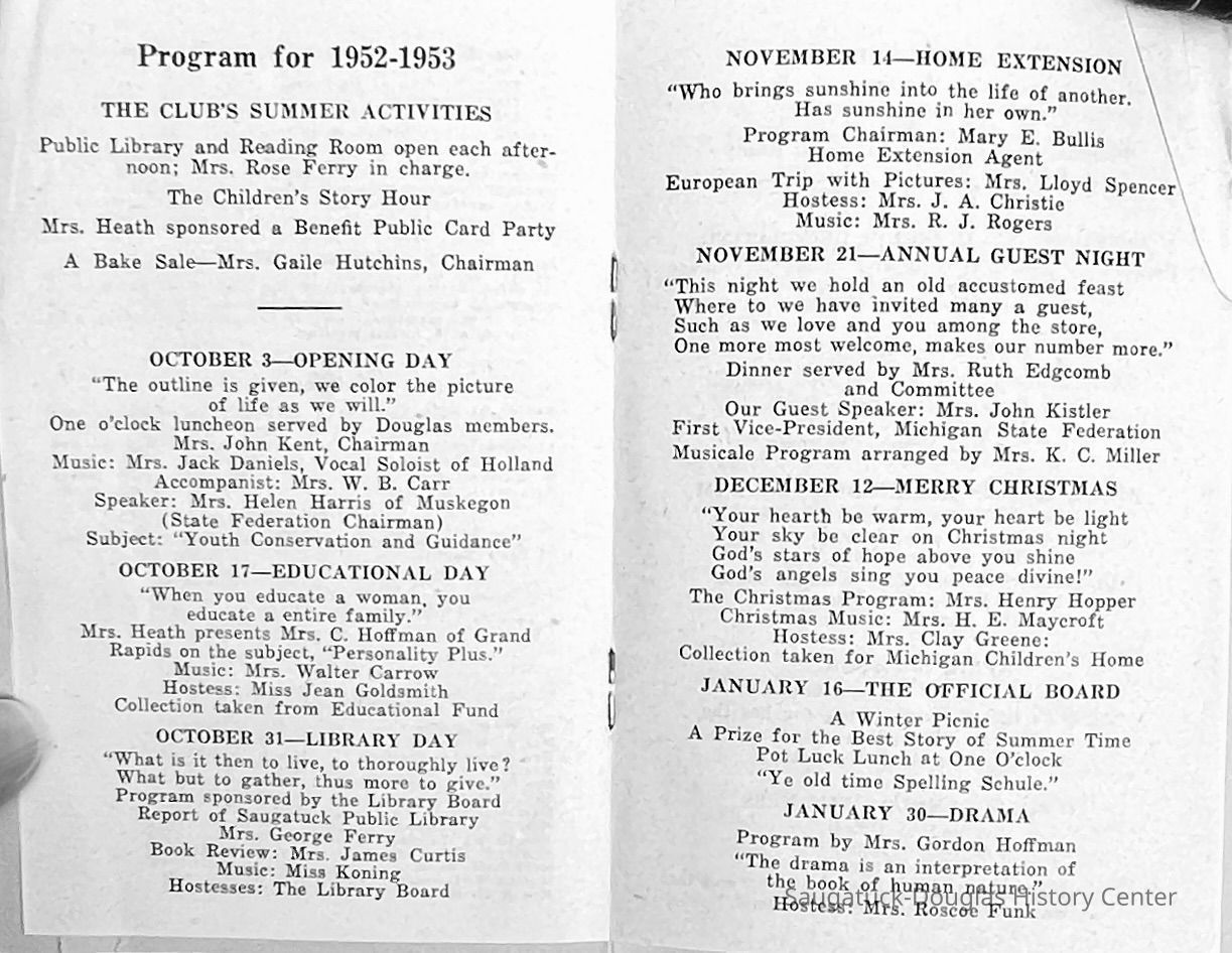 Saugatuck Woman's Club 1904-present, Saugatuck Woman's Club auditorium 1935-present, Heath, May (Francis) 1873-1961, Bird, Harriet “Hattie” Louise (Moffat) (Wright) 1855-1944, Breuckman, Minnie 1869-1934, Coates, Adella "Della" (Holmes) 1864-1950, Thomson, Jeanette Elvira (Harris) 1862-1956, Fox, Johnson 1918-2009, Hodge, Emma Ursula (Gunzenhauser) 1864-1950, Dailey, Margaret, E. (Calkins) 1866-1940, Zwemer, Saburna G. (Woodworth) 1875-1949, Henry, Isabel (Shore) 1856-1936, Woodworth, Alice C. (Redway) Mather 1848-1930, 439 Butler/Butler Pantry/Wilkins/Koning/Nies Hardware, Allen, Flora Elizabeth (Sprang) 1863-1943, Walker, Adelaide Elizabeth (Wade) 1885-1932, Goshorn, Hattie Louise (DePuy) 1874-1953, House, Celia Martin (Gamble) (1890-1976), Millar, Nellie Grant (Raymond) 1861-1956, Jackson, Rhea Bernice (Allen) 1892-1979, Leland, Ruth F. (Baker) 1878-1949, Comey, Alice Maude (Grant) 1870-1944, Davis, Edna Mae (Gaylord) 1896-1980, Wilson, Grace (Cobb) 1897-1992, Sheridan, Irene (Weible) 1883-1967, Waddell, Sadie R. 1882-1947, Wicks, Caroline Jane "Carrie" (Millar) Stillson 1884-1983, Hoffman, Elizabeth S. "Betty" (Gregory) 1894-1960, Brady, Winifred E. (Randall) 1893-1961, Peirce, Roberta "Bobbie" Margaret (Fredrickson) 1914-2004, Carr, Elsie Virginia (Kaufman) 1906-1997, Bieler or Beler, Mrs. Ernest 1904-1954?, Bainbridge, Marguerite (Holladay) 1888-1974, Edgcomb, Ruth M. (Severance) 1915-1997, Taylor, Mrs. Harold