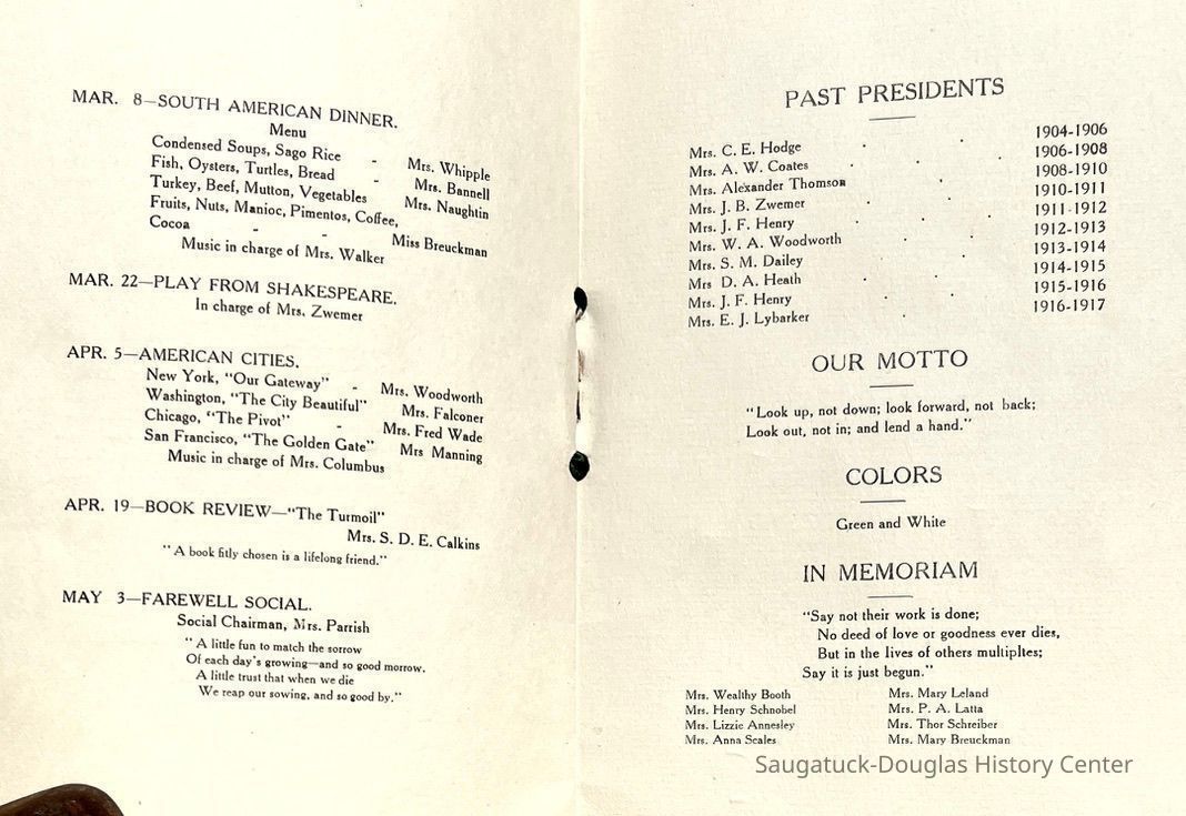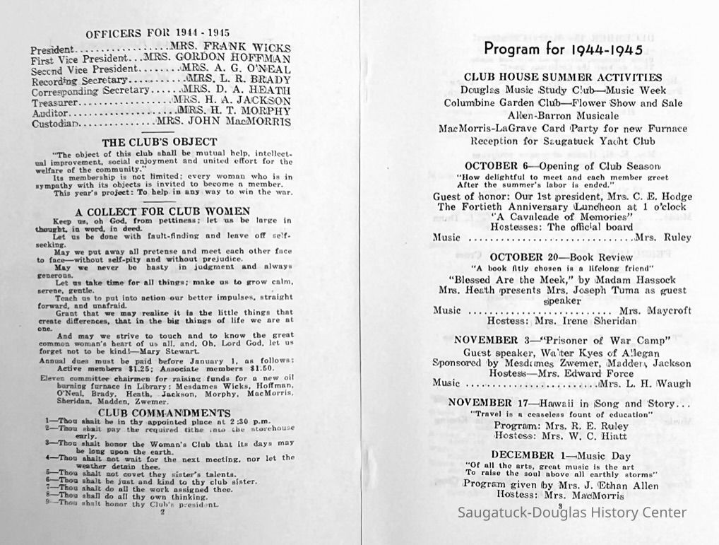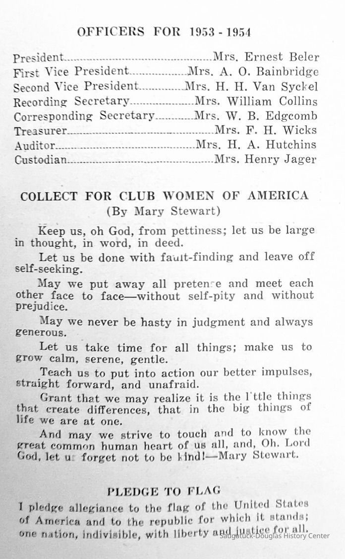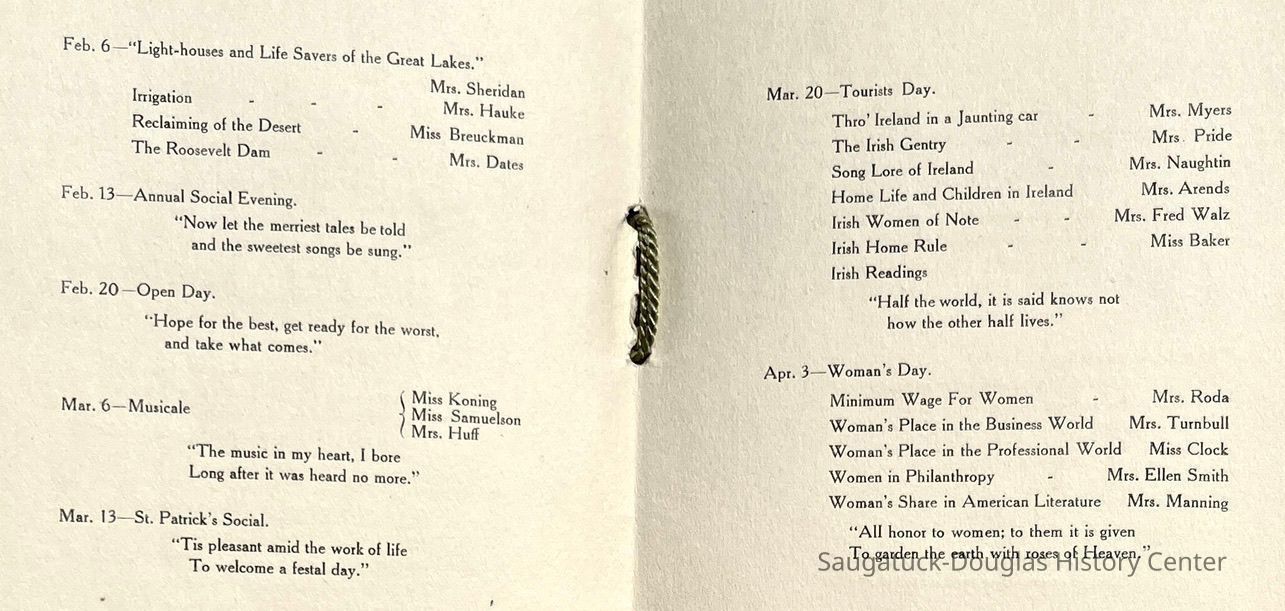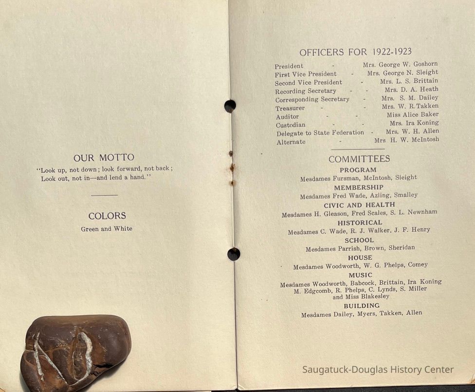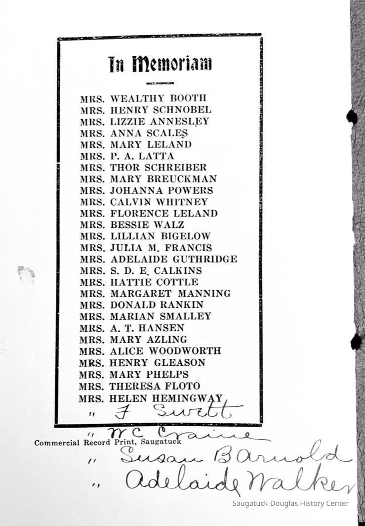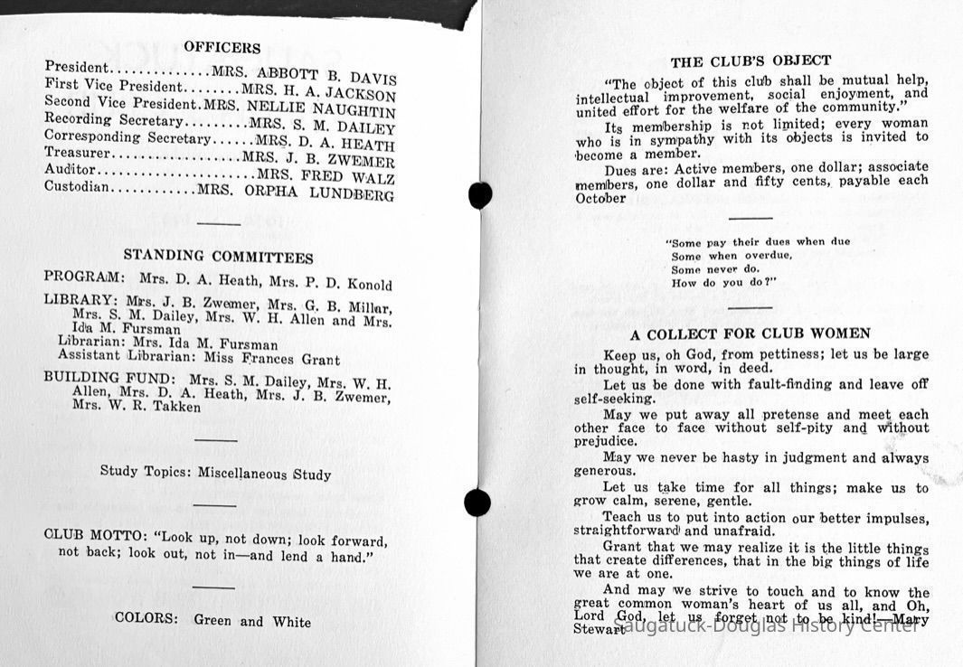 Saugatuck Woman's Club 1904-present, Saugatuck Woman's Club auditorium 1935-present, Heath, May (Francis) 1873-1961, Bird, Harriet “Hattie” Louise (Moffat) (Wright) 1855-1944, Breuckman, Minnie 1869-1934, Coates, Adella "Della" (Holmes) 1864-1950, Thomson, Jeanette Elvira (Harris) 1862-1956, Fox, Johnson 1918-2009, Hodge, Emma Ursula (Gunzenhauser) 1864-1950, Dailey, Margaret, E. (Calkins) 1866-1940, Zwemer, Saburna G. (Woodworth) 1875-1949, Henry, Isabel (Shore) 1856-1936, Woodworth, Alice C. (Redway) Mather 1848-1930, 439 Butler/Butler Pantry/Wilkins/Koning/Nies Hardware, Allen, Flora Elizabeth (Sprang) 1863-1943, Walker, Adelaide Elizabeth (Wade) 1885-1932, Goshorn, Hattie Louise (DePuy) 1874-1953, House, Celia Martin (Gamble) (1890-1976), Millar, Nellie Grant (Raymond) 1861-1956, Jackson, Rhea Bernice (Allen) 1892-1979, Leland, Ruth F. (Baker) 1878-1949, Comey, Alice Maude (Grant) 1870-1944, Davis, Edna Mae (Gaylord) 1896-1980, Wilson, Grace (Cobb) 1897-1992, Sheridan, Irene (Weible) 1883-1967, Waddell, Sadie R. 1882-1947, Wicks, Caroline Jane "Carrie" (Millar) Stillson 1884-1983, Hoffman, Elizabeth S. "Betty" (Gregory) 1894-1960, Brady, Winifred E. (Randall) 1893-1961, Peirce, Roberta "Bobbie" Margaret (Fredrickson) 1914-2004, Carr, Elsie Virginia (Kaufman) 1906-1997, Bieler or Beler, Mrs. Ernest 1904-1954?, Bainbridge, Marguerite (Holladay) 1888-1974, Edgcomb, Ruth M. (Severance) 1915-1997, Taylor, Mrs. Harold