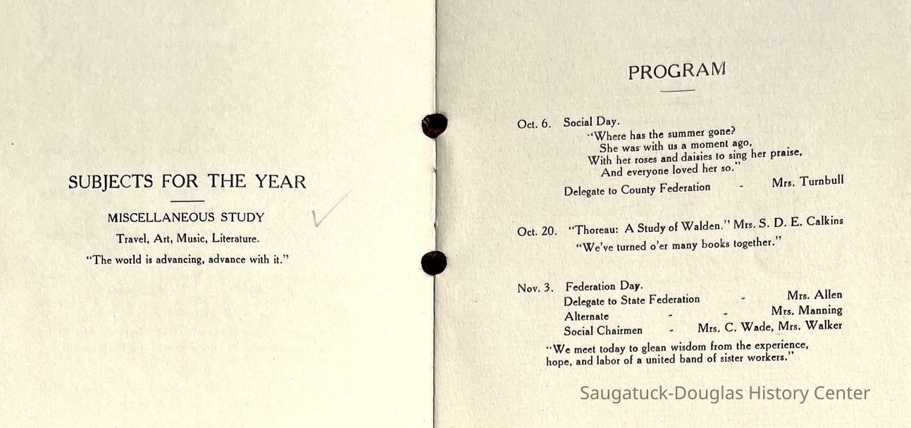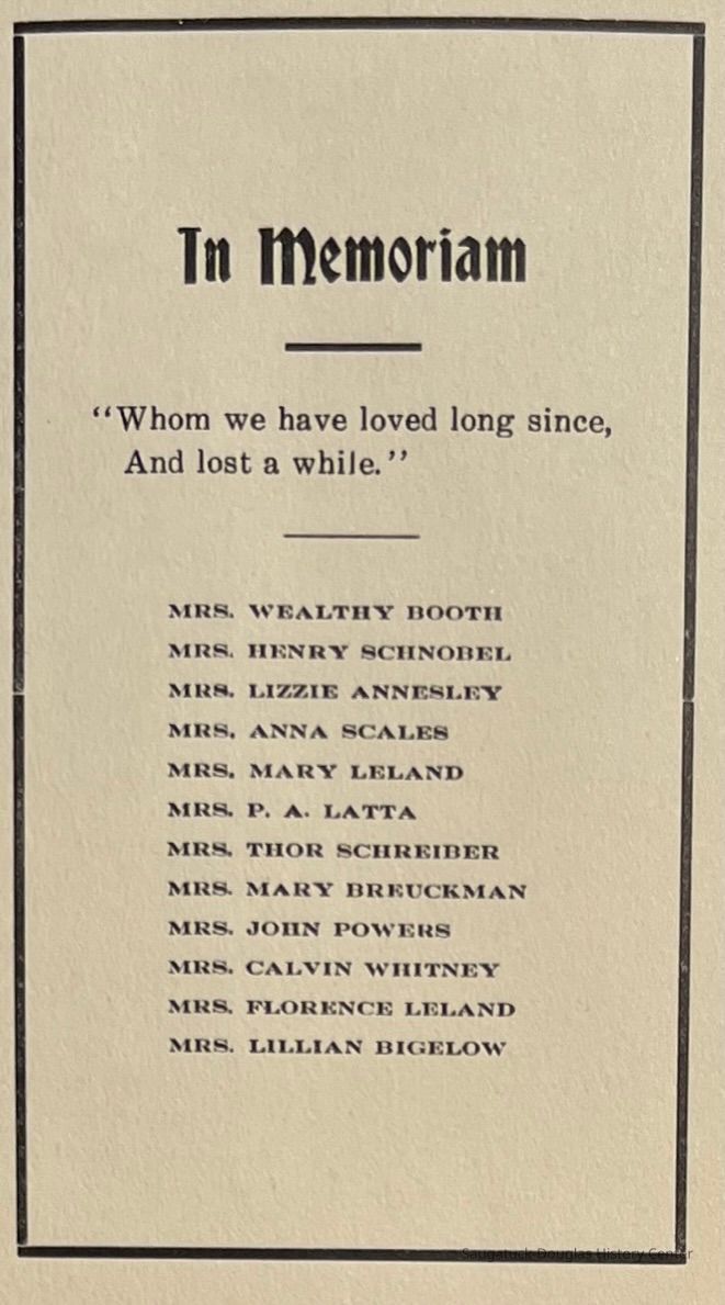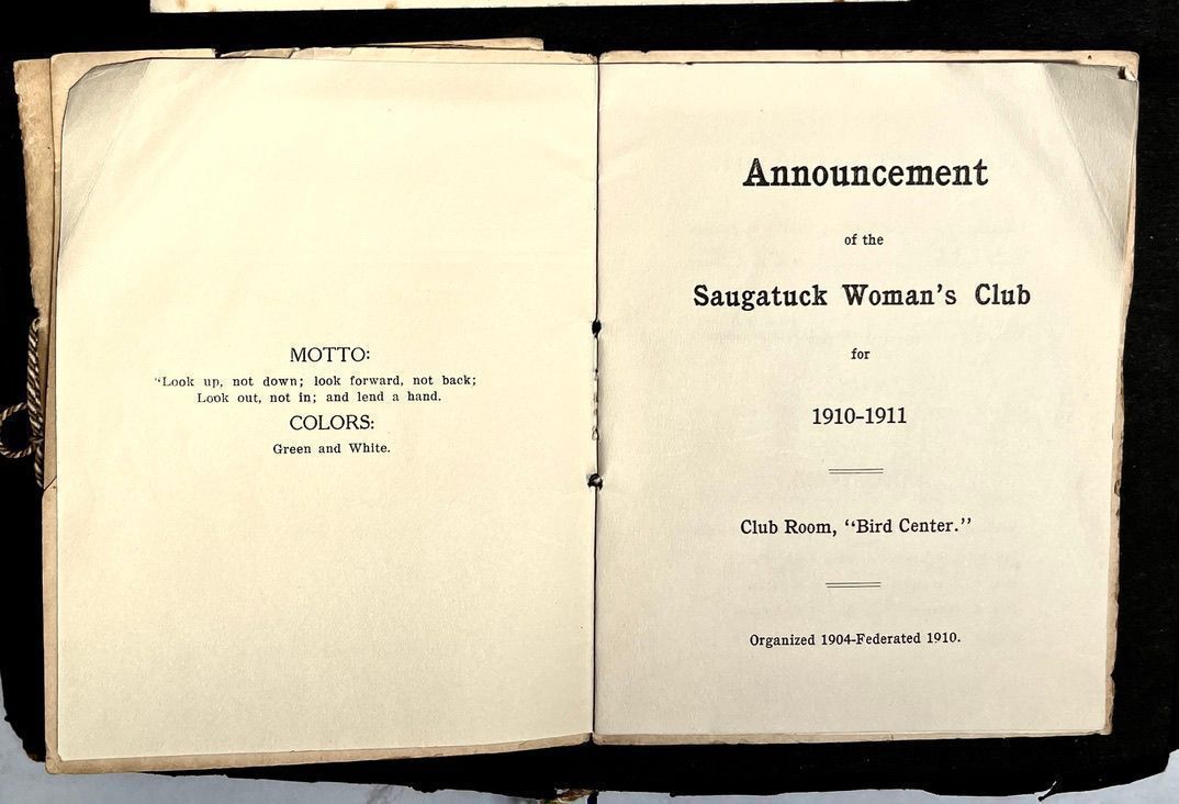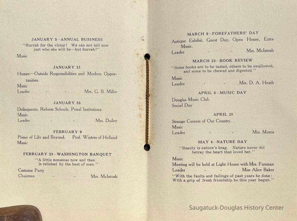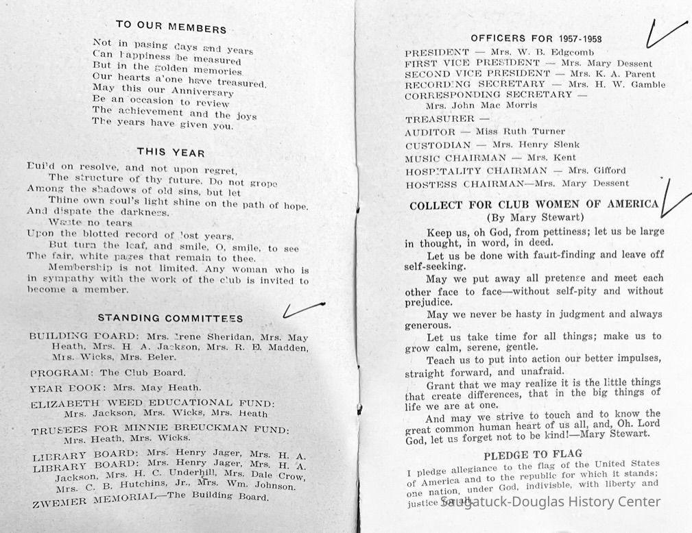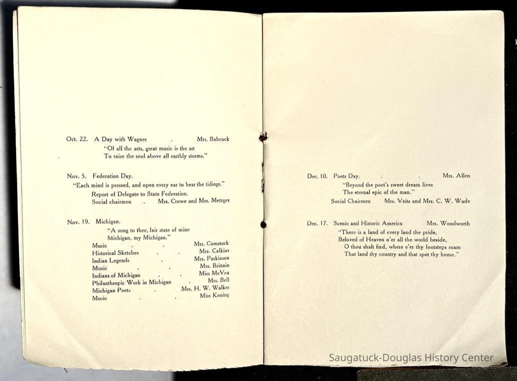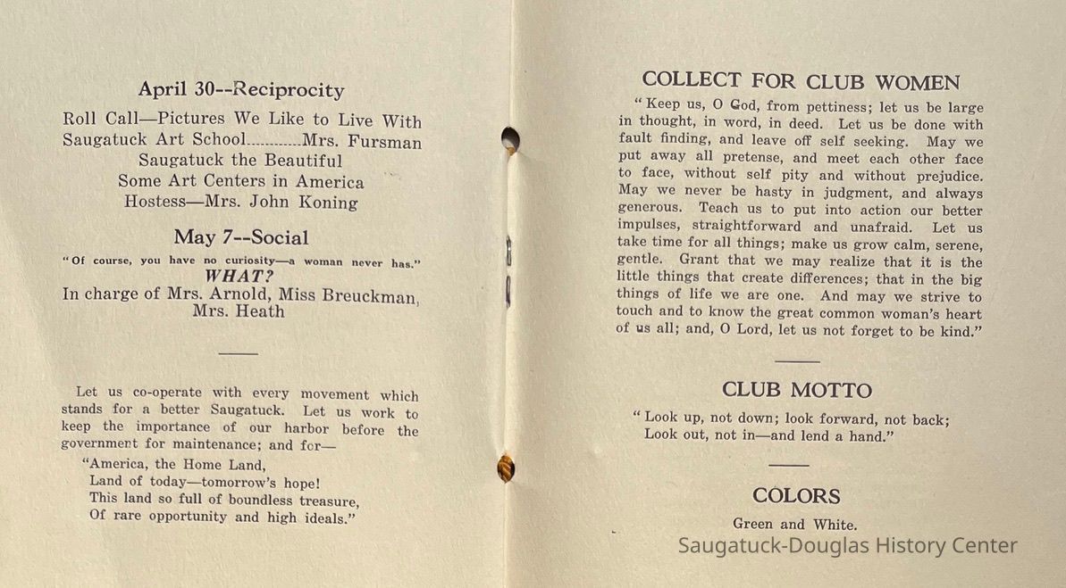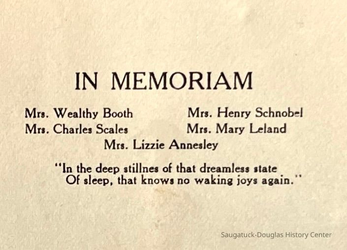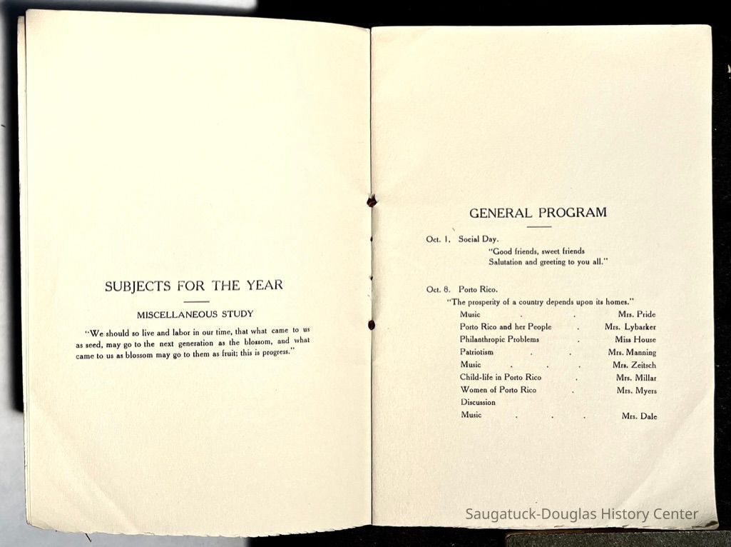 Saugatuck Woman's Club 1904-present, Saugatuck Woman's Club auditorium 1935-present, Heath, May (Francis) 1873-1961, Bird, Harriet “Hattie” Louise (Moffat) (Wright) 1855-1944, Breuckman, Minnie 1869-1934, Coates, Adella "Della" (Holmes) 1864-1950, Thomson, Jeanette Elvira (Harris) 1862-1956, Fox, Johnson 1918-2009, Hodge, Emma Ursula (Gunzenhauser) 1864-1950, Dailey, Margaret, E. (Calkins) 1866-1940, Zwemer, Saburna G. (Woodworth) 1875-1949, Henry, Isabel (Shore) 1856-1936, Woodworth, Alice C. (Redway) Mather 1848-1930, 439 Butler/Butler Pantry/Wilkins/Koning/Nies Hardware, Allen, Flora Elizabeth (Sprang) 1863-1943, Walker, Adelaide Elizabeth (Wade) 1885-1932, Goshorn, Hattie Louise (DePuy) 1874-1953, House, Celia Martin (Gamble) (1890-1976), Millar, Nellie Grant (Raymond) 1861-1956, Jackson, Rhea Bernice (Allen) 1892-1979, Leland, Ruth F. (Baker) 1878-1949, Comey, Alice Maude (Grant) 1870-1944, Davis, Edna Mae (Gaylord) 1896-1980, Wilson, Grace (Cobb) 1897-1992, Sheridan, Irene (Weible) 1883-1967, Waddell, Sadie R. 1882-1947, Wicks, Caroline Jane "Carrie" (Millar) Stillson 1884-1983, Hoffman, Elizabeth S. "Betty" (Gregory) 1894-1960, Brady, Winifred E. (Randall) 1893-1961, Peirce, Roberta "Bobbie" Margaret (Fredrickson) 1914-2004, Carr, Elsie Virginia (Kaufman) 1906-1997, Bieler or Beler, Mrs. Ernest 1904-1954?, Bainbridge, Marguerite (Holladay) 1888-1974, Edgcomb, Ruth M. (Severance) 1915-1997, Taylor, Mrs. Harold