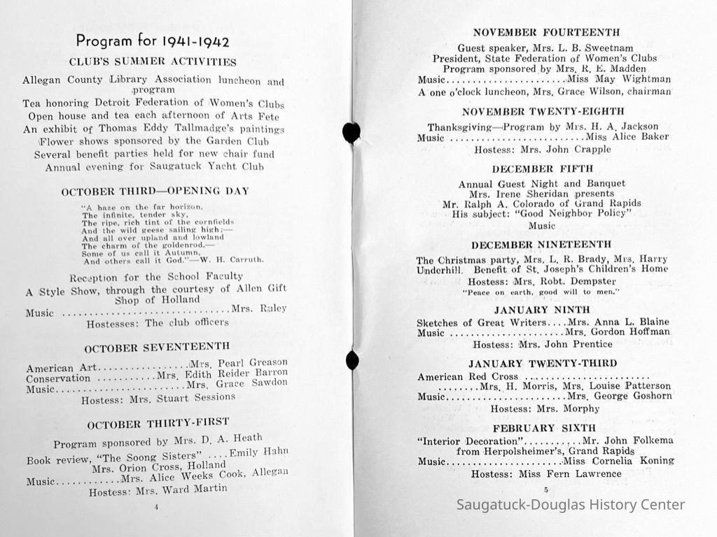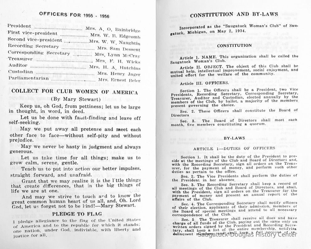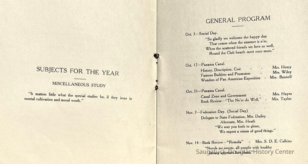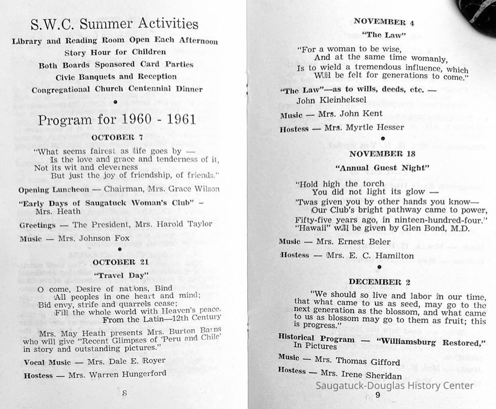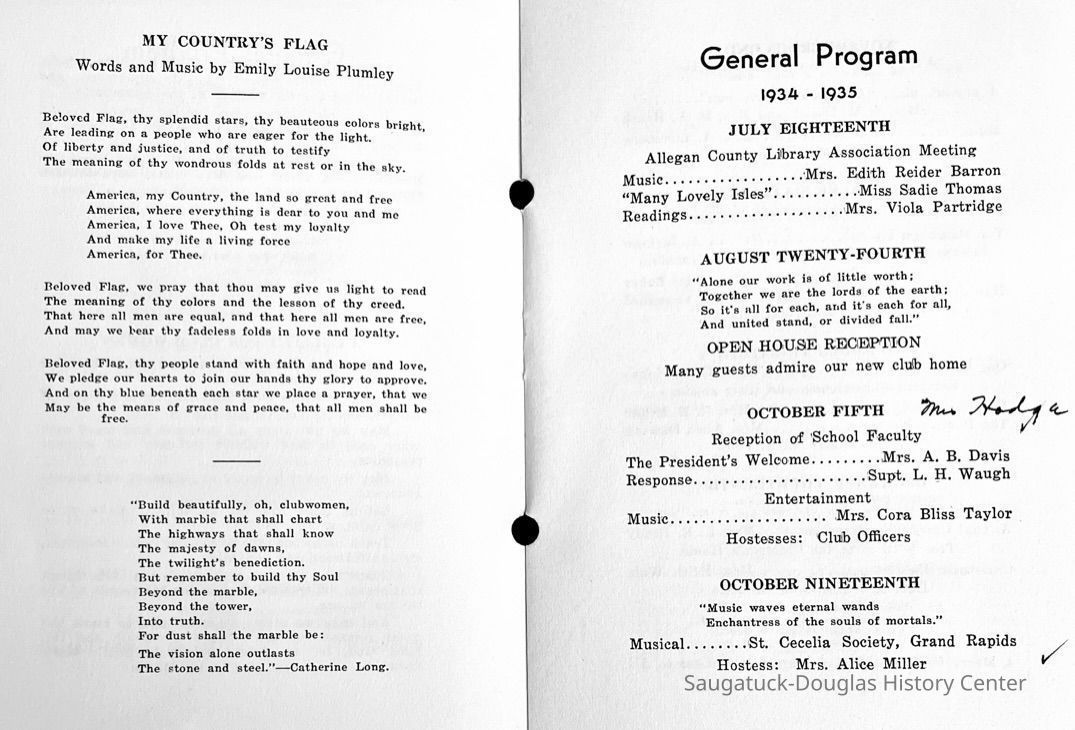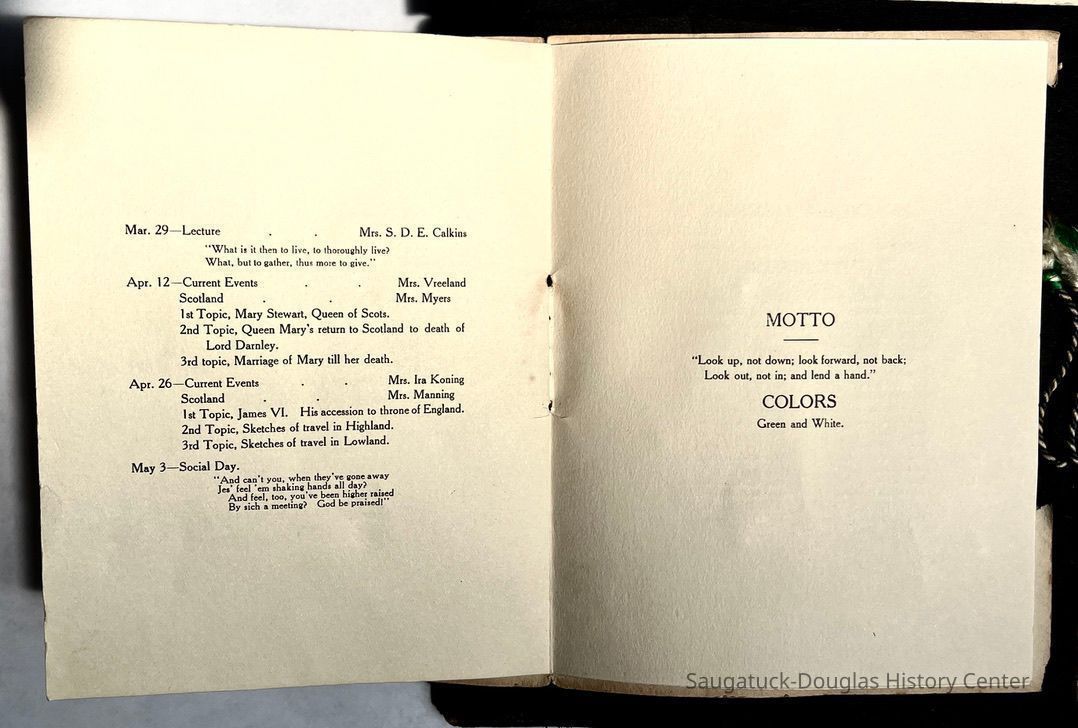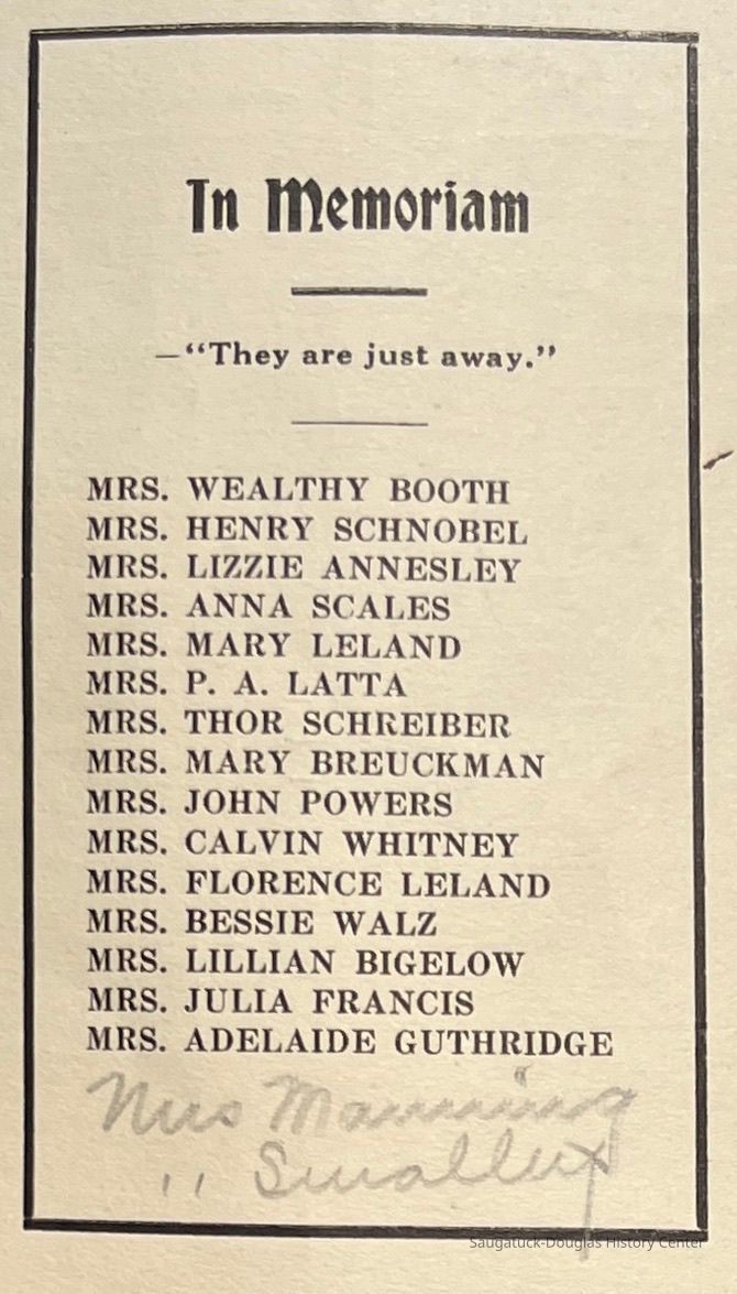 Saugatuck Woman's Club 1904-present, Saugatuck Woman's Club auditorium 1935-present, Heath, May (Francis) 1873-1961, Bird, Harriet “Hattie” Louise (Moffat) (Wright) 1855-1944, Breuckman, Minnie 1869-1934, Coates, Adella "Della" (Holmes) 1864-1950, Thomson, Jeanette Elvira (Harris) 1862-1956, Fox, Johnson 1918-2009, Hodge, Emma Ursula (Gunzenhauser) 1864-1950, Dailey, Margaret, E. (Calkins) 1866-1940, Zwemer, Saburna G. (Woodworth) 1875-1949, Henry, Isabel (Shore) 1856-1936, Woodworth, Alice C. (Redway) Mather 1848-1930, 439 Butler/Butler Pantry/Wilkins/Koning/Nies Hardware, Allen, Flora Elizabeth (Sprang) 1863-1943, Walker, Adelaide Elizabeth (Wade) 1885-1932, Goshorn, Hattie Louise (DePuy) 1874-1953, House, Celia Martin (Gamble) (1890-1976), Millar, Nellie Grant (Raymond) 1861-1956, Jackson, Rhea Bernice (Allen) 1892-1979, Leland, Ruth F. (Baker) 1878-1949, Comey, Alice Maude (Grant) 1870-1944, Davis, Edna Mae (Gaylord) 1896-1980, Wilson, Grace (Cobb) 1897-1992, Sheridan, Irene (Weible) 1883-1967, Waddell, Sadie R. 1882-1947, Wicks, Caroline Jane "Carrie" (Millar) Stillson 1884-1983, Hoffman, Elizabeth S. "Betty" (Gregory) 1894-1960, Brady, Winifred E. (Randall) 1893-1961, Peirce, Roberta "Bobbie" Margaret (Fredrickson) 1914-2004, Carr, Elsie Virginia (Kaufman) 1906-1997, Bieler or Beler, Mrs. Ernest 1904-1954?, Bainbridge, Marguerite (Holladay) 1888-1974, Edgcomb, Ruth M. (Severance) 1915-1997, Taylor, Mrs. Harold