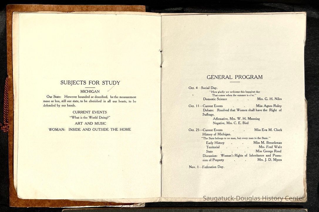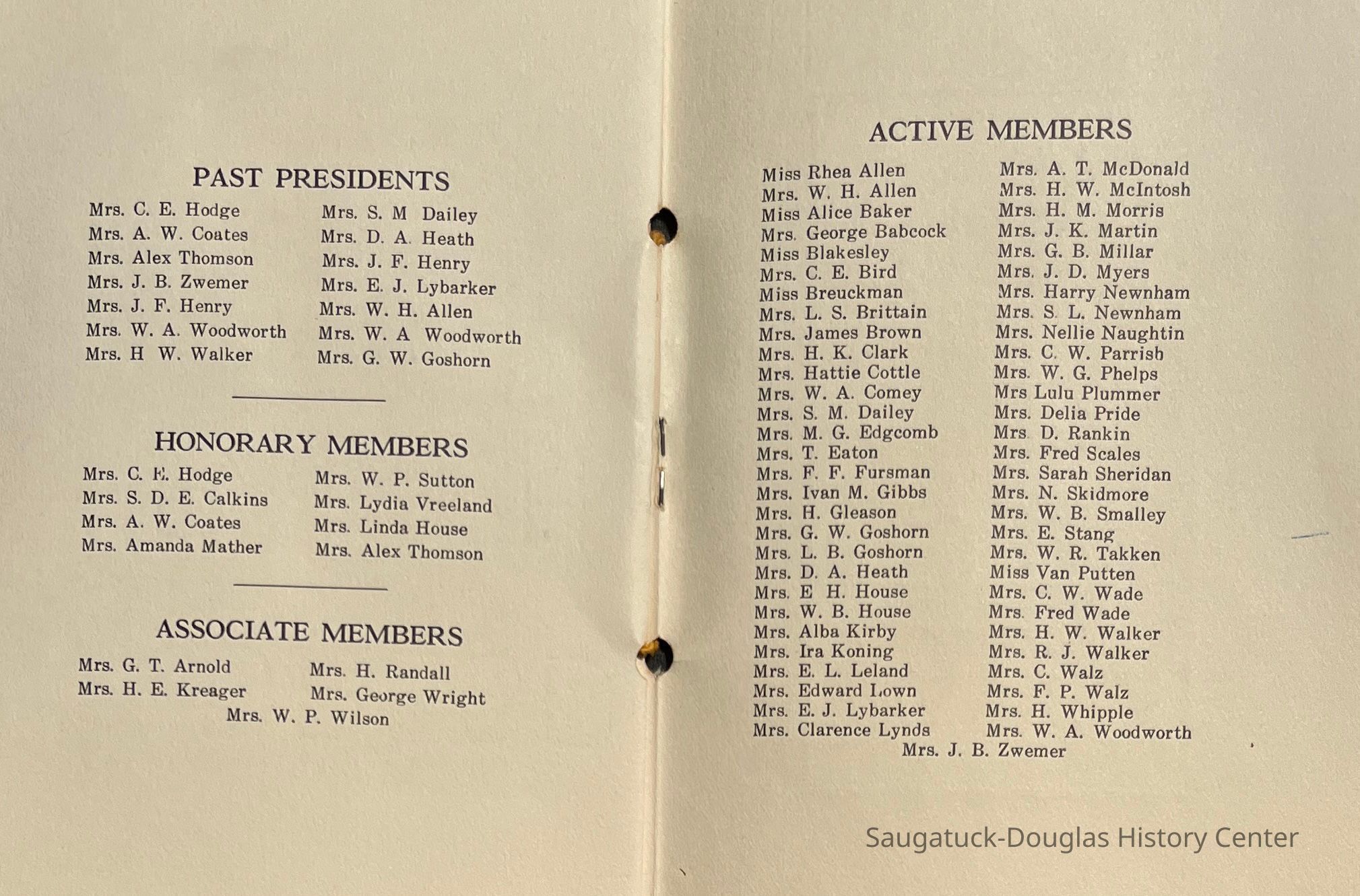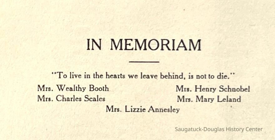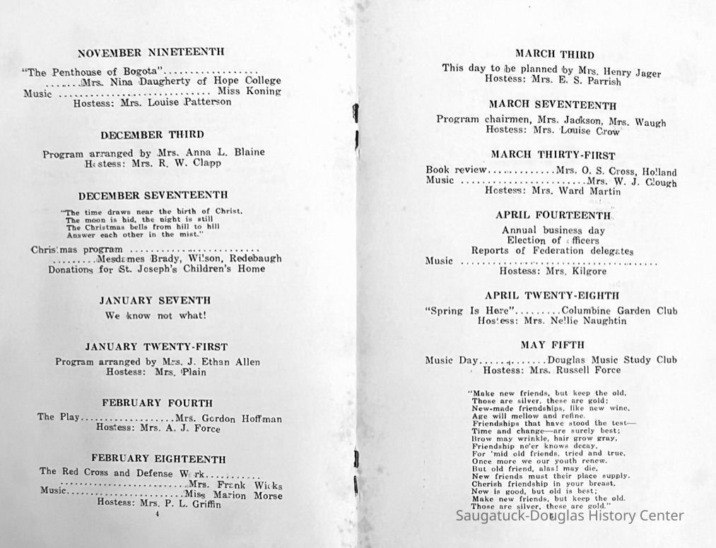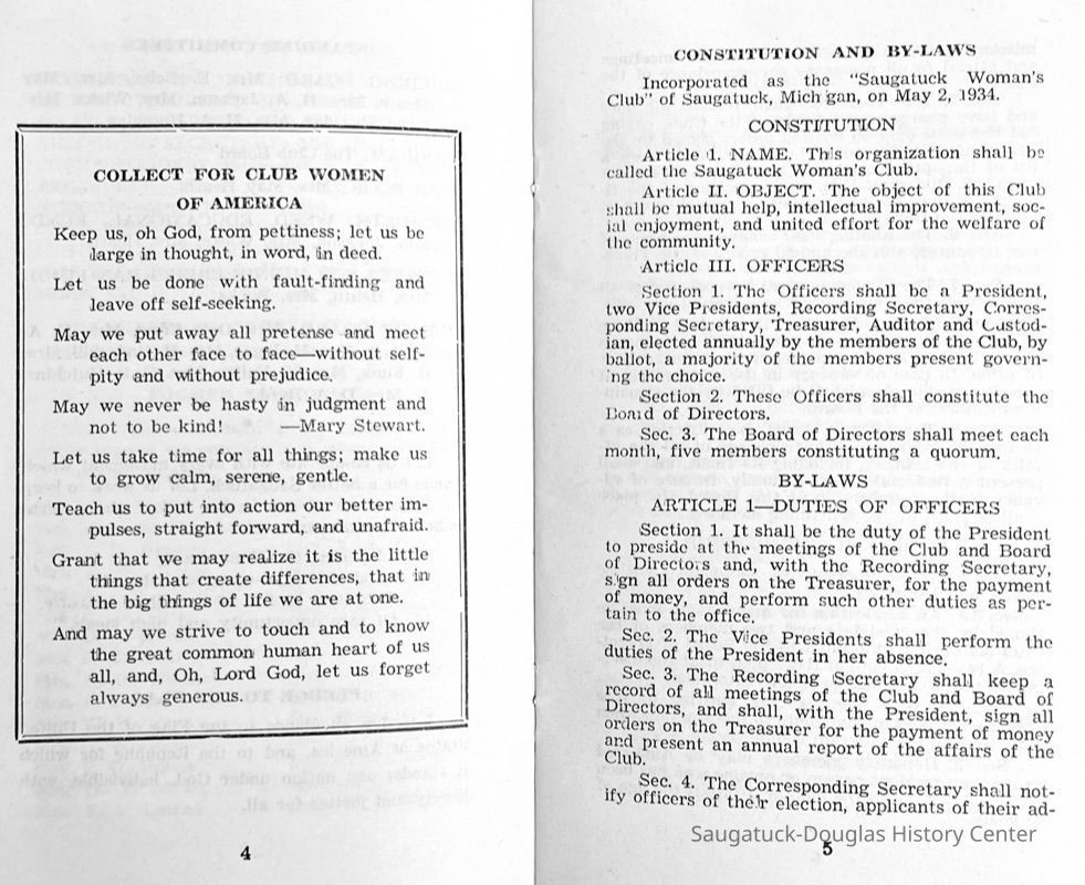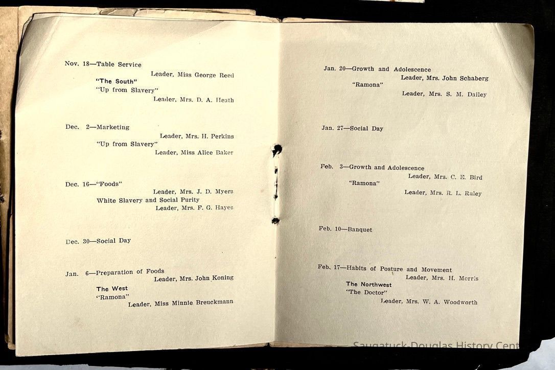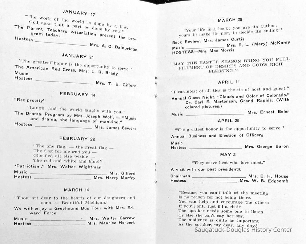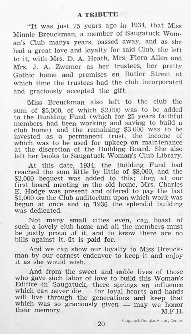 Saugatuck Woman's Club 1904-present, Saugatuck Woman's Club auditorium 1935-present, Heath, May (Francis) 1873-1961, Bird, Harriet “Hattie” Louise (Moffat) (Wright) 1855-1944, Breuckman, Minnie 1869-1934, Coates, Adella "Della" (Holmes) 1864-1950, Thomson, Jeanette Elvira (Harris) 1862-1956, Fox, Johnson 1918-2009, Hodge, Emma Ursula (Gunzenhauser) 1864-1950, Dailey, Margaret, E. (Calkins) 1866-1940, Zwemer, Saburna G. (Woodworth) 1875-1949, Henry, Isabel (Shore) 1856-1936, Woodworth, Alice C. (Redway) Mather 1848-1930, 439 Butler/Butler Pantry/Wilkins/Koning/Nies Hardware, Allen, Flora Elizabeth (Sprang) 1863-1943, Walker, Adelaide Elizabeth (Wade) 1885-1932, Goshorn, Hattie Louise (DePuy) 1874-1953, House, Celia Martin (Gamble) (1890-1976), Millar, Nellie Grant (Raymond) 1861-1956, Jackson, Rhea Bernice (Allen) 1892-1979, Leland, Ruth F. (Baker) 1878-1949, Comey, Alice Maude (Grant) 1870-1944, Davis, Edna Mae (Gaylord) 1896-1980, Wilson, Grace (Cobb) 1897-1992, Sheridan, Irene (Weible) 1883-1967, Waddell, Sadie R. 1882-1947, Wicks, Caroline Jane "Carrie" (Millar) Stillson 1884-1983, Hoffman, Elizabeth S. "Betty" (Gregory) 1894-1960, Brady, Winifred E. (Randall) 1893-1961, Peirce, Roberta "Bobbie" Margaret (Fredrickson) 1914-2004, Carr, Elsie Virginia (Kaufman) 1906-1997, Bieler or Beler, Mrs. Ernest 1904-1954?, Bainbridge, Marguerite (Holladay) 1888-1974, Edgcomb, Ruth M. (Severance) 1915-1997, Taylor, Mrs. Harold