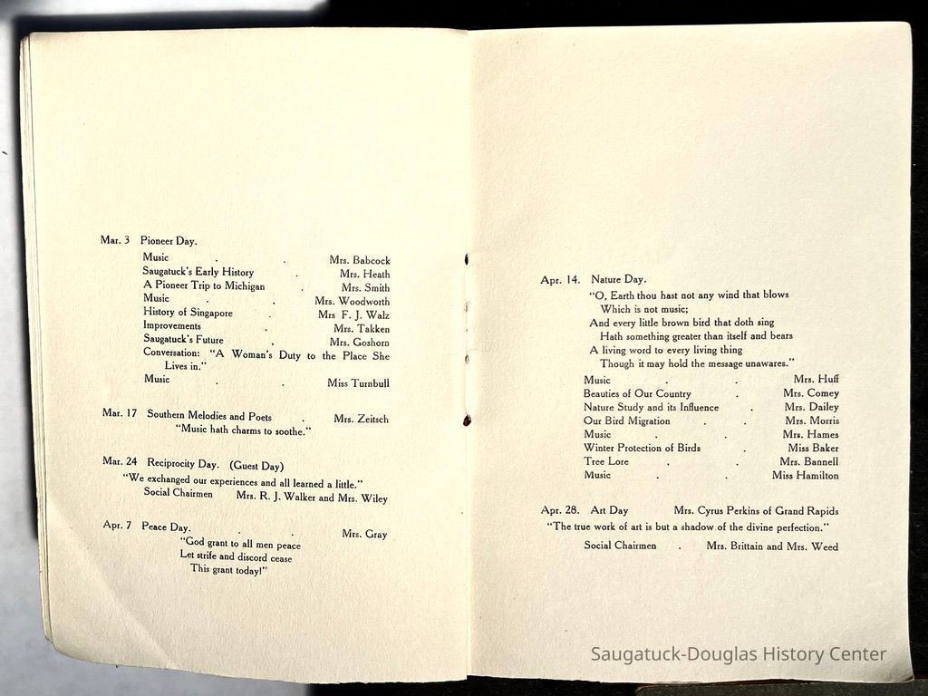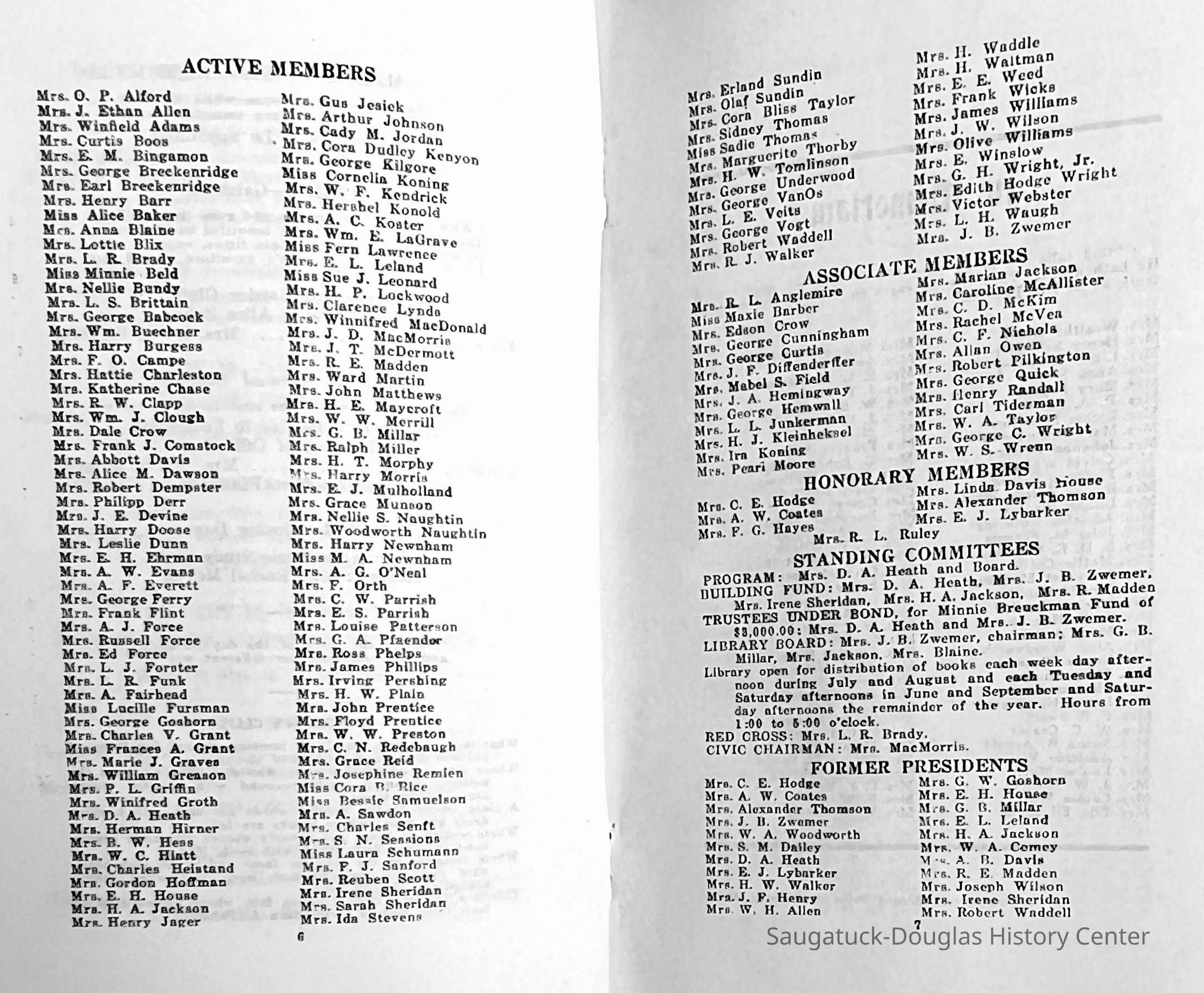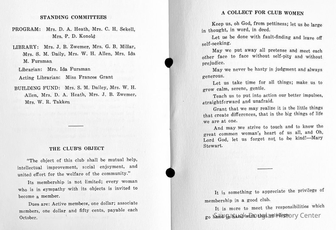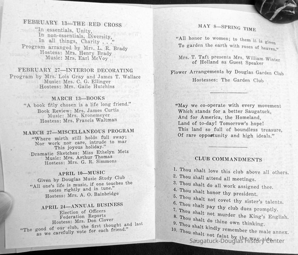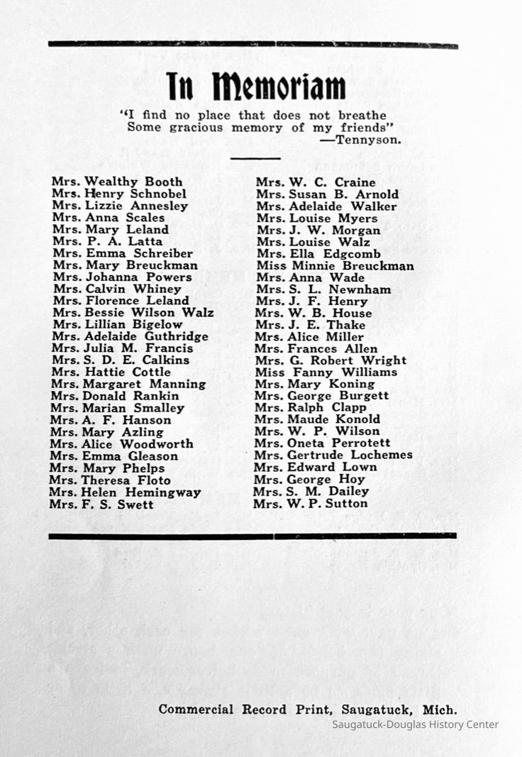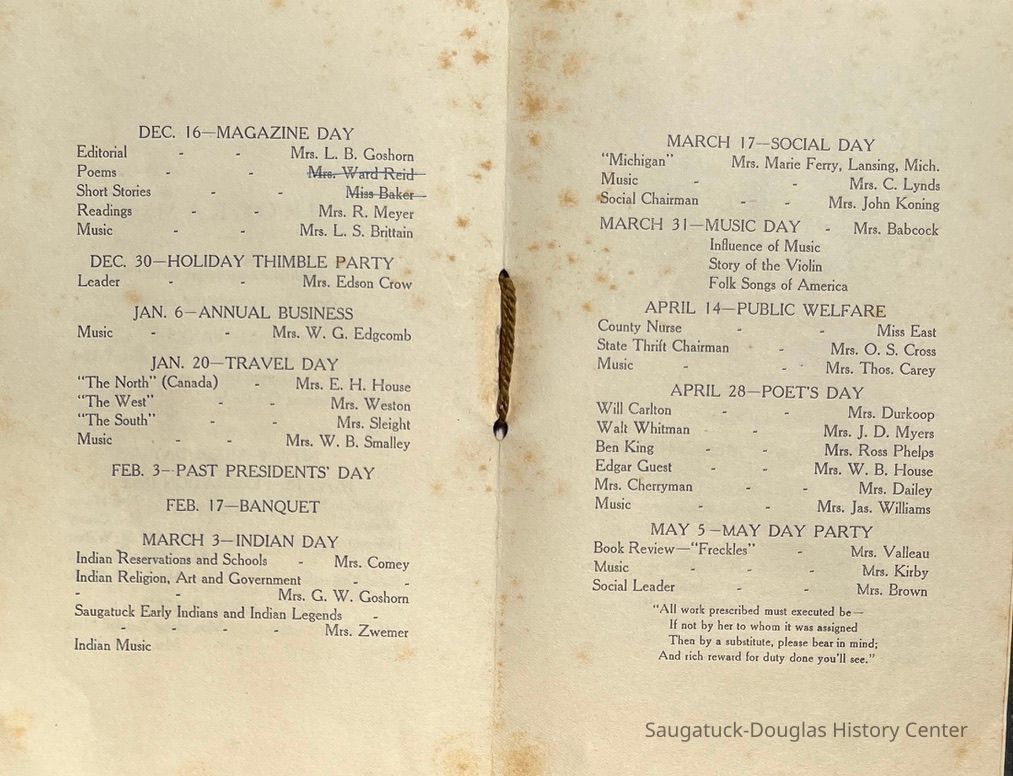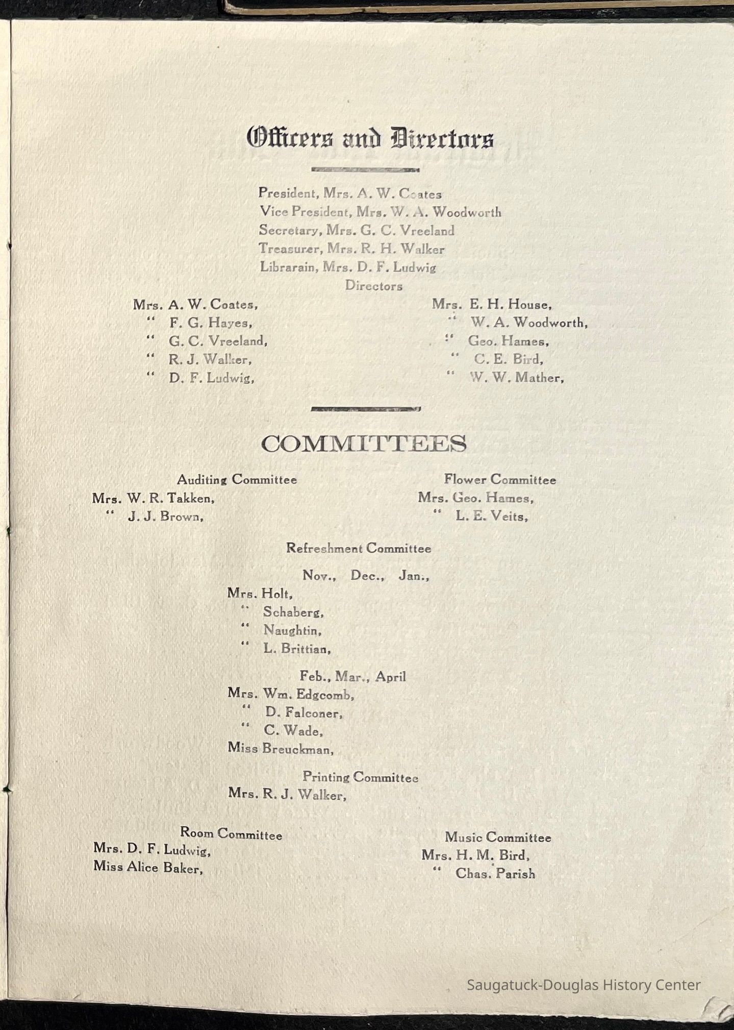 Saugatuck Woman's Club 1904-present, Saugatuck Woman's Club auditorium 1935-present, Heath, May (Francis) 1873-1961, Bird, Harriet “Hattie” Louise (Moffat) (Wright) 1855-1944, Breuckman, Minnie 1869-1934, Coates, Adella "Della" (Holmes) 1864-1950, Thomson, Jeanette Elvira (Harris) 1862-1956, Fox, Johnson 1918-2009, Hodge, Emma Ursula (Gunzenhauser) 1864-1950, Dailey, Margaret, E. (Calkins) 1866-1940, Zwemer, Saburna G. (Woodworth) 1875-1949, Henry, Isabel (Shore) 1856-1936, Woodworth, Alice C. (Redway) Mather 1848-1930, 439 Butler/Butler Pantry/Wilkins/Koning/Nies Hardware, Allen, Flora Elizabeth (Sprang) 1863-1943, Walker, Adelaide Elizabeth (Wade) 1885-1932, Goshorn, Hattie Louise (DePuy) 1874-1953, House, Celia Martin (Gamble) (1890-1976), Millar, Nellie Grant (Raymond) 1861-1956, Jackson, Rhea Bernice (Allen) 1892-1979, Leland, Ruth F. (Baker) 1878-1949, Comey, Alice Maude (Grant) 1870-1944, Davis, Edna Mae (Gaylord) 1896-1980, Wilson, Grace (Cobb) 1897-1992, Sheridan, Irene (Weible) 1883-1967, Waddell, Sadie R. 1882-1947, Wicks, Caroline Jane "Carrie" (Millar) Stillson 1884-1983, Hoffman, Elizabeth S. "Betty" (Gregory) 1894-1960, Brady, Winifred E. (Randall) 1893-1961, Peirce, Roberta "Bobbie" Margaret (Fredrickson) 1914-2004, Carr, Elsie Virginia (Kaufman) 1906-1997, Bieler or Beler, Mrs. Ernest 1904-1954?, Bainbridge, Marguerite (Holladay) 1888-1974, Edgcomb, Ruth M. (Severance) 1915-1997, Taylor, Mrs. Harold