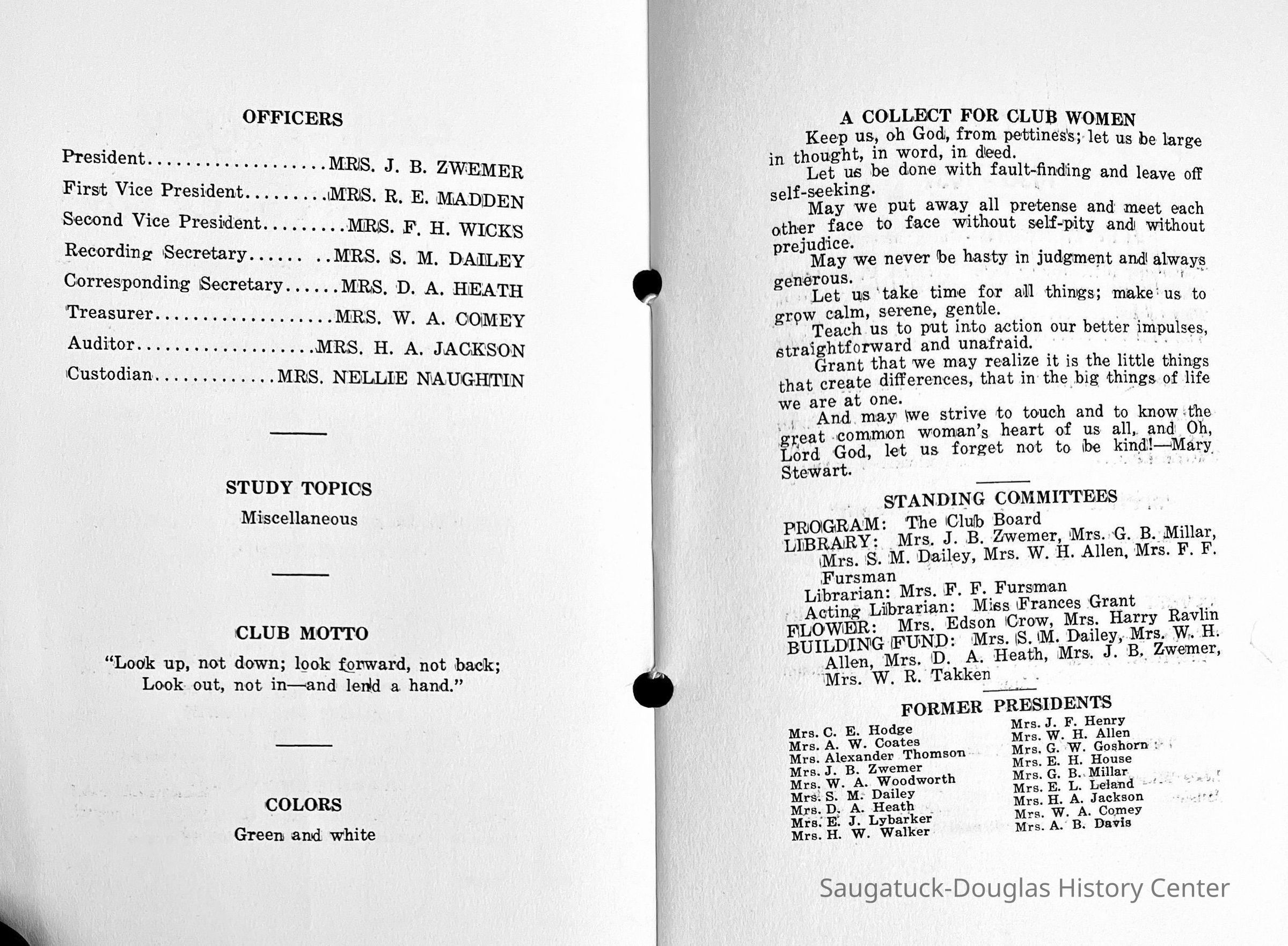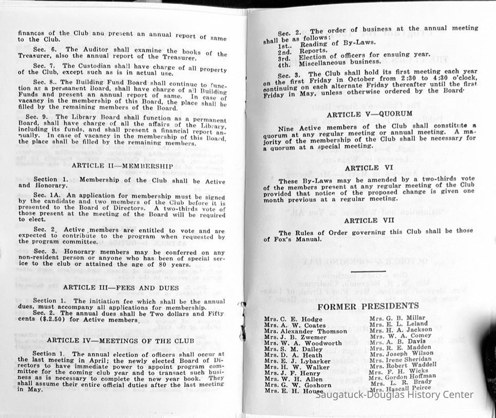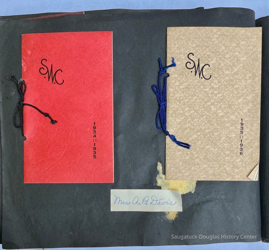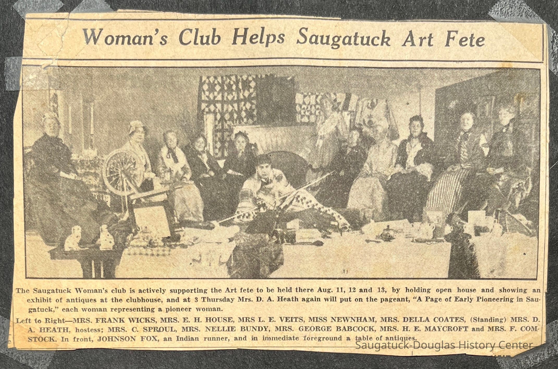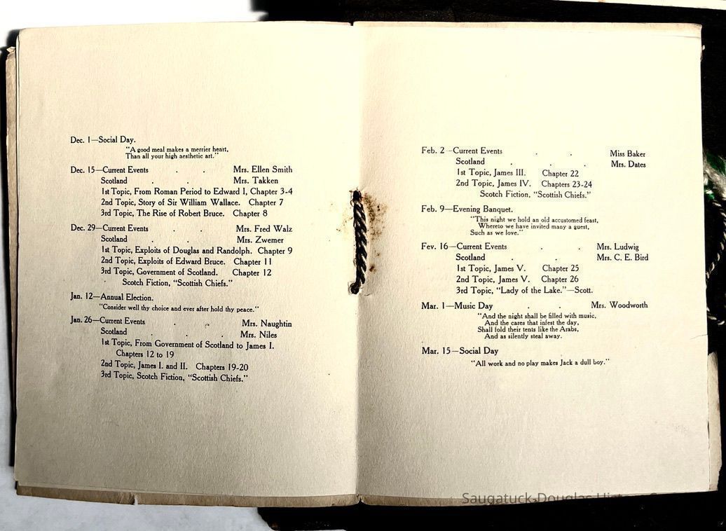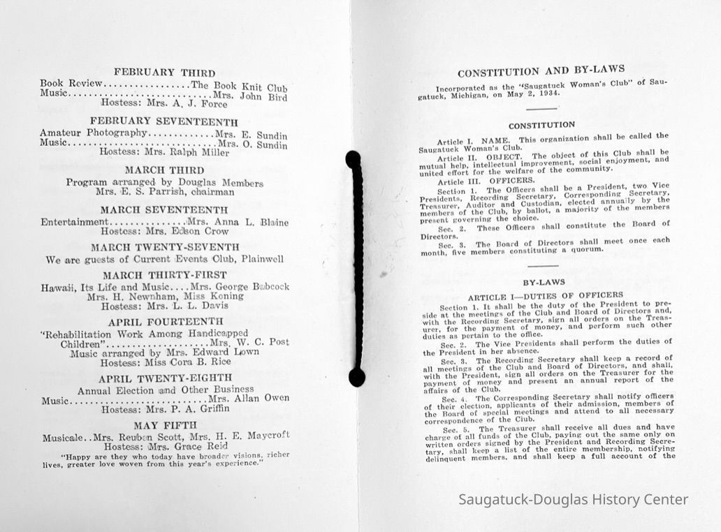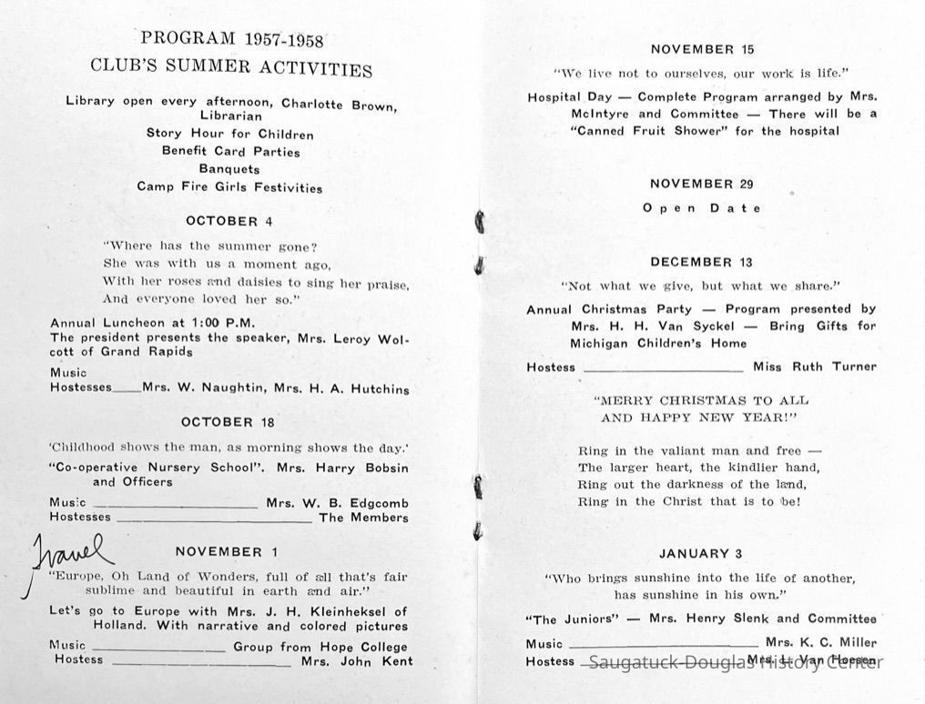 Saugatuck Woman's Club 1904-present, Saugatuck Woman's Club auditorium 1935-present, Heath, May (Francis) 1873-1961, Bird, Harriet “Hattie” Louise (Moffat) (Wright) 1855-1944, Breuckman, Minnie 1869-1934, Coates, Adella "Della" (Holmes) 1864-1950, Thomson, Jeanette Elvira (Harris) 1862-1956, Fox, Johnson 1918-2009, Hodge, Emma Ursula (Gunzenhauser) 1864-1950, Dailey, Margaret, E. (Calkins) 1866-1940, Zwemer, Saburna G. (Woodworth) 1875-1949, Henry, Isabel (Shore) 1856-1936, Woodworth, Alice C. (Redway) Mather 1848-1930, 439 Butler/Butler Pantry/Wilkins/Koning/Nies Hardware, Allen, Flora Elizabeth (Sprang) 1863-1943, Walker, Adelaide Elizabeth (Wade) 1885-1932, Goshorn, Hattie Louise (DePuy) 1874-1953, House, Celia Martin (Gamble) (1890-1976), Millar, Nellie Grant (Raymond) 1861-1956, Jackson, Rhea Bernice (Allen) 1892-1979, Leland, Ruth F. (Baker) 1878-1949, Comey, Alice Maude (Grant) 1870-1944, Davis, Edna Mae (Gaylord) 1896-1980, Wilson, Grace (Cobb) 1897-1992, Sheridan, Irene (Weible) 1883-1967, Waddell, Sadie R. 1882-1947, Wicks, Caroline Jane "Carrie" (Millar) Stillson 1884-1983, Hoffman, Elizabeth S. "Betty" (Gregory) 1894-1960, Brady, Winifred E. (Randall) 1893-1961, Peirce, Roberta "Bobbie" Margaret (Fredrickson) 1914-2004, Carr, Elsie Virginia (Kaufman) 1906-1997, Bieler or Beler, Mrs. Ernest 1904-1954?, Bainbridge, Marguerite (Holladay) 1888-1974, Edgcomb, Ruth M. (Severance) 1915-1997, Taylor, Mrs. Harold