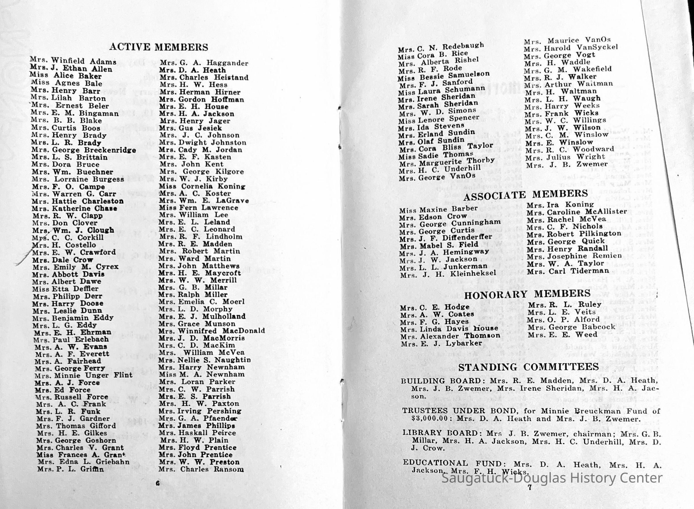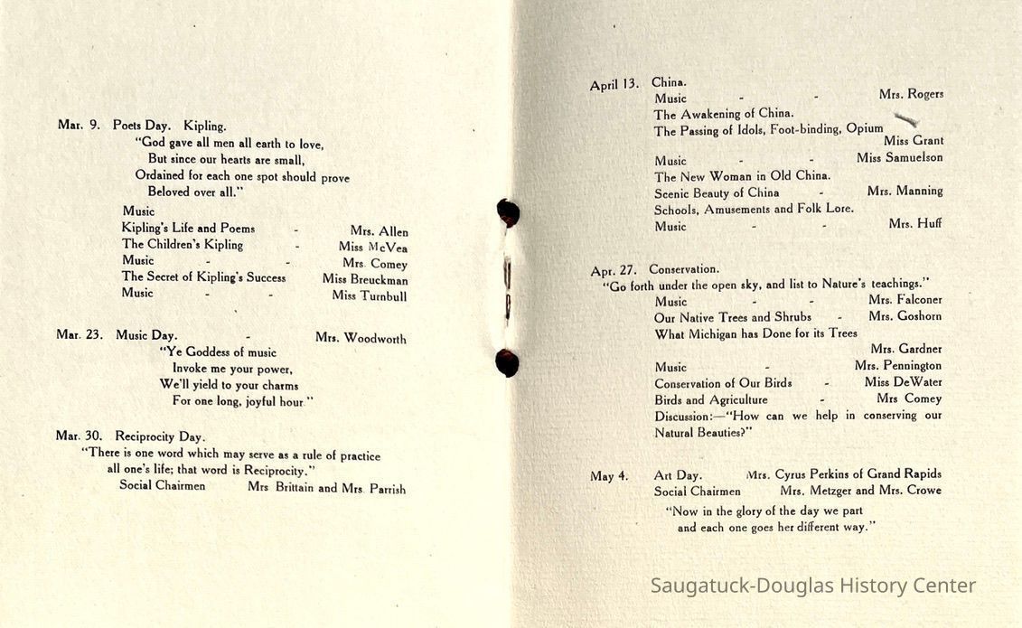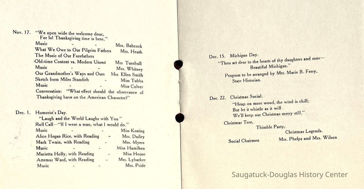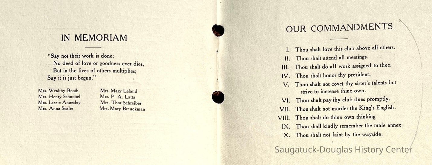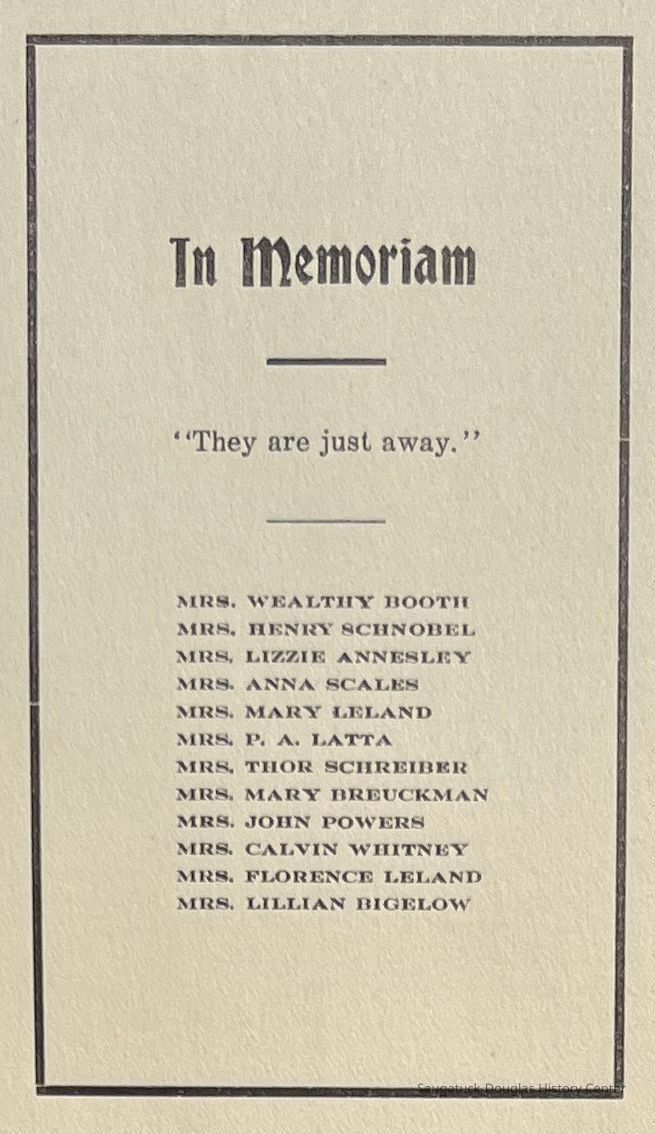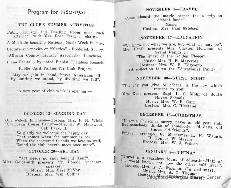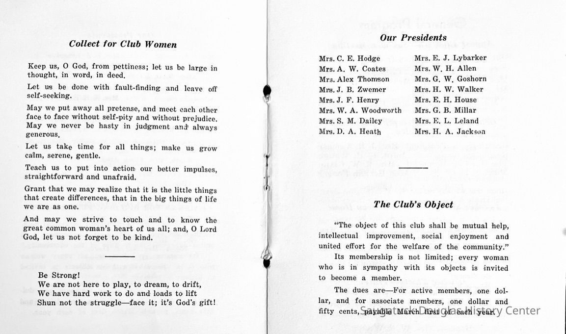 Saugatuck Woman's Club 1904-present, Saugatuck Woman's Club auditorium 1935-present, Heath, May (Francis) 1873-1961, Bird, Harriet “Hattie” Louise (Moffat) (Wright) 1855-1944, Breuckman, Minnie 1869-1934, Coates, Adella "Della" (Holmes) 1864-1950, Thomson, Jeanette Elvira (Harris) 1862-1956, Fox, Johnson 1918-2009, Hodge, Emma Ursula (Gunzenhauser) 1864-1950, Dailey, Margaret, E. (Calkins) 1866-1940, Zwemer, Saburna G. (Woodworth) 1875-1949, Henry, Isabel (Shore) 1856-1936, Woodworth, Alice C. (Redway) Mather 1848-1930, 439 Butler/Butler Pantry/Wilkins/Koning/Nies Hardware, Allen, Flora Elizabeth (Sprang) 1863-1943, Walker, Adelaide Elizabeth (Wade) 1885-1932, Goshorn, Hattie Louise (DePuy) 1874-1953, House, Celia Martin (Gamble) (1890-1976), Millar, Nellie Grant (Raymond) 1861-1956, Jackson, Rhea Bernice (Allen) 1892-1979, Leland, Ruth F. (Baker) 1878-1949, Comey, Alice Maude (Grant) 1870-1944, Davis, Edna Mae (Gaylord) 1896-1980, Wilson, Grace (Cobb) 1897-1992, Sheridan, Irene (Weible) 1883-1967, Waddell, Sadie R. 1882-1947, Wicks, Caroline Jane "Carrie" (Millar) Stillson 1884-1983, Hoffman, Elizabeth S. "Betty" (Gregory) 1894-1960, Brady, Winifred E. (Randall) 1893-1961, Peirce, Roberta "Bobbie" Margaret (Fredrickson) 1914-2004, Carr, Elsie Virginia (Kaufman) 1906-1997, Bieler or Beler, Mrs. Ernest 1904-1954?, Bainbridge, Marguerite (Holladay) 1888-1974, Edgcomb, Ruth M. (Severance) 1915-1997, Taylor, Mrs. Harold