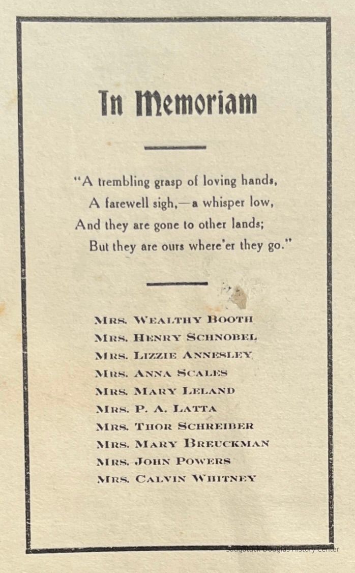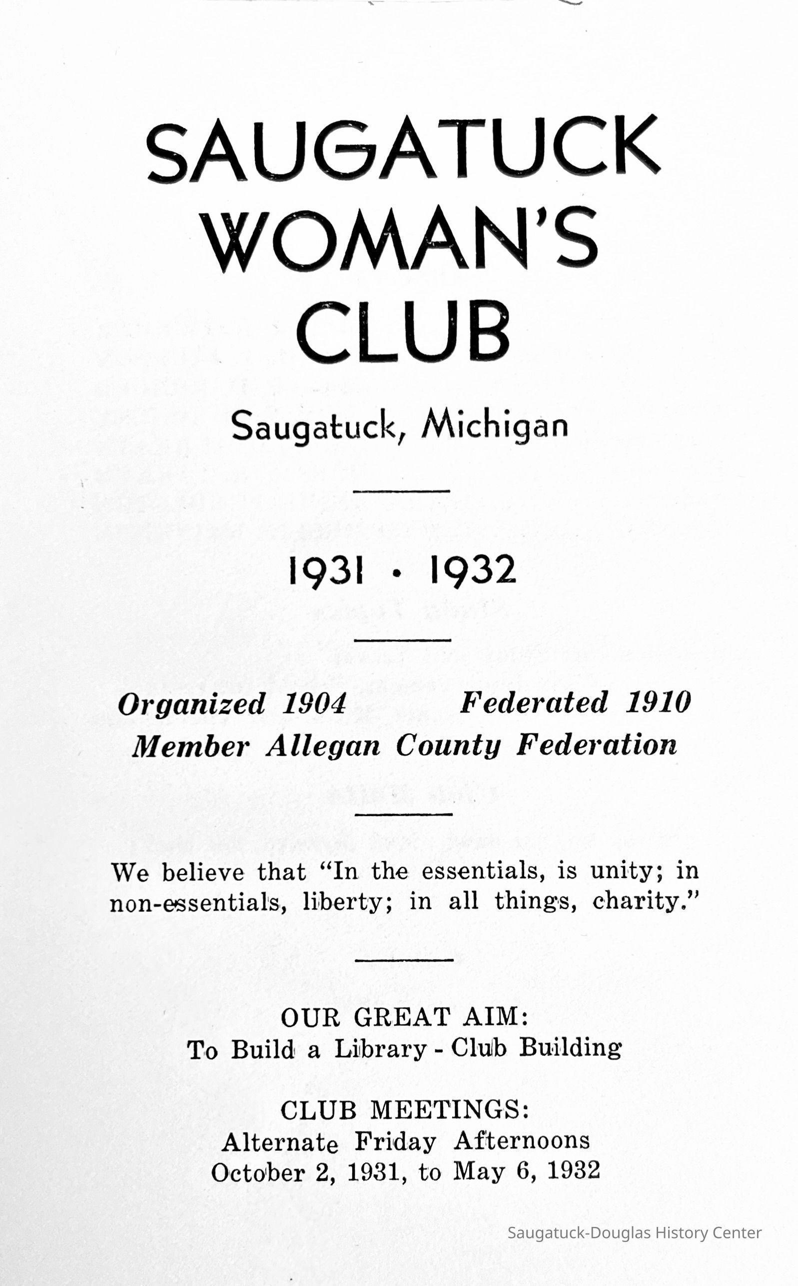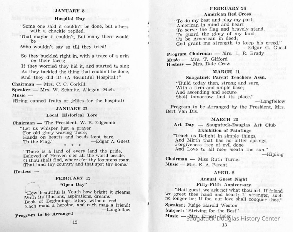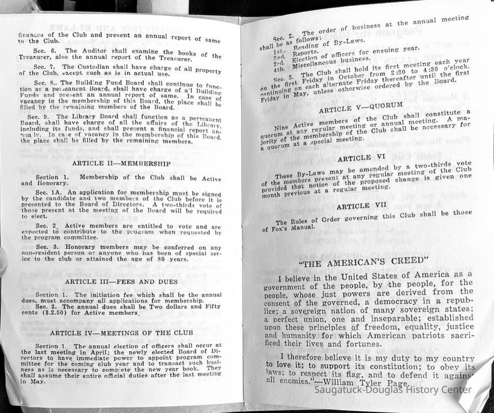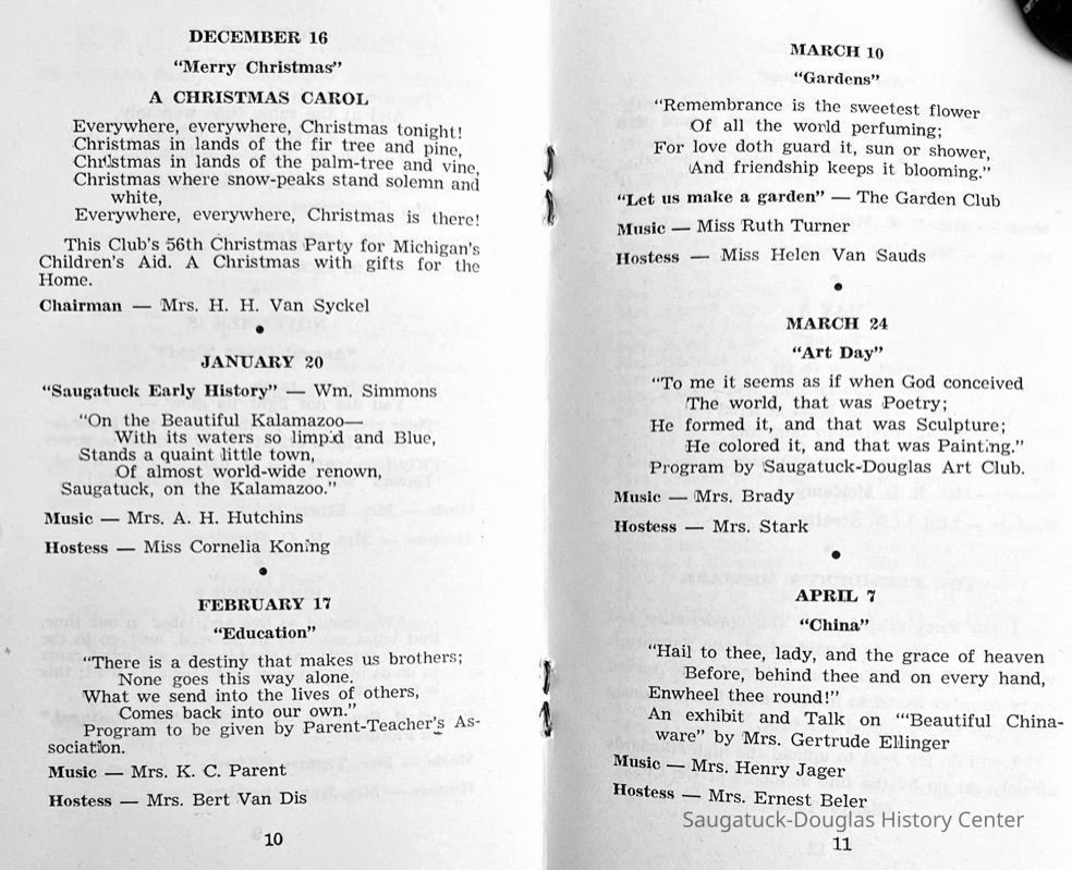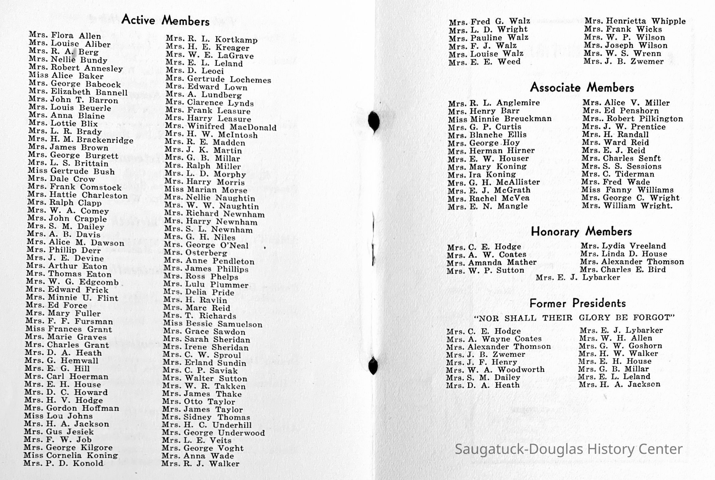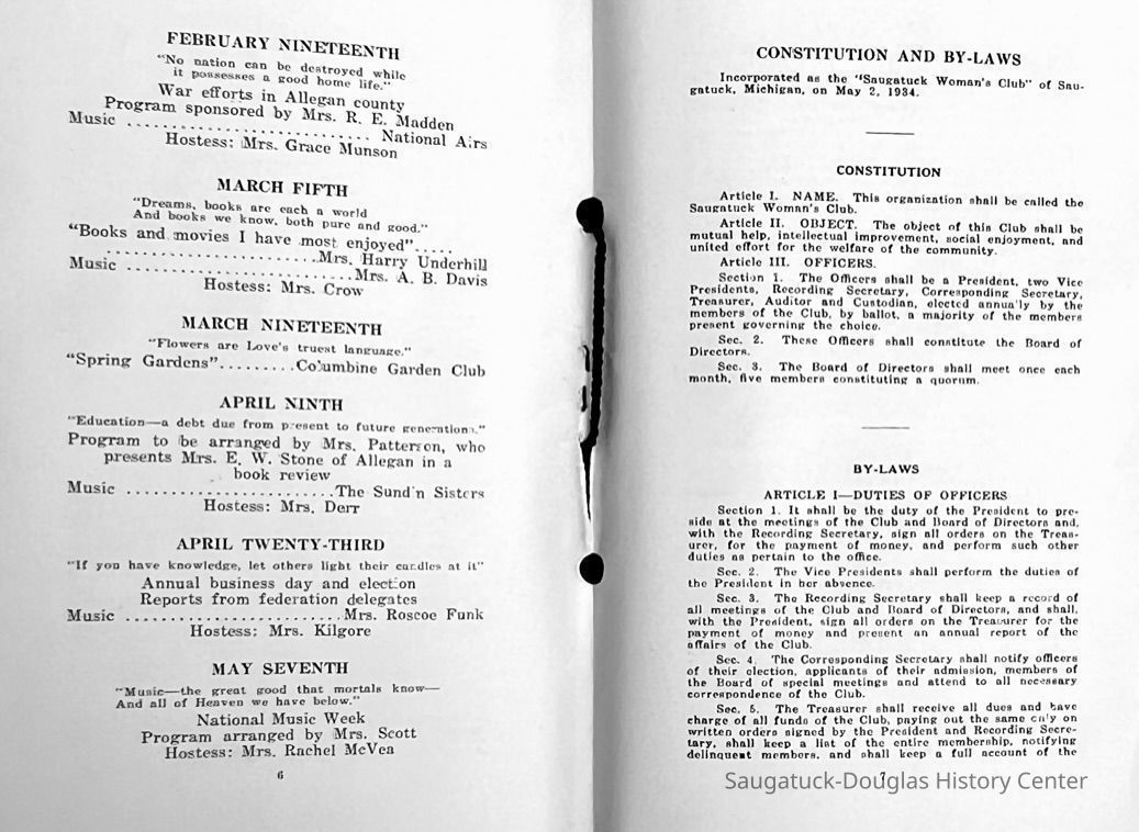 Saugatuck Woman's Club 1904-present, Saugatuck Woman's Club auditorium 1935-present, Heath, May (Francis) 1873-1961, Bird, Harriet “Hattie” Louise (Moffat) (Wright) 1855-1944, Breuckman, Minnie 1869-1934, Coates, Adella "Della" (Holmes) 1864-1950, Thomson, Jeanette Elvira (Harris) 1862-1956, Fox, Johnson 1918-2009, Hodge, Emma Ursula (Gunzenhauser) 1864-1950, Dailey, Margaret, E. (Calkins) 1866-1940, Zwemer, Saburna G. (Woodworth) 1875-1949, Henry, Isabel (Shore) 1856-1936, Woodworth, Alice C. (Redway) Mather 1848-1930, 439 Butler/Butler Pantry/Wilkins/Koning/Nies Hardware, Allen, Flora Elizabeth (Sprang) 1863-1943, Walker, Adelaide Elizabeth (Wade) 1885-1932, Goshorn, Hattie Louise (DePuy) 1874-1953, House, Celia Martin (Gamble) (1890-1976), Millar, Nellie Grant (Raymond) 1861-1956, Jackson, Rhea Bernice (Allen) 1892-1979, Leland, Ruth F. (Baker) 1878-1949, Comey, Alice Maude (Grant) 1870-1944, Davis, Edna Mae (Gaylord) 1896-1980, Wilson, Grace (Cobb) 1897-1992, Sheridan, Irene (Weible) 1883-1967, Waddell, Sadie R. 1882-1947, Wicks, Caroline Jane "Carrie" (Millar) Stillson 1884-1983, Hoffman, Elizabeth S. "Betty" (Gregory) 1894-1960, Brady, Winifred E. (Randall) 1893-1961, Peirce, Roberta "Bobbie" Margaret (Fredrickson) 1914-2004, Carr, Elsie Virginia (Kaufman) 1906-1997, Bieler or Beler, Mrs. Ernest 1904-1954?, Bainbridge, Marguerite (Holladay) 1888-1974, Edgcomb, Ruth M. (Severance) 1915-1997, Taylor, Mrs. Harold