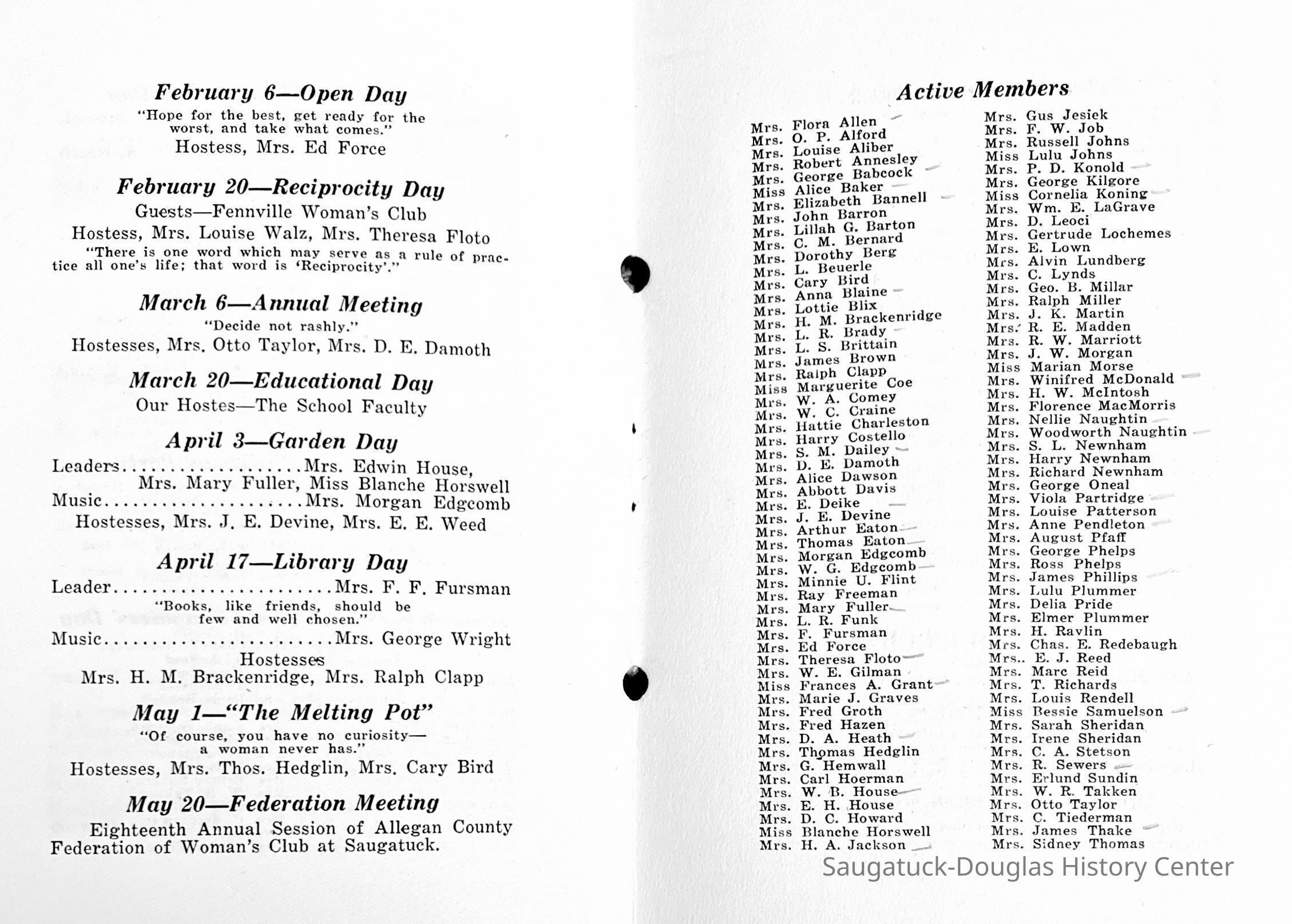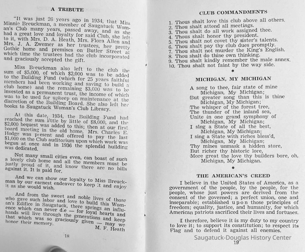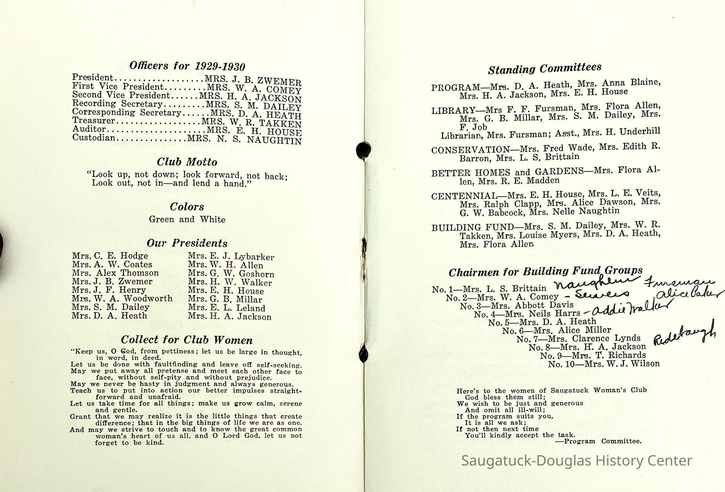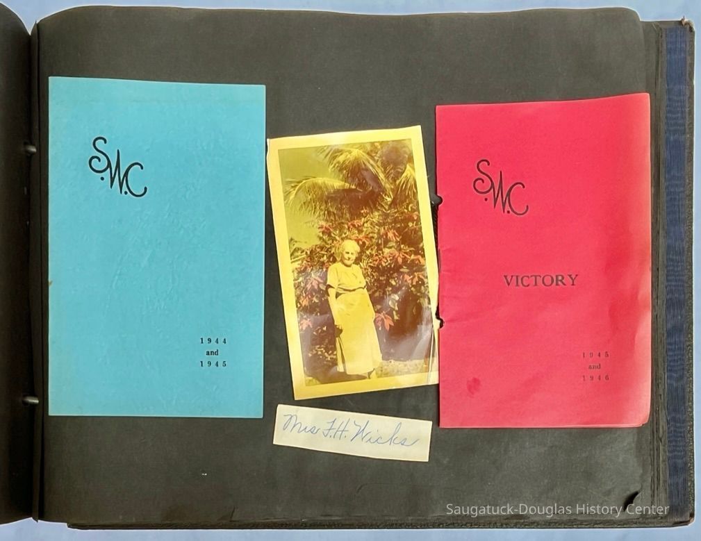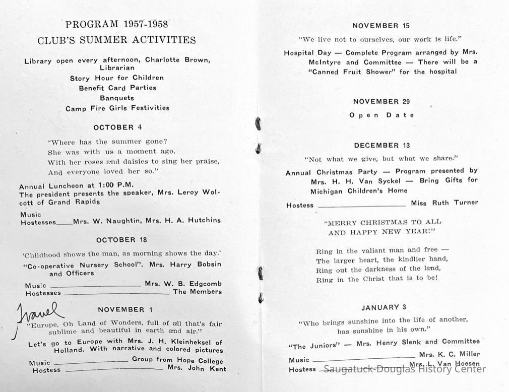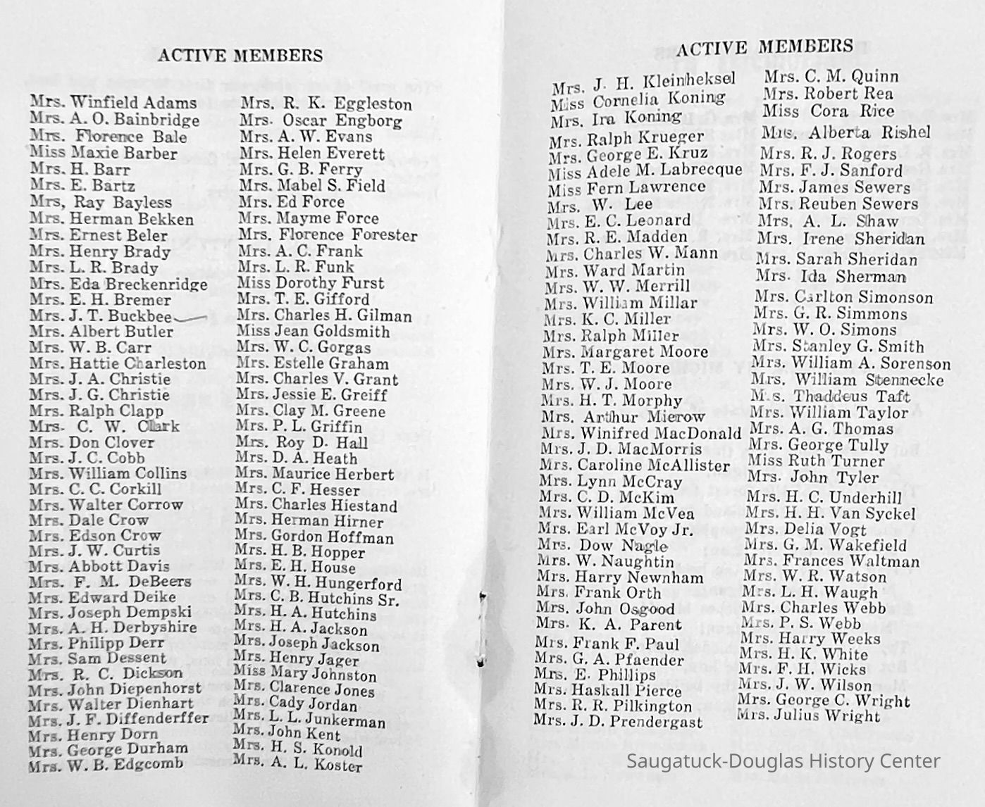 Saugatuck Woman's Club 1904-present, Saugatuck Woman's Club auditorium 1935-present, Heath, May (Francis) 1873-1961, Bird, Harriet “Hattie” Louise (Moffat) (Wright) 1855-1944, Breuckman, Minnie 1869-1934, Coates, Adella "Della" (Holmes) 1864-1950, Thomson, Jeanette Elvira (Harris) 1862-1956, Fox, Johnson 1918-2009, Hodge, Emma Ursula (Gunzenhauser) 1864-1950, Dailey, Margaret, E. (Calkins) 1866-1940, Zwemer, Saburna G. (Woodworth) 1875-1949, Henry, Isabel (Shore) 1856-1936, Woodworth, Alice C. (Redway) Mather 1848-1930, 439 Butler/Butler Pantry/Wilkins/Koning/Nies Hardware, Allen, Flora Elizabeth (Sprang) 1863-1943, Walker, Adelaide Elizabeth (Wade) 1885-1932, Goshorn, Hattie Louise (DePuy) 1874-1953, House, Celia Martin (Gamble) (1890-1976), Millar, Nellie Grant (Raymond) 1861-1956, Jackson, Rhea Bernice (Allen) 1892-1979, Leland, Ruth F. (Baker) 1878-1949, Comey, Alice Maude (Grant) 1870-1944, Davis, Edna Mae (Gaylord) 1896-1980, Wilson, Grace (Cobb) 1897-1992, Sheridan, Irene (Weible) 1883-1967, Waddell, Sadie R. 1882-1947, Wicks, Caroline Jane "Carrie" (Millar) Stillson 1884-1983, Hoffman, Elizabeth S. "Betty" (Gregory) 1894-1960, Brady, Winifred E. (Randall) 1893-1961, Peirce, Roberta "Bobbie" Margaret (Fredrickson) 1914-2004, Carr, Elsie Virginia (Kaufman) 1906-1997, Bieler or Beler, Mrs. Ernest 1904-1954?, Bainbridge, Marguerite (Holladay) 1888-1974, Edgcomb, Ruth M. (Severance) 1915-1997, Taylor, Mrs. Harold