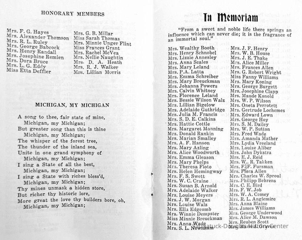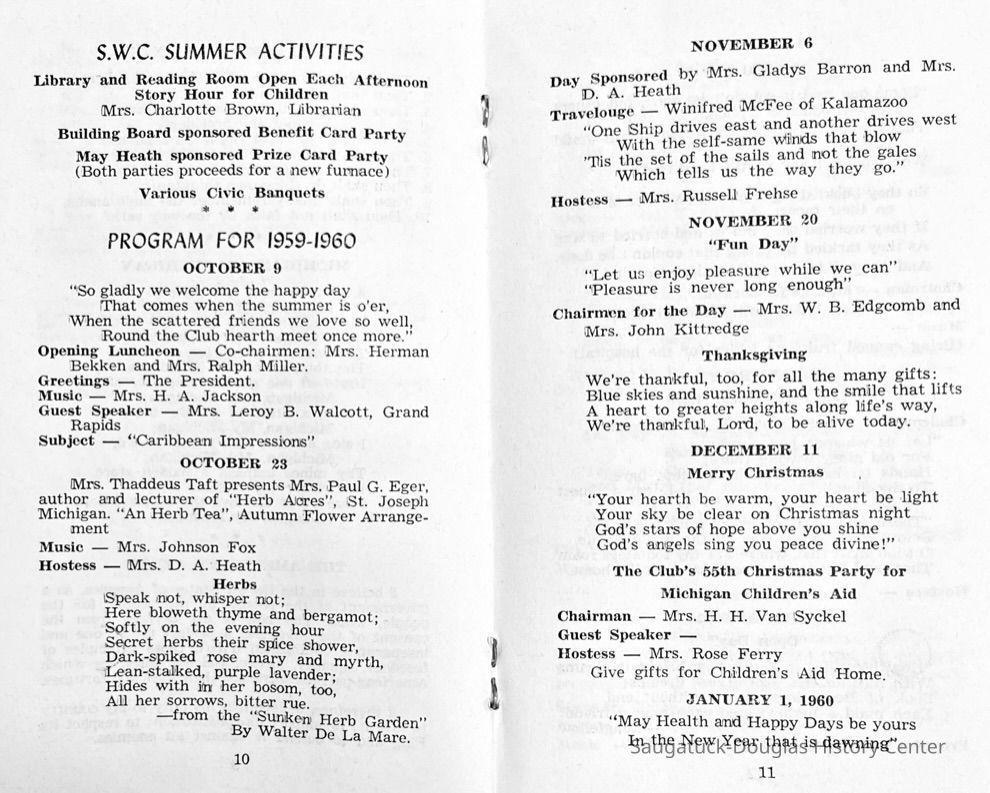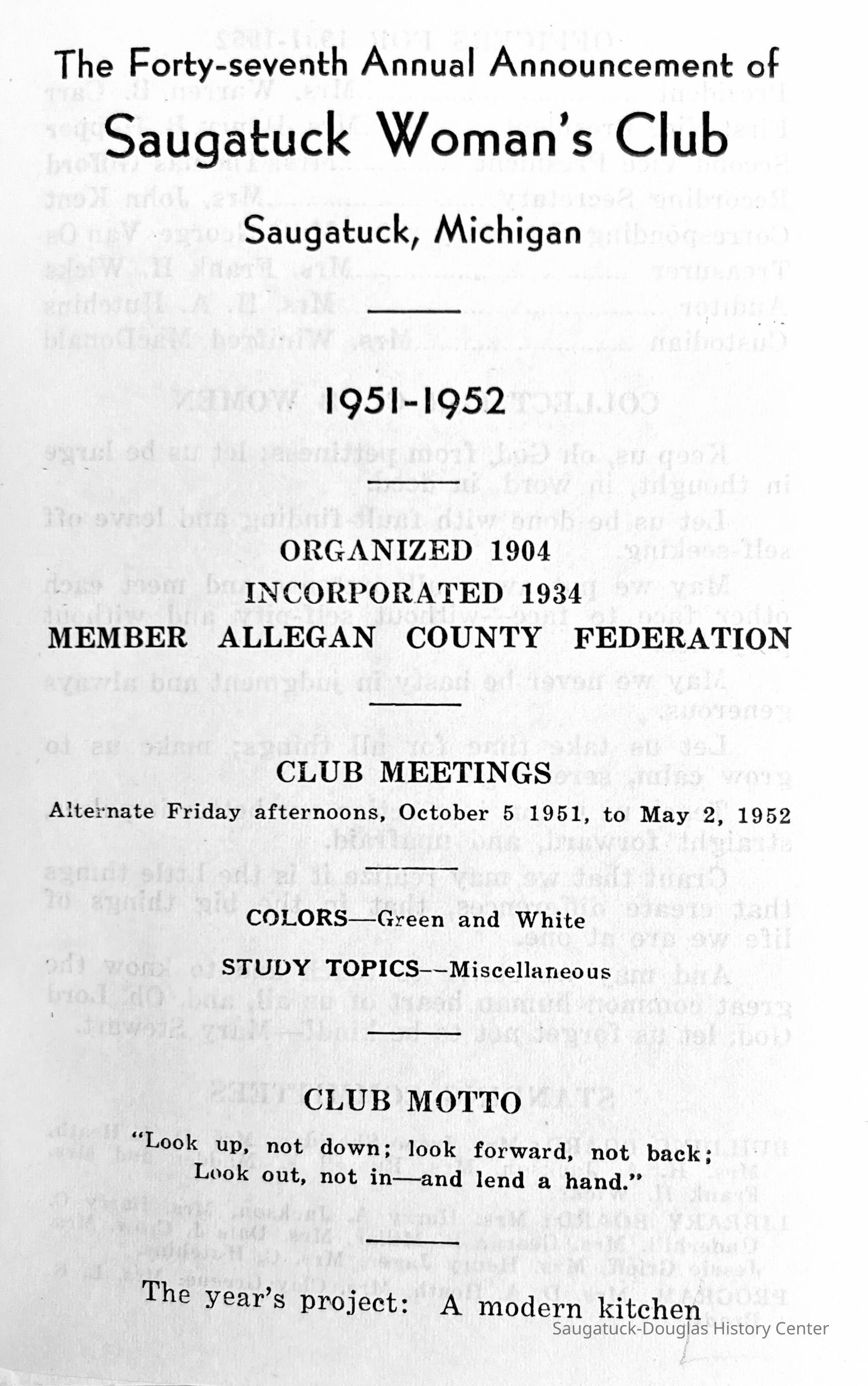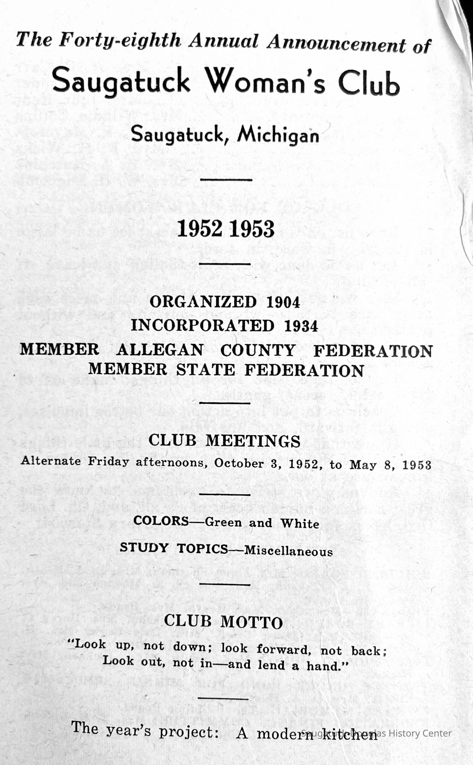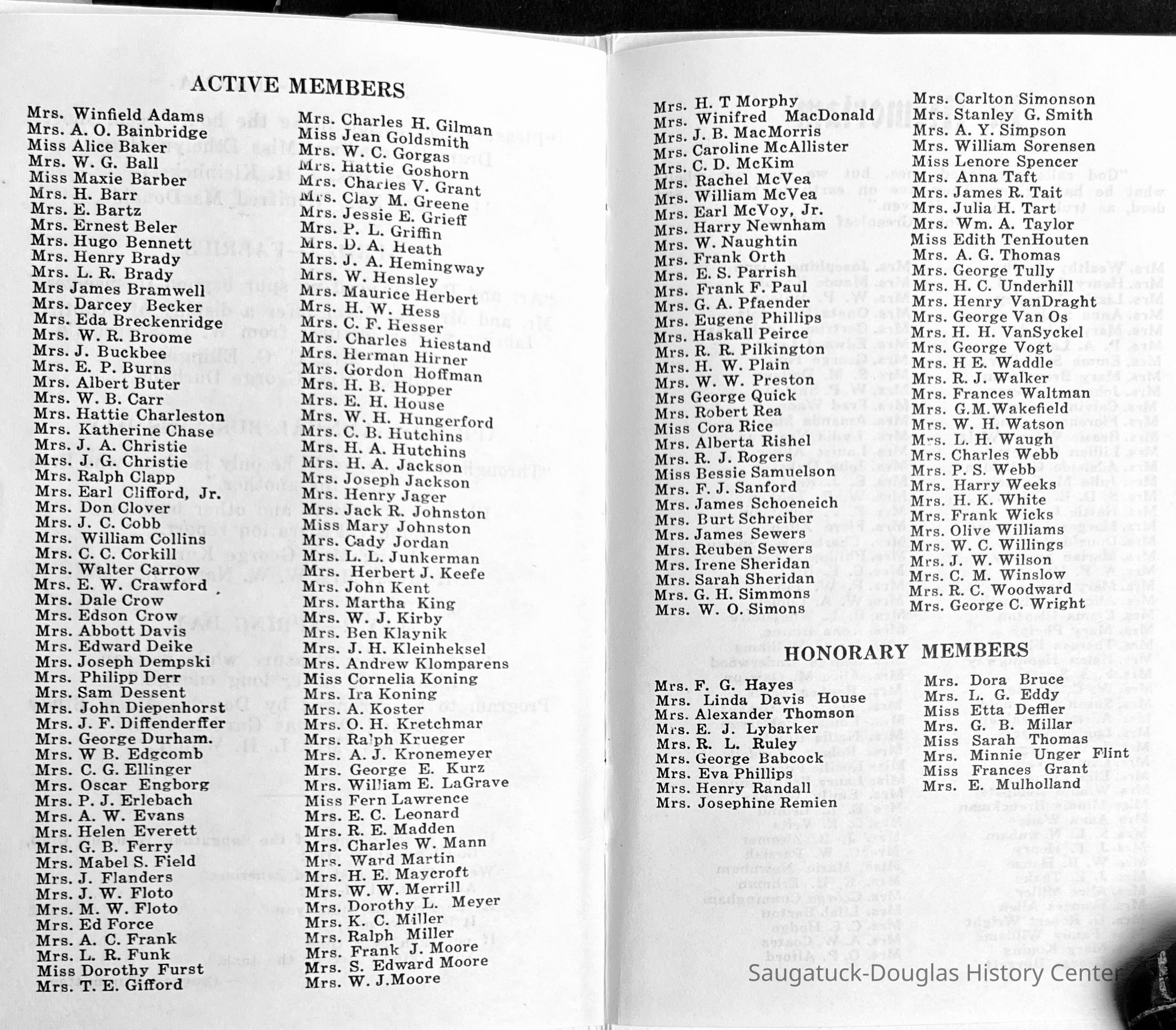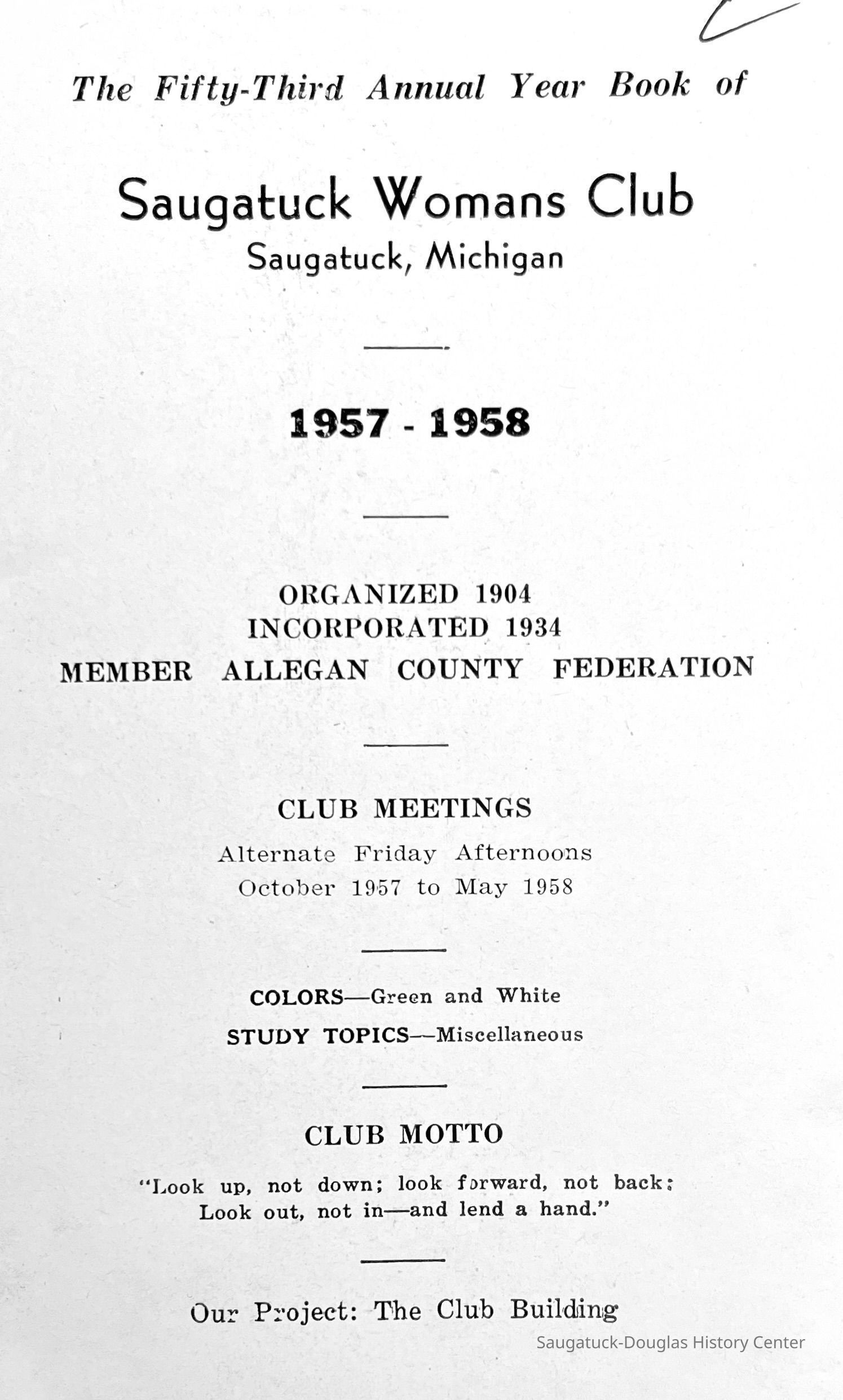 Saugatuck Woman's Club 1904-present, Saugatuck Woman's Club auditorium 1935-present, Heath, May (Francis) 1873-1961, Bird, Harriet “Hattie” Louise (Moffat) (Wright) 1855-1944, Breuckman, Minnie 1869-1934, Coates, Adella "Della" (Holmes) 1864-1950, Thomson, Jeanette Elvira (Harris) 1862-1956, Fox, Johnson 1918-2009, Hodge, Emma Ursula (Gunzenhauser) 1864-1950, Dailey, Margaret, E. (Calkins) 1866-1940, Zwemer, Saburna G. (Woodworth) 1875-1949, Henry, Isabel (Shore) 1856-1936, Woodworth, Alice C. (Redway) Mather 1848-1930, 439 Butler/Butler Pantry/Wilkins/Koning/Nies Hardware, Allen, Flora Elizabeth (Sprang) 1863-1943, Walker, Adelaide Elizabeth (Wade) 1885-1932, Goshorn, Hattie Louise (DePuy) 1874-1953, House, Celia Martin (Gamble) (1890-1976), Millar, Nellie Grant (Raymond) 1861-1956, Jackson, Rhea Bernice (Allen) 1892-1979, Leland, Ruth F. (Baker) 1878-1949, Comey, Alice Maude (Grant) 1870-1944, Davis, Edna Mae (Gaylord) 1896-1980, Wilson, Grace (Cobb) 1897-1992, Sheridan, Irene (Weible) 1883-1967, Waddell, Sadie R. 1882-1947, Wicks, Caroline Jane "Carrie" (Millar) Stillson 1884-1983, Hoffman, Elizabeth S. "Betty" (Gregory) 1894-1960, Brady, Winifred E. (Randall) 1893-1961, Peirce, Roberta "Bobbie" Margaret (Fredrickson) 1914-2004, Carr, Elsie Virginia (Kaufman) 1906-1997, Bieler or Beler, Mrs. Ernest 1904-1954?, Bainbridge, Marguerite (Holladay) 1888-1974, Edgcomb, Ruth M. (Severance) 1915-1997, Taylor, Mrs. Harold