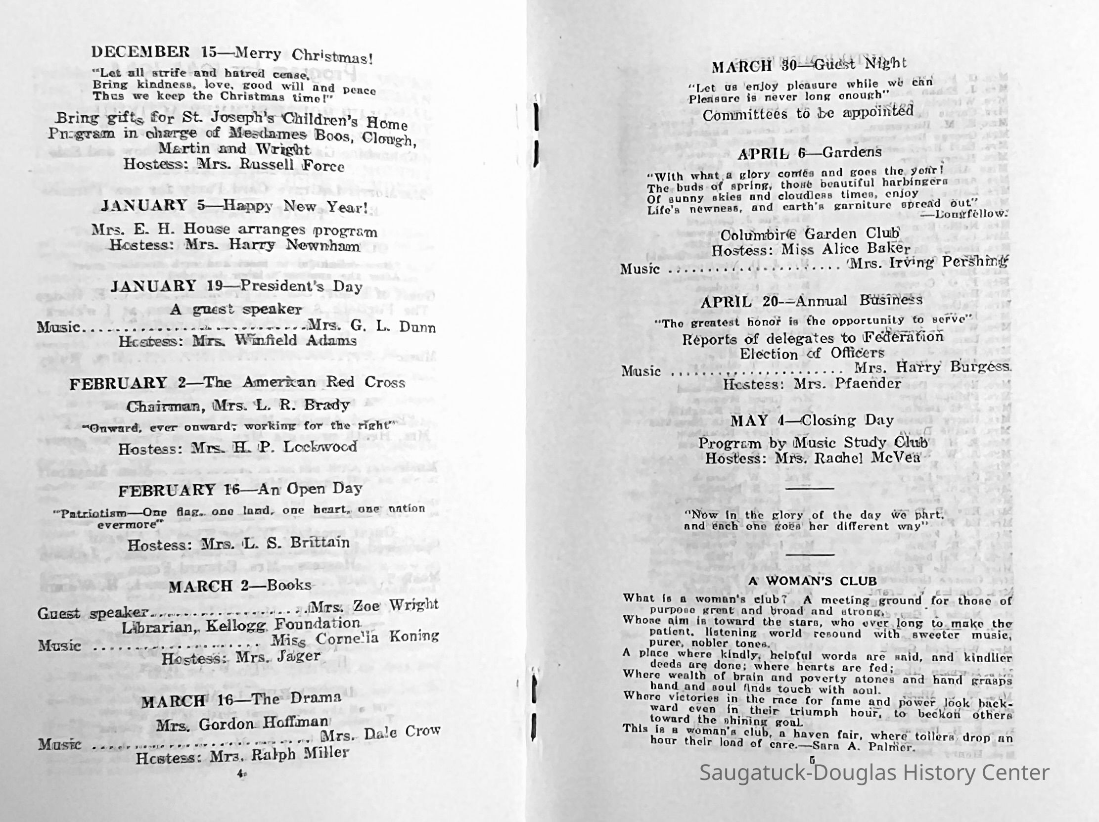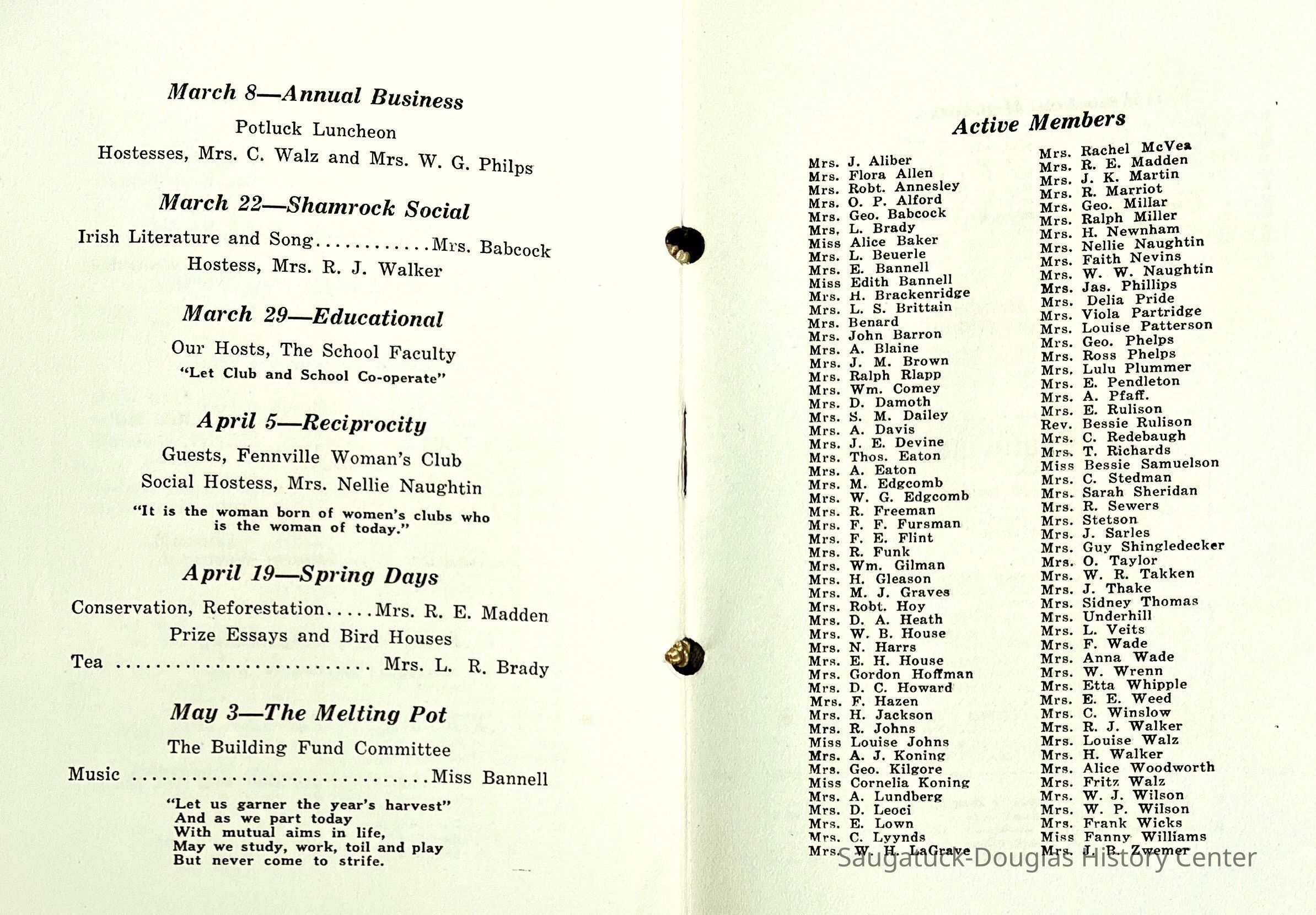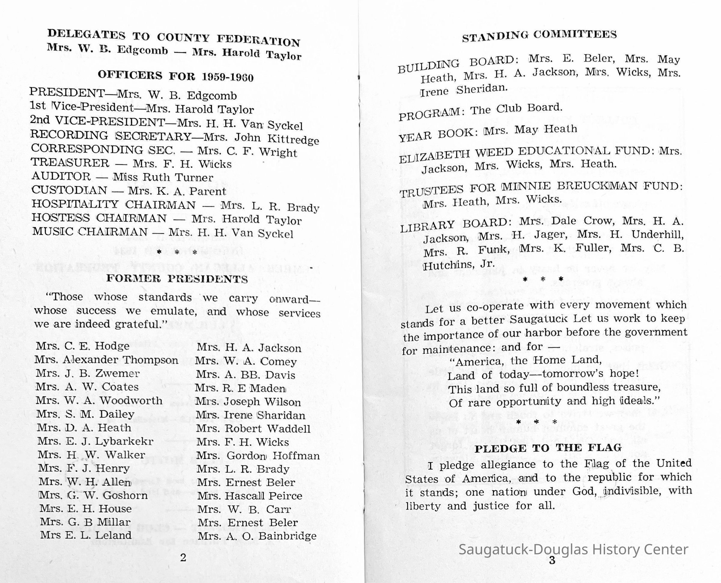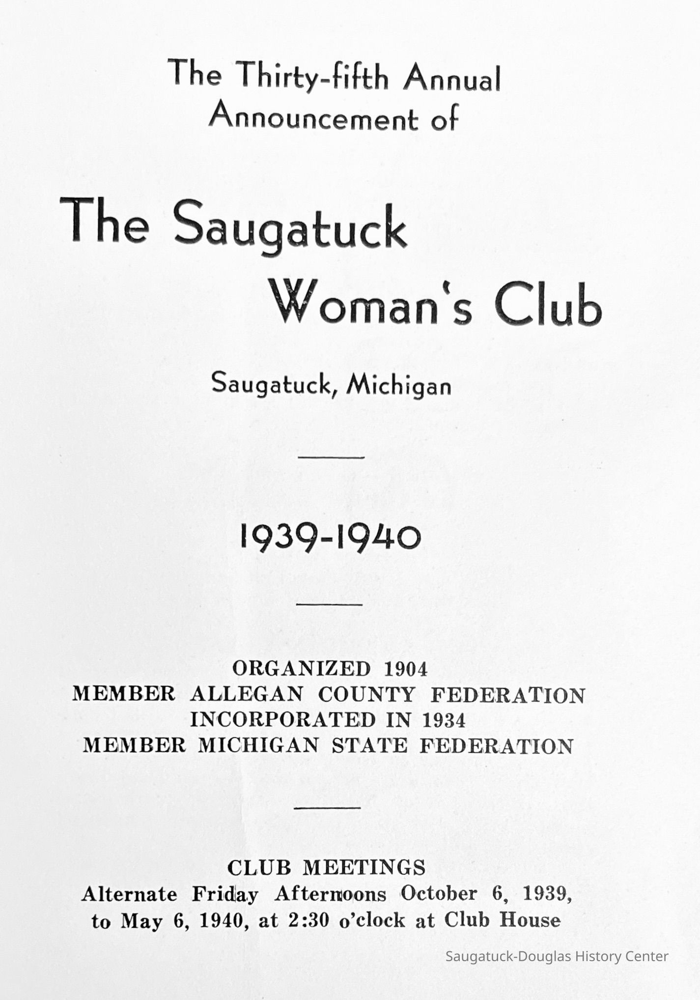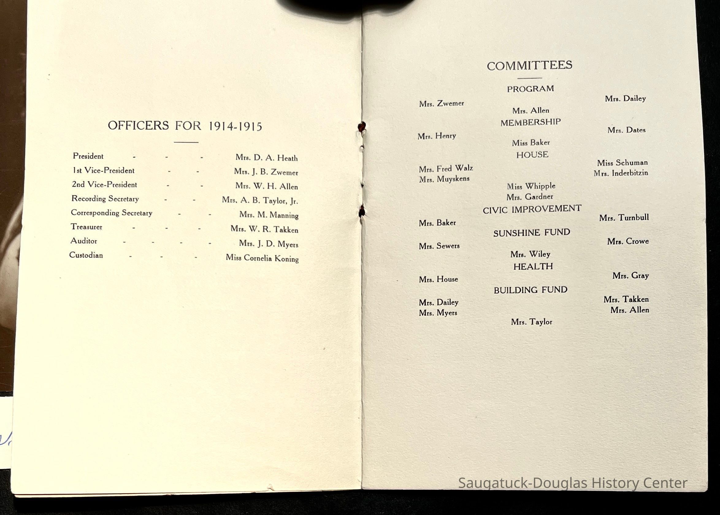 Saugatuck Woman's Club 1904-present, Saugatuck Woman's Club auditorium 1935-present, Heath, May (Francis) 1873-1961, Bird, Harriet “Hattie” Louise (Moffat) (Wright) 1855-1944, Breuckman, Minnie 1869-1934, Coates, Adella "Della" (Holmes) 1864-1950, Thomson, Jeanette Elvira (Harris) 1862-1956, Fox, Johnson 1918-2009, Hodge, Emma Ursula (Gunzenhauser) 1864-1950, Dailey, Margaret, E. (Calkins) 1866-1940, Zwemer, Saburna G. (Woodworth) 1875-1949, Henry, Isabel (Shore) 1856-1936, Woodworth, Alice C. (Redway) Mather 1848-1930, 439 Butler/Butler Pantry/Wilkins/Koning/Nies Hardware, Allen, Flora Elizabeth (Sprang) 1863-1943, Walker, Adelaide Elizabeth (Wade) 1885-1932, Goshorn, Hattie Louise (DePuy) 1874-1953, House, Celia Martin (Gamble) (1890-1976), Millar, Nellie Grant (Raymond) 1861-1956, Jackson, Rhea Bernice (Allen) 1892-1979, Leland, Ruth F. (Baker) 1878-1949, Comey, Alice Maude (Grant) 1870-1944, Davis, Edna Mae (Gaylord) 1896-1980, Wilson, Grace (Cobb) 1897-1992, Sheridan, Irene (Weible) 1883-1967, Waddell, Sadie R. 1882-1947, Wicks, Caroline Jane "Carrie" (Millar) Stillson 1884-1983, Hoffman, Elizabeth S. "Betty" (Gregory) 1894-1960, Brady, Winifred E. (Randall) 1893-1961, Peirce, Roberta "Bobbie" Margaret (Fredrickson) 1914-2004, Carr, Elsie Virginia (Kaufman) 1906-1997, Bieler or Beler, Mrs. Ernest 1904-1954?, Bainbridge, Marguerite (Holladay) 1888-1974, Edgcomb, Ruth M. (Severance) 1915-1997, Taylor, Mrs. Harold