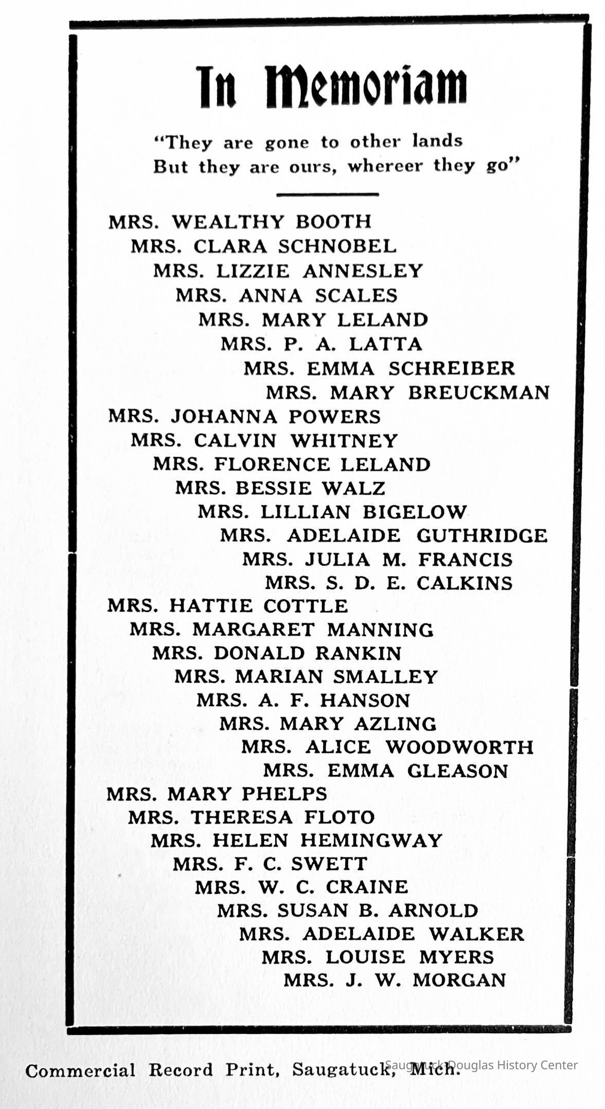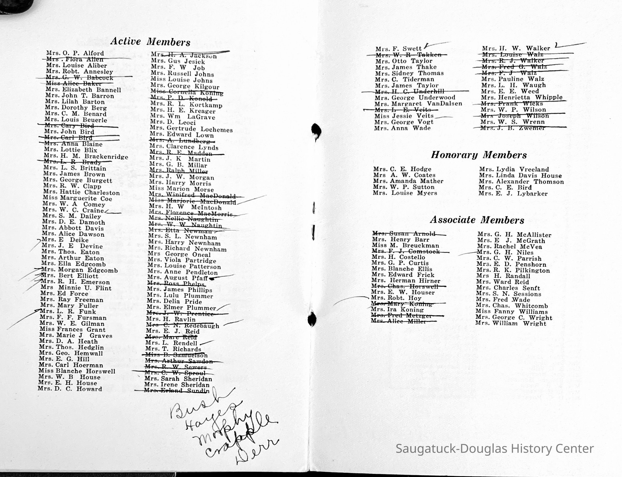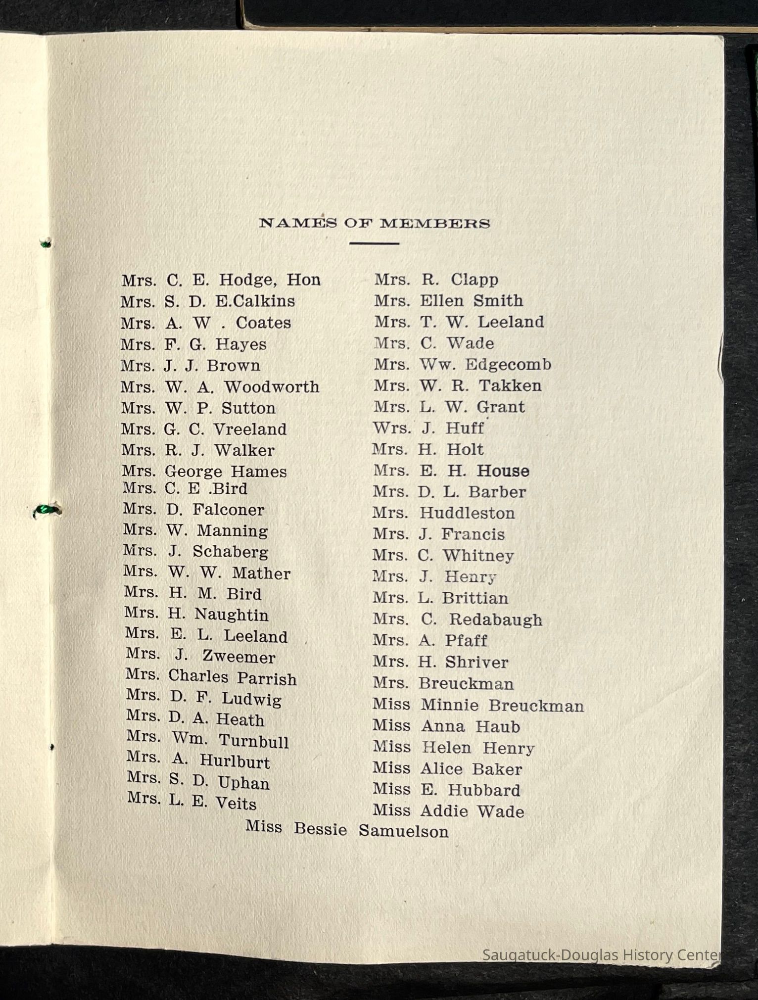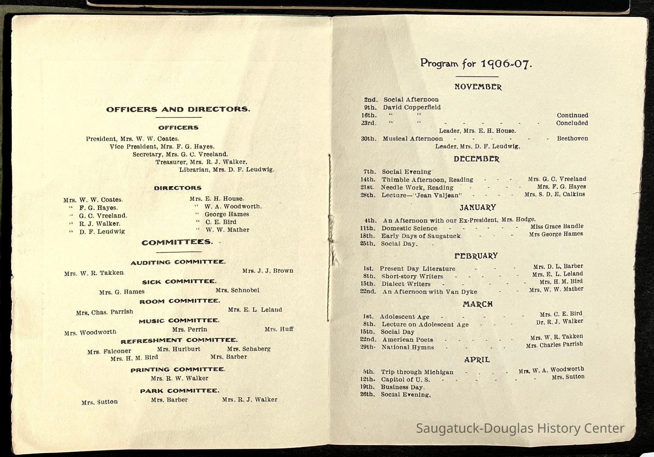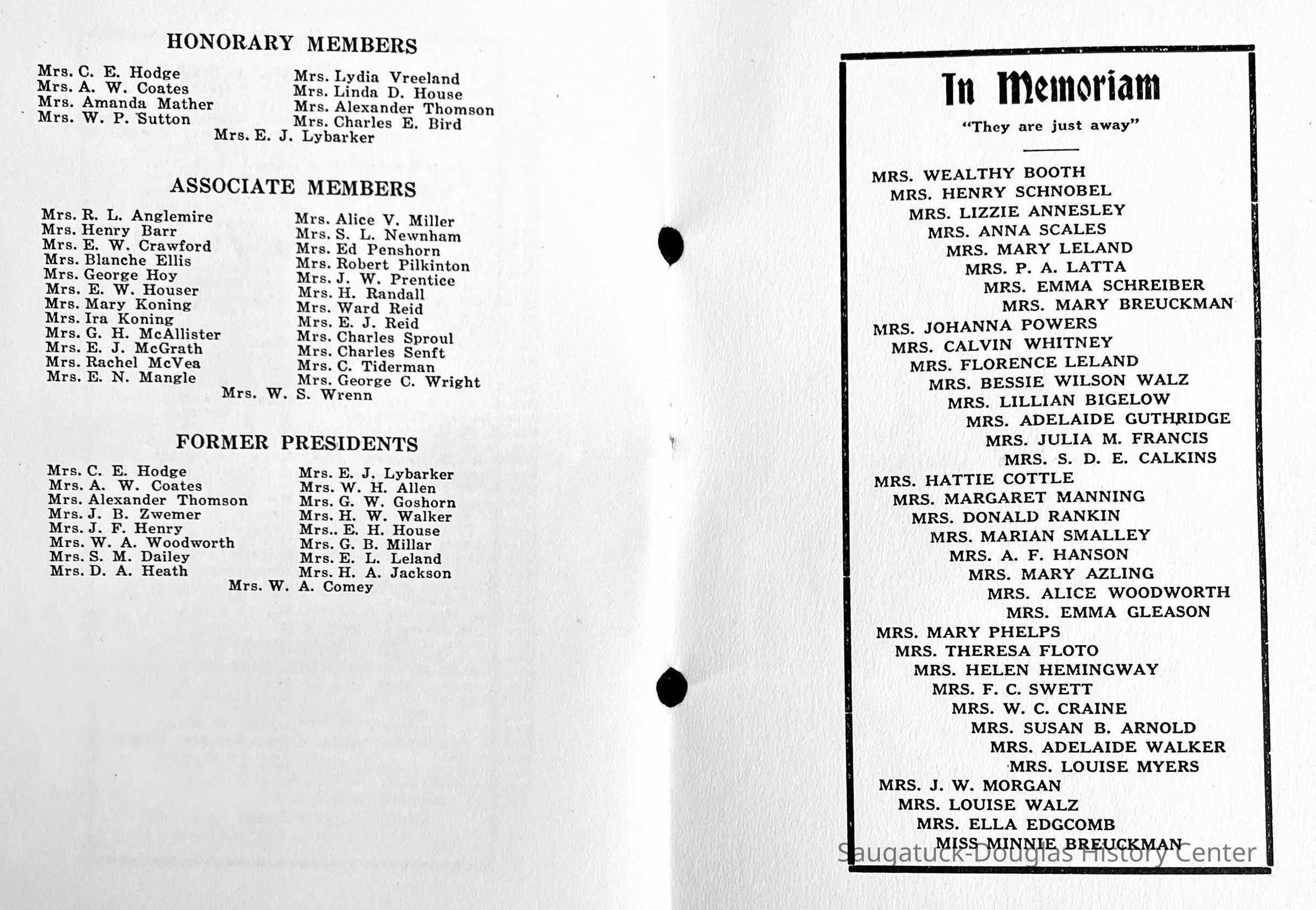 Saugatuck Woman's Club 1904-present, Saugatuck Woman's Club auditorium 1935-present, Heath, May (Francis) 1873-1961, Bird, Harriet “Hattie” Louise (Moffat) (Wright) 1855-1944, Breuckman, Minnie 1869-1934, Coates, Adella "Della" (Holmes) 1864-1950, Thomson, Jeanette Elvira (Harris) 1862-1956, Fox, Johnson 1918-2009, Hodge, Emma Ursula (Gunzenhauser) 1864-1950, Dailey, Margaret, E. (Calkins) 1866-1940, Zwemer, Saburna G. (Woodworth) 1875-1949, Henry, Isabel (Shore) 1856-1936, Woodworth, Alice C. (Redway) Mather 1848-1930, 439 Butler/Butler Pantry/Wilkins/Koning/Nies Hardware, Allen, Flora Elizabeth (Sprang) 1863-1943, Walker, Adelaide Elizabeth (Wade) 1885-1932, Goshorn, Hattie Louise (DePuy) 1874-1953, House, Celia Martin (Gamble) (1890-1976), Millar, Nellie Grant (Raymond) 1861-1956, Jackson, Rhea Bernice (Allen) 1892-1979, Leland, Ruth F. (Baker) 1878-1949, Comey, Alice Maude (Grant) 1870-1944, Davis, Edna Mae (Gaylord) 1896-1980, Wilson, Grace (Cobb) 1897-1992, Sheridan, Irene (Weible) 1883-1967, Waddell, Sadie R. 1882-1947, Wicks, Caroline Jane "Carrie" (Millar) Stillson 1884-1983, Hoffman, Elizabeth S. "Betty" (Gregory) 1894-1960, Brady, Winifred E. (Randall) 1893-1961, Peirce, Roberta "Bobbie" Margaret (Fredrickson) 1914-2004, Carr, Elsie Virginia (Kaufman) 1906-1997, Bieler or Beler, Mrs. Ernest 1904-1954?, Bainbridge, Marguerite (Holladay) 1888-1974, Edgcomb, Ruth M. (Severance) 1915-1997, Taylor, Mrs. Harold