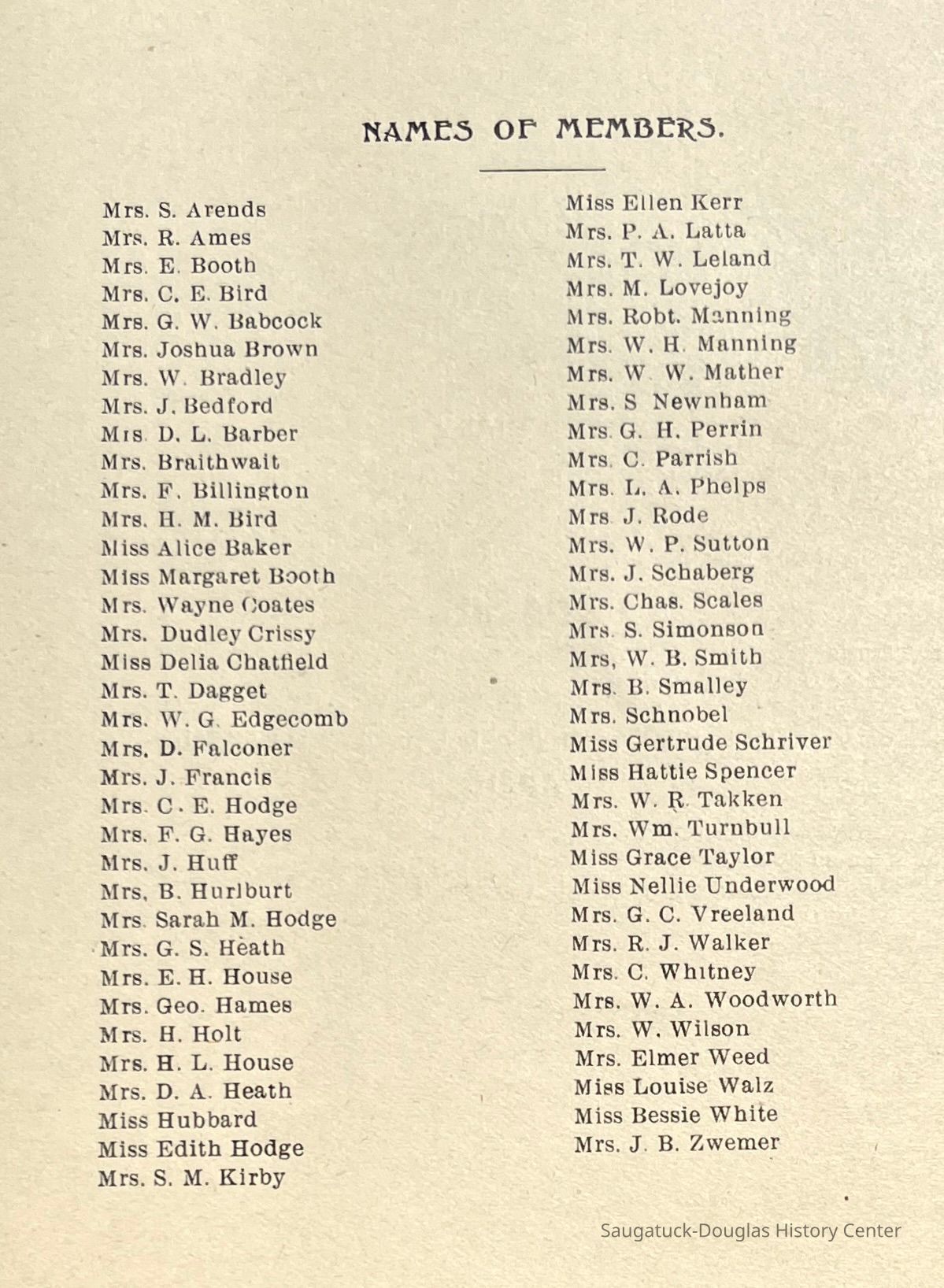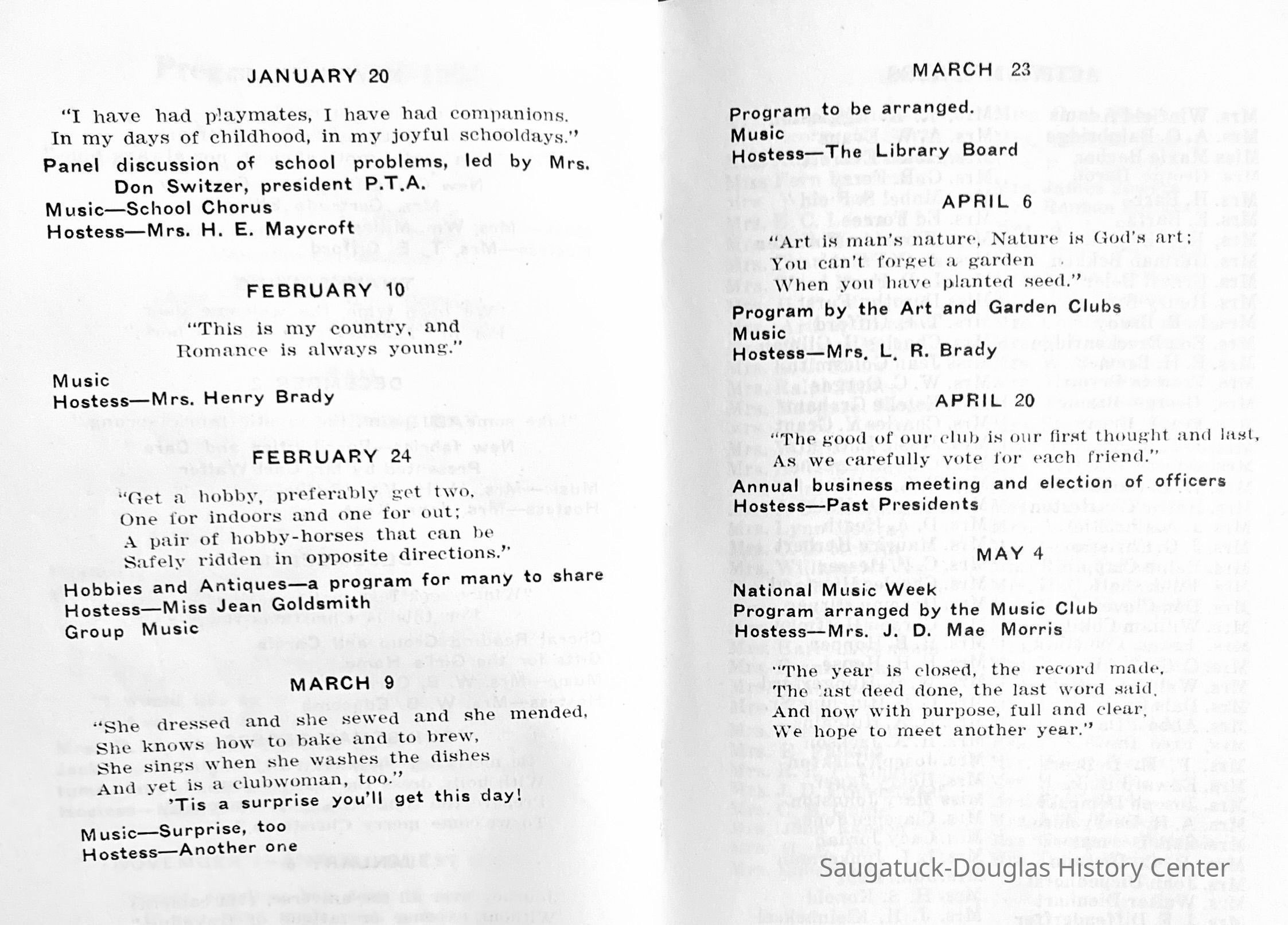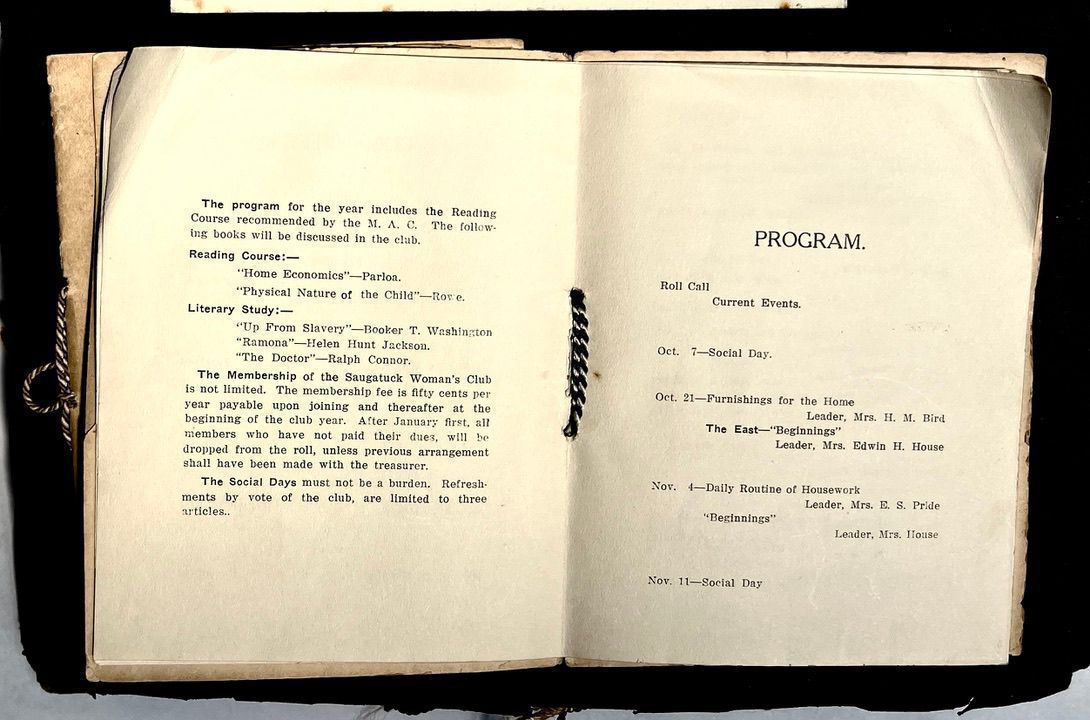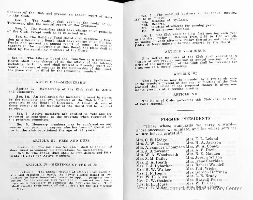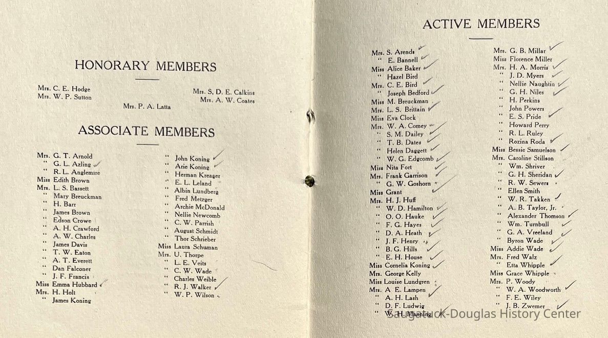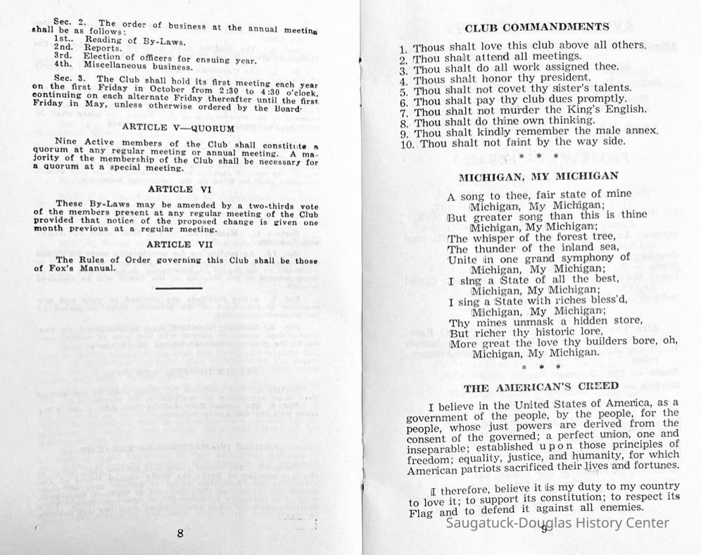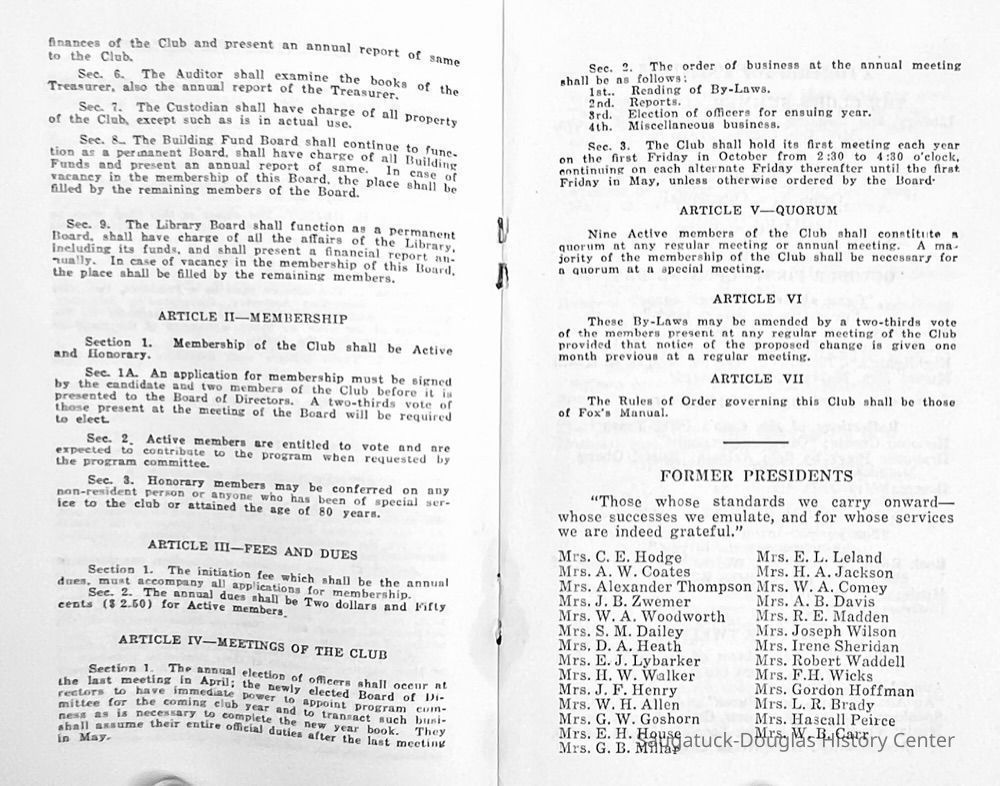 Saugatuck Woman's Club 1904-present, Saugatuck Woman's Club auditorium 1935-present, Heath, May (Francis) 1873-1961, Bird, Harriet “Hattie” Louise (Moffat) (Wright) 1855-1944, Breuckman, Minnie 1869-1934, Coates, Adella "Della" (Holmes) 1864-1950, Thomson, Jeanette Elvira (Harris) 1862-1956, Fox, Johnson 1918-2009, Hodge, Emma Ursula (Gunzenhauser) 1864-1950, Dailey, Margaret, E. (Calkins) 1866-1940, Zwemer, Saburna G. (Woodworth) 1875-1949, Henry, Isabel (Shore) 1856-1936, Woodworth, Alice C. (Redway) Mather 1848-1930, 439 Butler/Butler Pantry/Wilkins/Koning/Nies Hardware, Allen, Flora Elizabeth (Sprang) 1863-1943, Walker, Adelaide Elizabeth (Wade) 1885-1932, Goshorn, Hattie Louise (DePuy) 1874-1953, House, Celia Martin (Gamble) (1890-1976), Millar, Nellie Grant (Raymond) 1861-1956, Jackson, Rhea Bernice (Allen) 1892-1979, Leland, Ruth F. (Baker) 1878-1949, Comey, Alice Maude (Grant) 1870-1944, Davis, Edna Mae (Gaylord) 1896-1980, Wilson, Grace (Cobb) 1897-1992, Sheridan, Irene (Weible) 1883-1967, Waddell, Sadie R. 1882-1947, Wicks, Caroline Jane "Carrie" (Millar) Stillson 1884-1983, Hoffman, Elizabeth S. "Betty" (Gregory) 1894-1960, Brady, Winifred E. (Randall) 1893-1961, Peirce, Roberta "Bobbie" Margaret (Fredrickson) 1914-2004, Carr, Elsie Virginia (Kaufman) 1906-1997, Bieler or Beler, Mrs. Ernest 1904-1954?, Bainbridge, Marguerite (Holladay) 1888-1974, Edgcomb, Ruth M. (Severance) 1915-1997, Taylor, Mrs. Harold