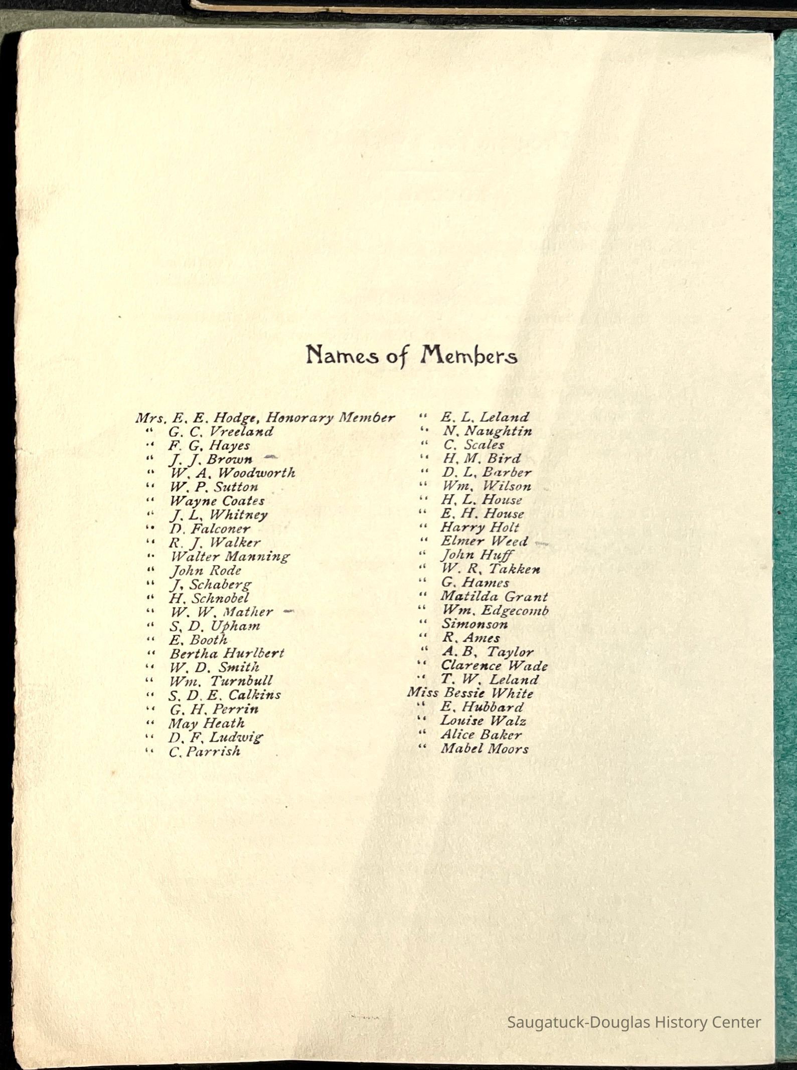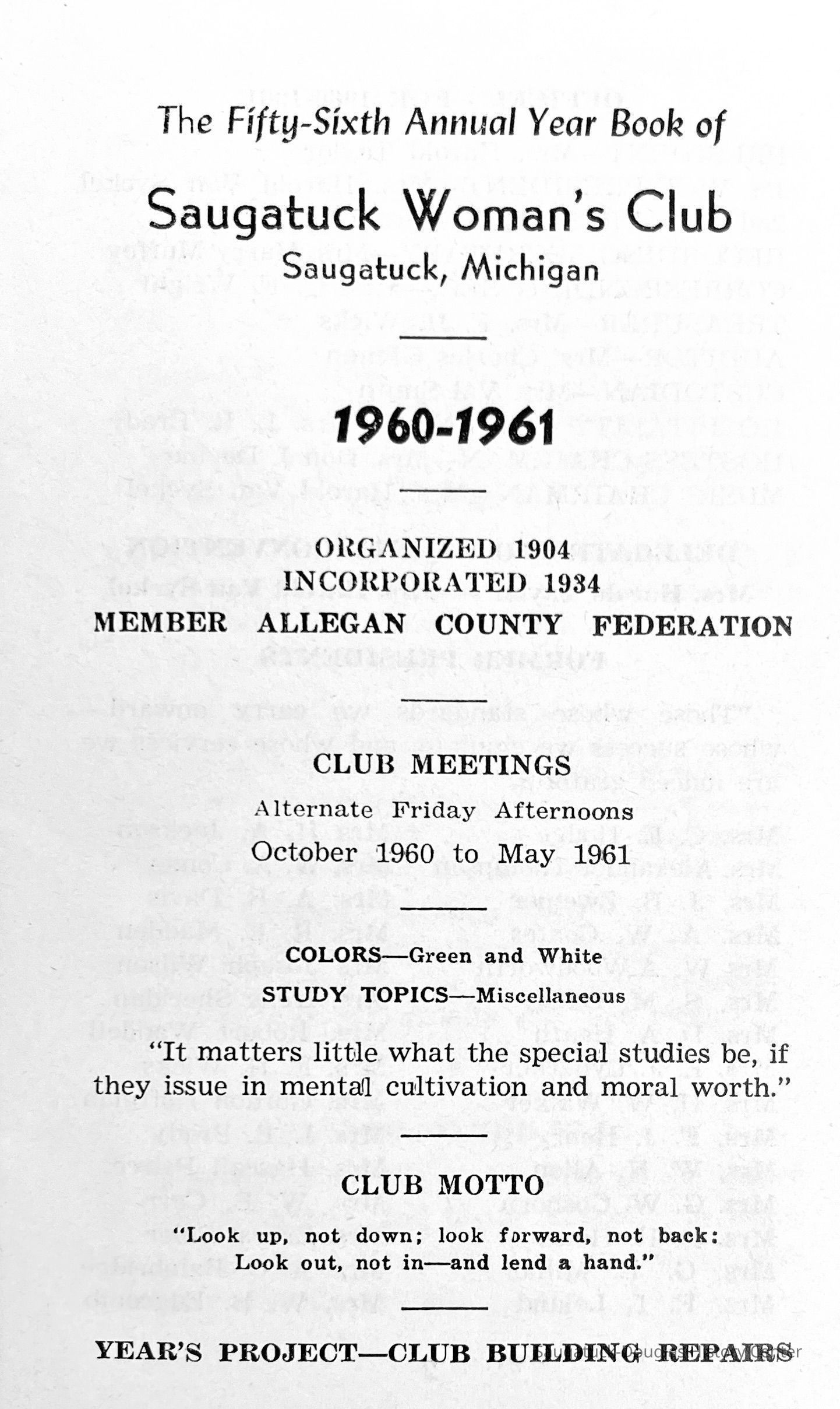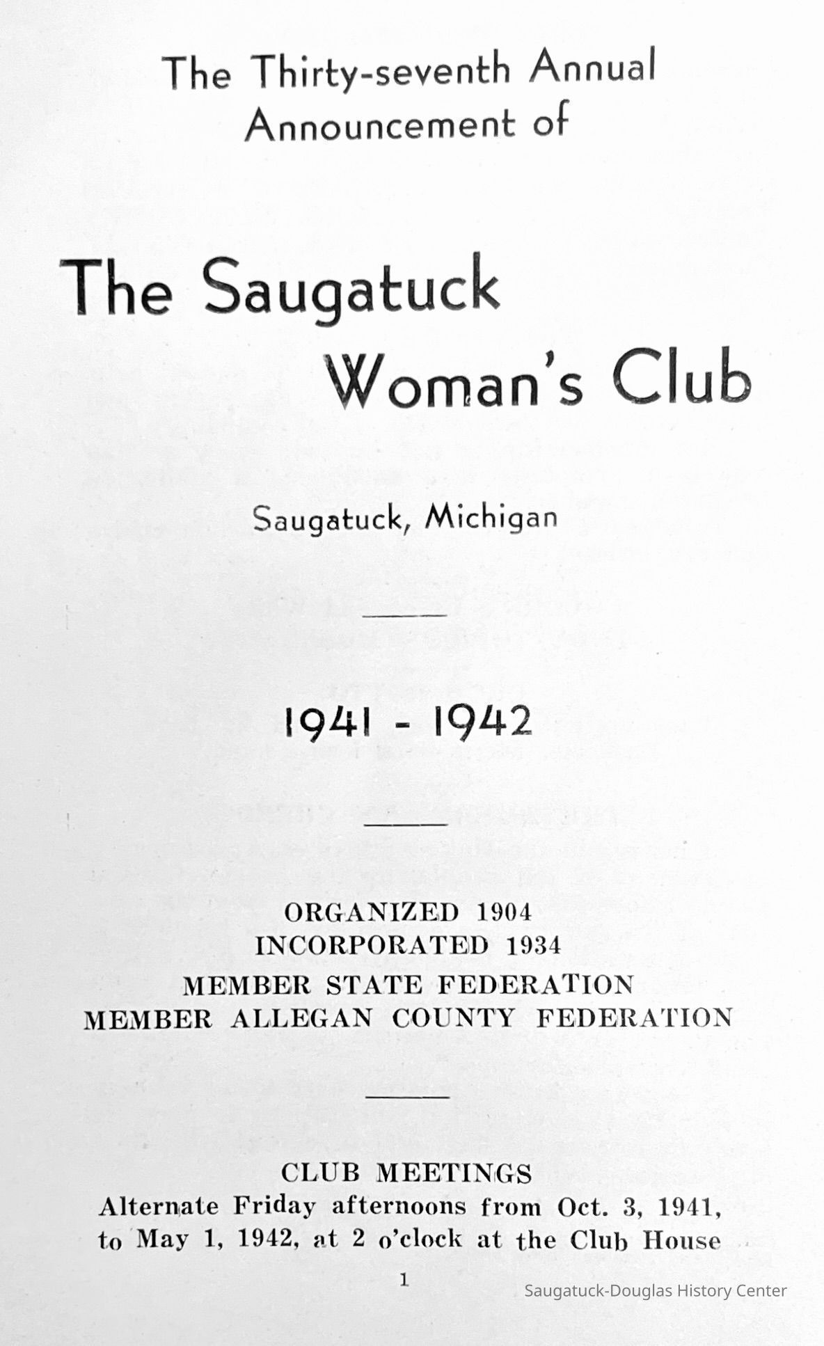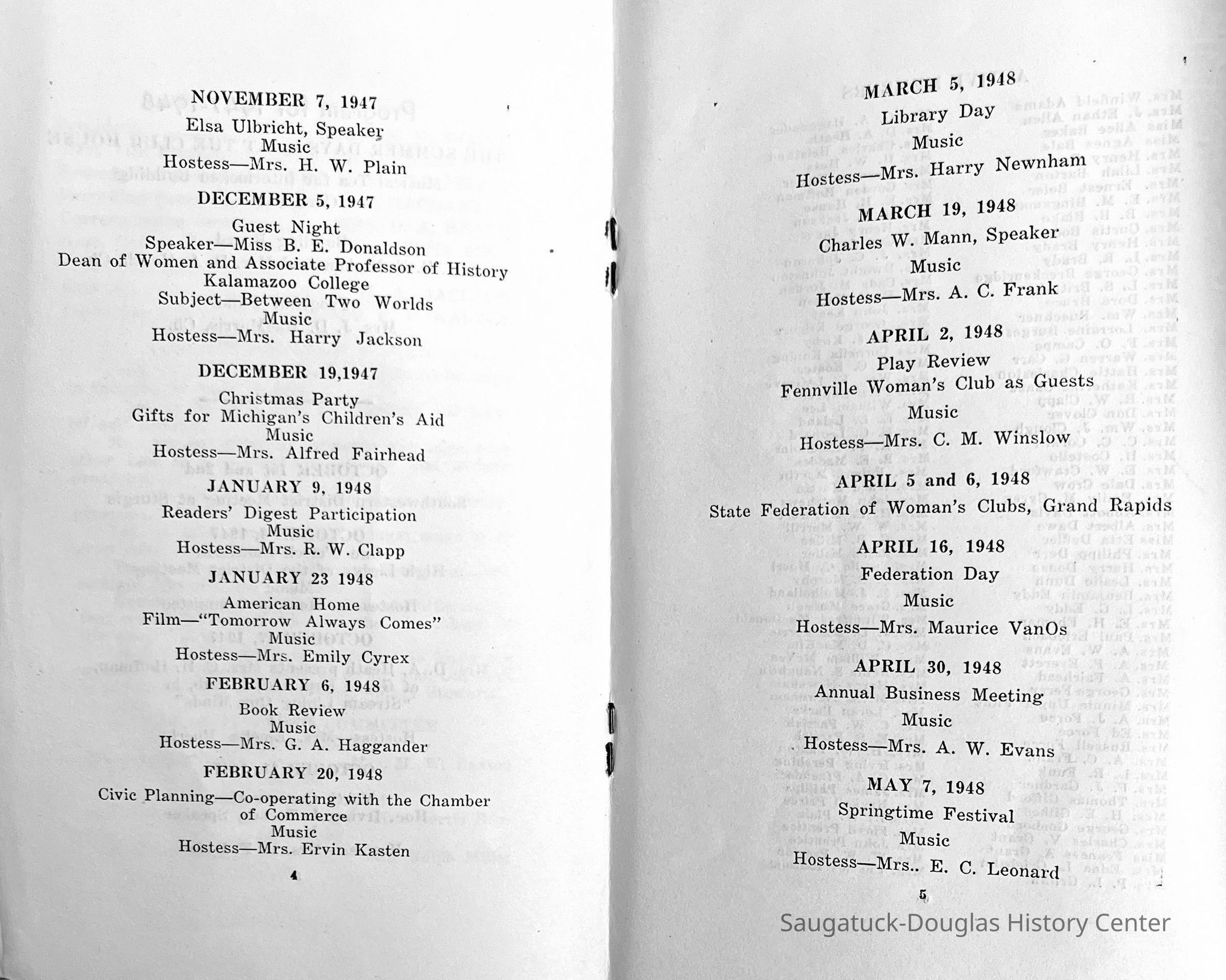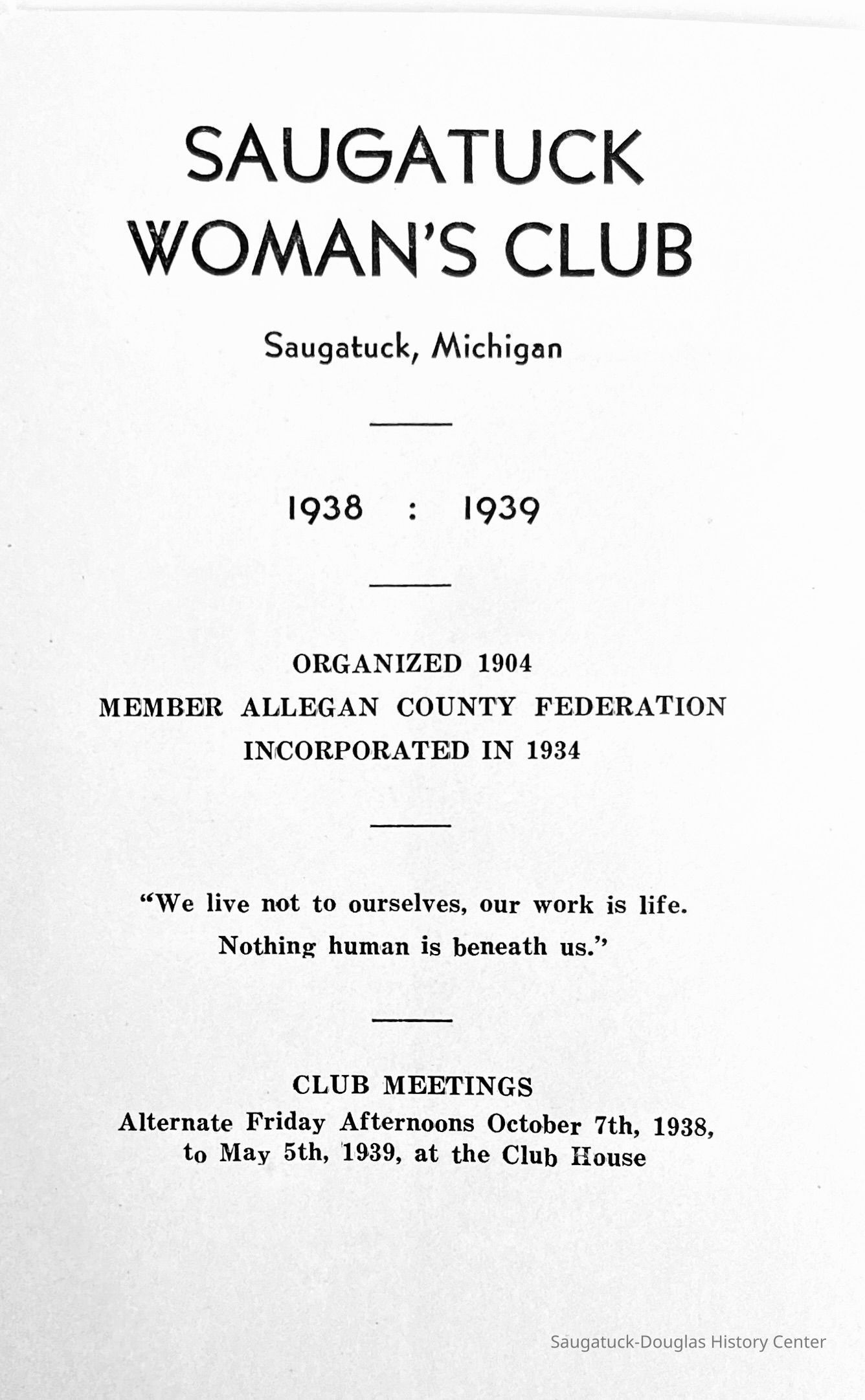Saugatuck Woman's Club 1904-present, Saugatuck Woman's Club auditorium 1935-present, Heath, May (Francis) 1873-1961, Bird, Harriet “Hattie” Louise (Moffat) (Wright) 1855-1944, Breuckman, Minnie 1869-1934, Coates, Adella "Della" (Holmes) 1864-1950, Thomson, Jeanette Elvira (Harris) 1862-1956, Fox, Johnson 1918-2009, Hodge, Emma Ursula (Gunzenhauser) 1864-1950, Dailey, Margaret, E. (Calkins) 1866-1940, Zwemer, Saburna G. (Woodworth) 1875-1949, Henry, Isabel (Shore) 1856-1936, Woodworth, Alice C. (Redway) Mather 1848-1930, 439 Butler/Butler Pantry/Wilkins/Koning/Nies Hardware, Allen, Flora Elizabeth (Sprang) 1863-1943, Walker, Adelaide Elizabeth (Wade) 1885-1932, Goshorn, Hattie Louise (DePuy) 1874-1953, House, Celia Martin (Gamble) (1890-1976), Millar, Nellie Grant (Raymond) 1861-1956, Jackson, Rhea Bernice (Allen) 1892-1979, Leland, Ruth F. (Baker) 1878-1949, Comey, Alice Maude (Grant) 1870-1944, Davis, Edna Mae (Gaylord) 1896-1980, Wilson, Grace (Cobb) 1897-1992, Sheridan, Irene (Weible) 1883-1967, Waddell, Sadie R. 1882-1947, Wicks, Caroline Jane "Carrie" (Millar) Stillson 1884-1983, Hoffman, Elizabeth S. "Betty" (Gregory) 1894-1960, Brady, Winifred E. (Randall) 1893-1961, Peirce, Roberta "Bobbie" Margaret (Fredrickson) 1914-2004, Carr, Elsie Virginia (Kaufman) 1906-1997, Bieler or Beler, Mrs. Ernest 1904-1954?, Bainbridge, Marguerite (Holladay) 1888-1974, Edgcomb, Ruth M. (Severance) 1915-1997, Taylor, Mrs. Harold
