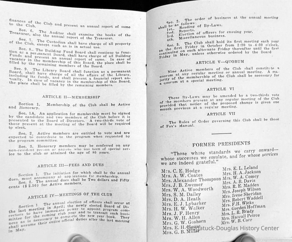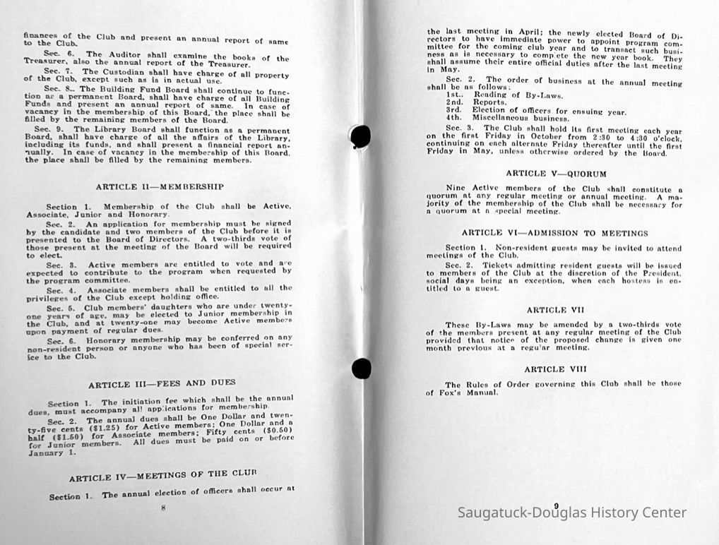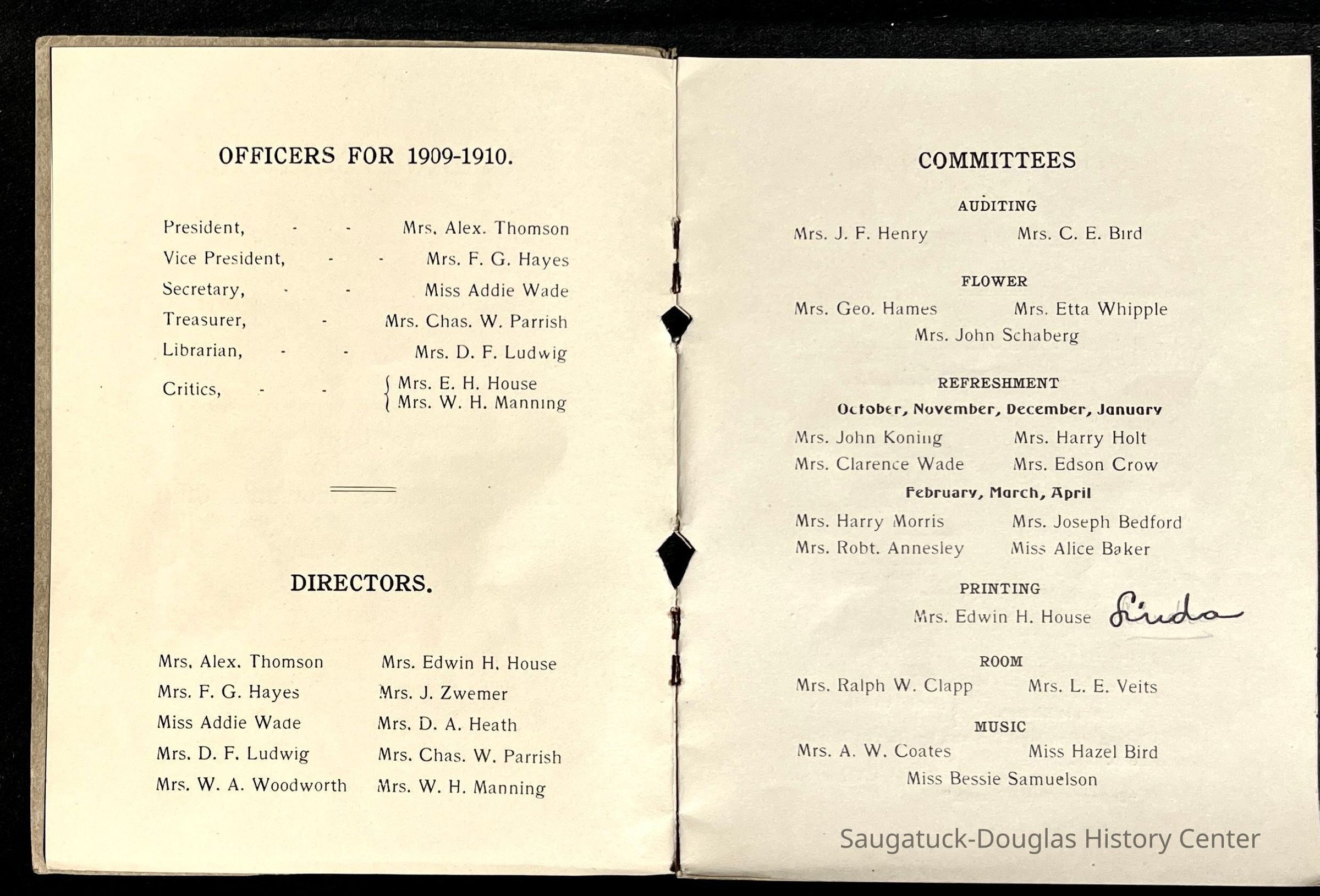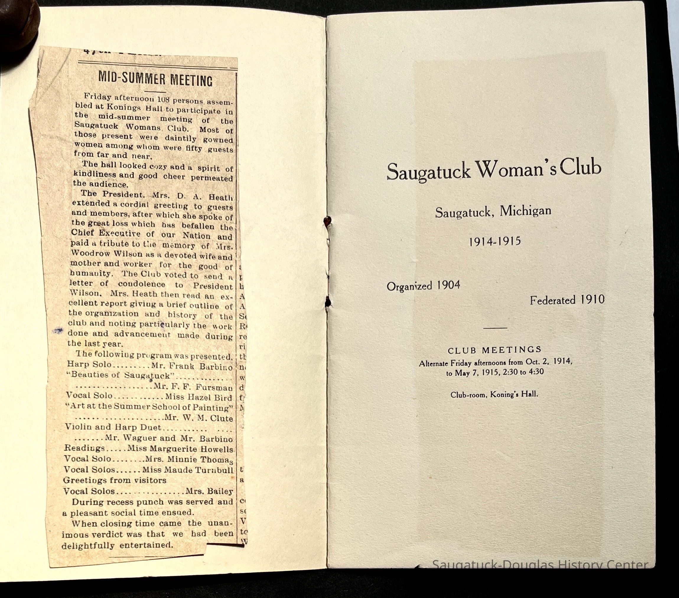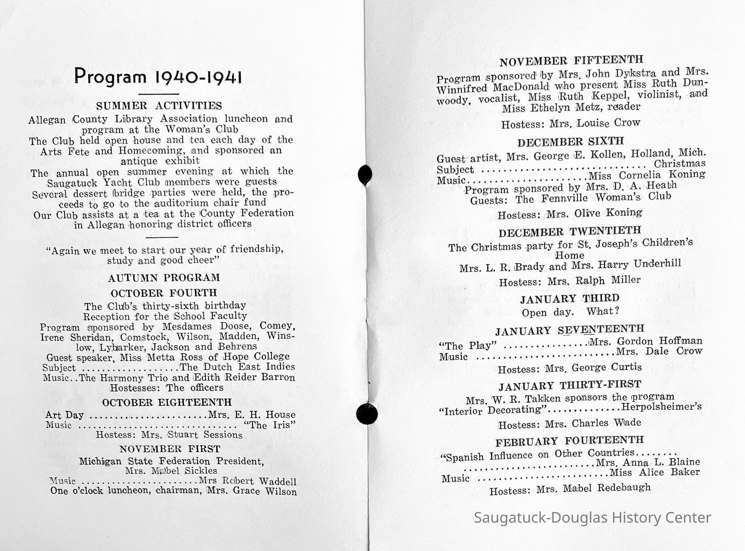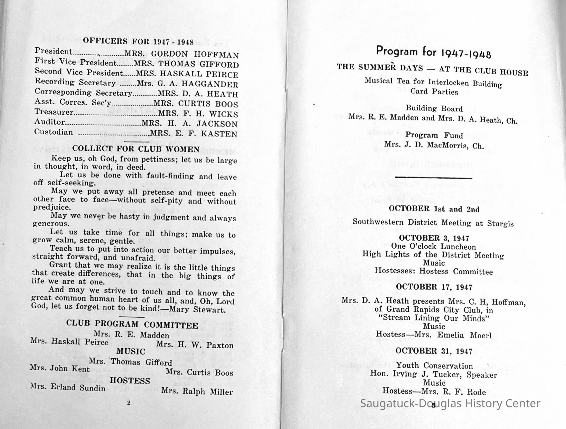 Saugatuck Woman's Club 1904-present, Saugatuck Woman's Club auditorium 1935-present, Heath, May (Francis) 1873-1961, Bird, Harriet “Hattie” Louise (Moffat) (Wright) 1855-1944, Breuckman, Minnie 1869-1934, Coates, Adella "Della" (Holmes) 1864-1950, Thomson, Jeanette Elvira (Harris) 1862-1956, Fox, Johnson 1918-2009, Hodge, Emma Ursula (Gunzenhauser) 1864-1950, Dailey, Margaret, E. (Calkins) 1866-1940, Zwemer, Saburna G. (Woodworth) 1875-1949, Henry, Isabel (Shore) 1856-1936, Woodworth, Alice C. (Redway) Mather 1848-1930, 439 Butler/Butler Pantry/Wilkins/Koning/Nies Hardware, Allen, Flora Elizabeth (Sprang) 1863-1943, Walker, Adelaide Elizabeth (Wade) 1885-1932, Goshorn, Hattie Louise (DePuy) 1874-1953, House, Celia Martin (Gamble) (1890-1976), Millar, Nellie Grant (Raymond) 1861-1956, Jackson, Rhea Bernice (Allen) 1892-1979, Leland, Ruth F. (Baker) 1878-1949, Comey, Alice Maude (Grant) 1870-1944, Davis, Edna Mae (Gaylord) 1896-1980, Wilson, Grace (Cobb) 1897-1992, Sheridan, Irene (Weible) 1883-1967, Waddell, Sadie R. 1882-1947, Wicks, Caroline Jane "Carrie" (Millar) Stillson 1884-1983, Hoffman, Elizabeth S. "Betty" (Gregory) 1894-1960, Brady, Winifred E. (Randall) 1893-1961, Peirce, Roberta "Bobbie" Margaret (Fredrickson) 1914-2004, Carr, Elsie Virginia (Kaufman) 1906-1997, Bieler or Beler, Mrs. Ernest 1904-1954?, Bainbridge, Marguerite (Holladay) 1888-1974, Edgcomb, Ruth M. (Severance) 1915-1997, Taylor, Mrs. Harold
